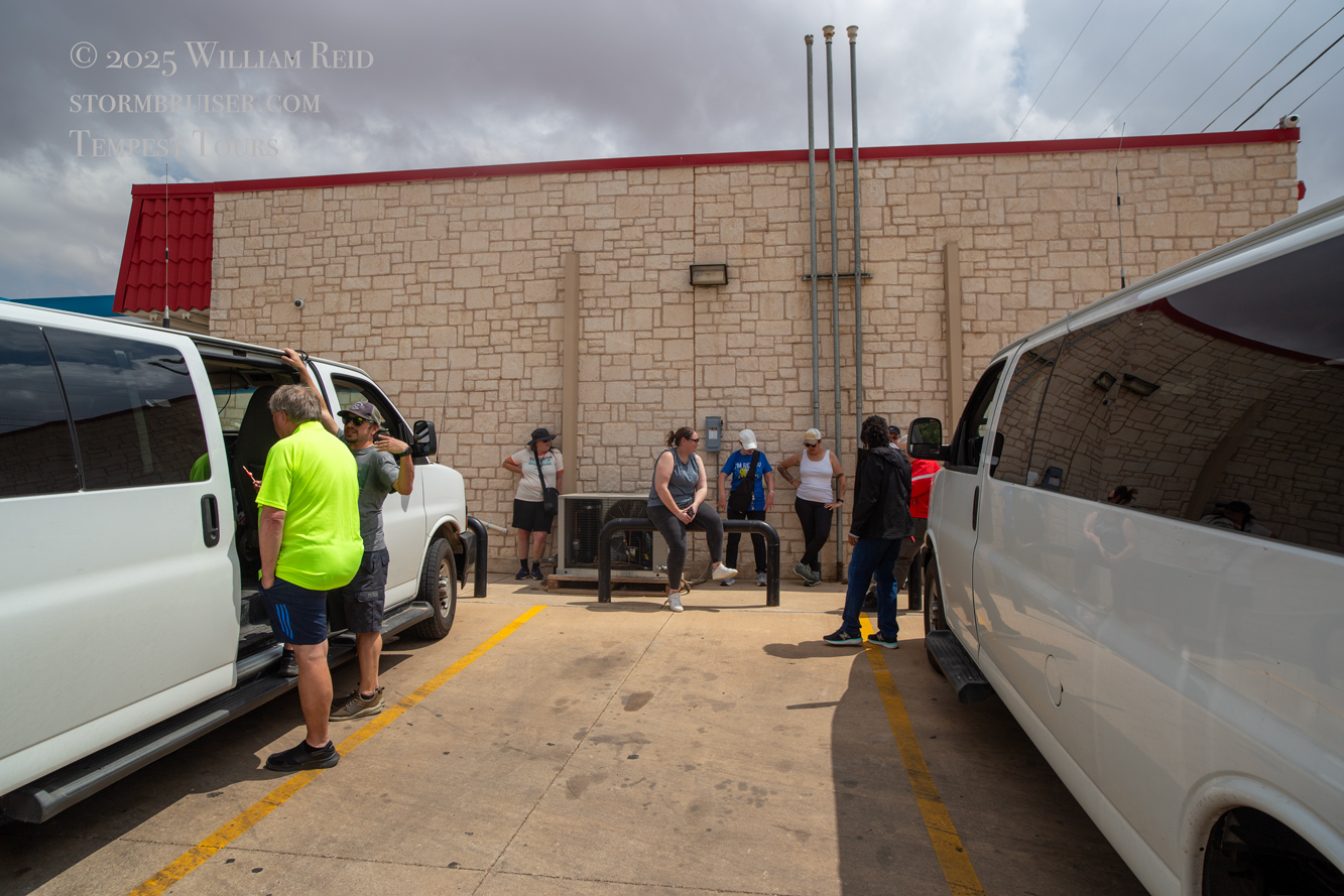 From Clovis we dropped south (late morning) on the Texas side of the border to Morton. That took barely over an hour, and the plan was to have a leisurely and decent lunch in Morton. The small town was just south of the important E-W boundary. We found a good place for lunch (the only place in town, apparently) but the staff wasn’t sure if they would be able to get our group of 16 in and out in a suitably short time. SPC had just issued a mesoscale discussion for our target area (the one at 12:27 p.m. CDT above). The low stratocumulus clouds around Morton were already starting to get a little perky. Was the show going to start early today? I could not take the chance of getting stuck at a restaurant on a day like this, so I reluctantly told the group that lunch today would be at Allsups convenience store (see pic above).