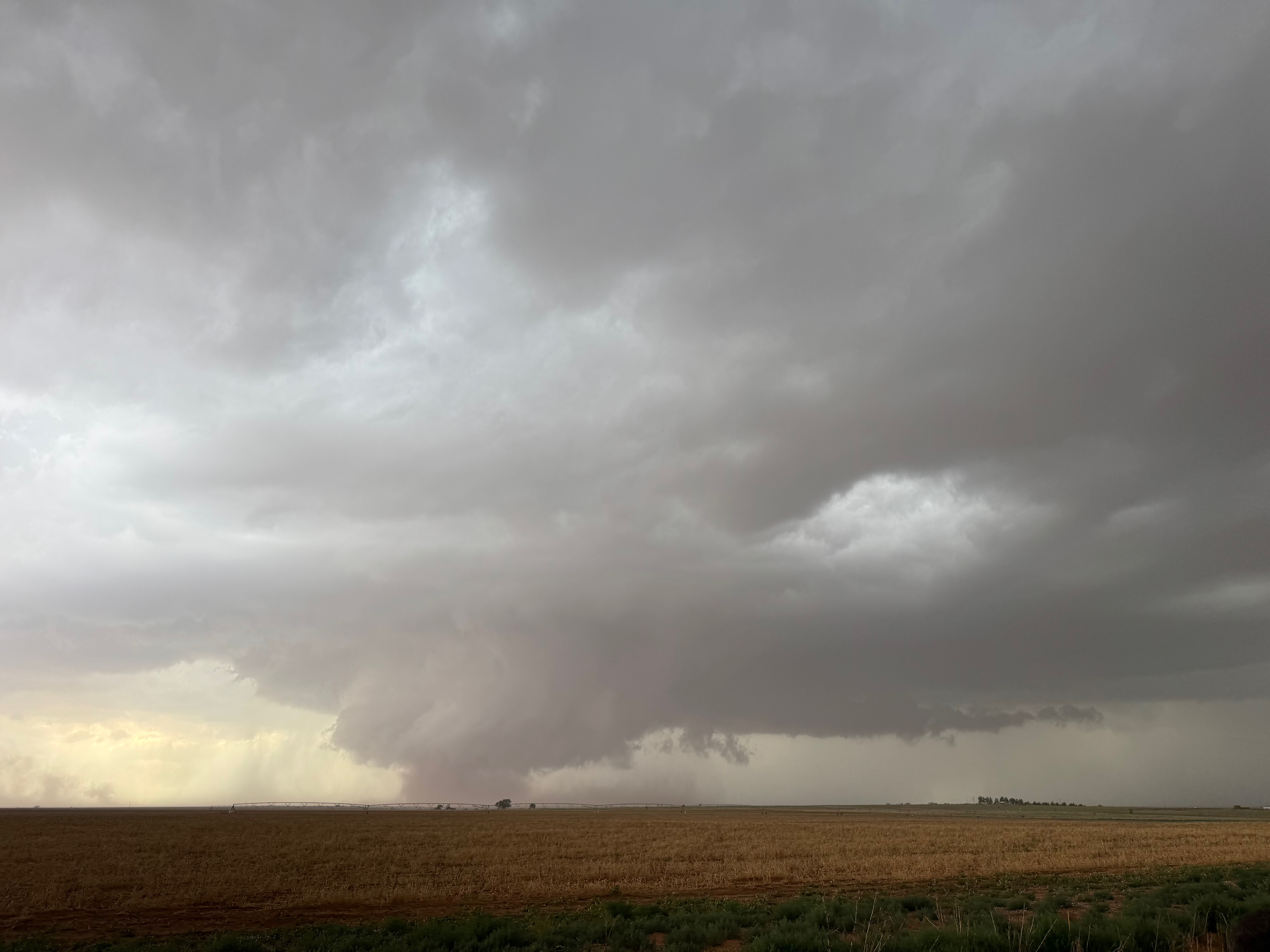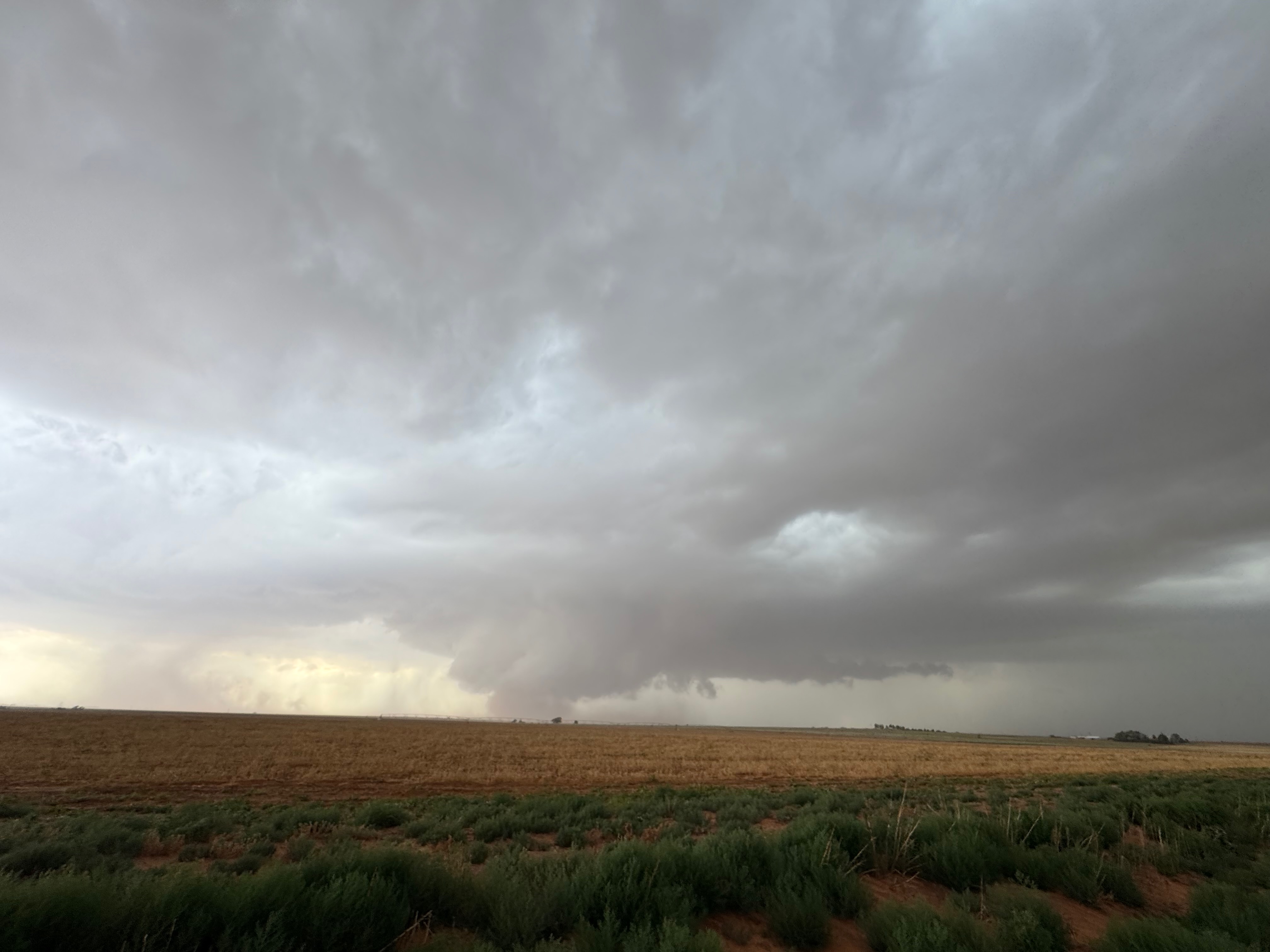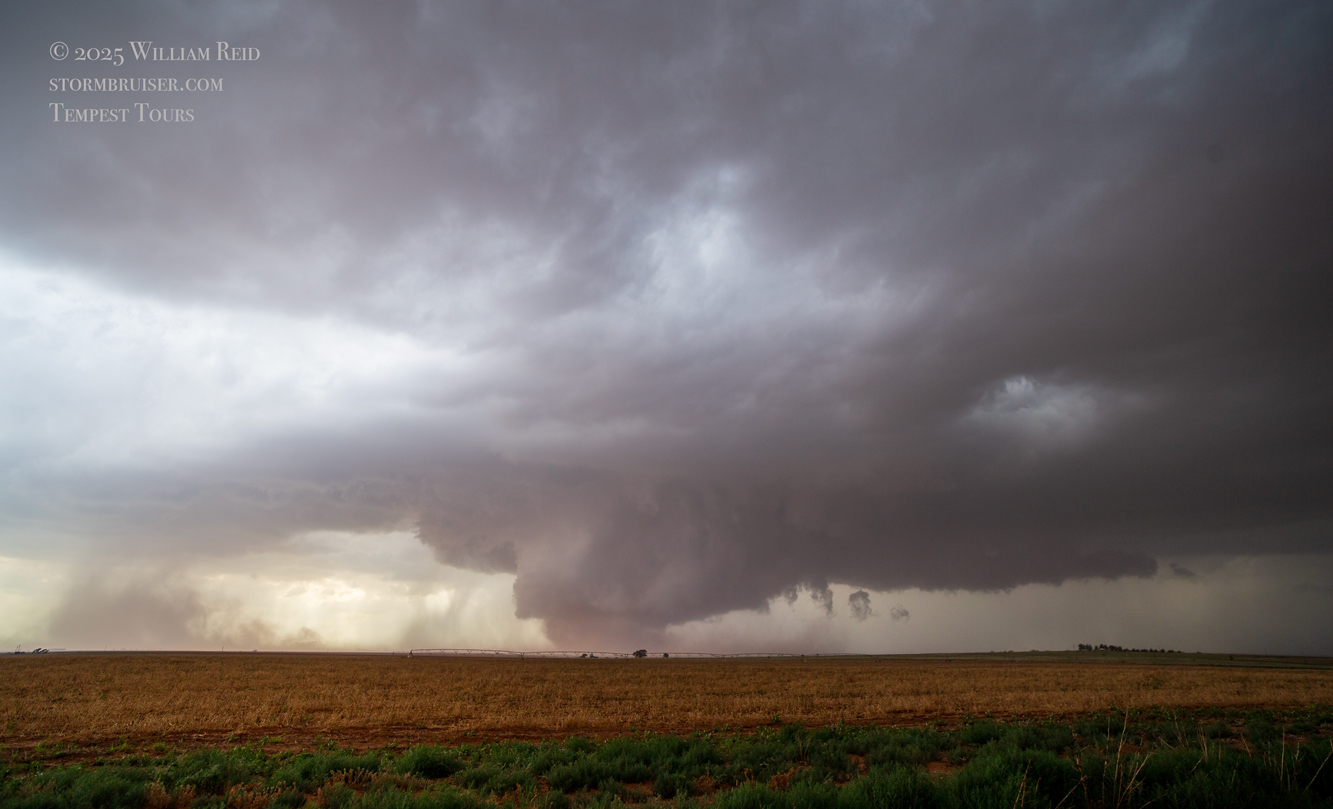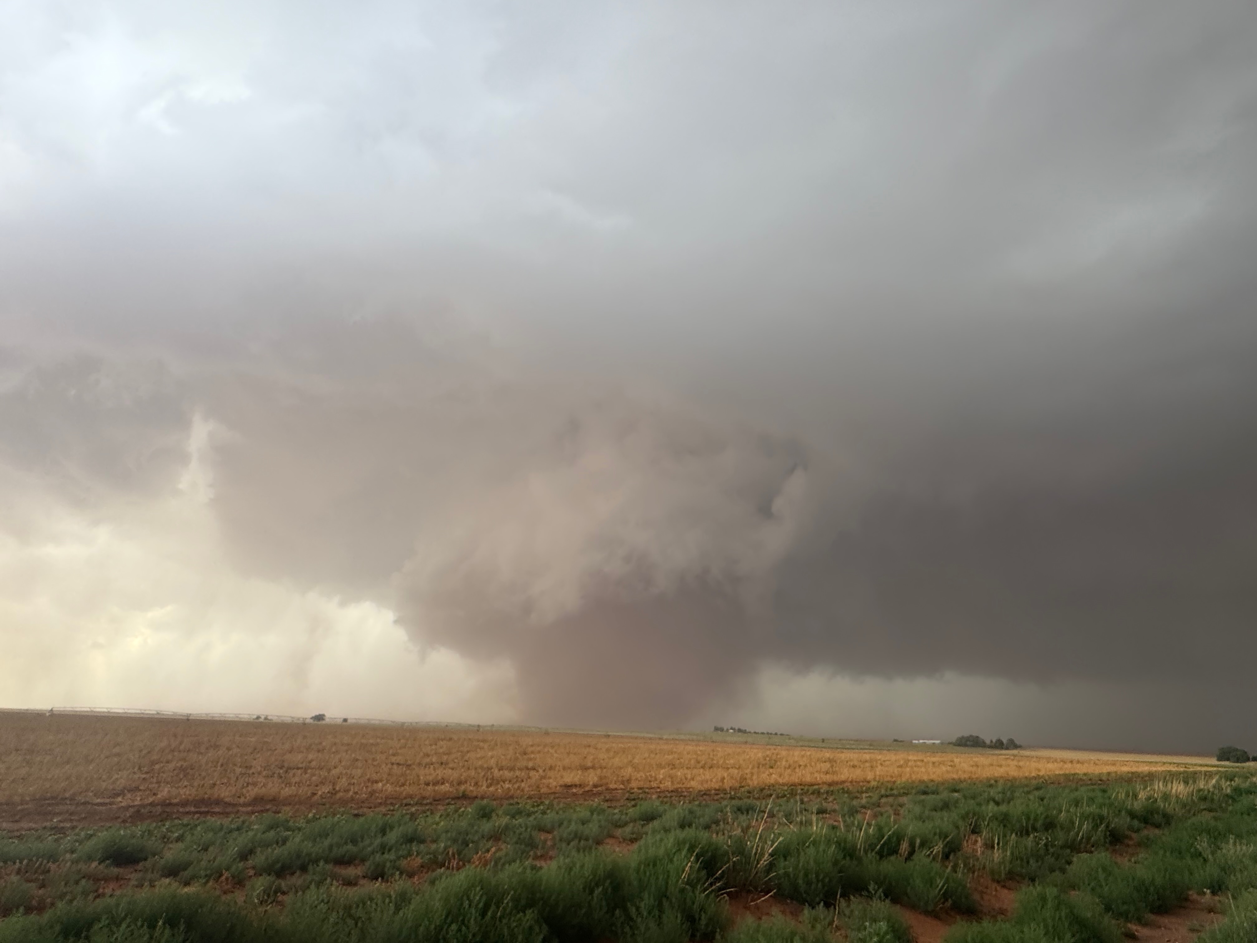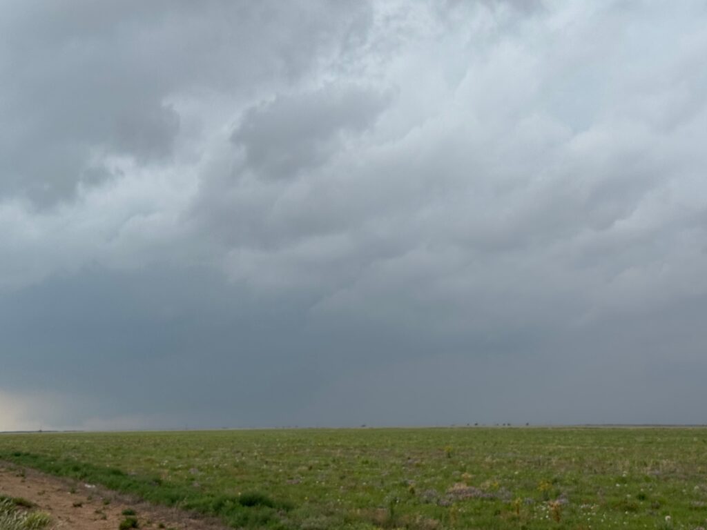 The forward-flank precipitation of this developing supercell was spreading over Causey, NM. We could stop to wait along this N-S segment of 114 just over the border in New Mexico, south of Causey. But I wanted to get closer to the action area to the west, as this new storm was looking quite good already. I had Alex and Matt take us west on a dubious dirt road from Lingo. We stopped after maybe five or six miles, and this spot provided a great look at the front end of the updraft and the storm base. There was a low-level inflow feature feeding in on the east side (first pic below), and the base was LOW LOW LOW! A wall cloud with that “pregnant lowering” look was practically scraping the ground (pics 4 to 9 below). I told the group that it would be impossible for this storm to NOT produce a tornado.
