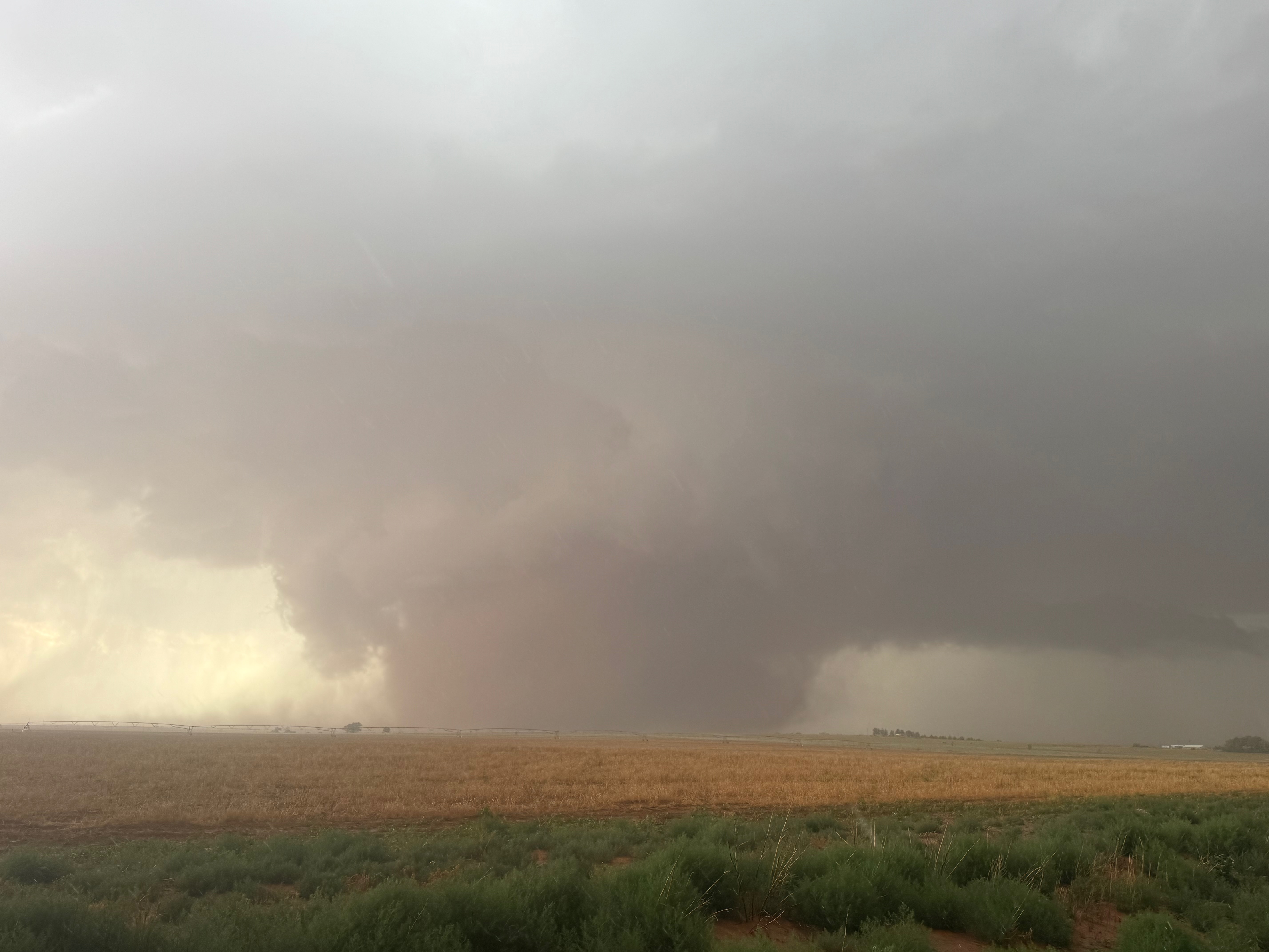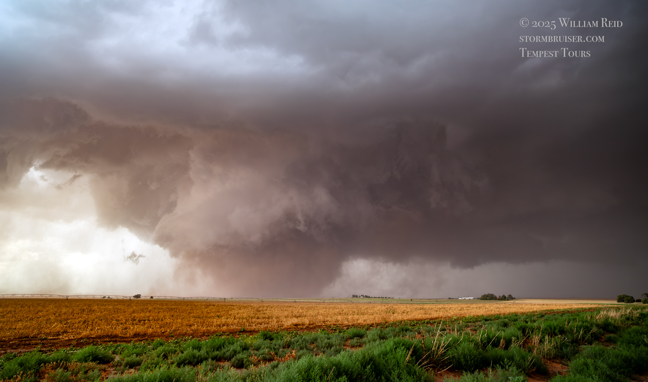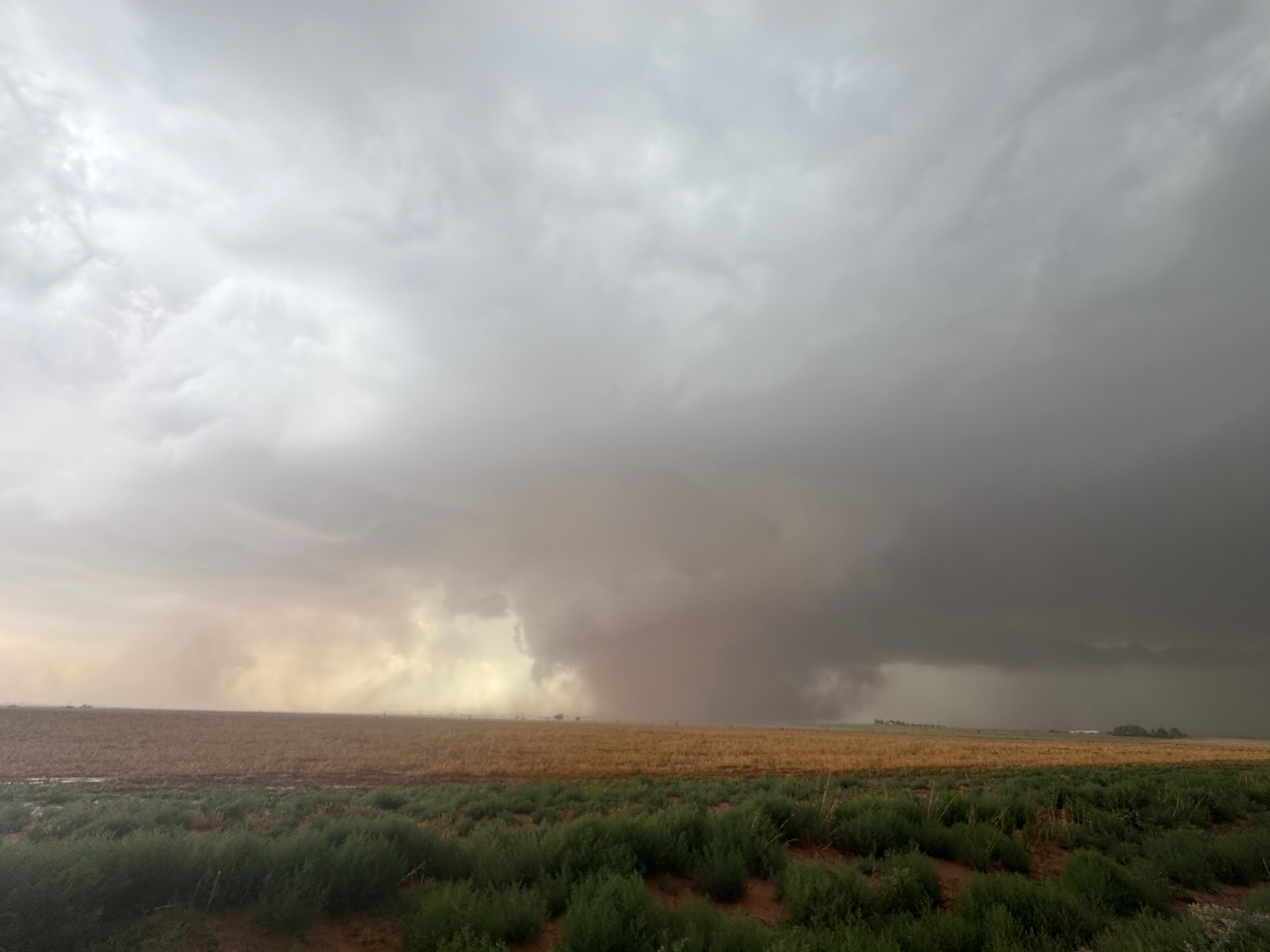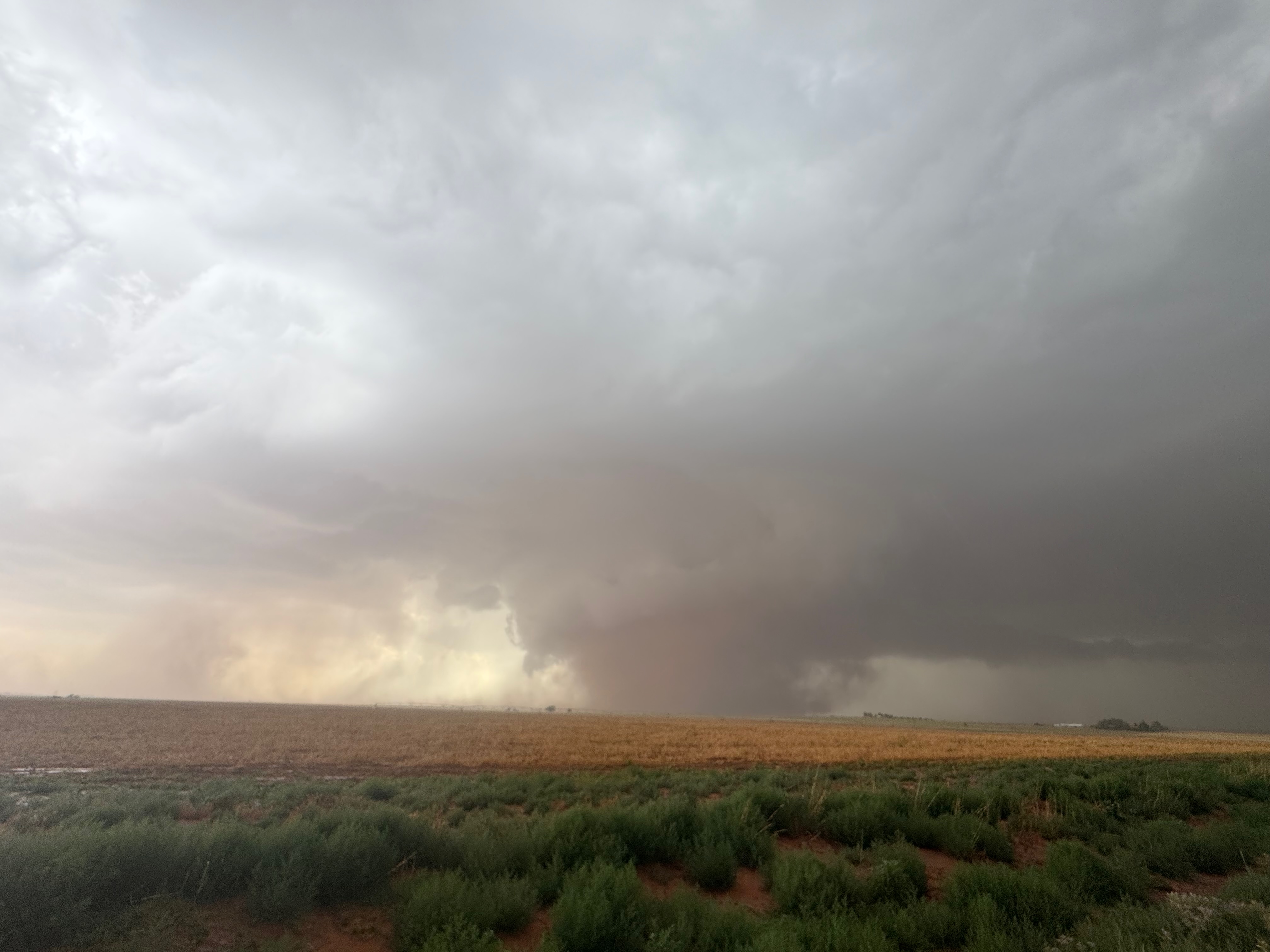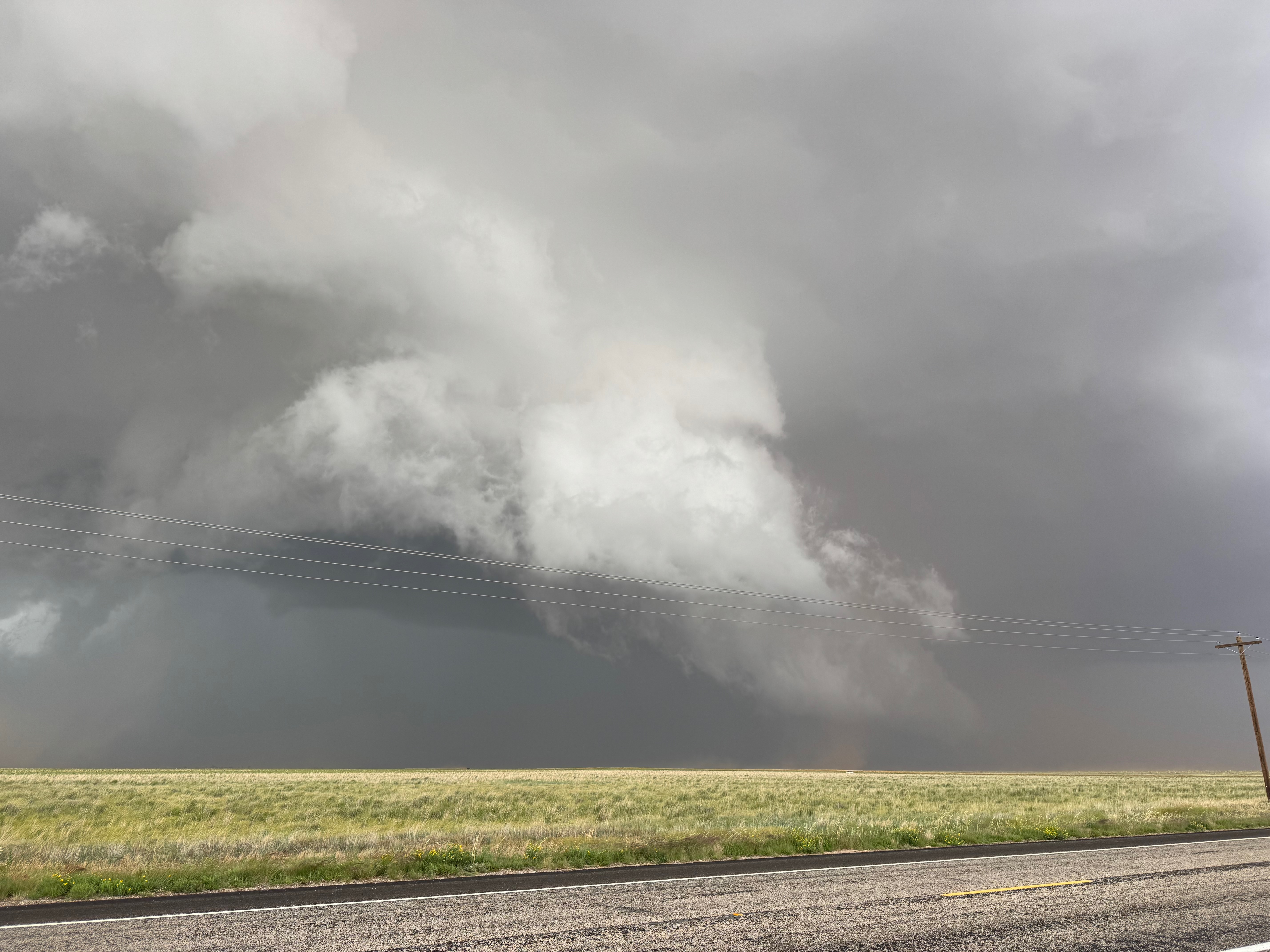 The forward-flank precipitation of this developing supercell was spreading over Causey, NM. We could stop to wait along this N-S segment of 114 just over the border in New Mexico, south of Causey. But I wanted to get closer to the action area to the west, as this new storm was looking quite good already. I had Alex and Matt take us west on a dubious dirt road from Lingo. We stopped after maybe five or six miles, and this spot provided a great look at the front end of the updraft and the storm base. There was a low-level inflow feature feeding in on the east side (first pic below), and the base was LOW LOW LOW! A wall cloud with that “pregnant lowering” look was practically scraping the ground (pics 4 to 9 below). I told the group that it would be impossible for this storm to NOT produce a tornado.