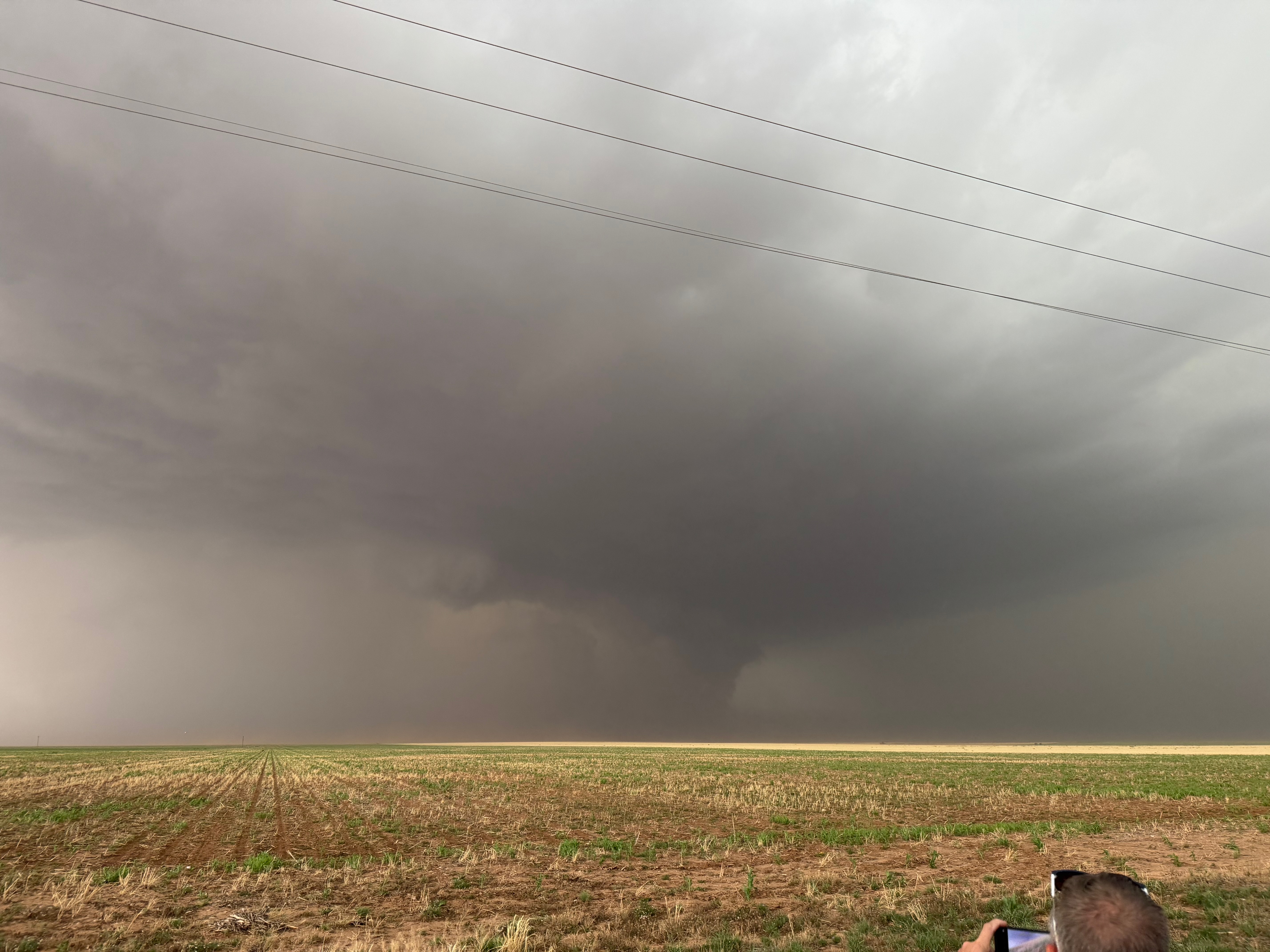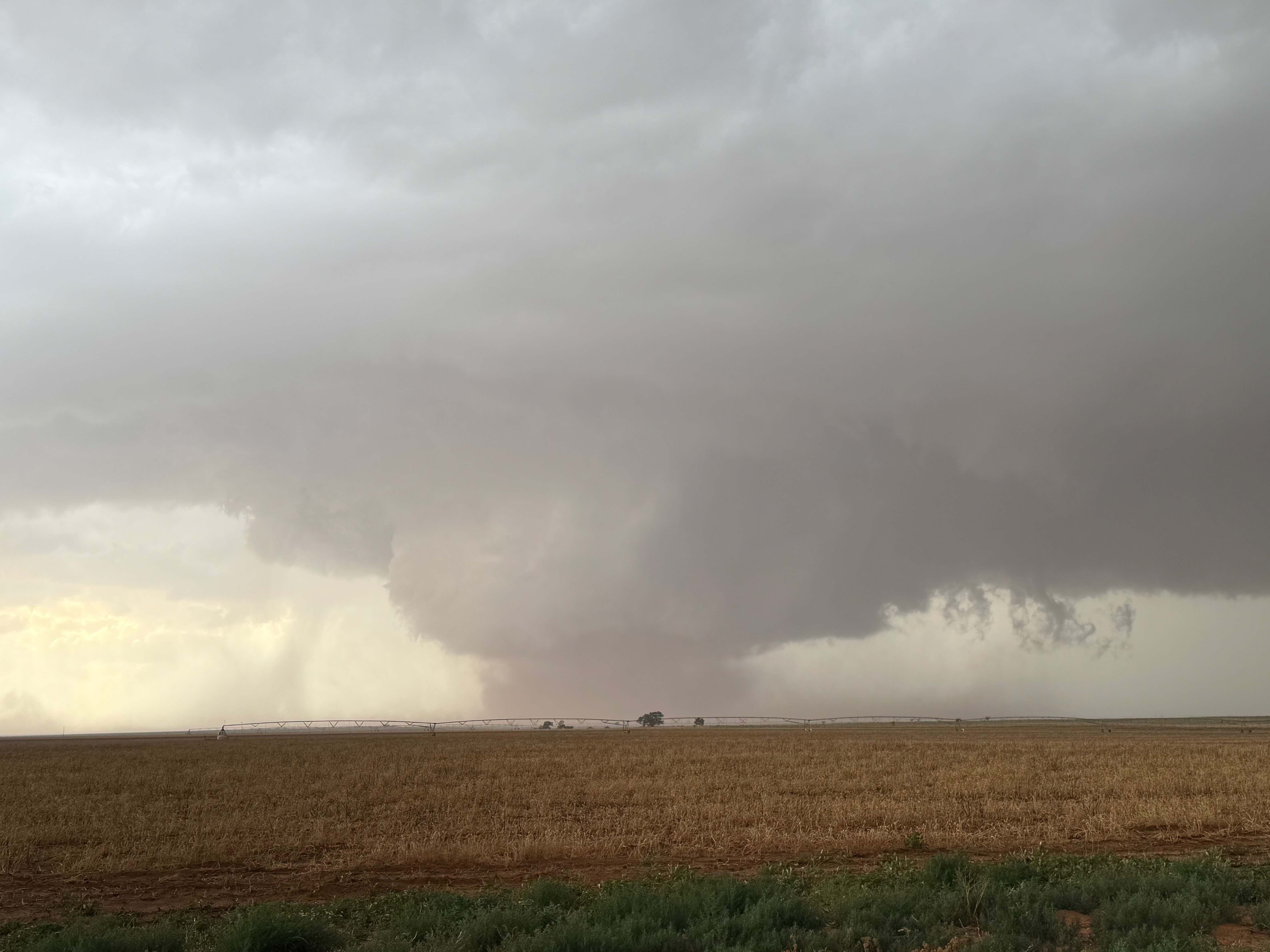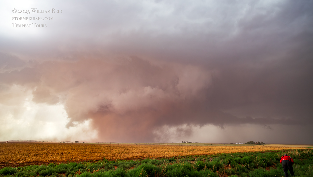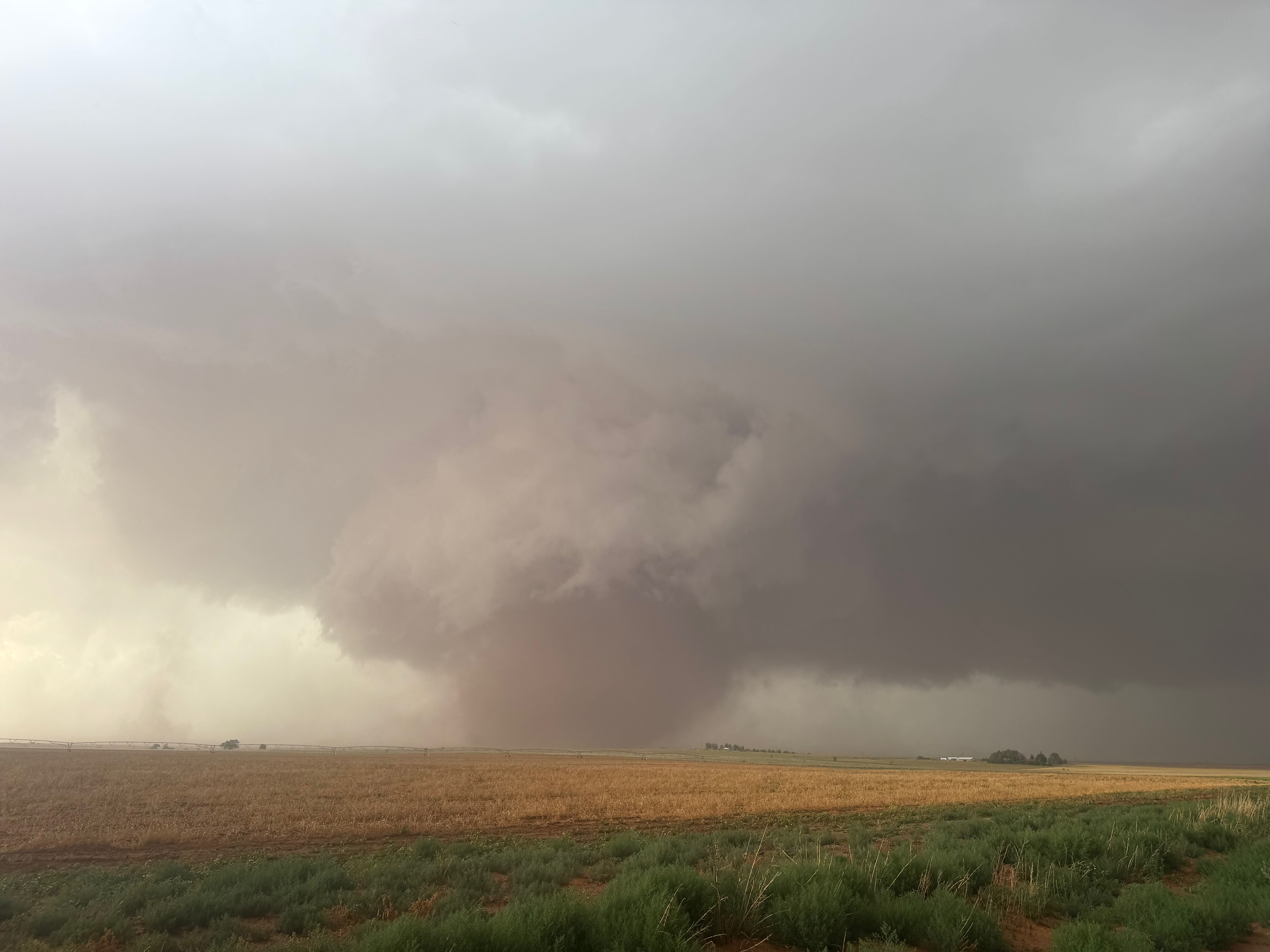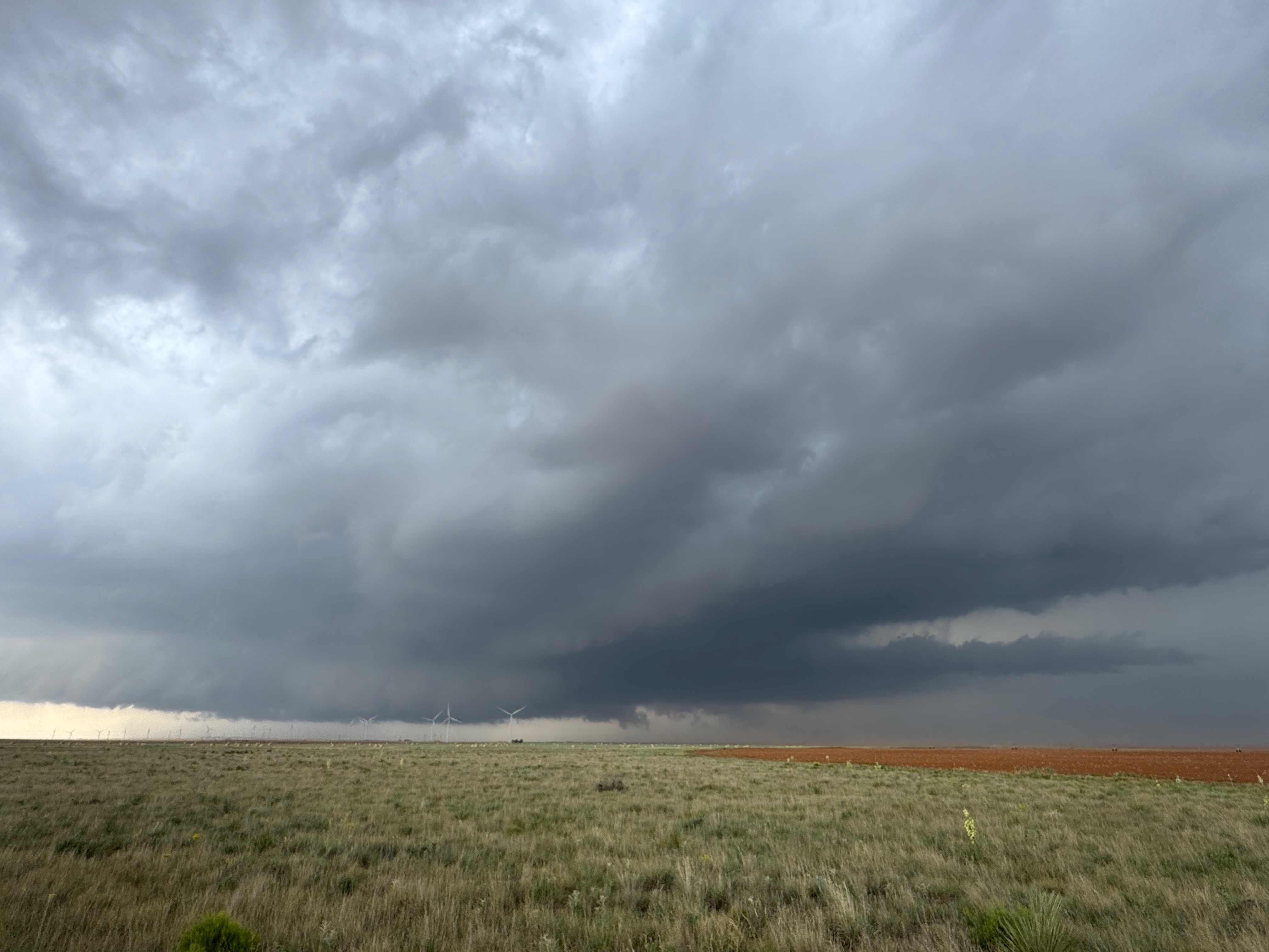 The forward-flank precipitation of this developing supercell was spreading over Causey, NM. We could stop to wait along this N-S segment of 114 just over the border in New Mexico, south of Causey. But I wanted to get closer to the action area to the west, as this new storm was looking quite good already. I had Alex and Matt take us west on a dubious dirt road from Lingo. We stopped after maybe five or six miles, and this spot provided a great look at the front end of the updraft and the storm base. There was a low-level inflow feature feeding in on the east side (first pic below), and the base was LOW LOW LOW! A wall cloud with that “pregnant lowering” look was practically scraping the ground (pics 4 to 9 below). I told the group that it would be impossible for this storm to NOT produce a tornado.