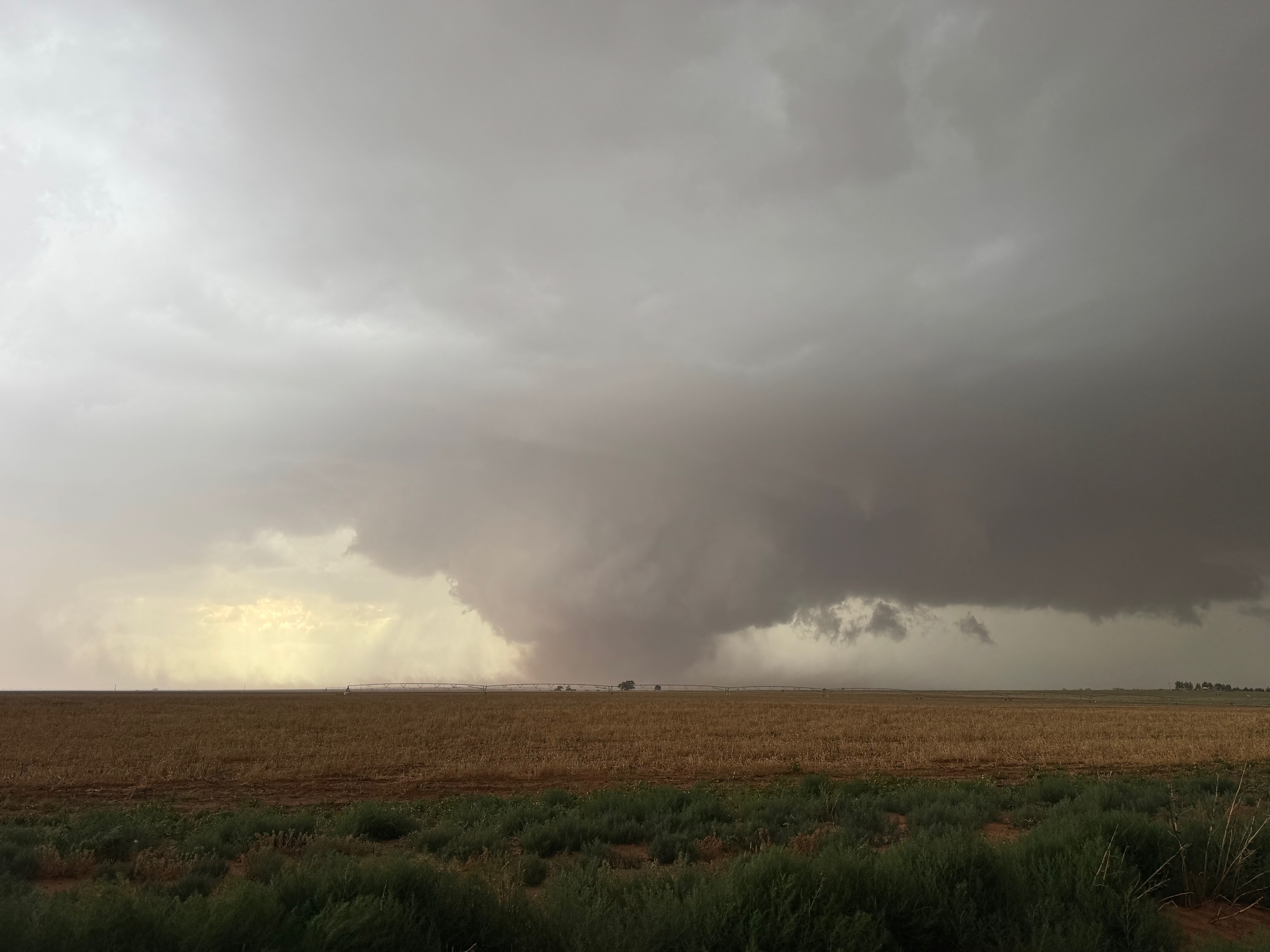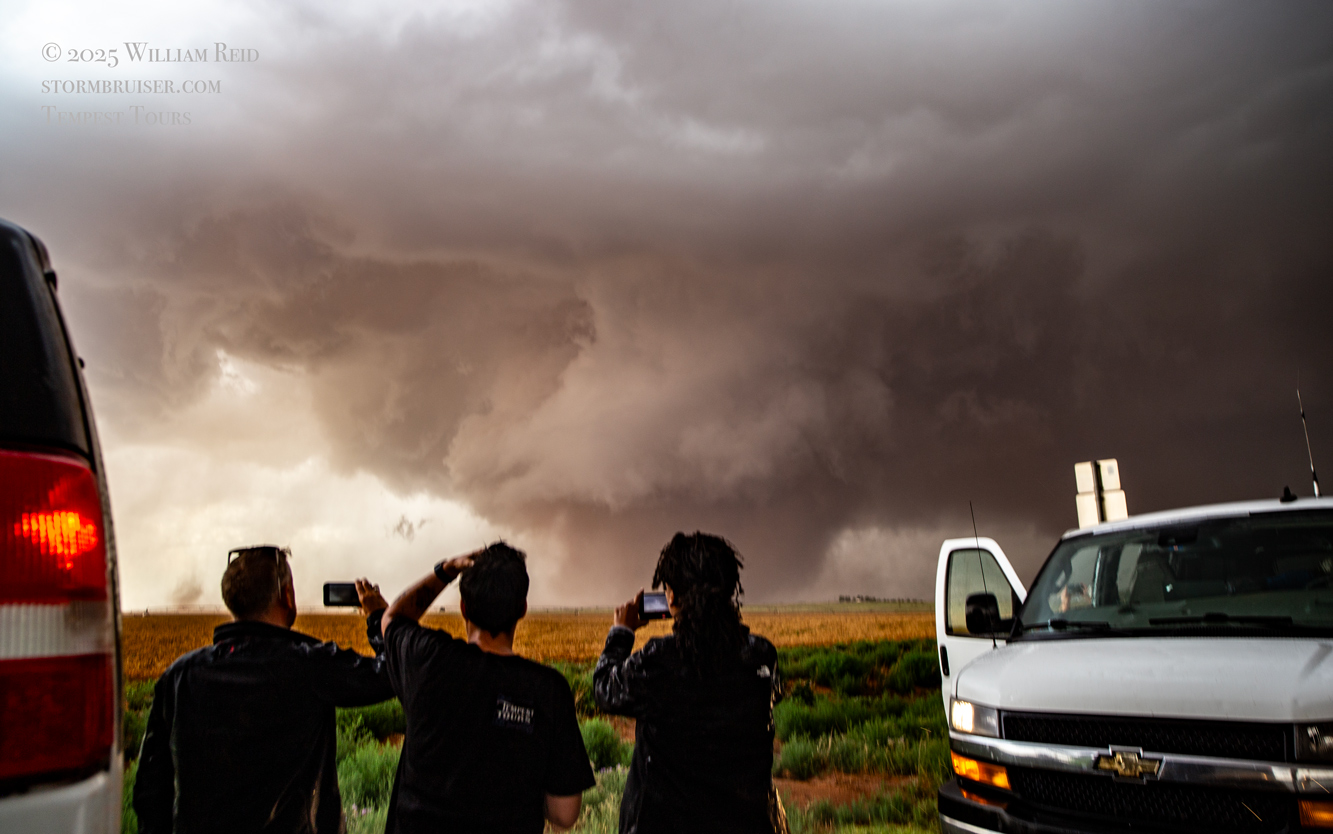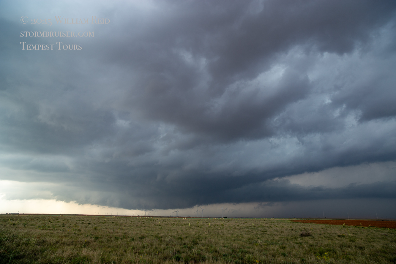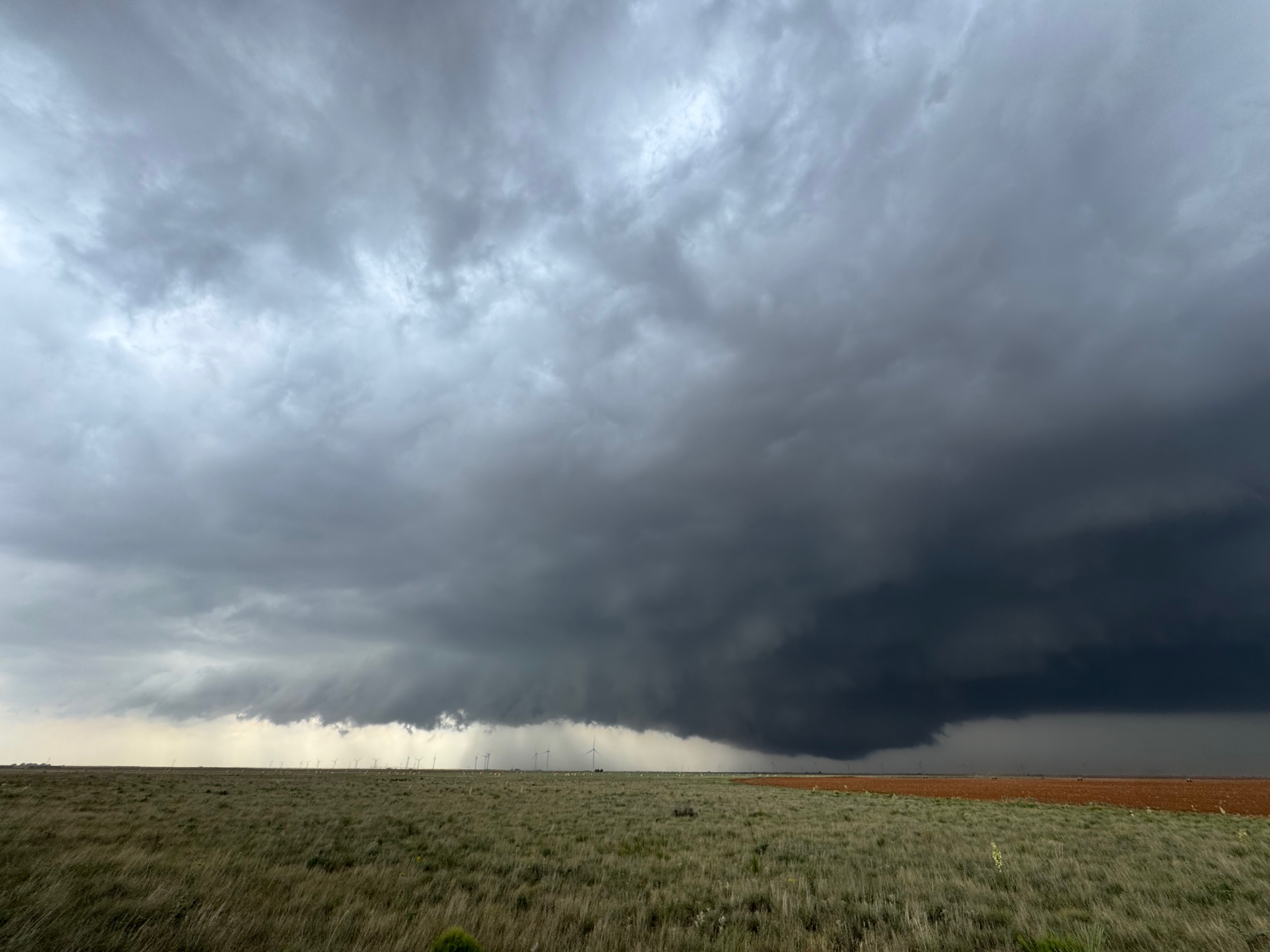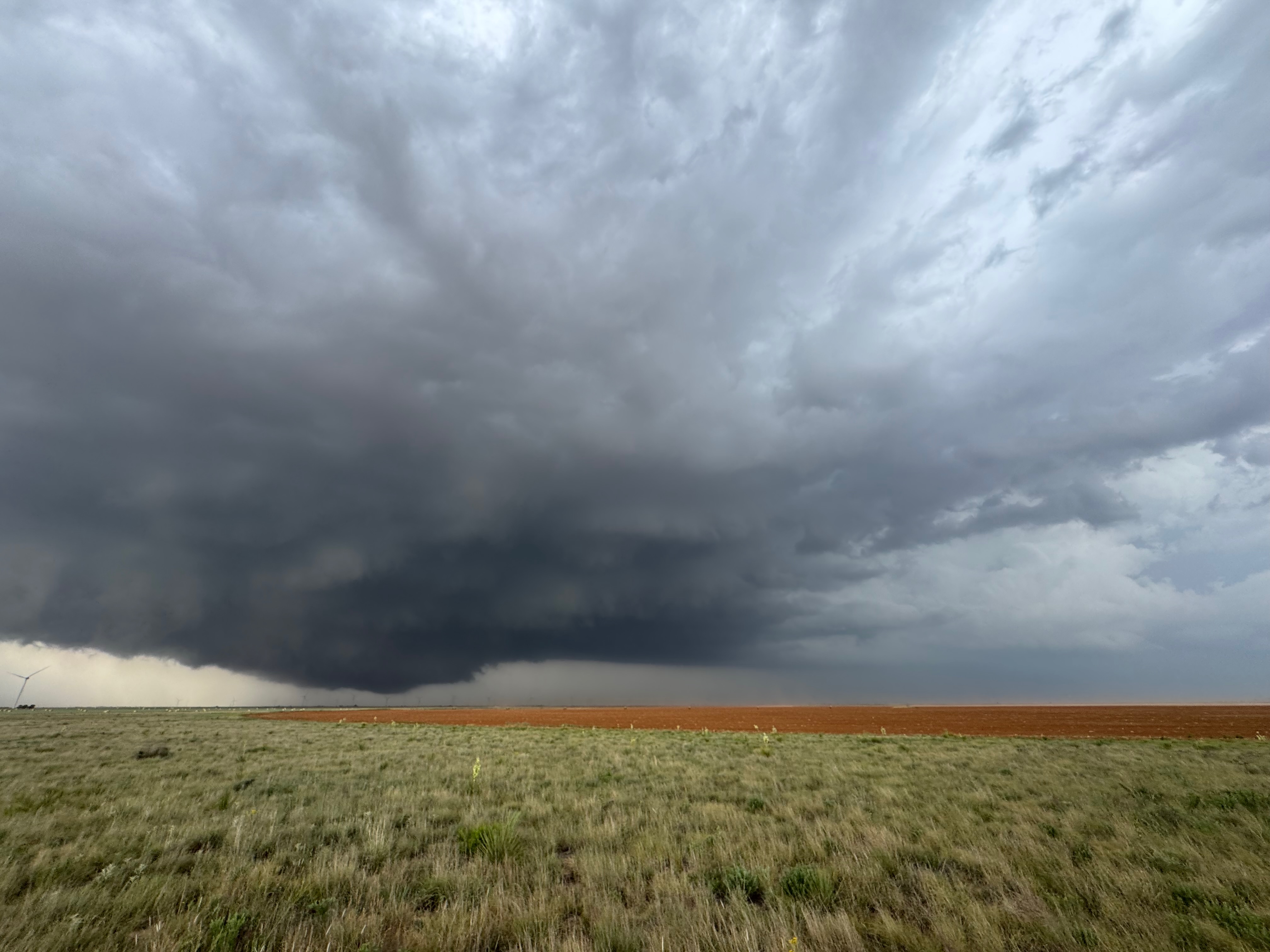 The forward-flank precipitation of this developing supercell was spreading over Causey, NM. We could stop to wait along this N-S segment of 114 just over the border in New Mexico, south of Causey. But I wanted to get closer to the action area to the west, as this new storm was looking quite good already. I had Alex and Matt take us west on a dubious dirt road from Lingo. We stopped after maybe five or six miles, and this spot provided a great look at the front end of the updraft and the storm base. There was a low-level inflow feature feeding in on the east side (first pic below), and the base was LOW LOW LOW! A wall cloud with that “pregnant lowering” look was practically scraping the ground (pics 4 to 9 below). I told the group that it would be impossible for this storm to NOT produce a tornado.