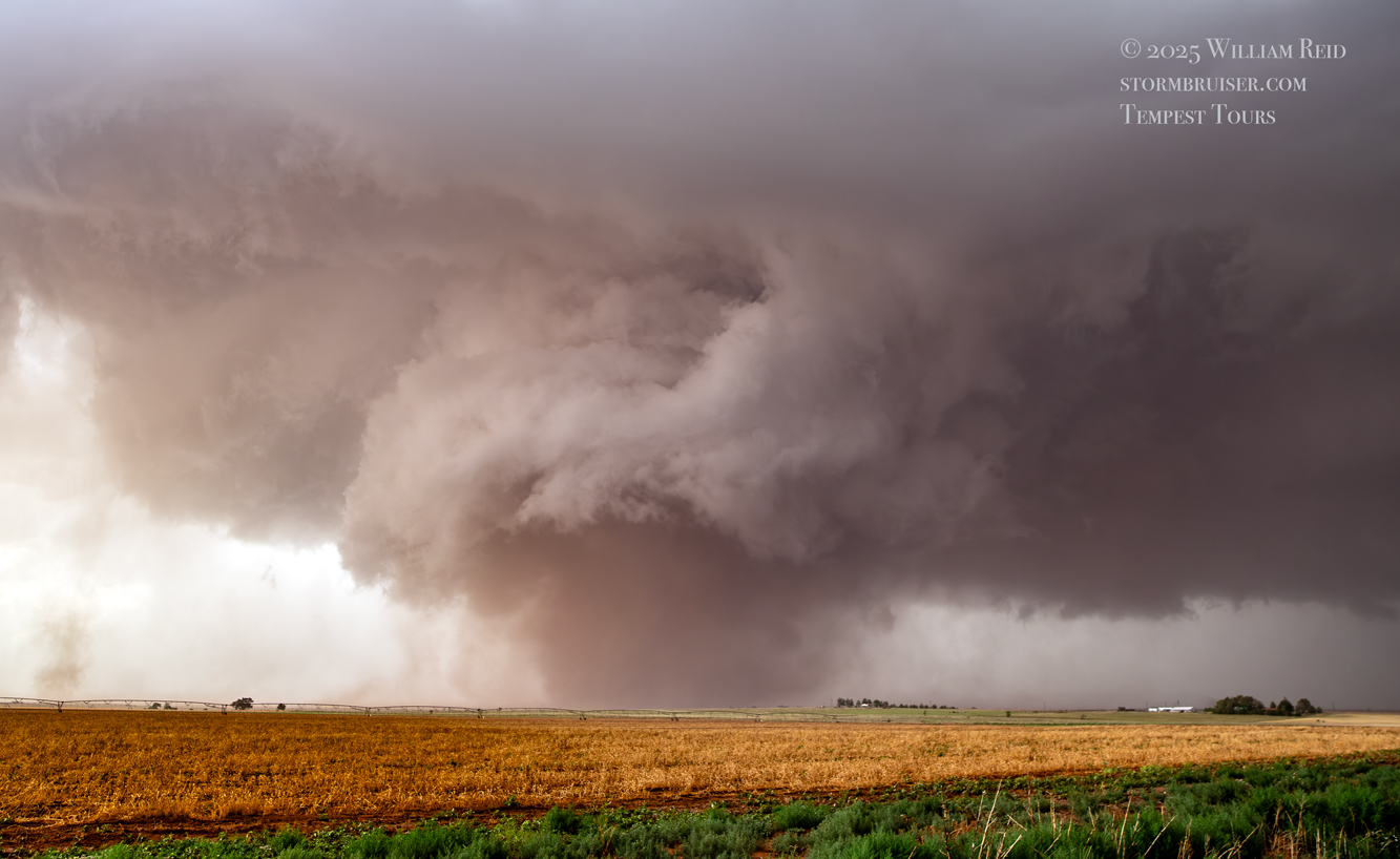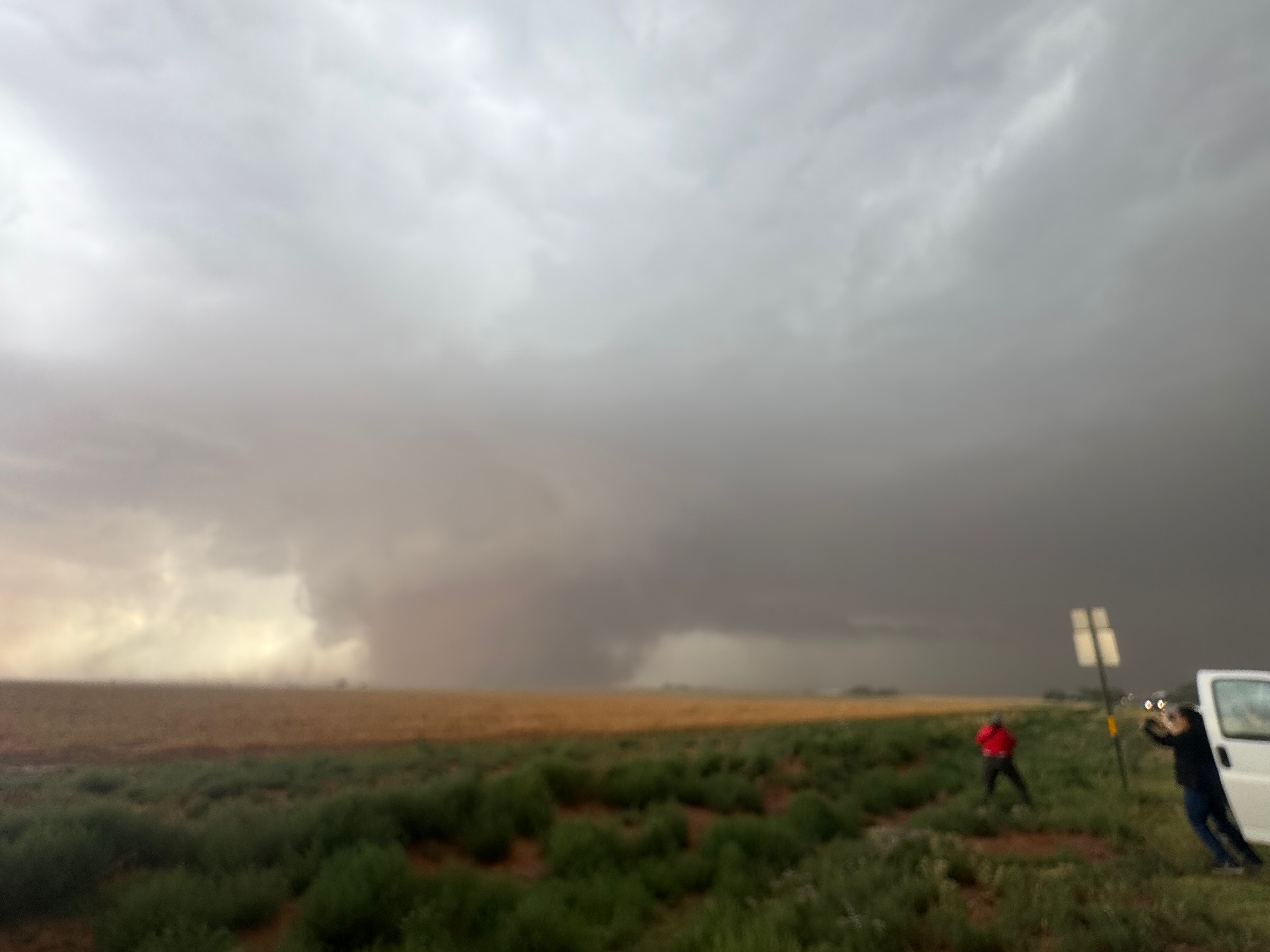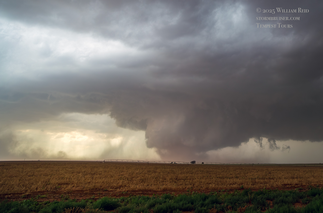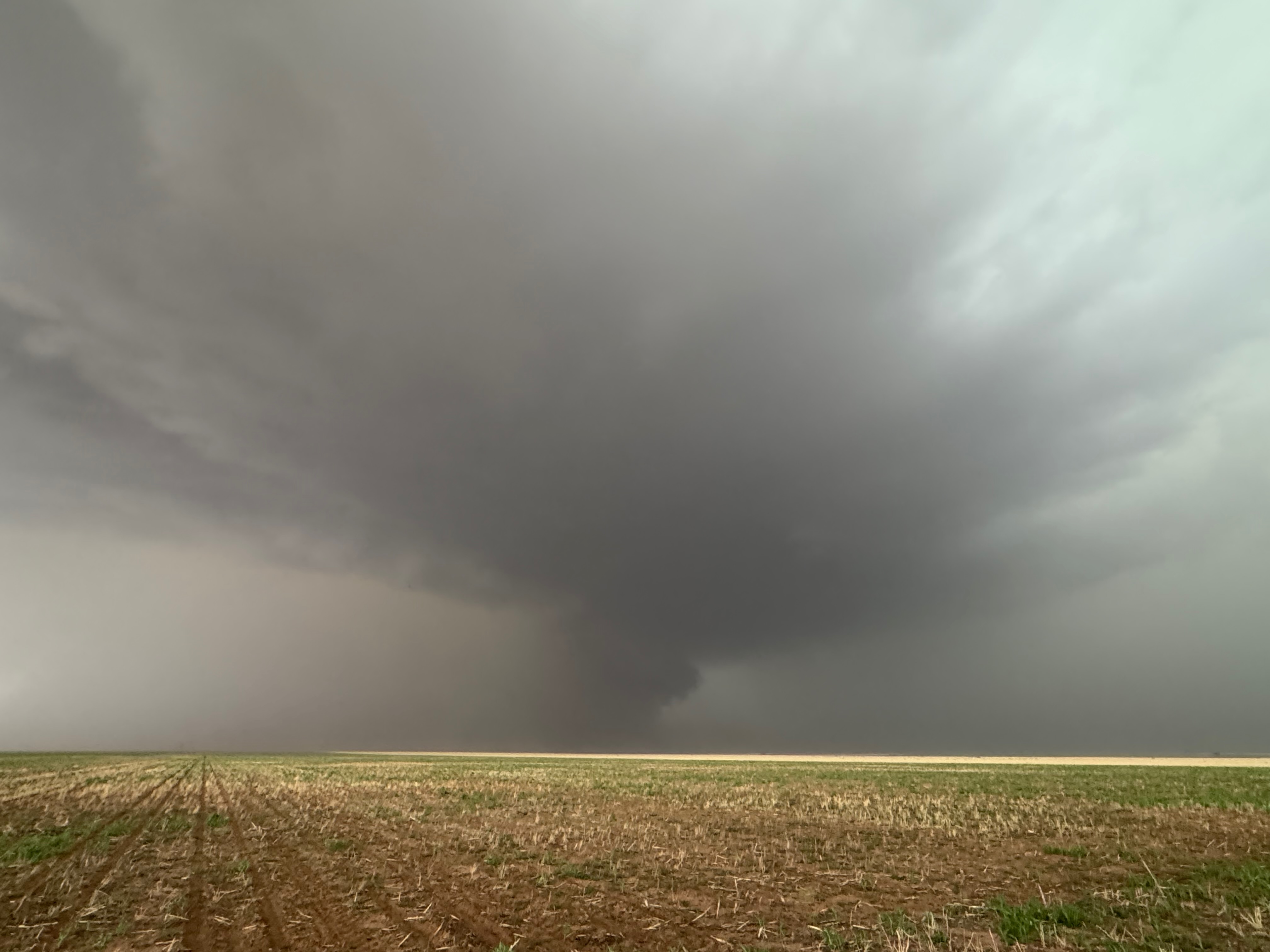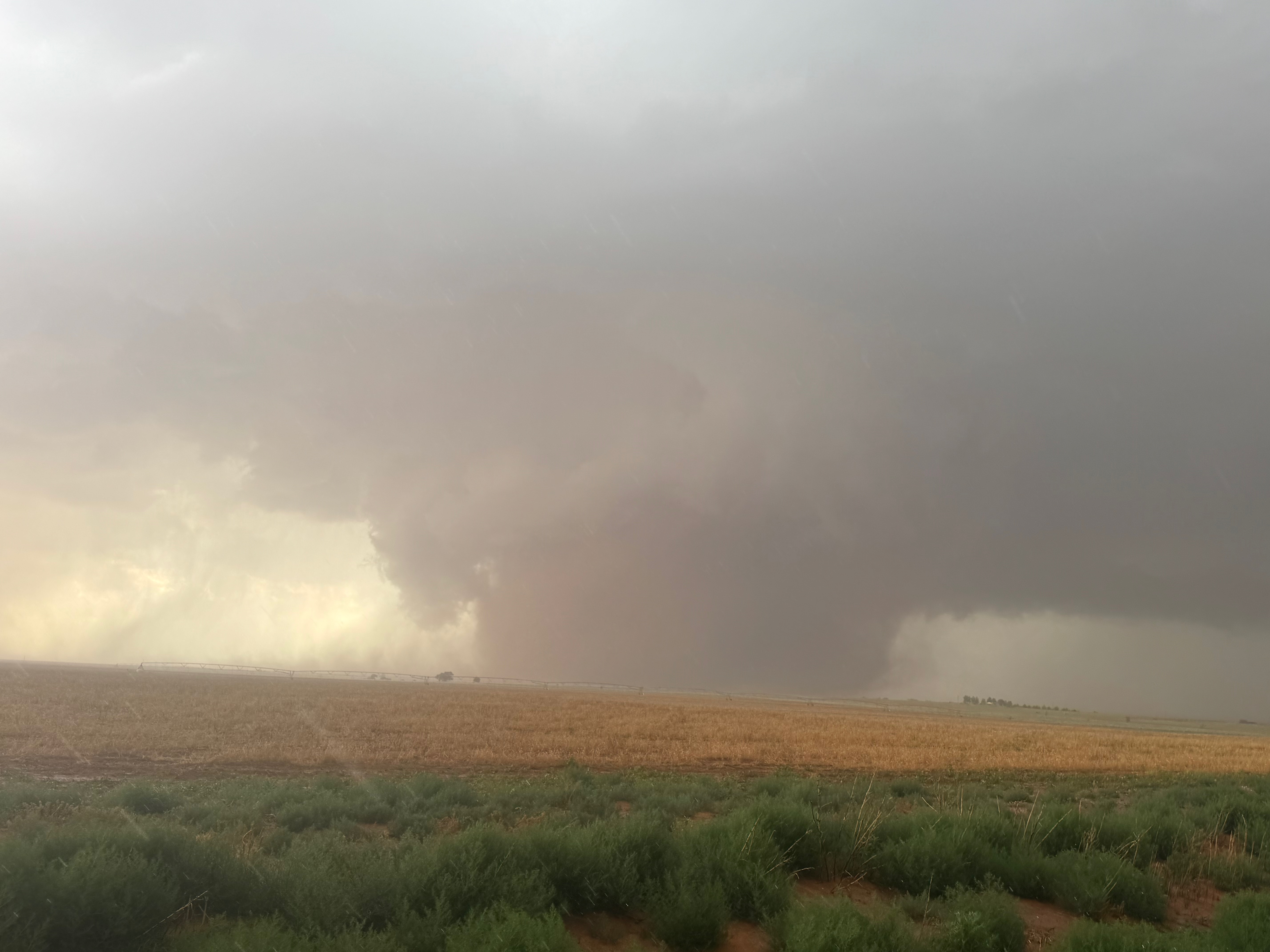 The forward-flank precipitation of this developing supercell was spreading over Causey, NM. We could stop to wait along this N-S segment of 114 just over the border in New Mexico, south of Causey. But I wanted to get closer to the action area to the west, as this new storm was looking quite good already. I had Alex and Matt take us west on a dubious dirt road from Lingo. We stopped after maybe five or six miles, and this spot provided a great look at the front end of the updraft and the storm base. There was a low-level inflow feature feeding in on the east side (first pic below), and the base was LOW LOW LOW! A wall cloud with that “pregnant lowering” look was practically scraping the ground (pics 4 to 9 below). I told the group that it would be impossible for this storm to NOT produce a tornado.