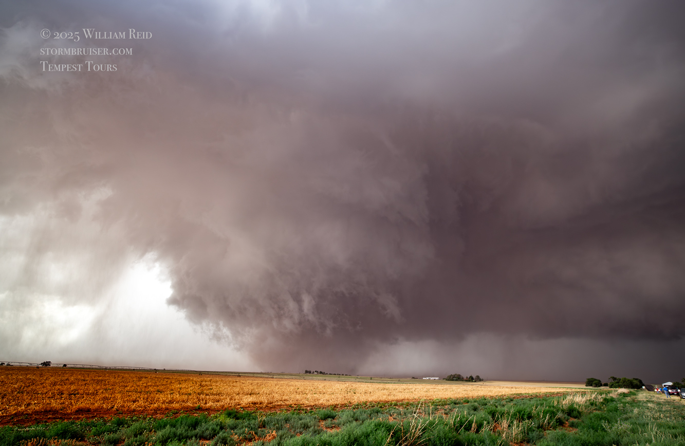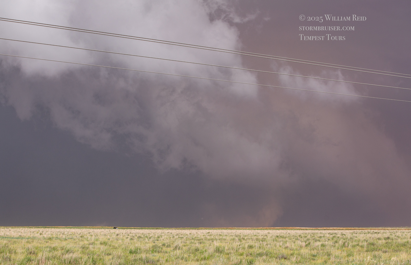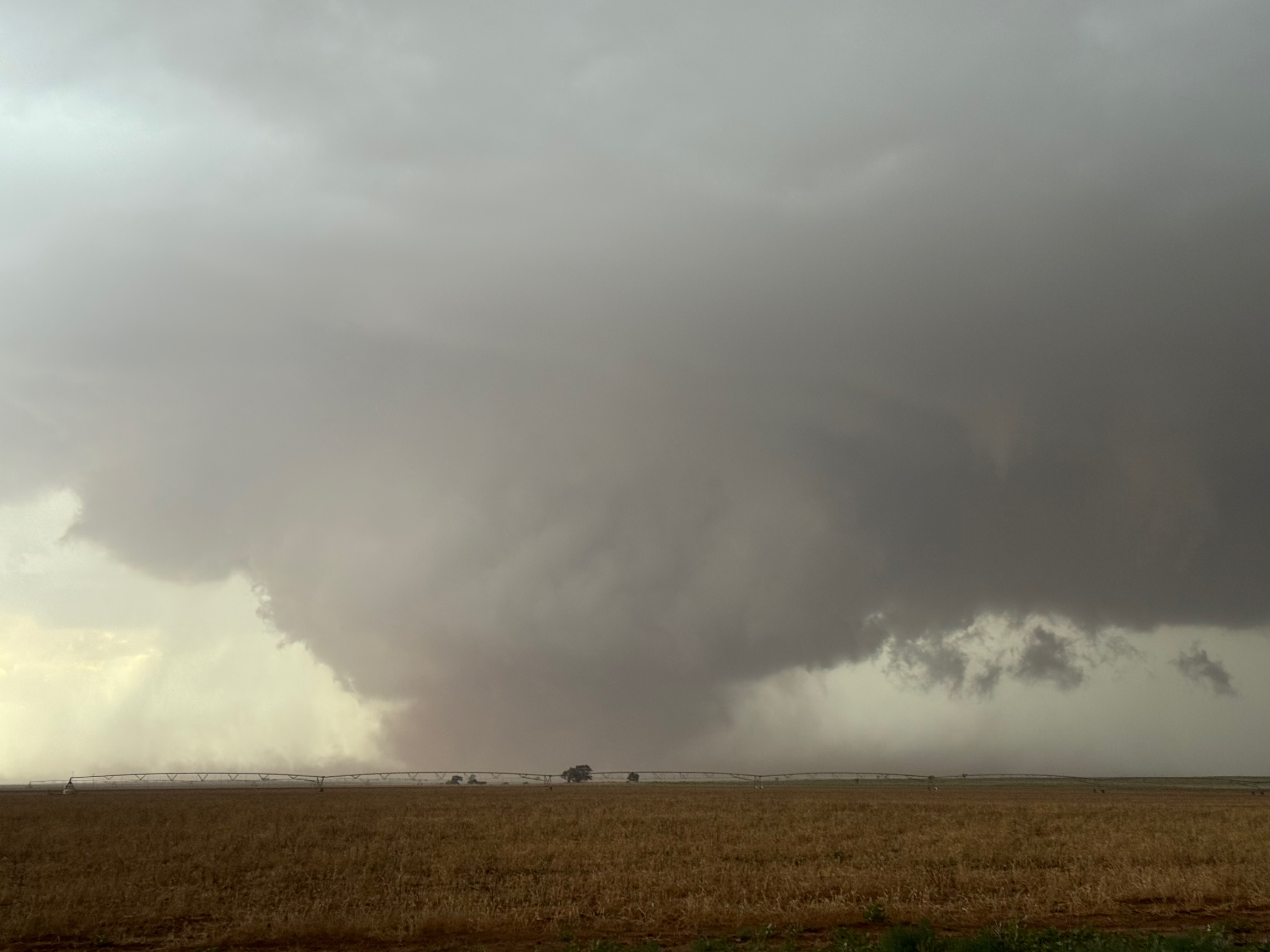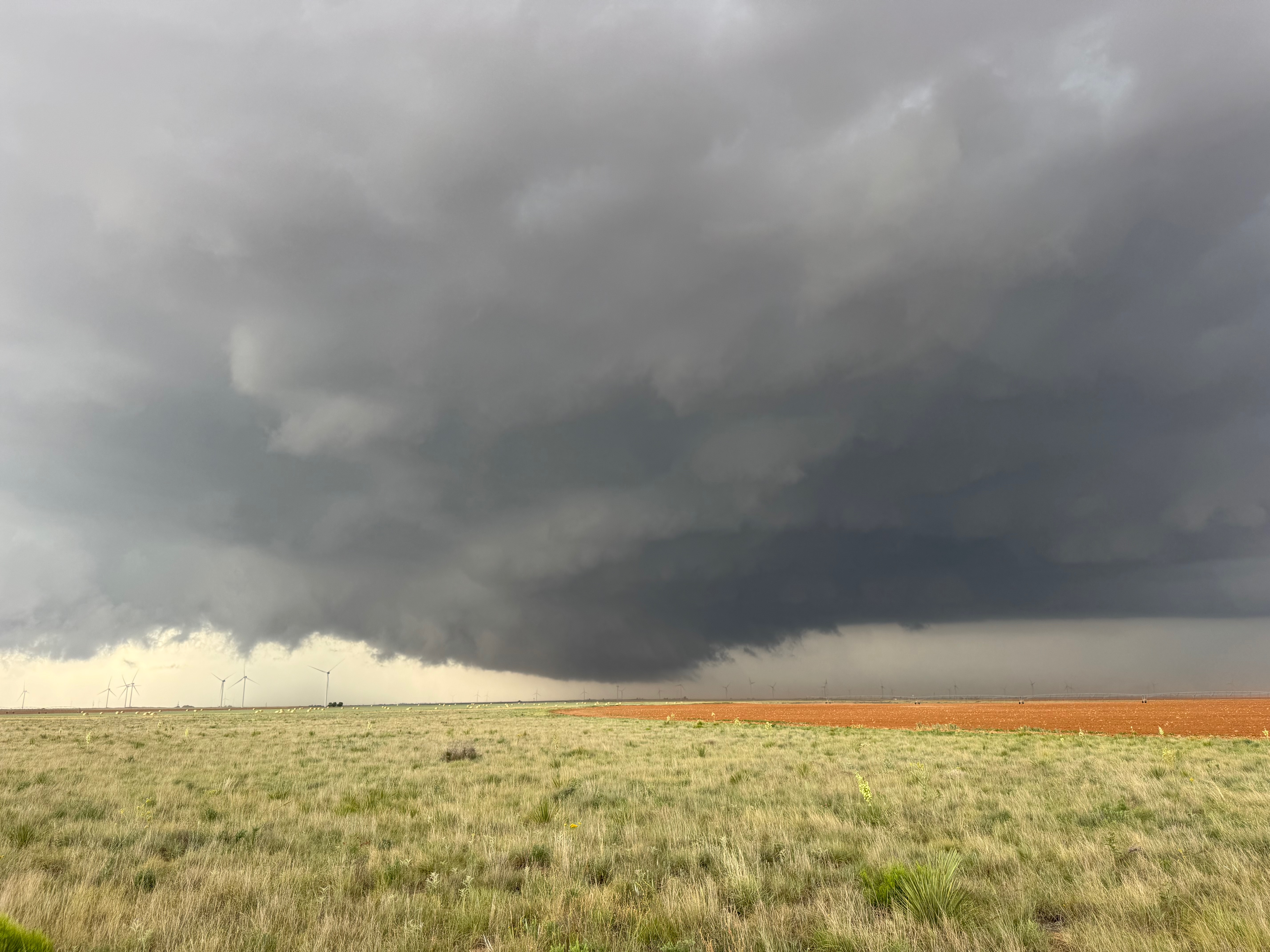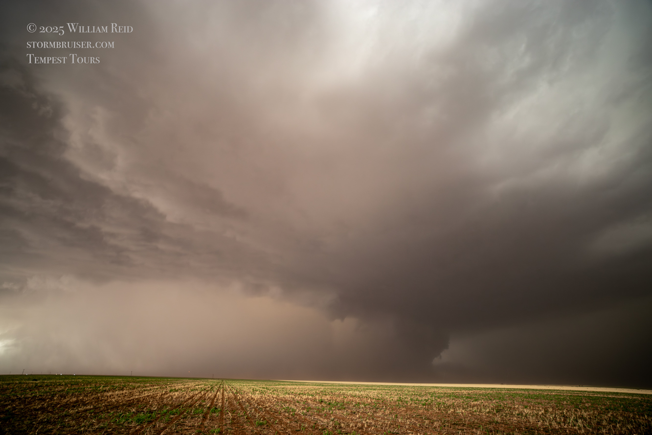 The forward-flank precipitation of this developing supercell was spreading over Causey, NM. We could stop to wait along this N-S segment of 114 just over the border in New Mexico, south of Causey. But I wanted to get closer to the action area to the west, as this new storm was looking quite good already. I had Alex and Matt take us west on a dubious dirt road from Lingo. We stopped after maybe five or six miles, and this spot provided a great look at the front end of the updraft and the storm base. There was a low-level inflow feature feeding in on the east side (first pic below), and the base was LOW LOW LOW! A wall cloud with that “pregnant lowering” look was practically scraping the ground (pics 4 to 9 below). I told the group that it would be impossible for this storm to NOT produce a tornado.