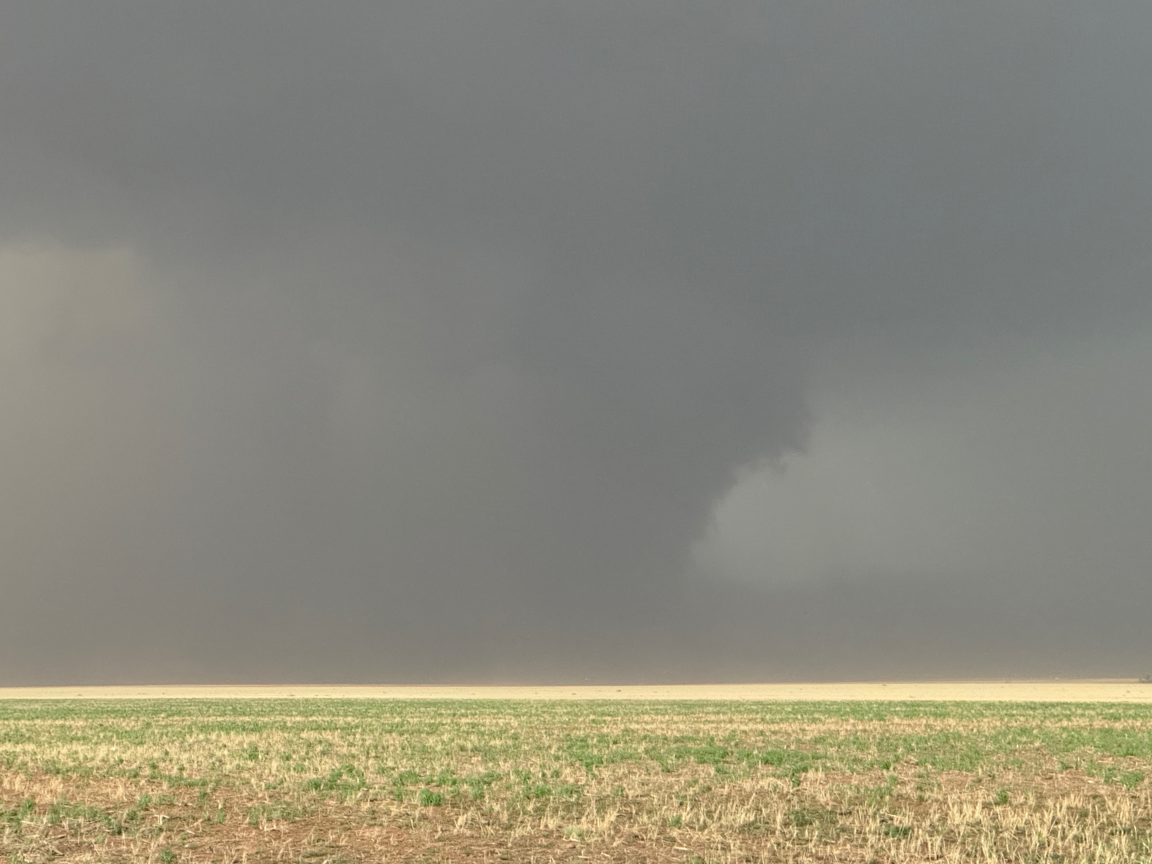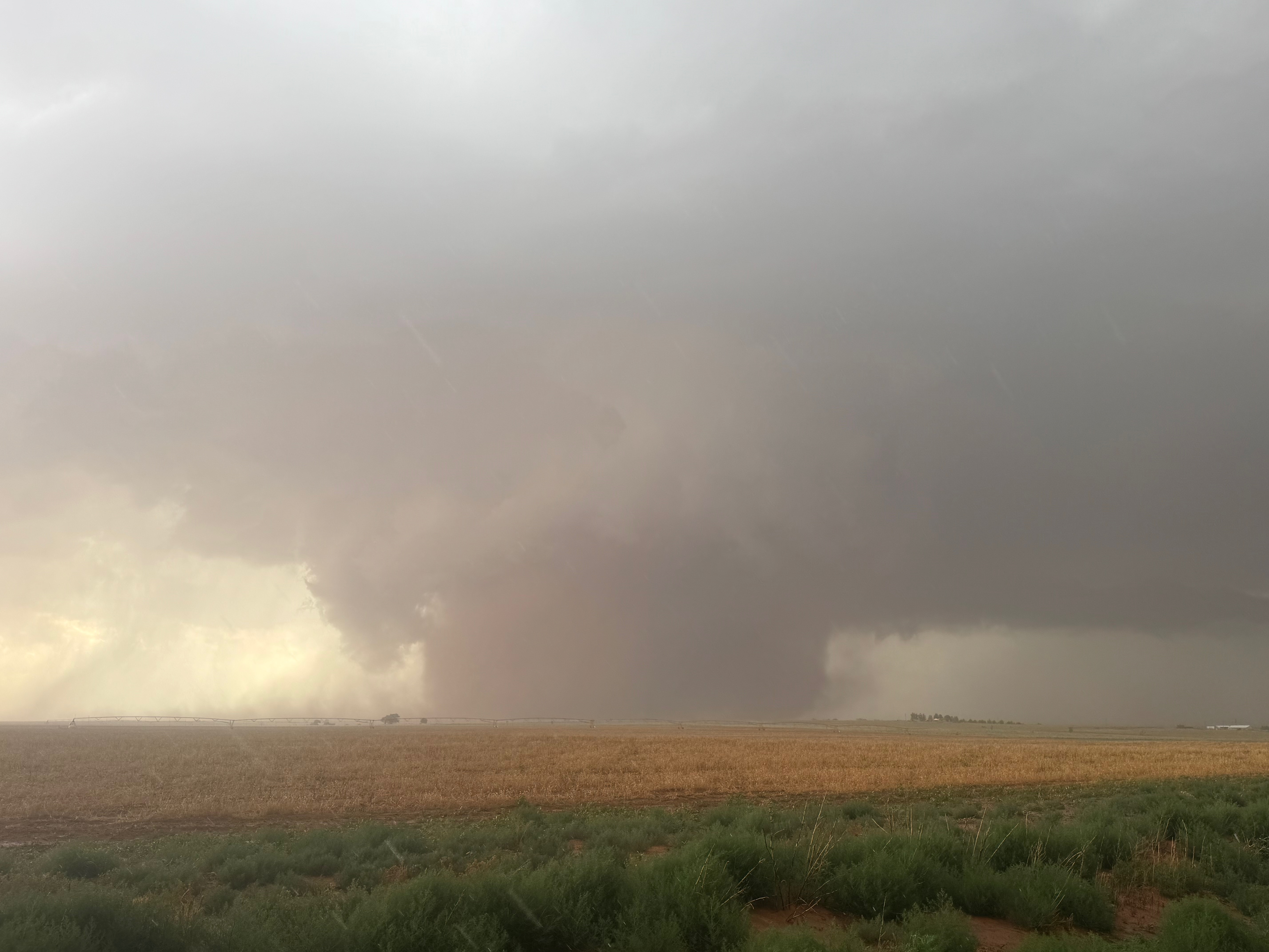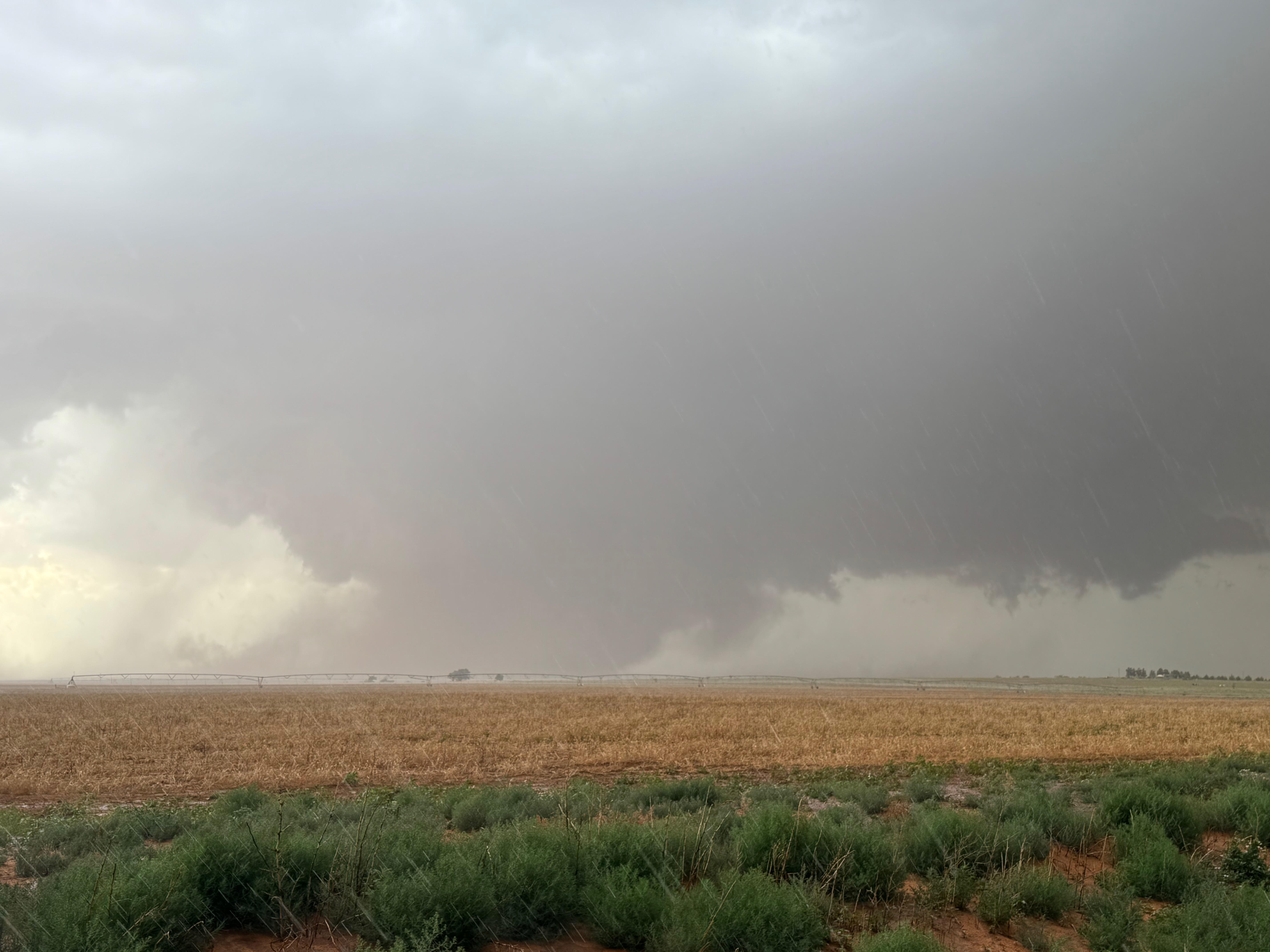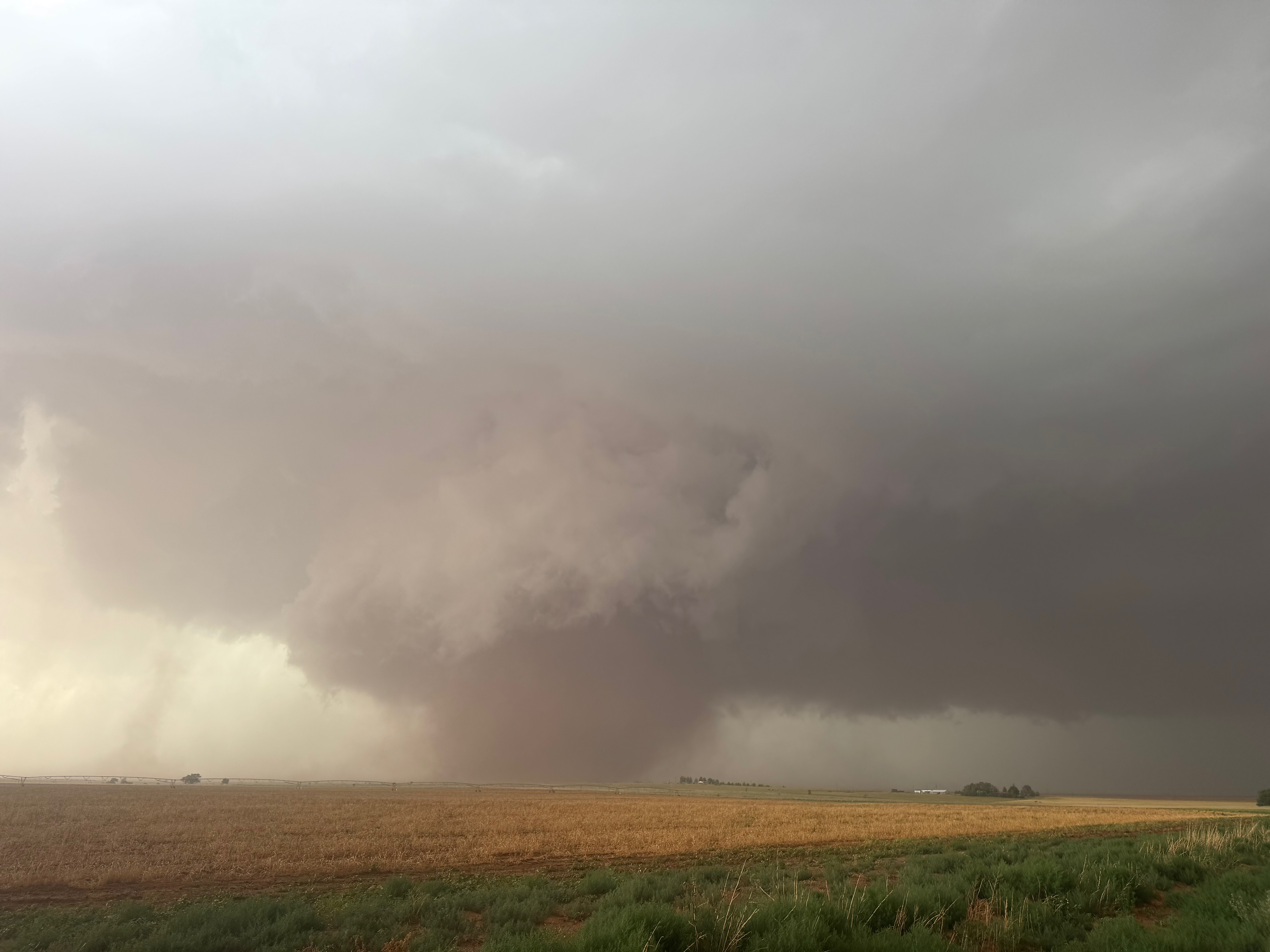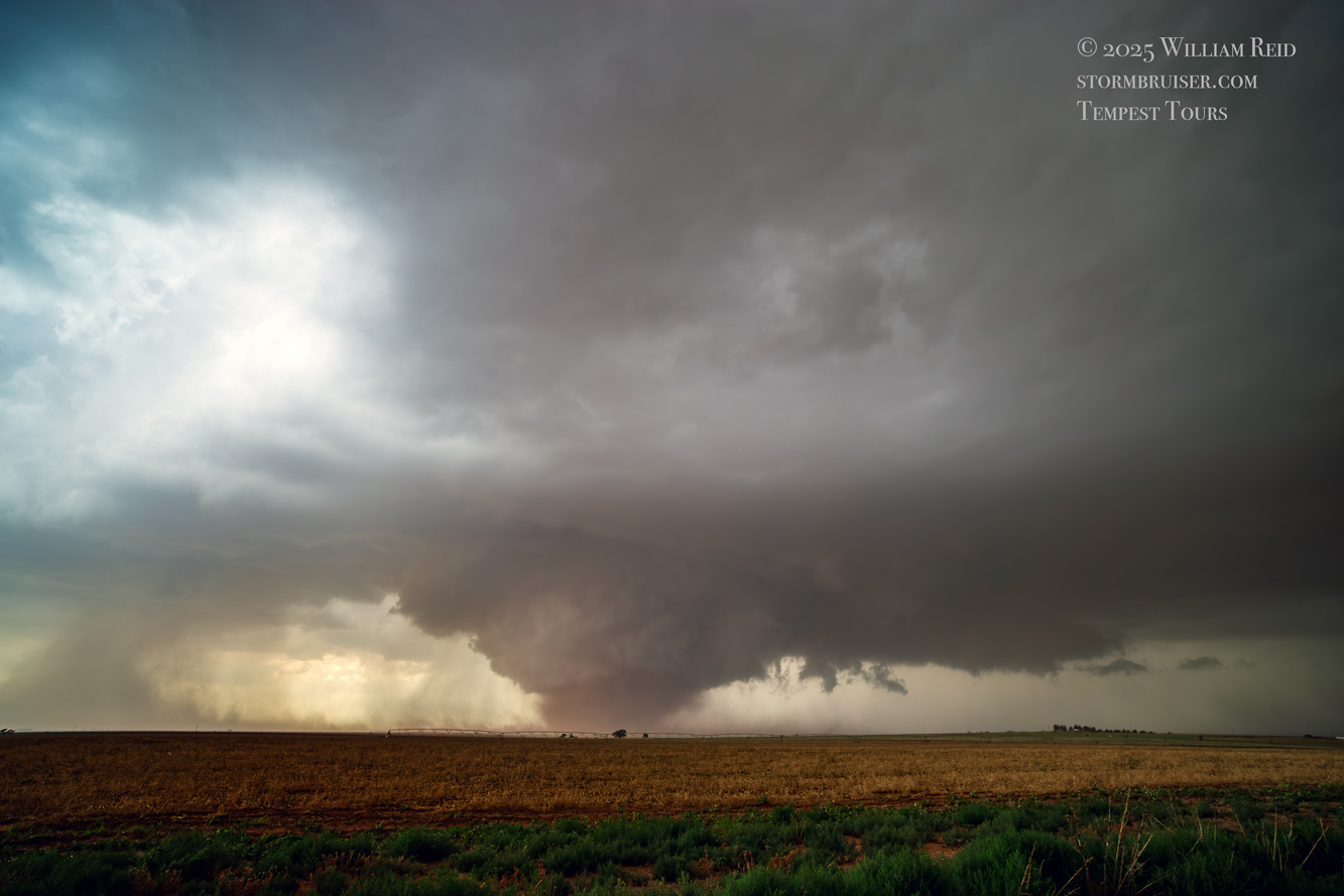 The forward-flank precipitation of this developing supercell was spreading over Causey, NM. We could stop to wait along this N-S segment of 114 just over the border in New Mexico, south of Causey. But I wanted to get closer to the action area to the west, as this new storm was looking quite good already. I had Alex and Matt take us west on a dubious dirt road from Lingo. We stopped after maybe five or six miles, and this spot provided a great look at the front end of the updraft and the storm base. There was a low-level inflow feature feeding in on the east side (first pic below), and the base was LOW LOW LOW! A wall cloud with that “pregnant lowering” look was practically scraping the ground (pics 4 to 9 below). I told the group that it would be impossible for this storm to NOT produce a tornado.