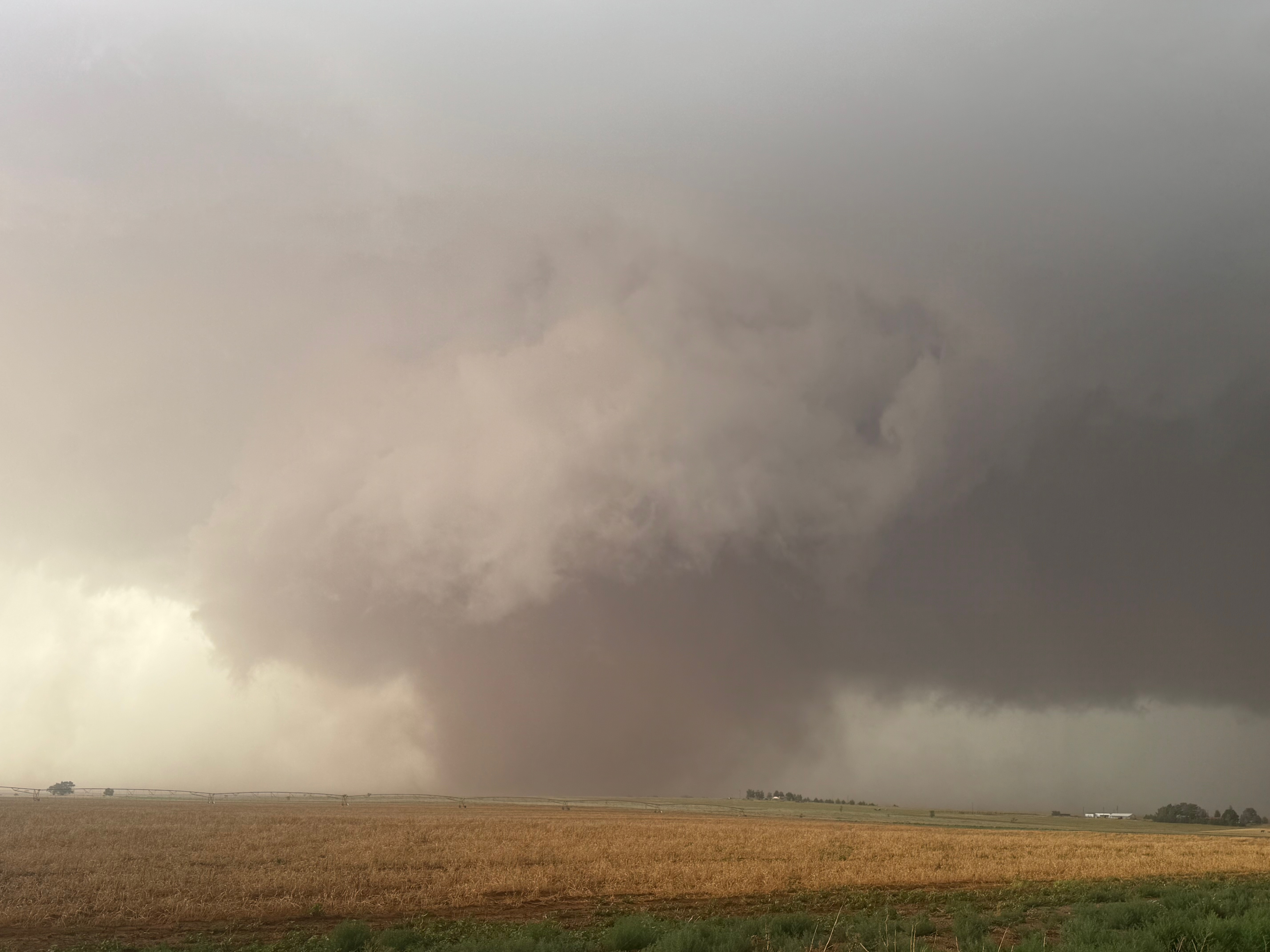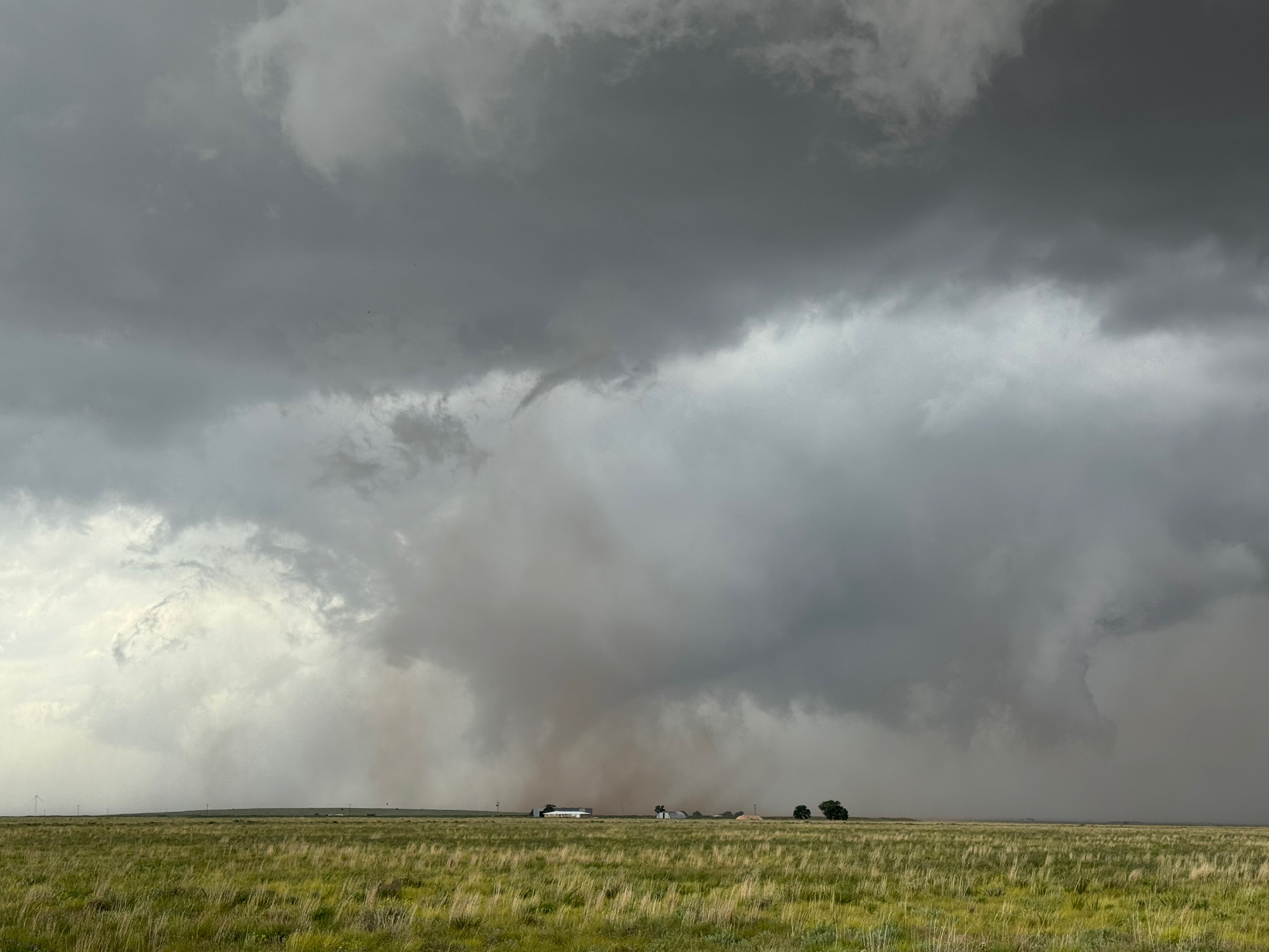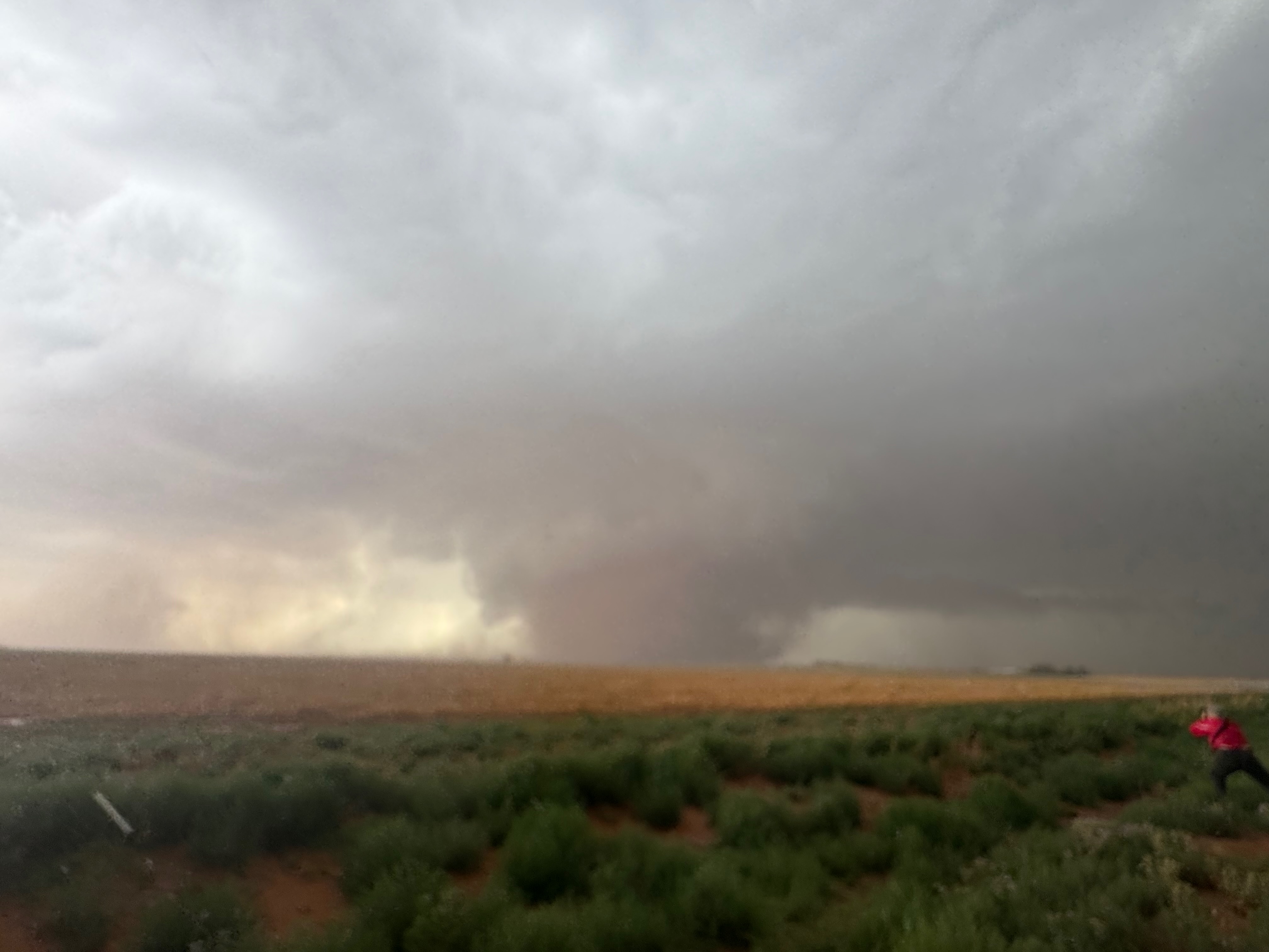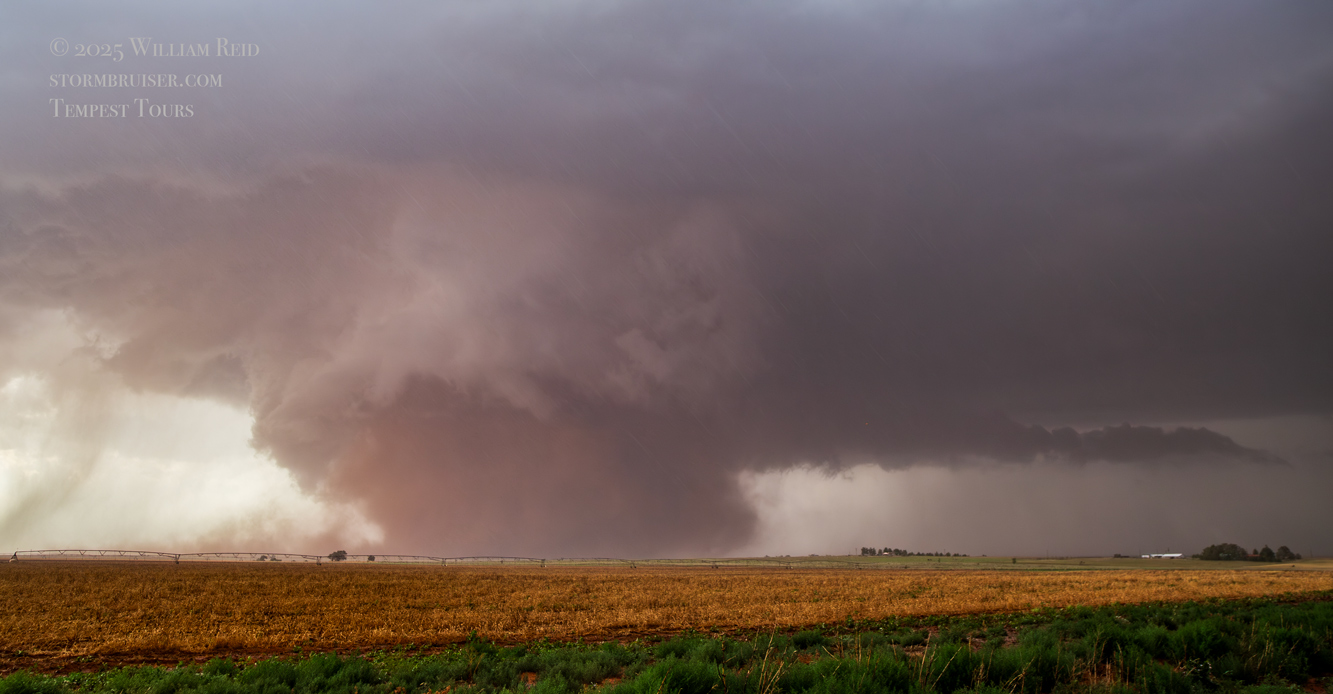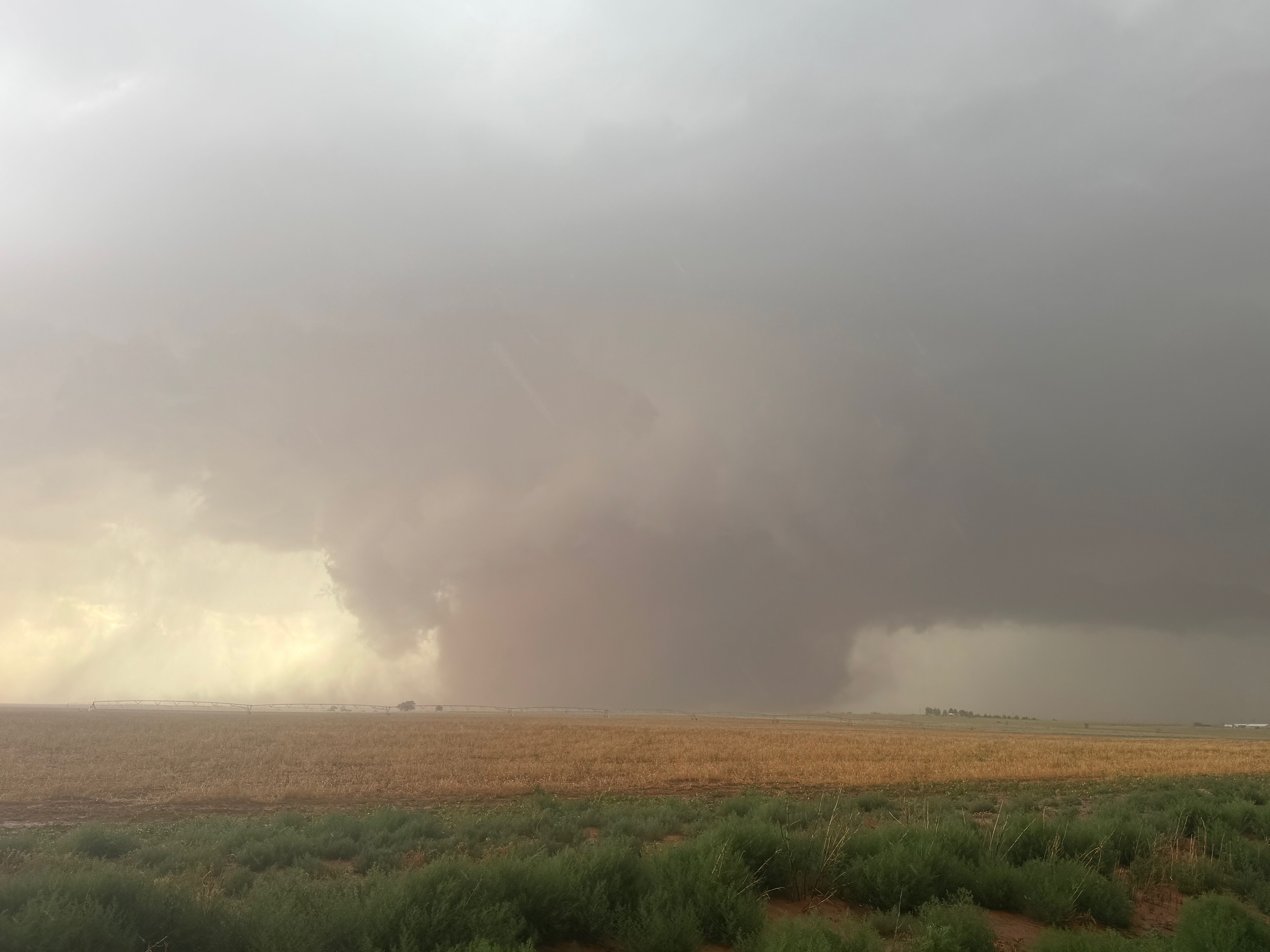 The forward-flank precipitation of this developing supercell was spreading over Causey, NM. We could stop to wait along this N-S segment of 114 just over the border in New Mexico, south of Causey. But I wanted to get closer to the action area to the west, as this new storm was looking quite good already. I had Alex and Matt take us west on a dubious dirt road from Lingo. We stopped after maybe five or six miles, and this spot provided a great look at the front end of the updraft and the storm base. There was a low-level inflow feature feeding in on the east side (first pic below), and the base was LOW LOW LOW! A wall cloud with that “pregnant lowering” look was practically scraping the ground (pics 4 to 9 below). I told the group that it would be impossible for this storm to NOT produce a tornado.