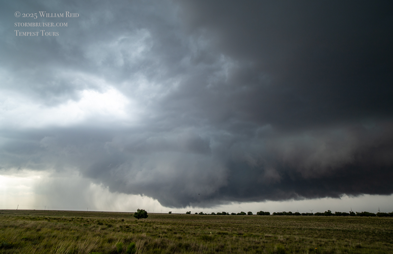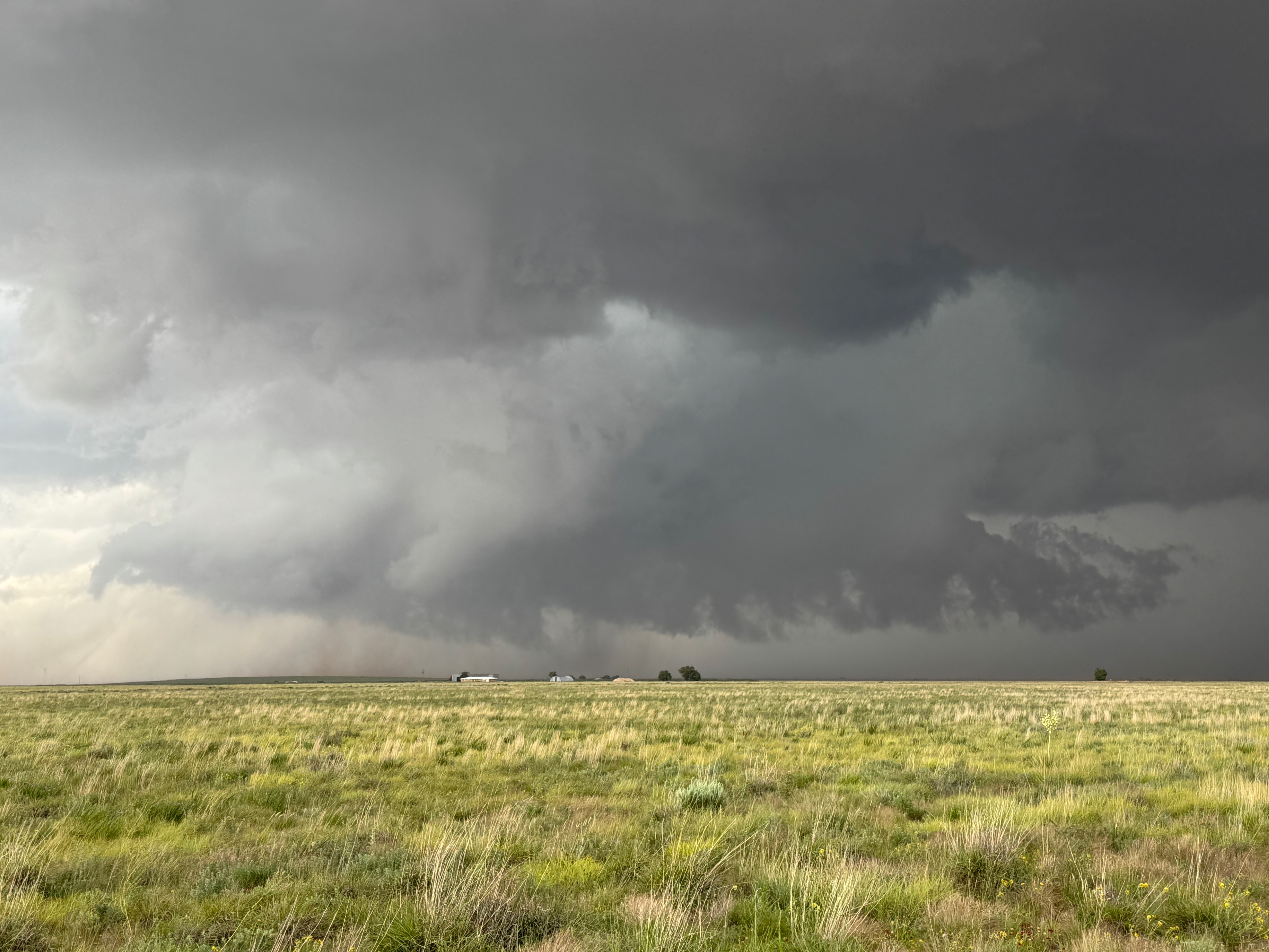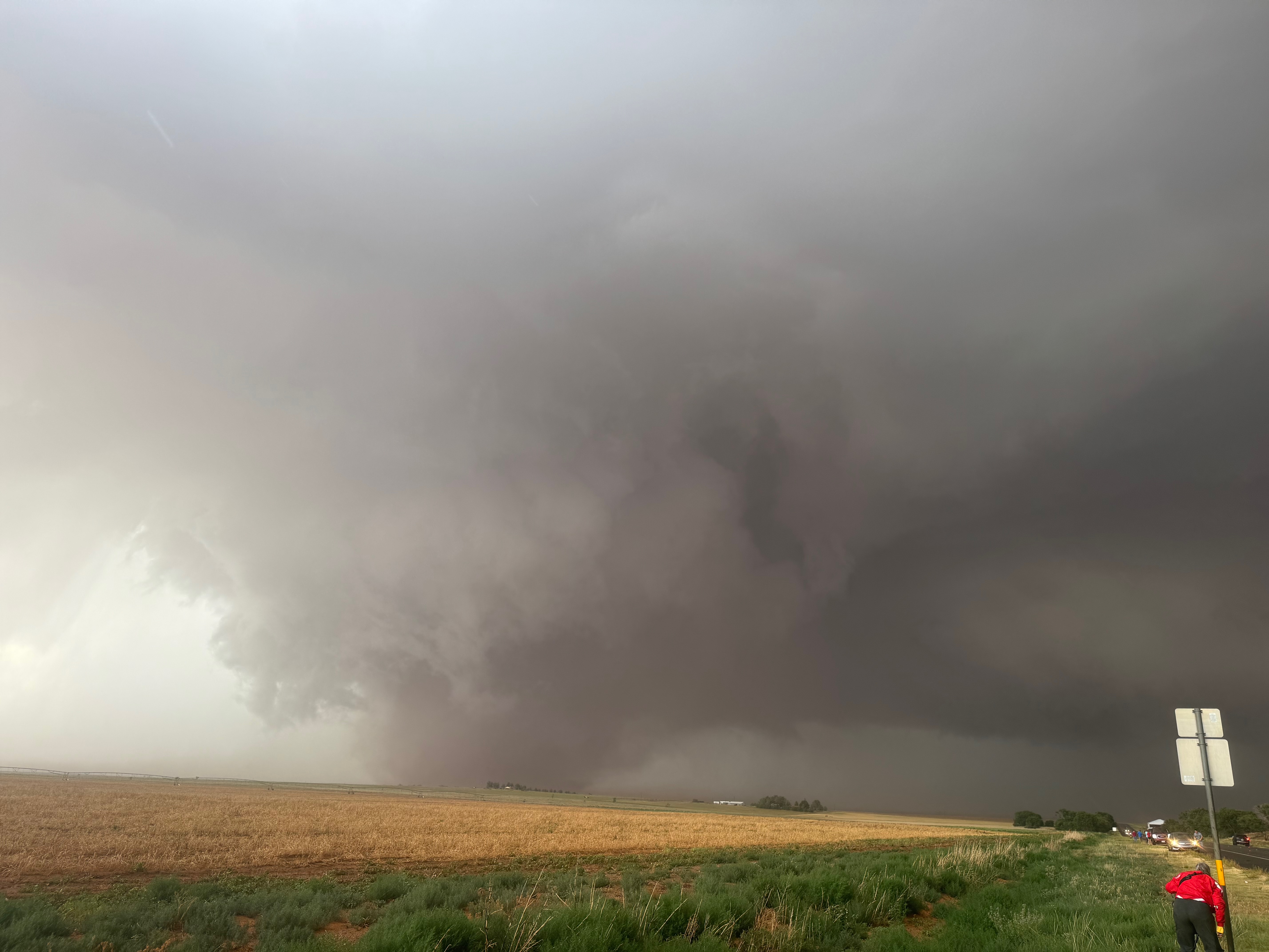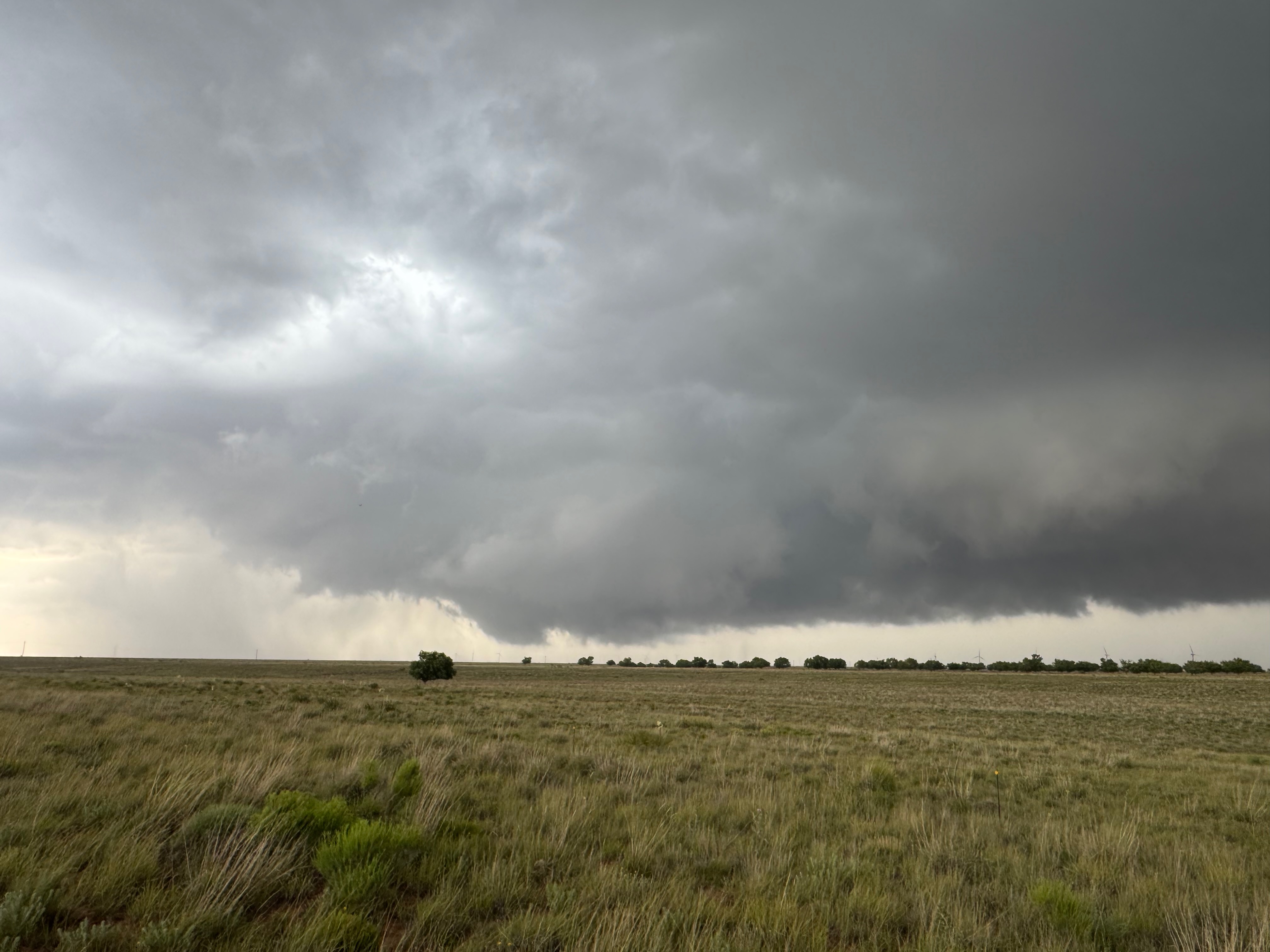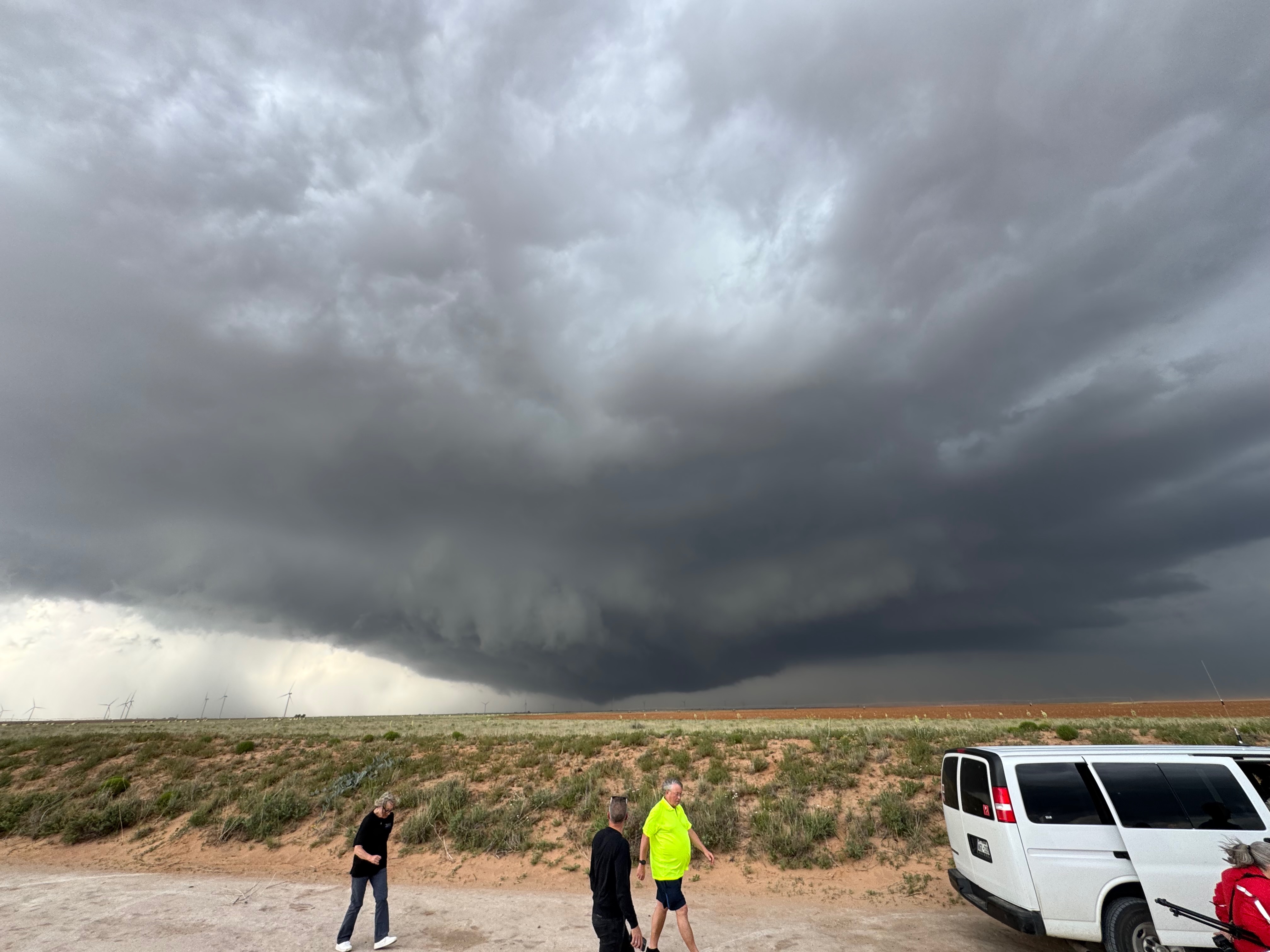 The forward-flank precipitation of this developing supercell was spreading over Causey, NM. We could stop to wait along this N-S segment of 114 just over the border in New Mexico, south of Causey. But I wanted to get closer to the action area to the west, as this new storm was looking quite good already. I had Alex and Matt take us west on a dubious dirt road from Lingo. We stopped after maybe five or six miles, and this spot provided a great look at the front end of the updraft and the storm base. There was a low-level inflow feature feeding in on the east side (first pic below), and the base was LOW LOW LOW! A wall cloud with that “pregnant lowering” look was practically scraping the ground (pics 4 to 9 below). I told the group that it would be impossible for this storm to NOT produce a tornado.
