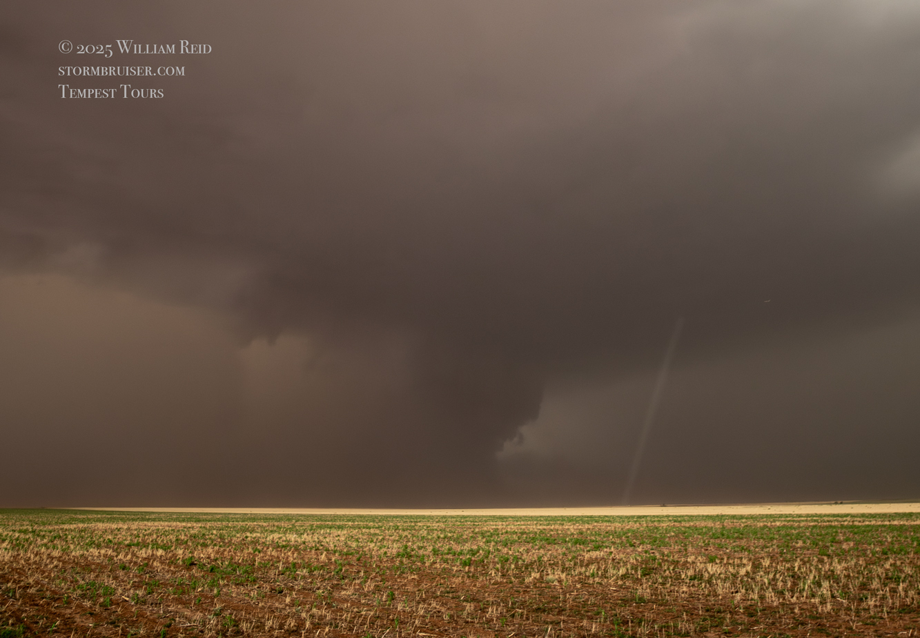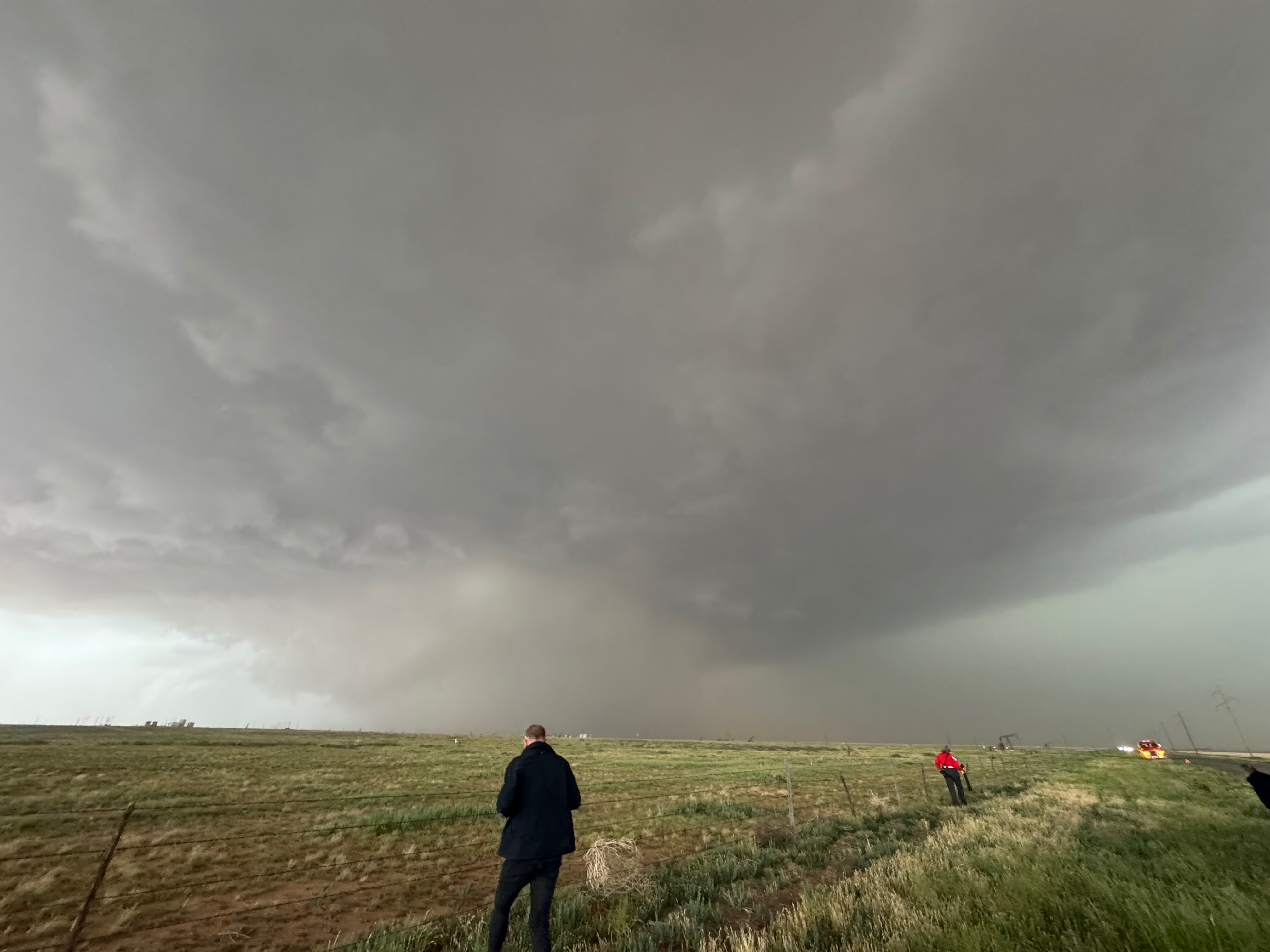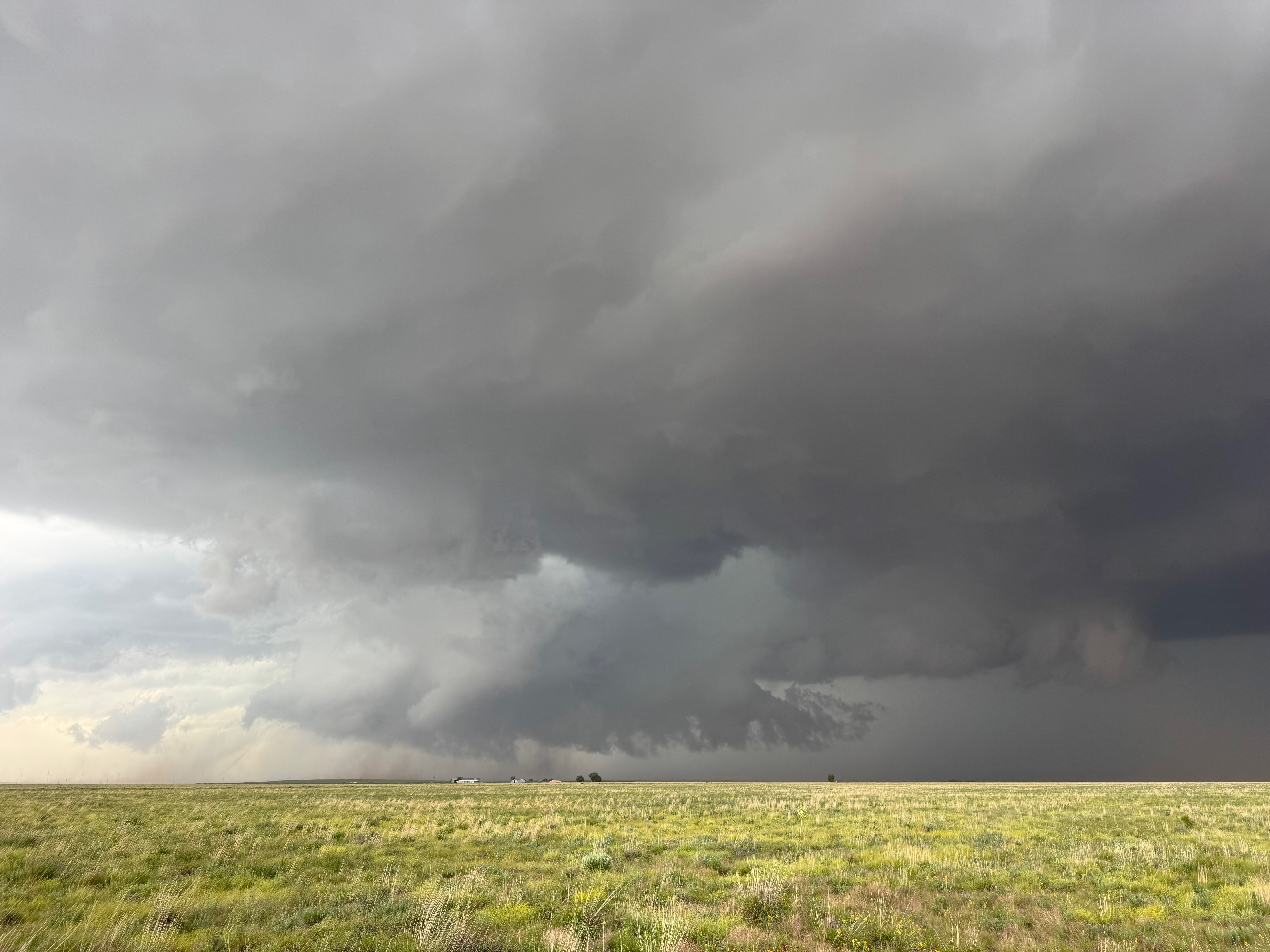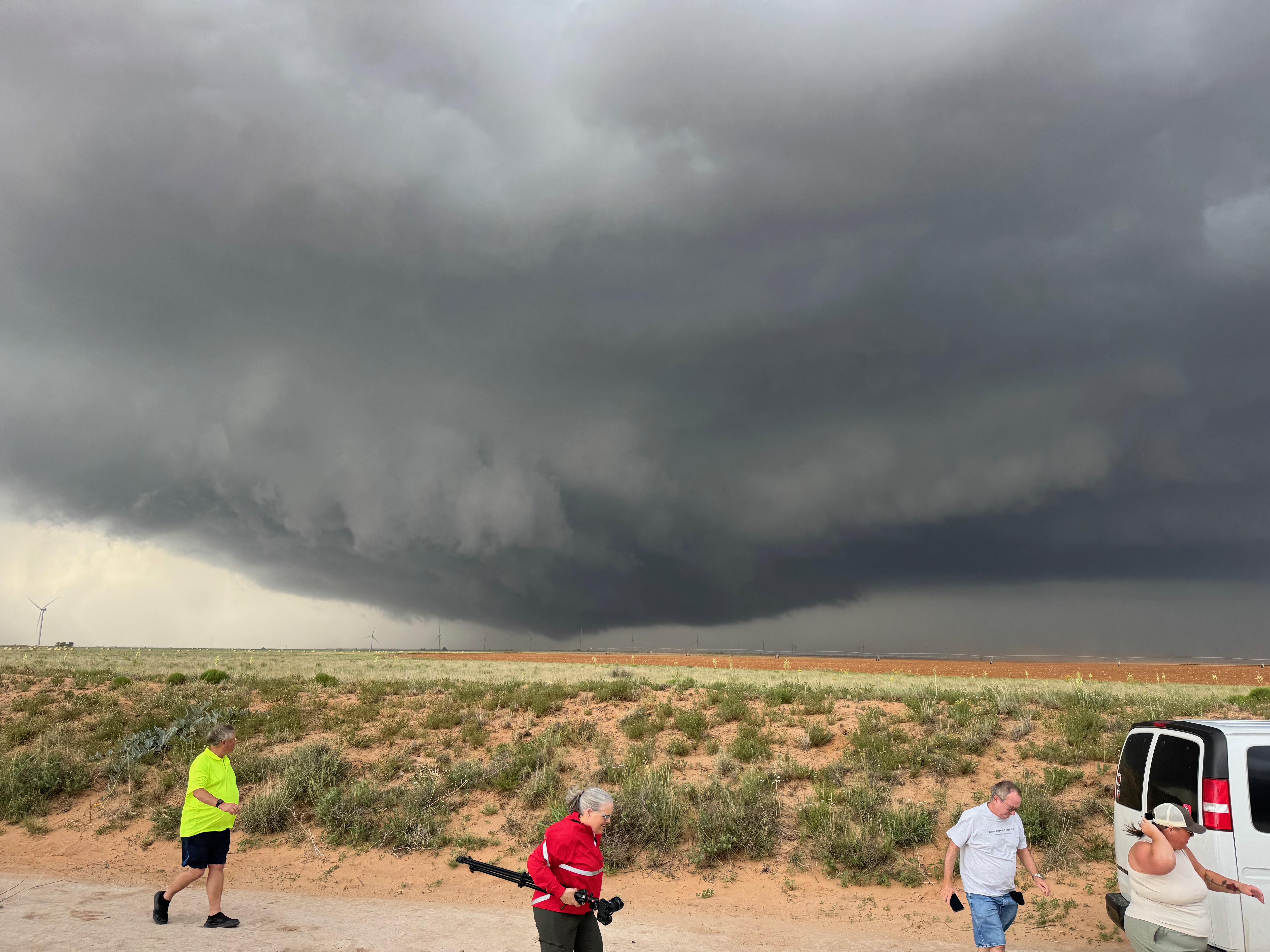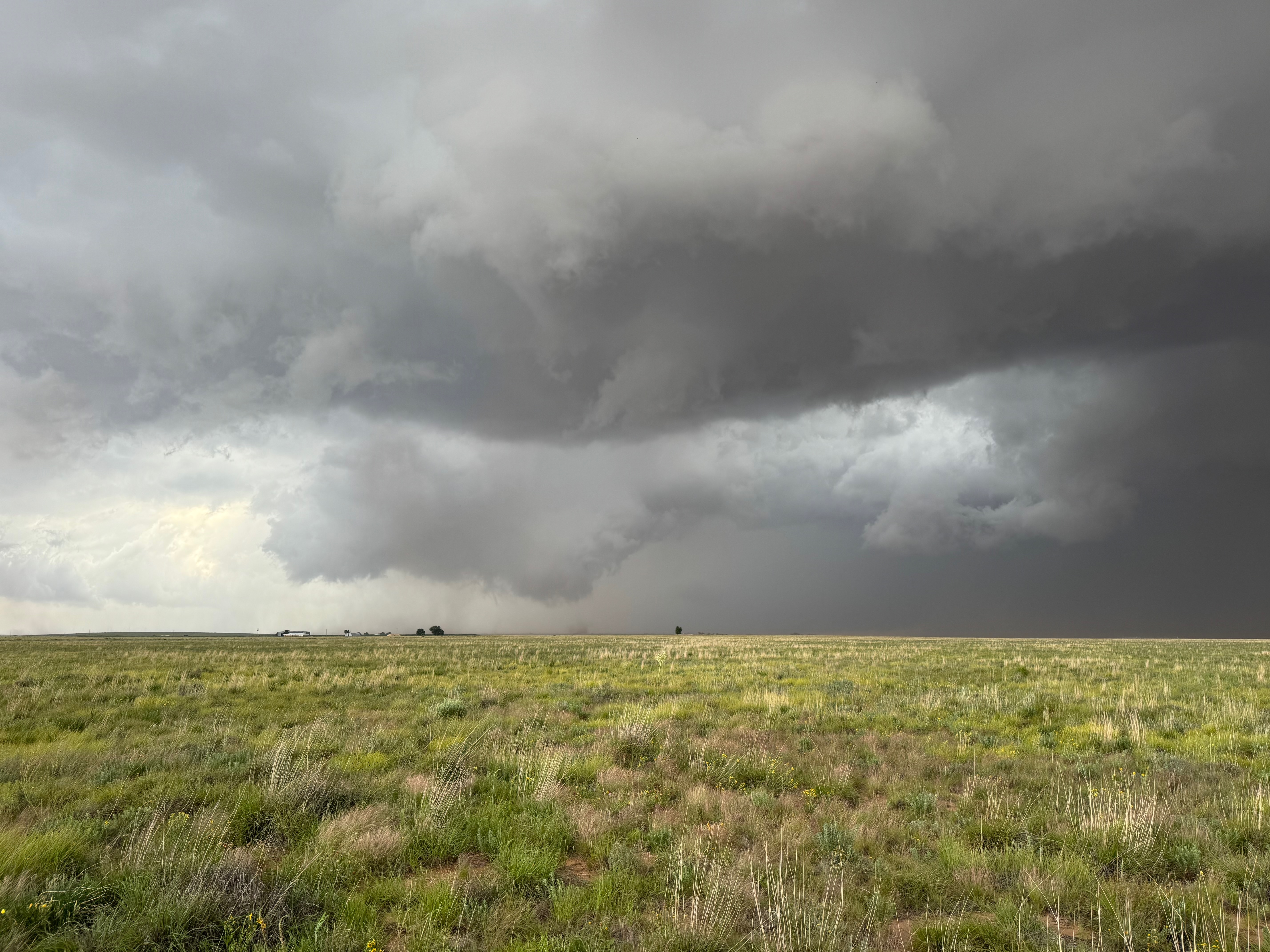 The forward-flank precipitation of this developing supercell was spreading over Causey, NM. We could stop to wait along this N-S segment of 114 just over the border in New Mexico, south of Causey. But I wanted to get closer to the action area to the west, as this new storm was looking quite good already. I had Alex and Matt take us west on a dubious dirt road from Lingo. We stopped after maybe five or six miles, and this spot provided a great look at the front end of the updraft and the storm base. There was a low-level inflow feature feeding in on the east side (first pic below), and the base was LOW LOW LOW! A wall cloud with that “pregnant lowering” look was practically scraping the ground (pics 4 to 9 below). I told the group that it would be impossible for this storm to NOT produce a tornado.
