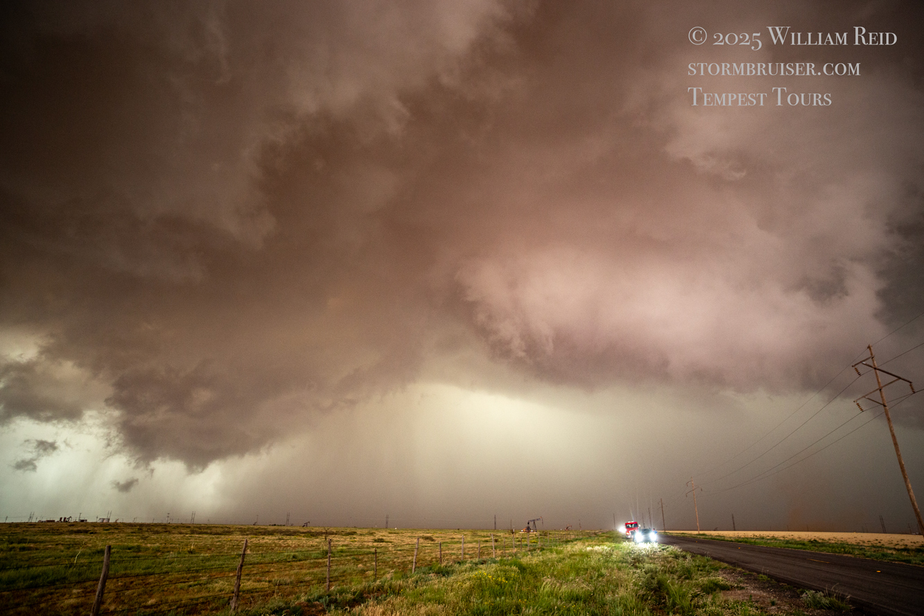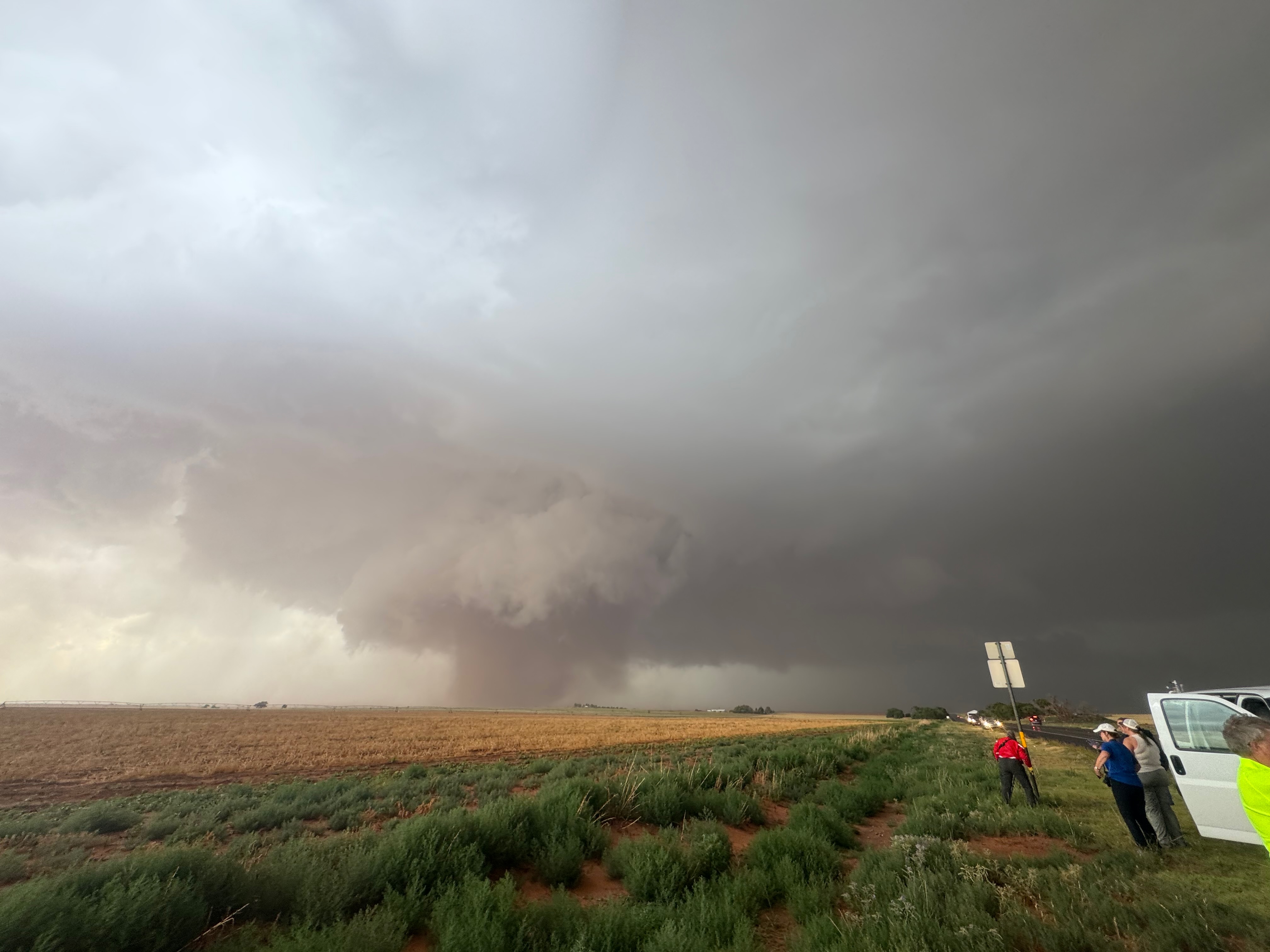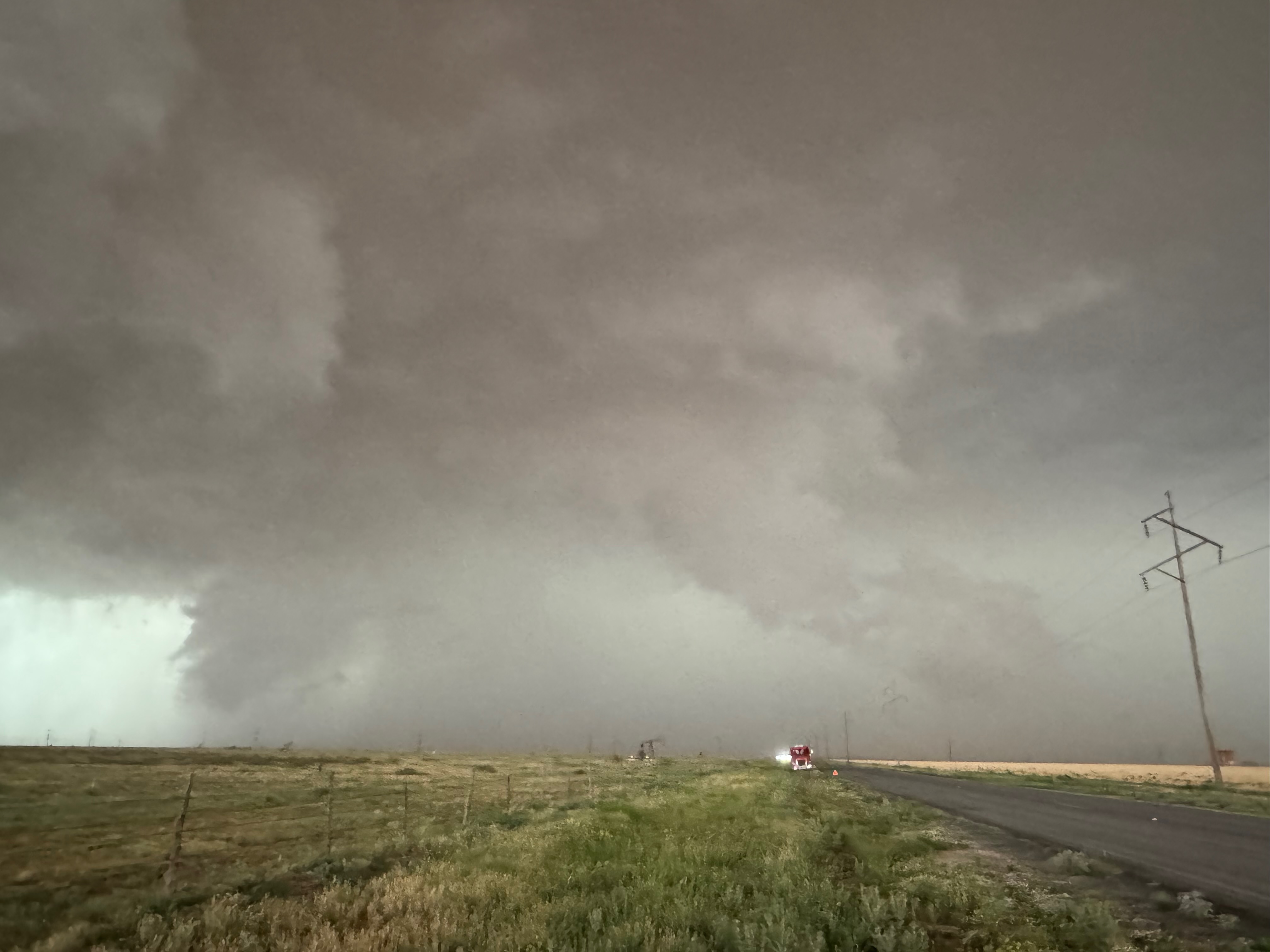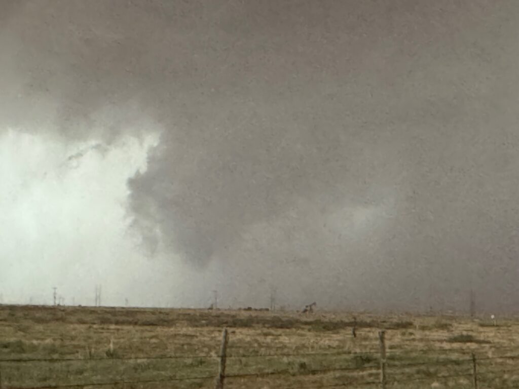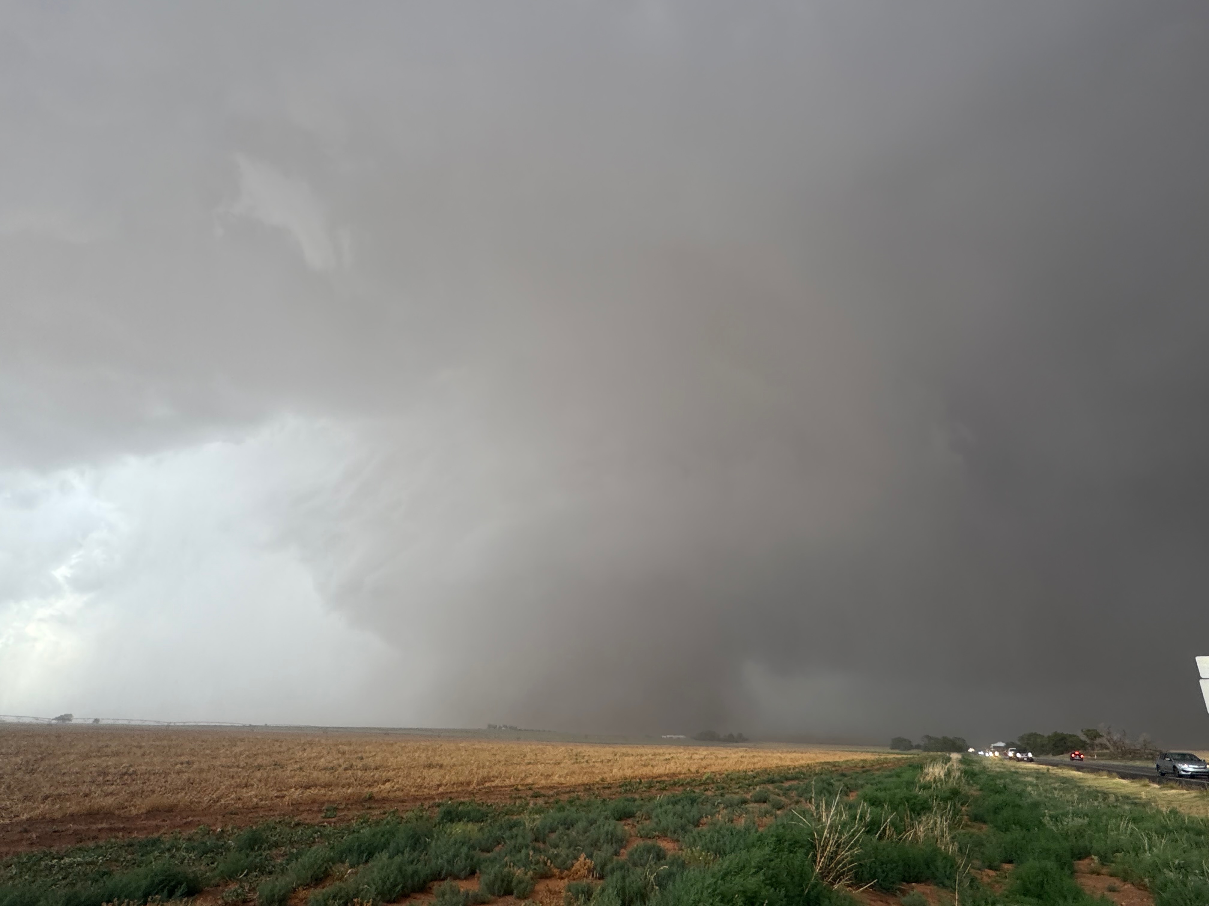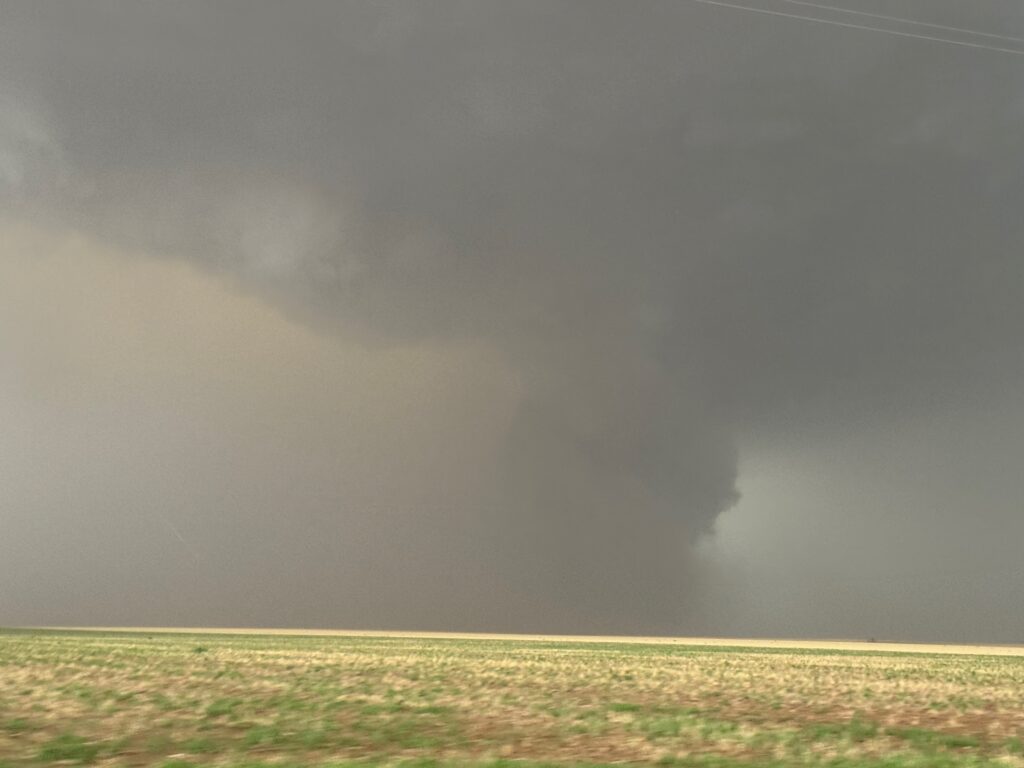 It was time to get back into the vans to keep up with this thing. As the tornado continued to the east in northern Cochran County, it looked like FM 597 would work nicely. We made our quick move to the south and turned left onto 597, but I gave up on this idea after less than a half mile. The tornado to our north looked to be largely wrapped in rain, radar showed the storm sagging to the south slightly, and this road jogged a little to the north a couple of miles ahead. (Chasers were become annoyingly more numerous, too.) I didn’t like the idea of flirting closely with a big rain-wrapped tornado! I diverted to the southeast (via Morton) and east on 114 in order to get safely back in front.