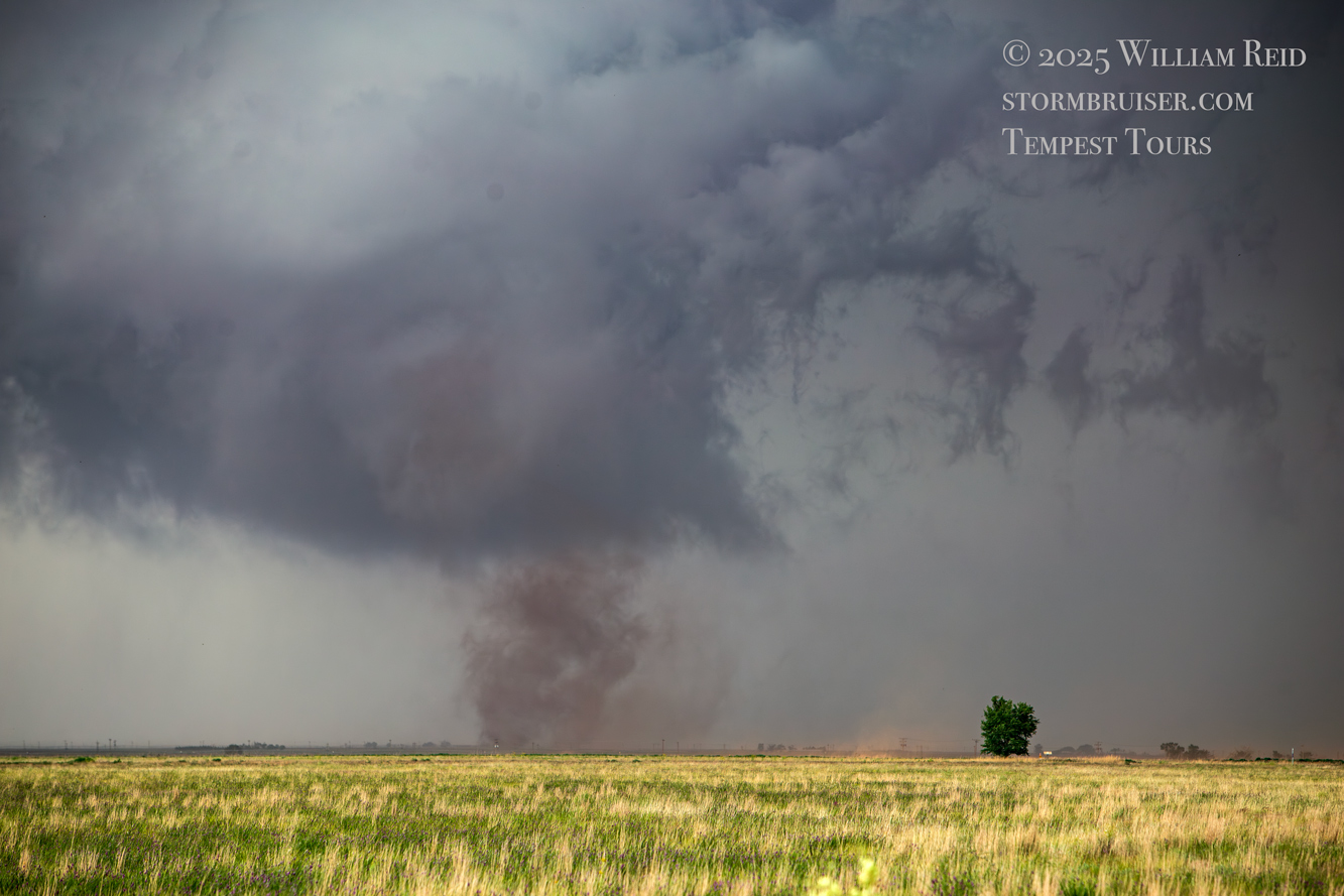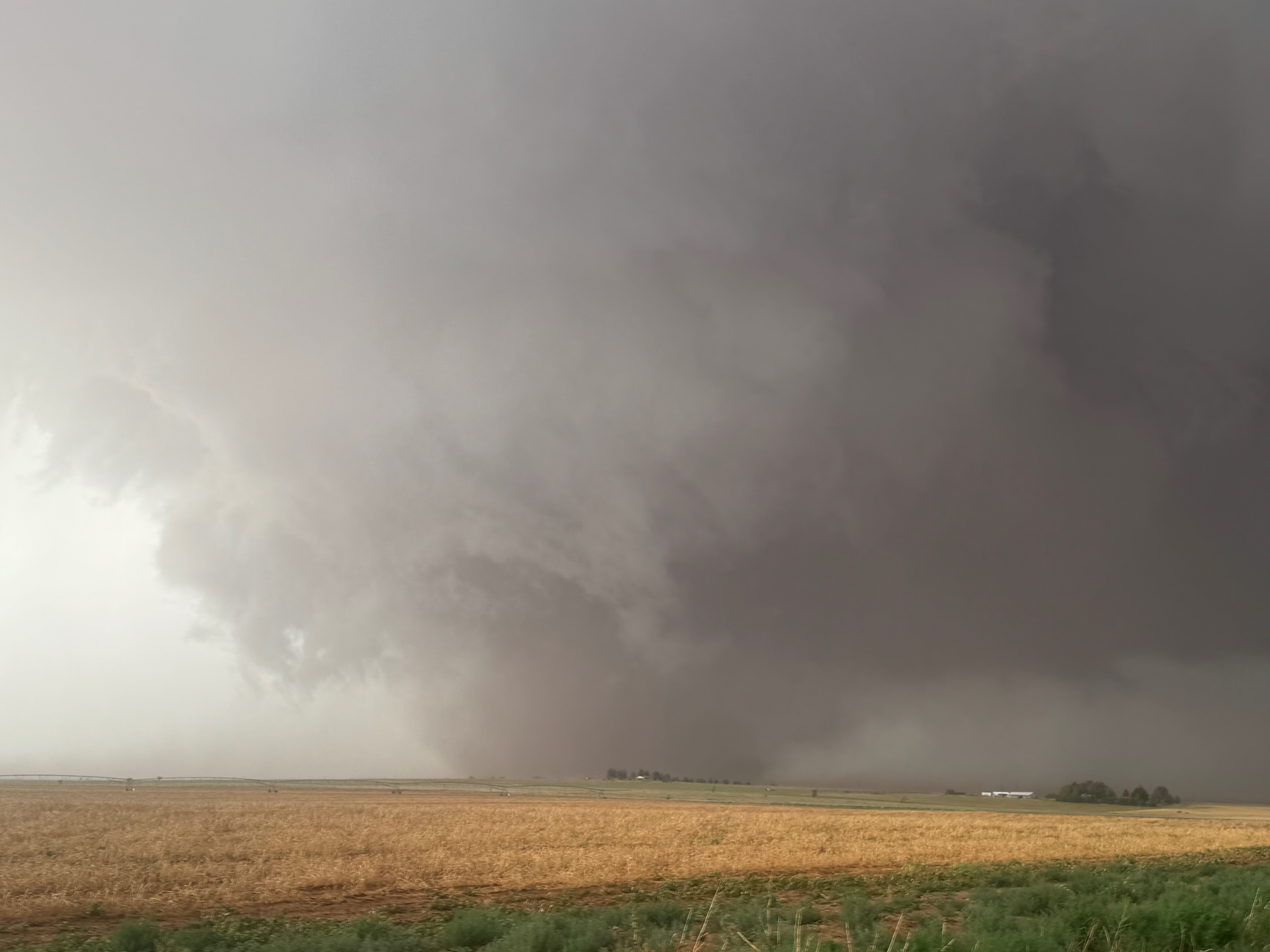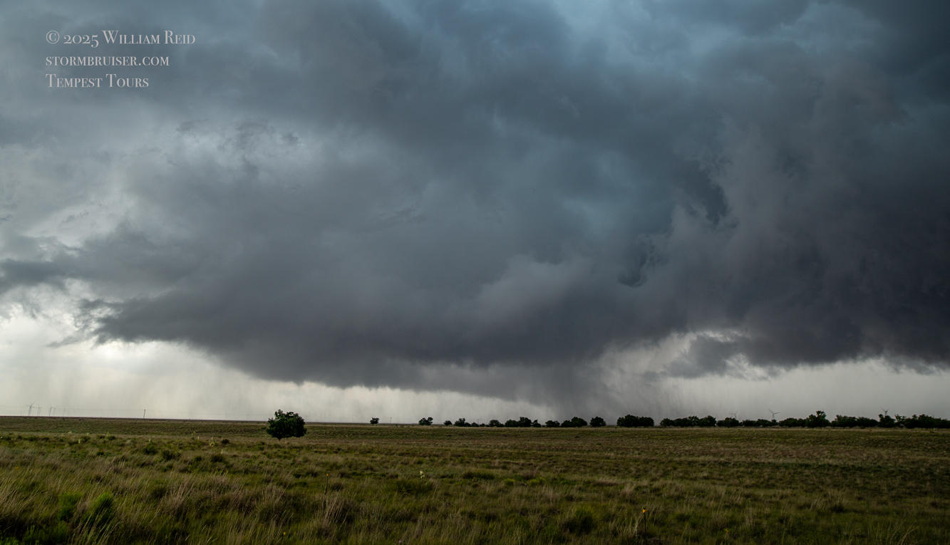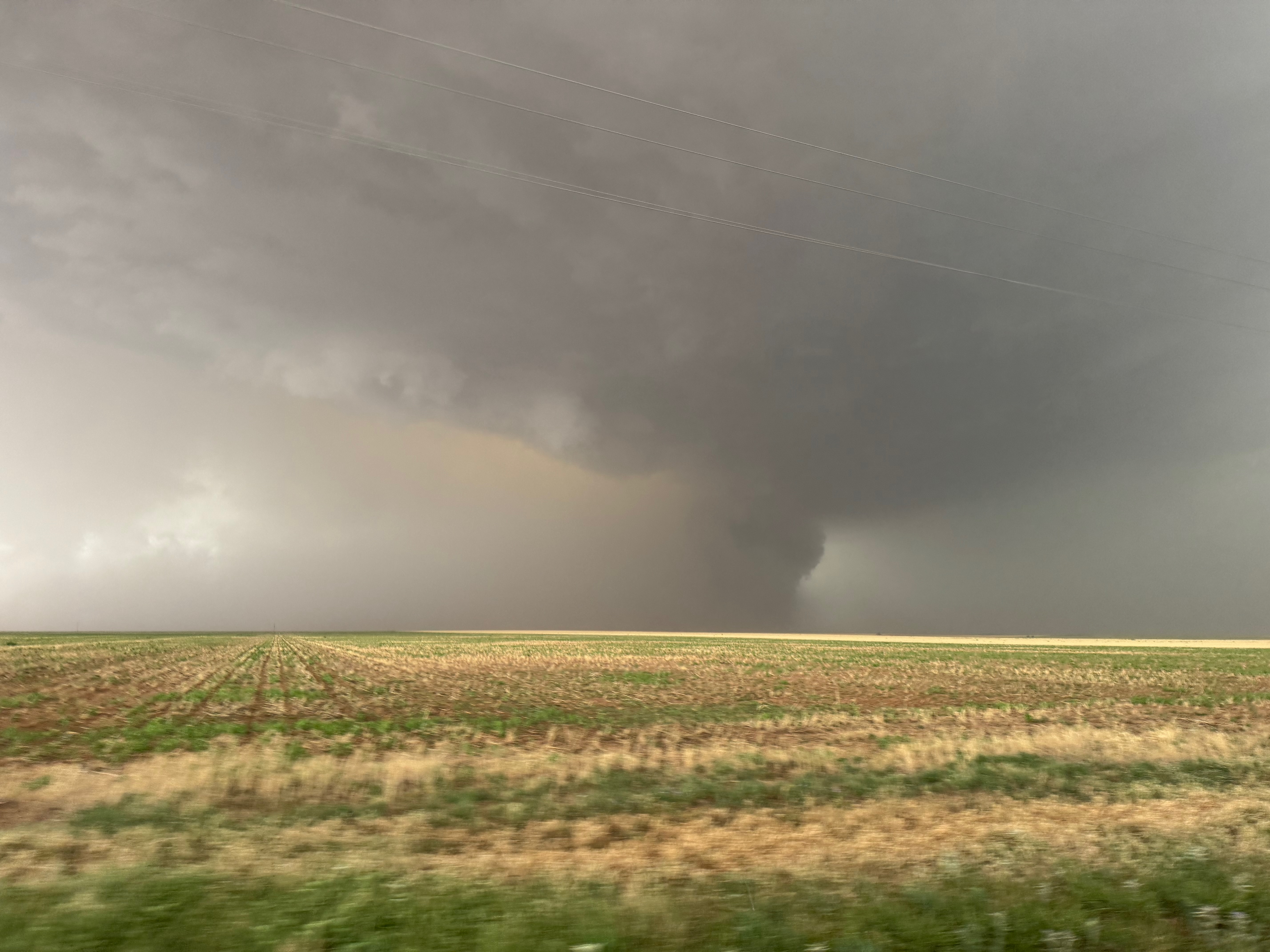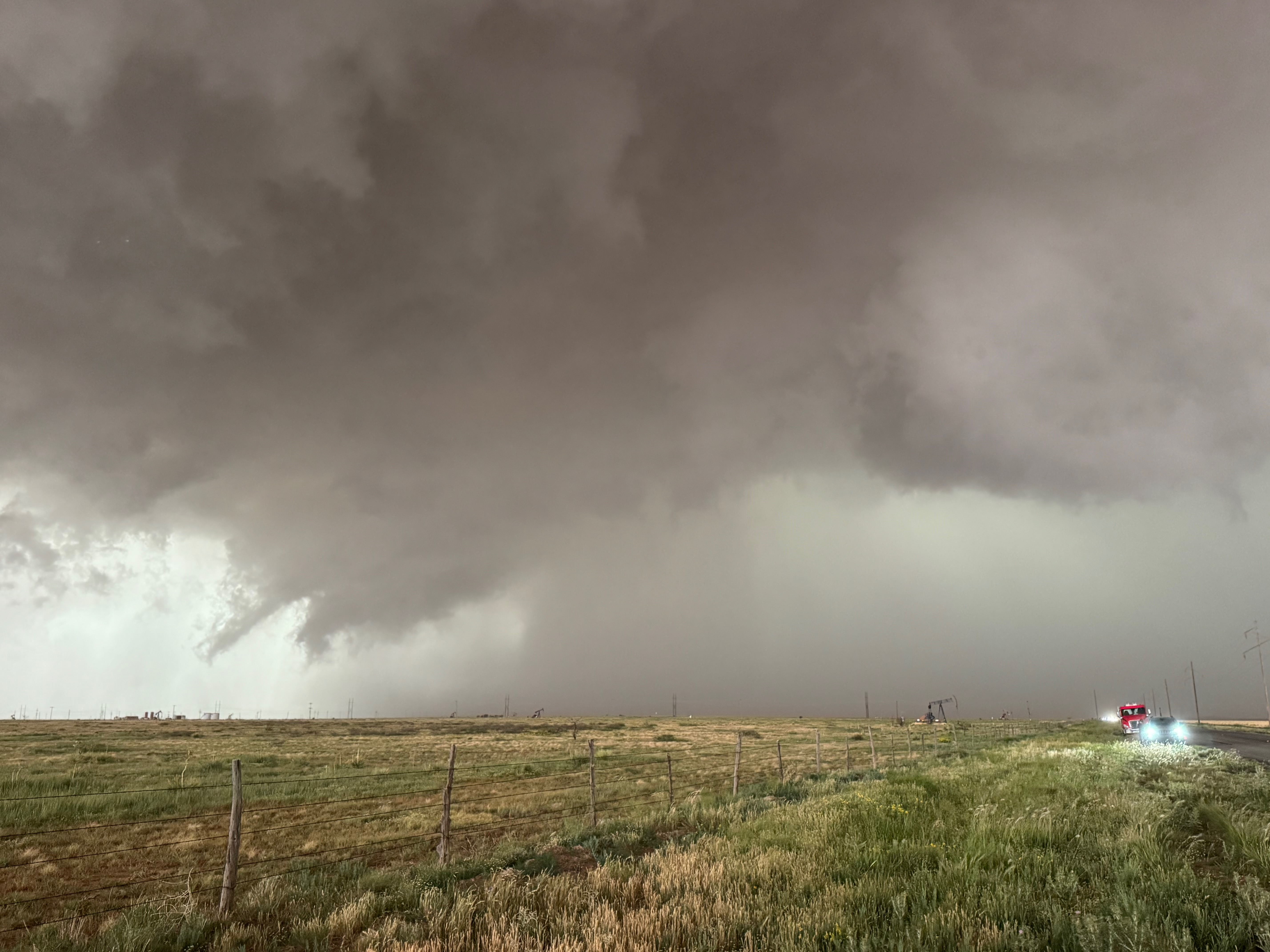It was time to get back into the vans to keep up with this thing. As the tornado continued to the east in northern Cochran County, it looked like FM 597 would work nicely. We made our quick move to the south and turned left onto 597, but I gave up on this idea after less than a half mile. The tornado to our north looked to be largely wrapped in rain, radar showed the storm sagging to the south slightly, and this road jogged a little to the north a couple of miles ahead. (Chasers were become annoyingly more numerous, too.) I didn’t like the idea of flirting closely with a big rain-wrapped tornado! I diverted to the southeast (via Morton) and east on 114 in order to get safely back in front.