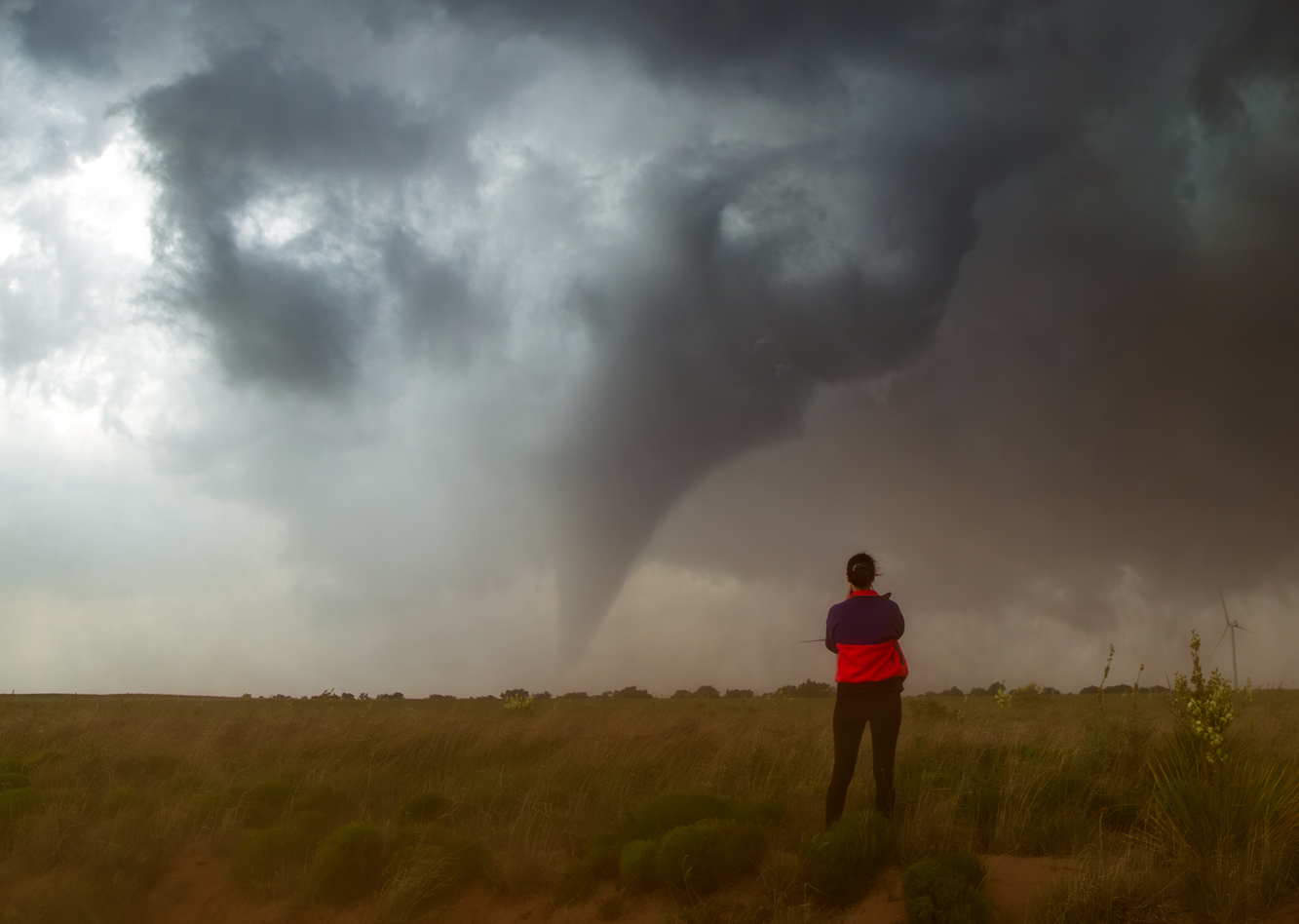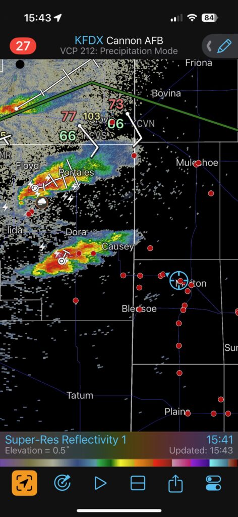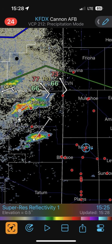 On this Thursday we woke up quite close to where we needed to be for the chase later on. We began in Clovis, NM, and needed to sag south just a county or two along the NM/TX border and attach ourselves to a “convectively reinforced quasi-stationary surface boundary” (also called a “psuedo warm front/outflow boundary”). These terms are courtesy of SPC. This E-W boundary was maybe moving slowly northward. There was warm and juicy air on its south side, with some clouds and a lot of sunshine. It was cooler and mostly cloudy (low clouds) north of the front. The wind along the boundary had some easterly component, so low-level shear was quite good. It looked like a decent tornado day was shaping up, generally from the Lubbock area westward into New Mexico a bit. SPC teased us with a 10% hatched tornado outline. It wasn’t too difficult to determine where we should hang out: near the western end of the 10 percent hatched tornado outline. This is where the E-W boundary found itself closer to the N-S surface trough and hotter air…where storms are most apt to initiate.