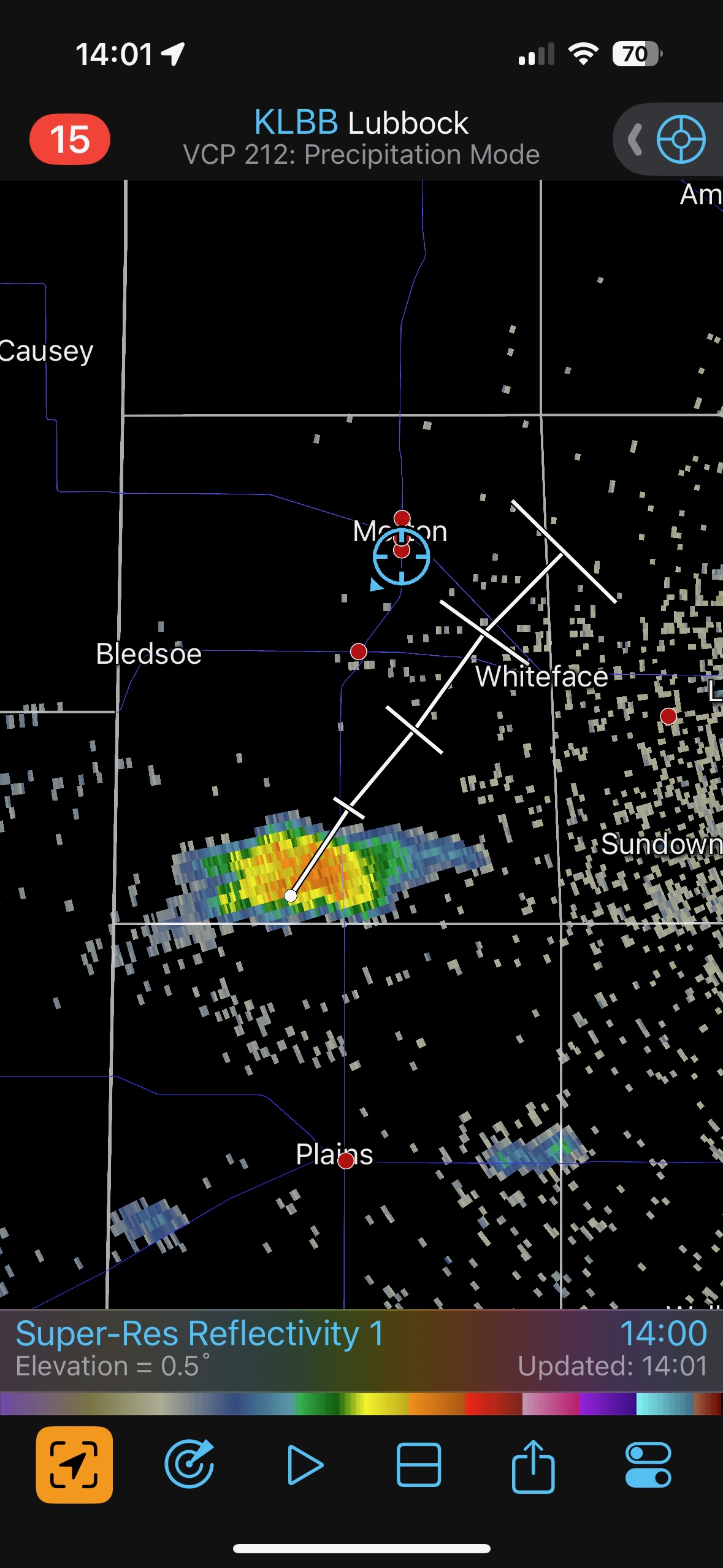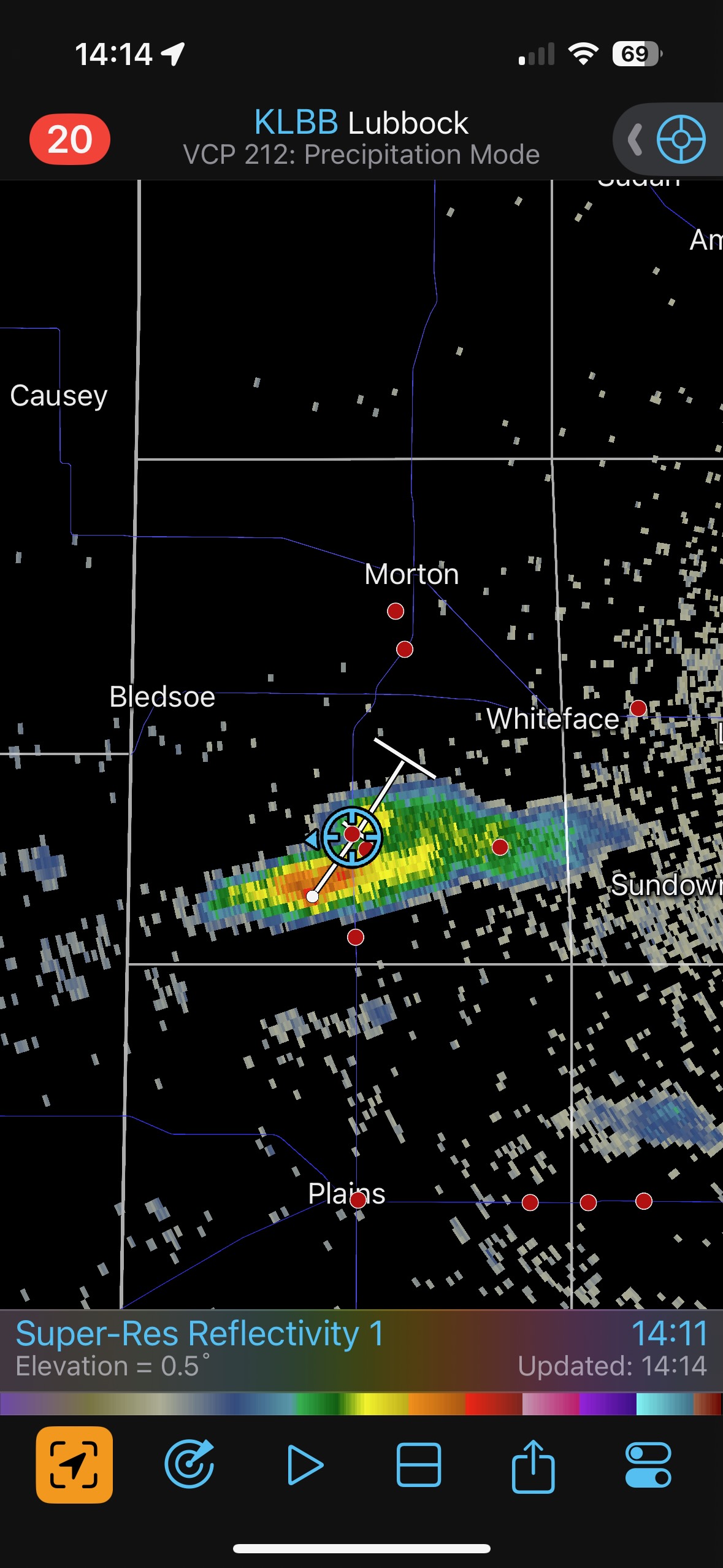A little cell developed to our south, and at 2:15 p.m. we were next to it in southern Cochrane County (see radar image). But this little updraft did not amount to much. It died and we were back at the Allsups in Morton an hour later.