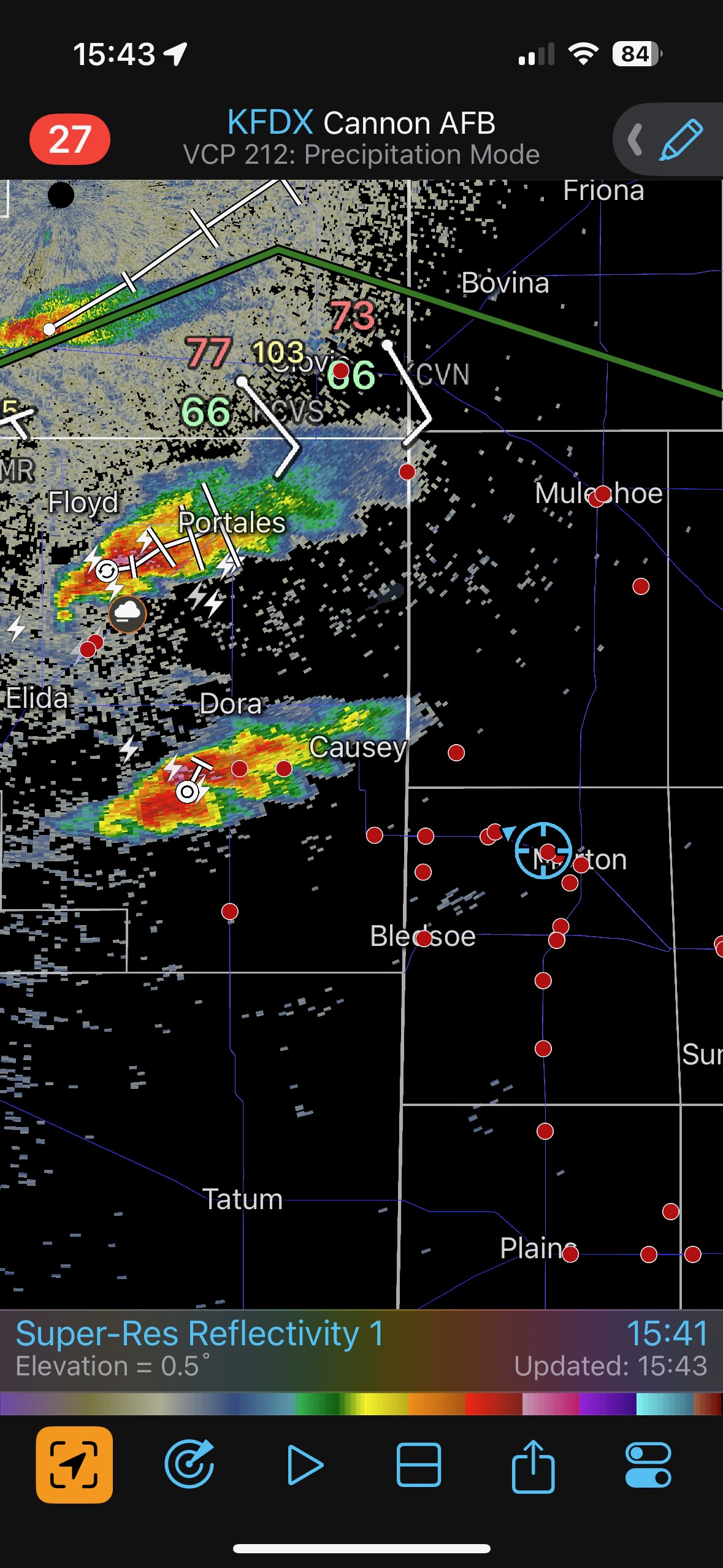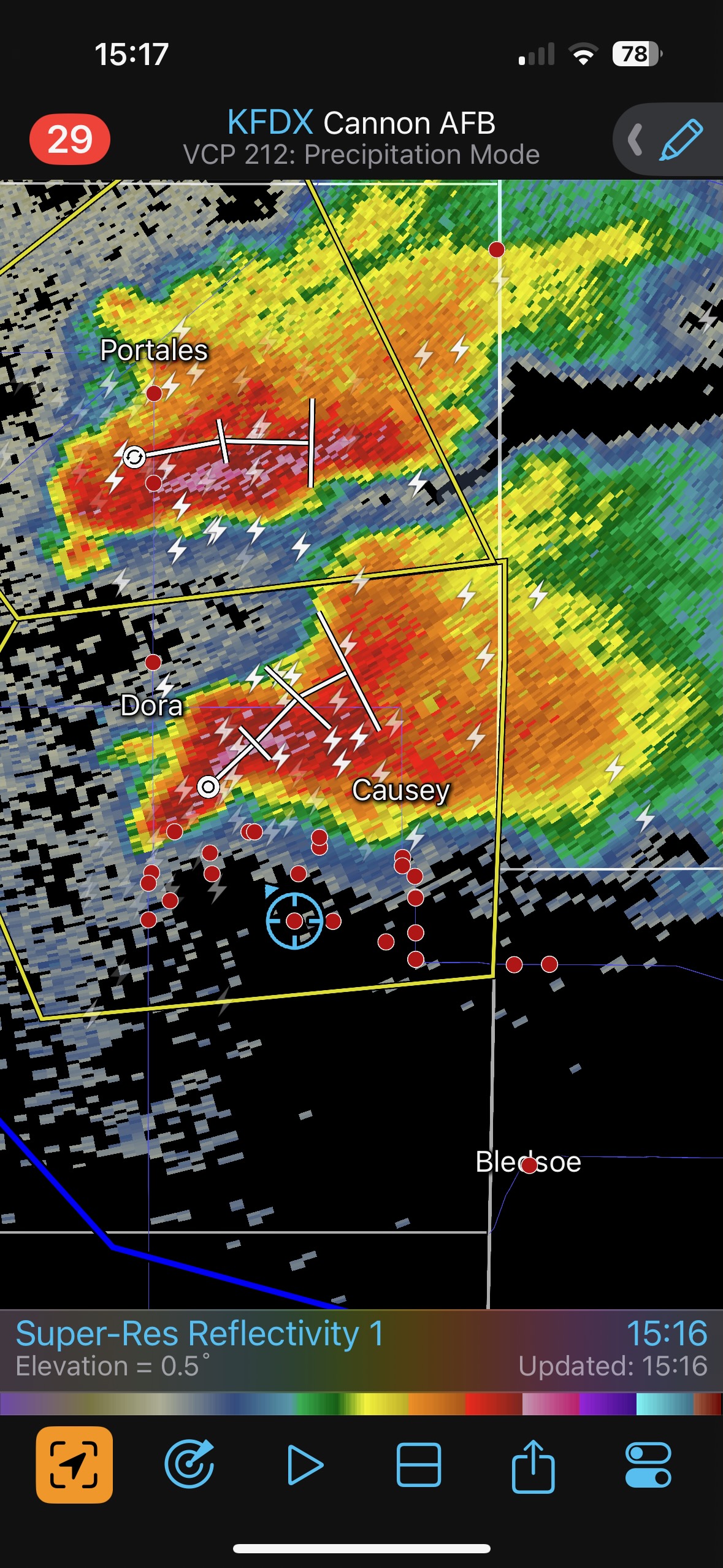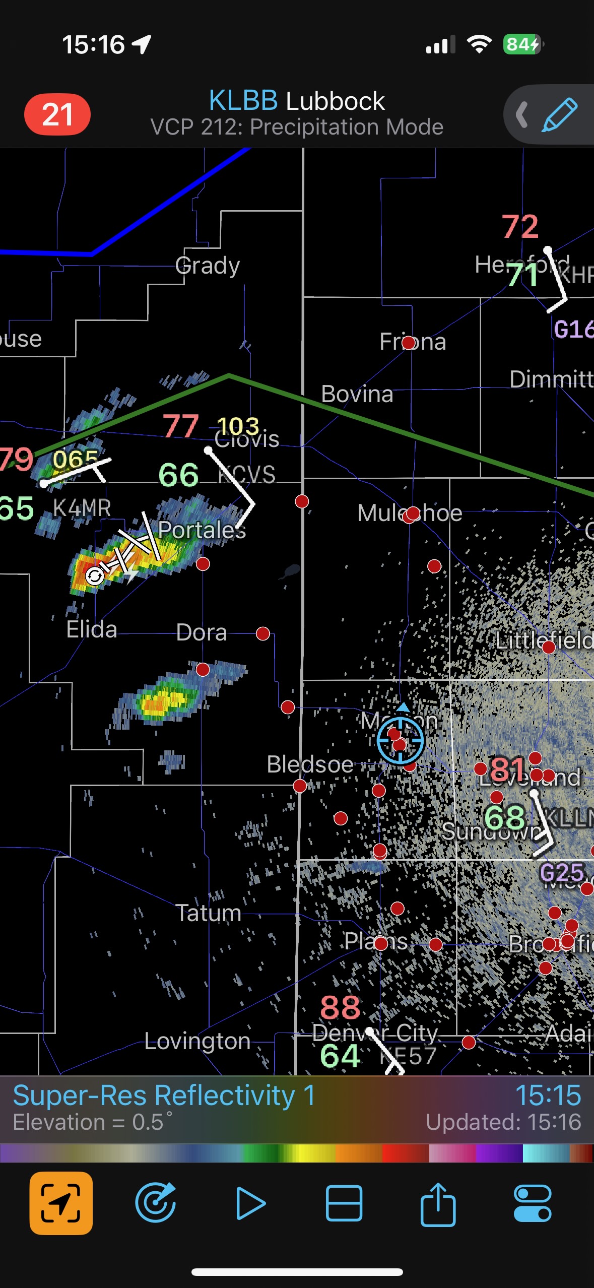 While still at the Allsups radar started to show new storm development in New Mexico to our due west. This was perfect! The southern cell was likely on or near the boundary (just south of Dora 3:30 p.m. CDT). Ten minutes later this storm was looking much better on radar (last screenshot above), and we were rolling westbound on FM 114 out of Morton. This chase was like taking candy from a baby.