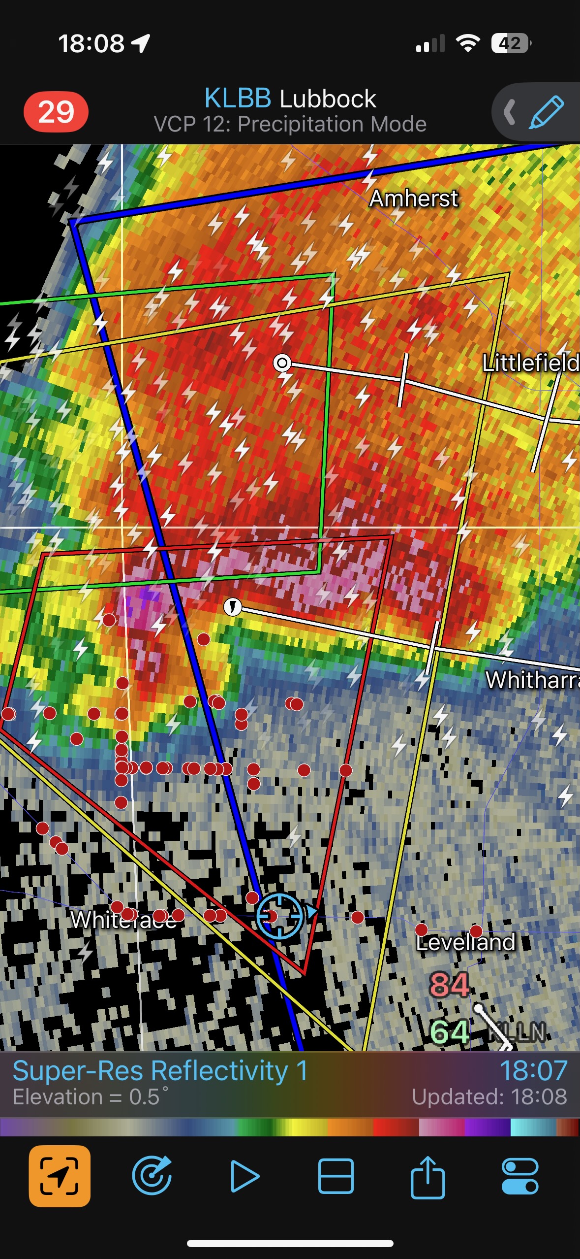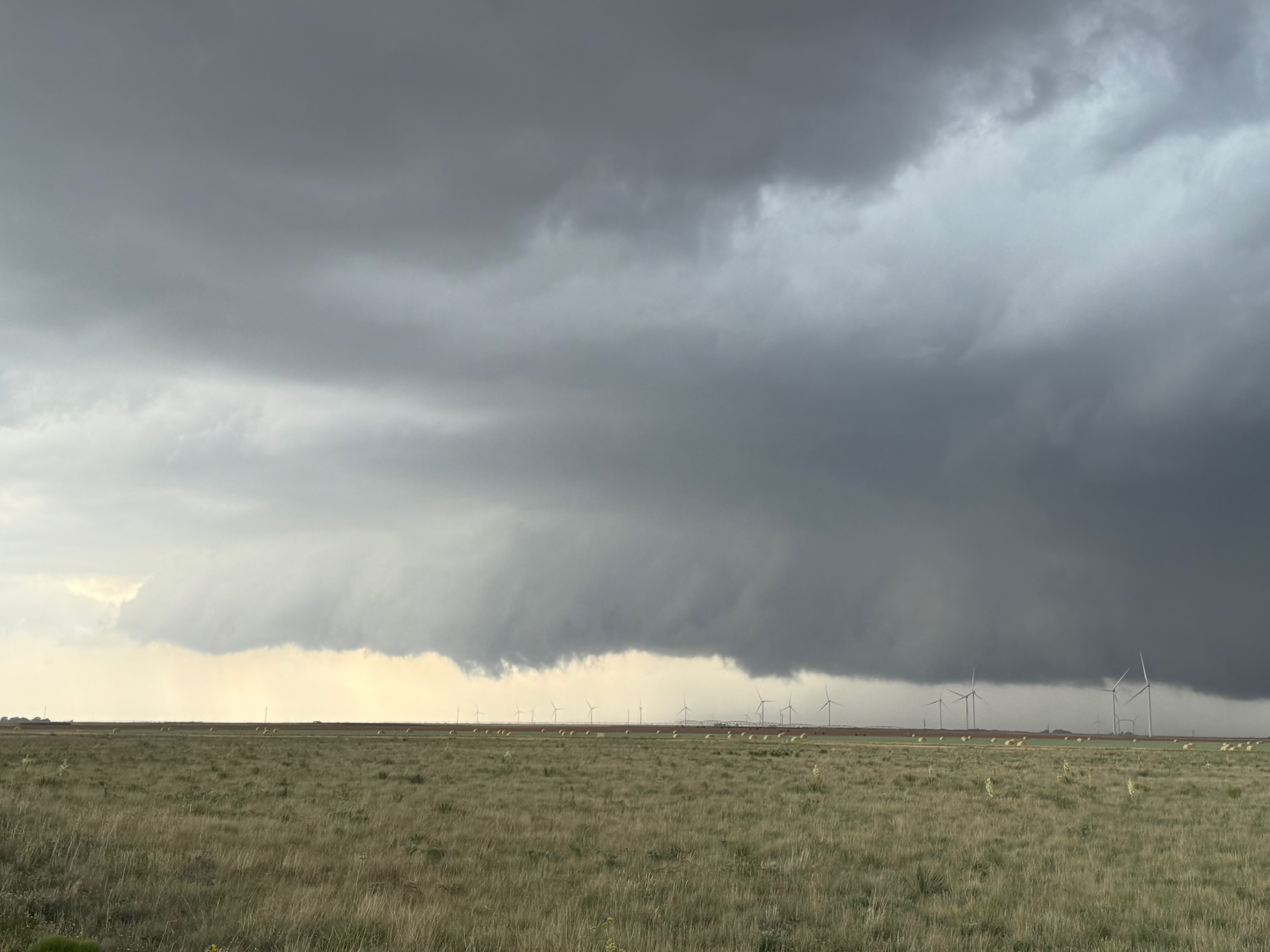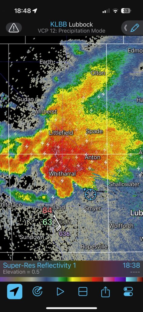The radar grabs above show our location east of Whiteface, and about a half hour later in front of the hook again, southeast of Whitharral. The first nine images below provide a look at the hook area of the now HP supercell. There are some hints that a tornado might be lurking in the precip core. We were not sure. The storm was north of Levelland about the time of these photos.