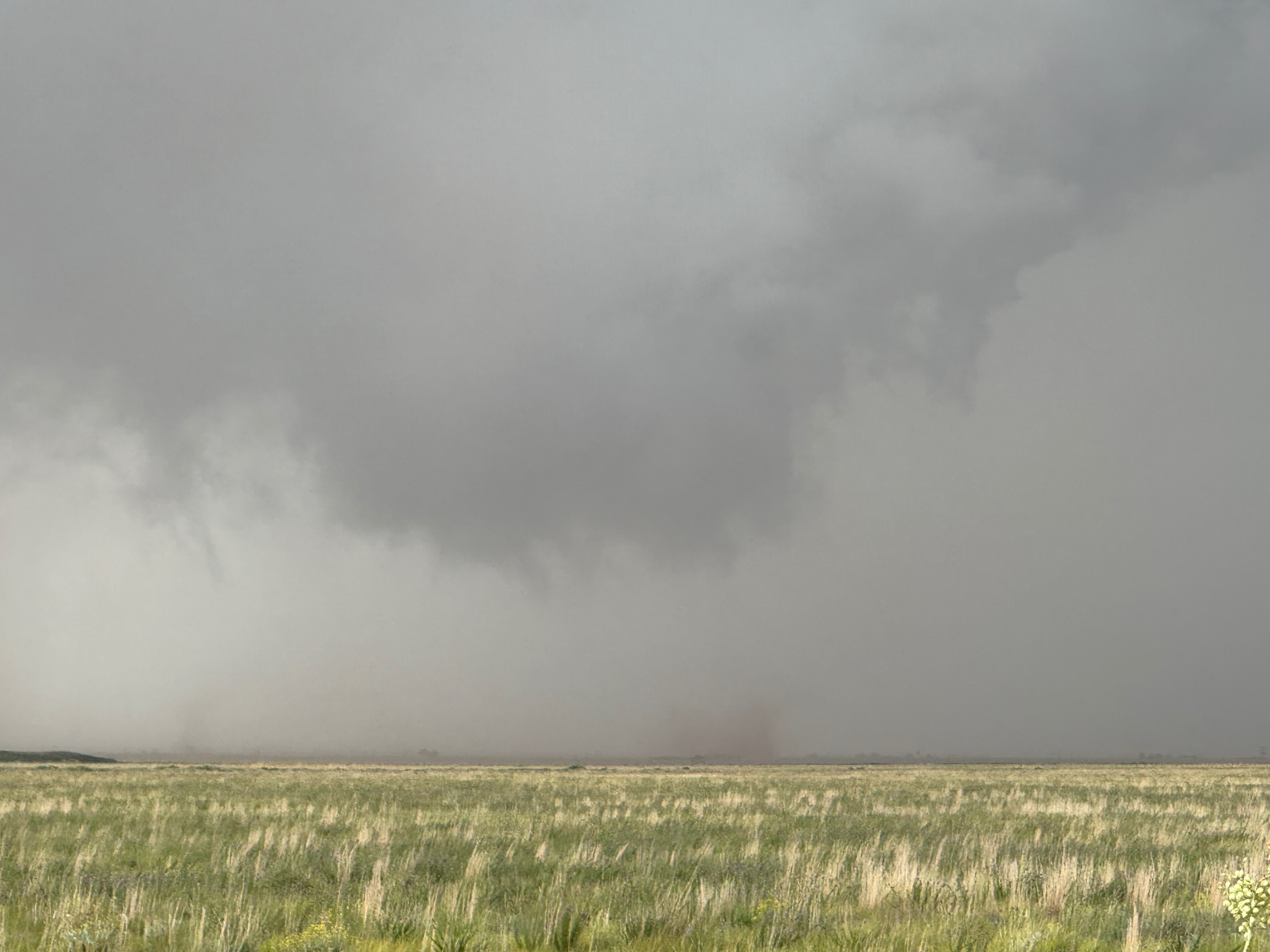 This first tornado lasted maybe 2-3 minutes and was just the appetizer. Our supercell was strengthening and moving eastward into a very favorable environment along the boundary. We needed to get farther east again, and FM114 was about perfect, taking us south two miles from Lingo and then eastward to the Texas border. We stopped very close the TX/NM border, and to our NNW was (no surprise) a low wall cloud with dust beneath it (last 7 images above). Dusty spin-ups, some with condensation funnels and some without, were almost continuous from the storm’s action area just a few miles to the north of FM114. We went another few miles east, stopped again, and watched sporadic dusty spin-ups several miles to our north.