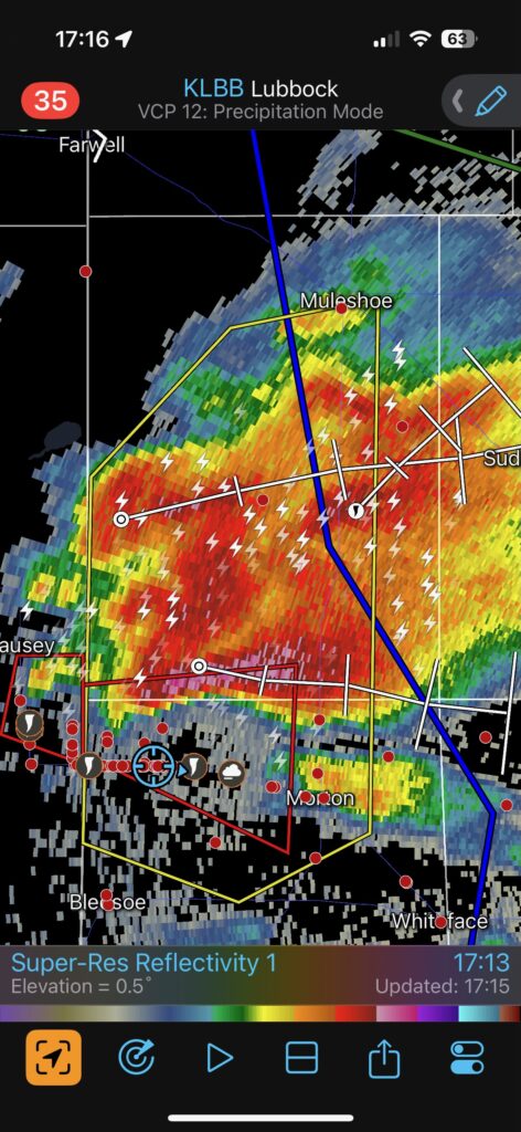 The radar screenshots above show our location at 5:16 p.m. CDT just east of the state line, and at 5:29 p.m. CDT we are in Morton, about ten miles farther E to ESE. When we started east from the stop a few miles east of the state line around 5:16 p.m., the storm was continuing to tease us with plenty of dust and weak tornadoes beneath its active wall cloud. I planned on stopping again in a few miles, but we were soon getting into strong dust-filled inflow. We didn’t want to stop in that, so I decided to head all of the way to Morton. From there, we could go north a bit on 214 and probably get a really good look at the storm and its structure…with hopefully no problematic blowing dust. Another reason I elected to go ahead and reposition so far to the east was because 114 angles to the ESE to Morton here, taking us farther south than I wanted to be. I didn’t want to play around on dirt roads now.