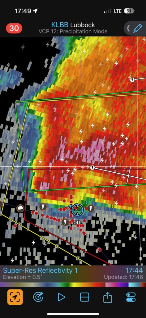 I was not enamored with the storm’s HP (high precipitation) nature as it continued E and ESE towards the western edge of Lubbock. I certainly did not want to contend with giant hail or a hidden tornado, so I opted for a new supercell that had developed behind this one (last three images above). This one had a good and nasty look for a bit, but was riding the cool outflow from the lead cell and it was in no position to produce a tornado of its own.