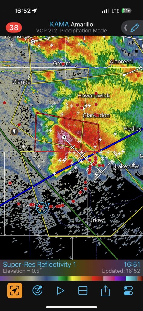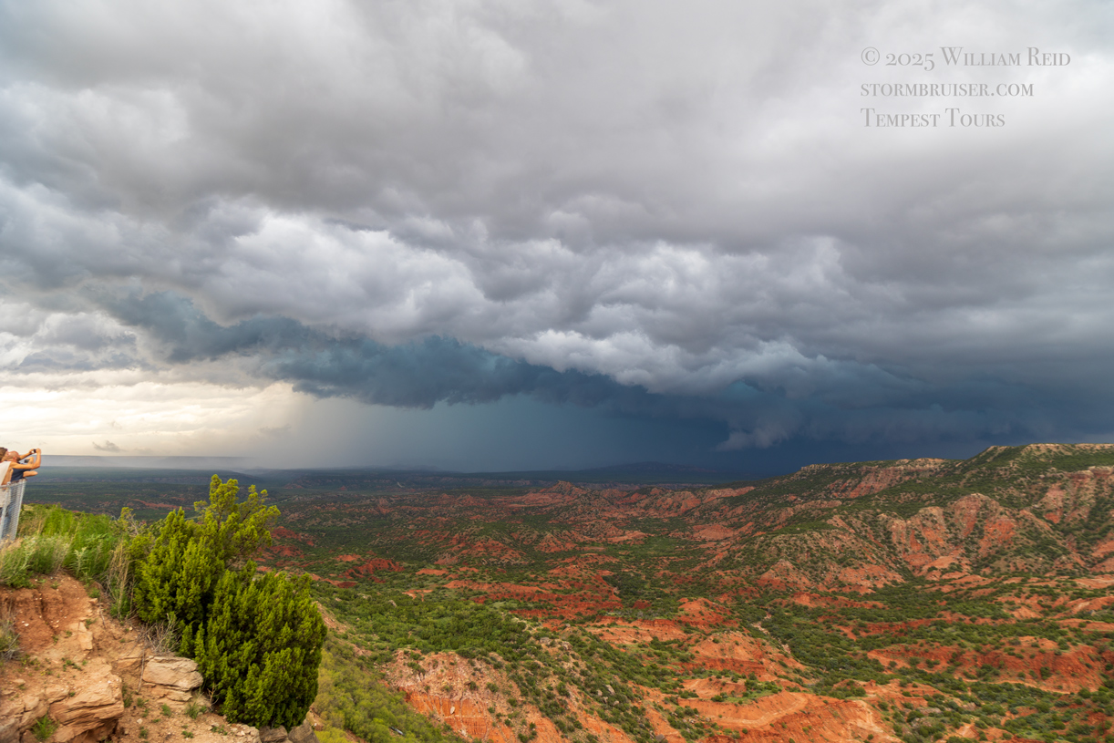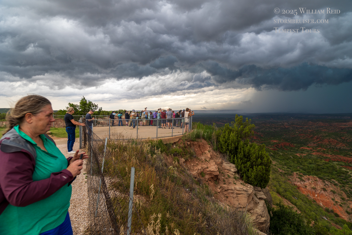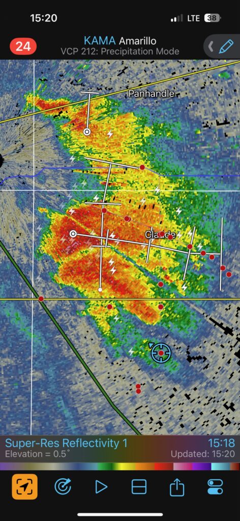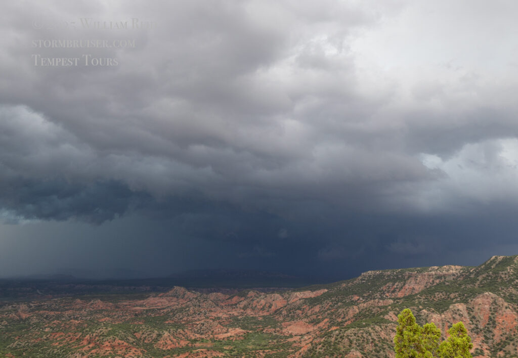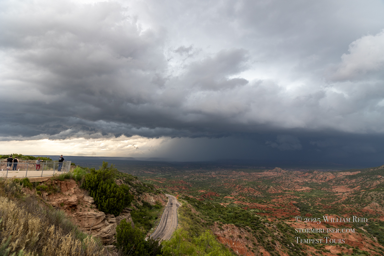 A cell or two strengthened considerably and we stayed a little southeast and south of the main storm core as it moved to the ESE. Our “Claude” supercell was moving off of the Caprock and into the sparse road network south-southeast of Claude. We watched from a Palo Duro Canyon scenic lookout on the south side of the Prairie Dog Town Fork of the Red River in Armstrong County. This was far enough south to evade the 4-inch-plus-size hail that was reported up 207 to our north (ten miles south of Claude at 4:16 p.m. CDT).