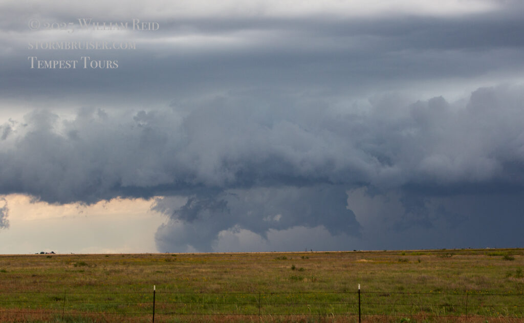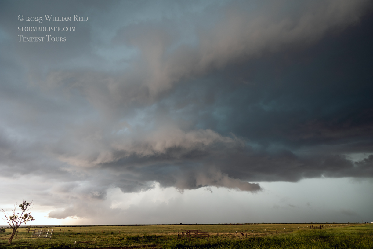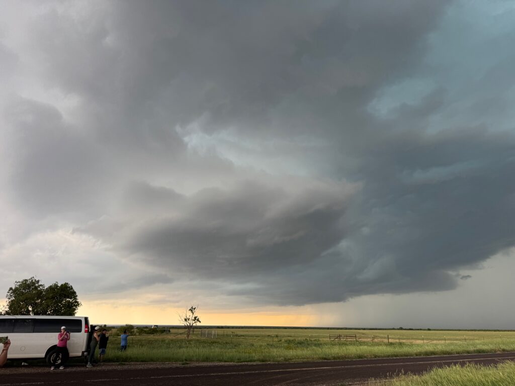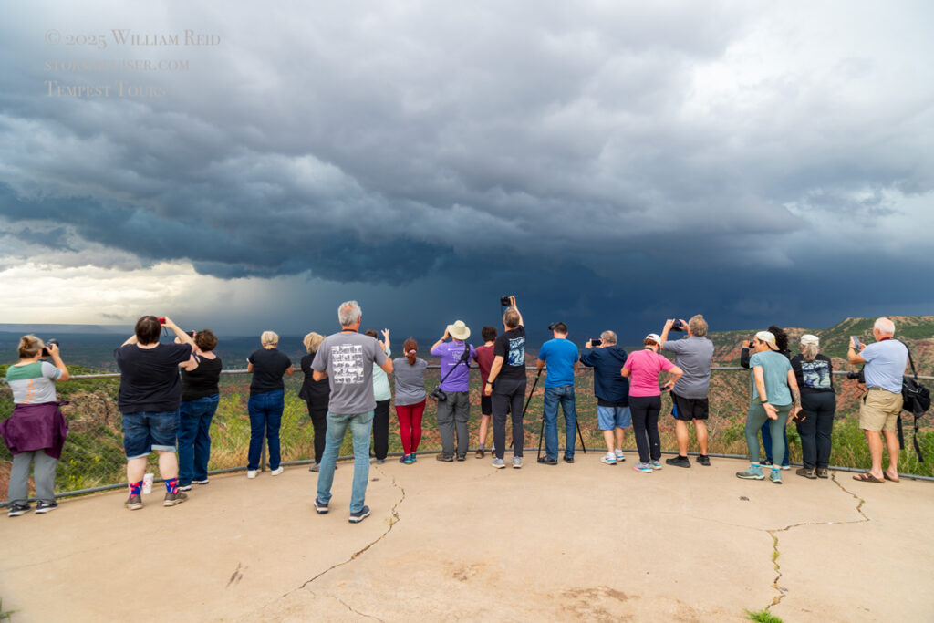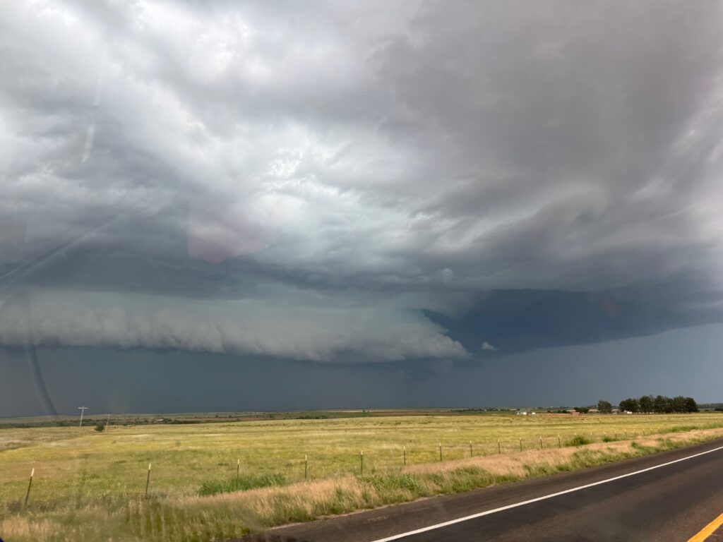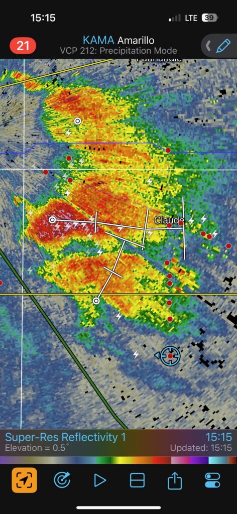 A cell or two strengthened considerably and we stayed a little southeast and south of the main storm core as it moved to the ESE. Our “Claude” supercell was moving off of the Caprock and into the sparse road network south-southeast of Claude. We watched from a Palo Duro Canyon scenic lookout on the south side of the Prairie Dog Town Fork of the Red River in Armstrong County. This was far enough south to evade the 4-inch-plus-size hail that was reported up 207 to our north (ten miles south of Claude at 4:16 p.m. CDT).