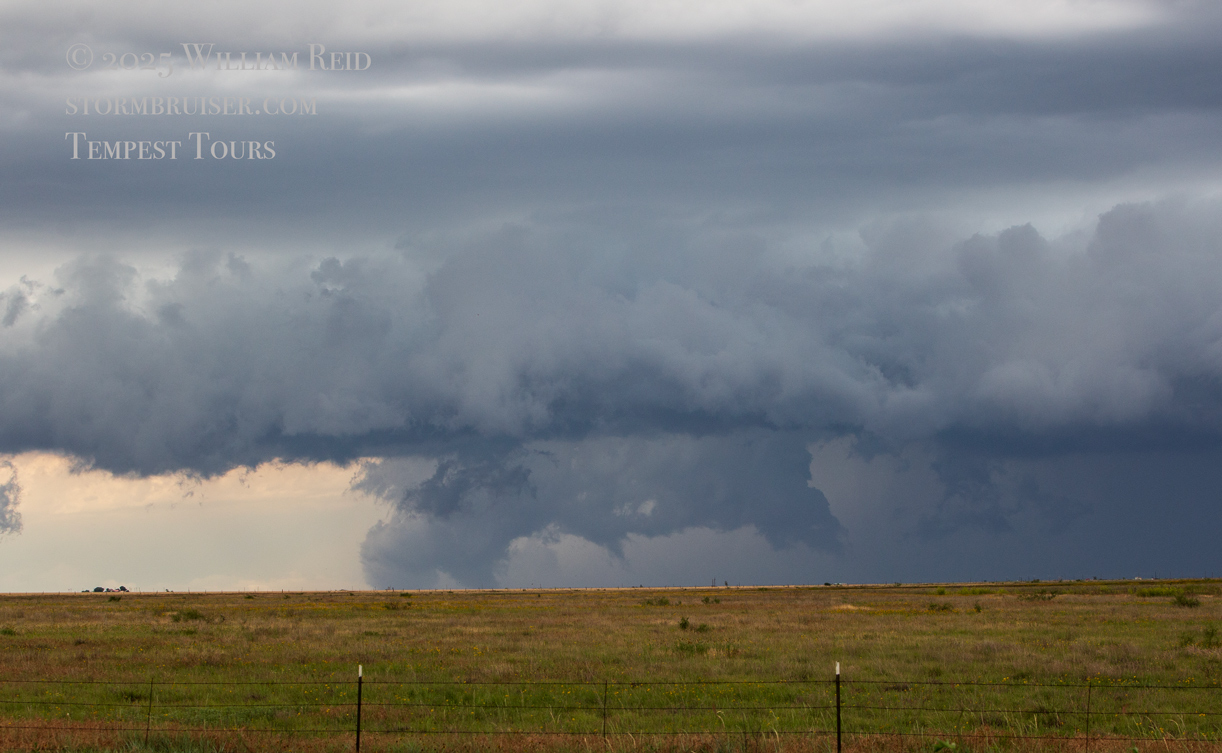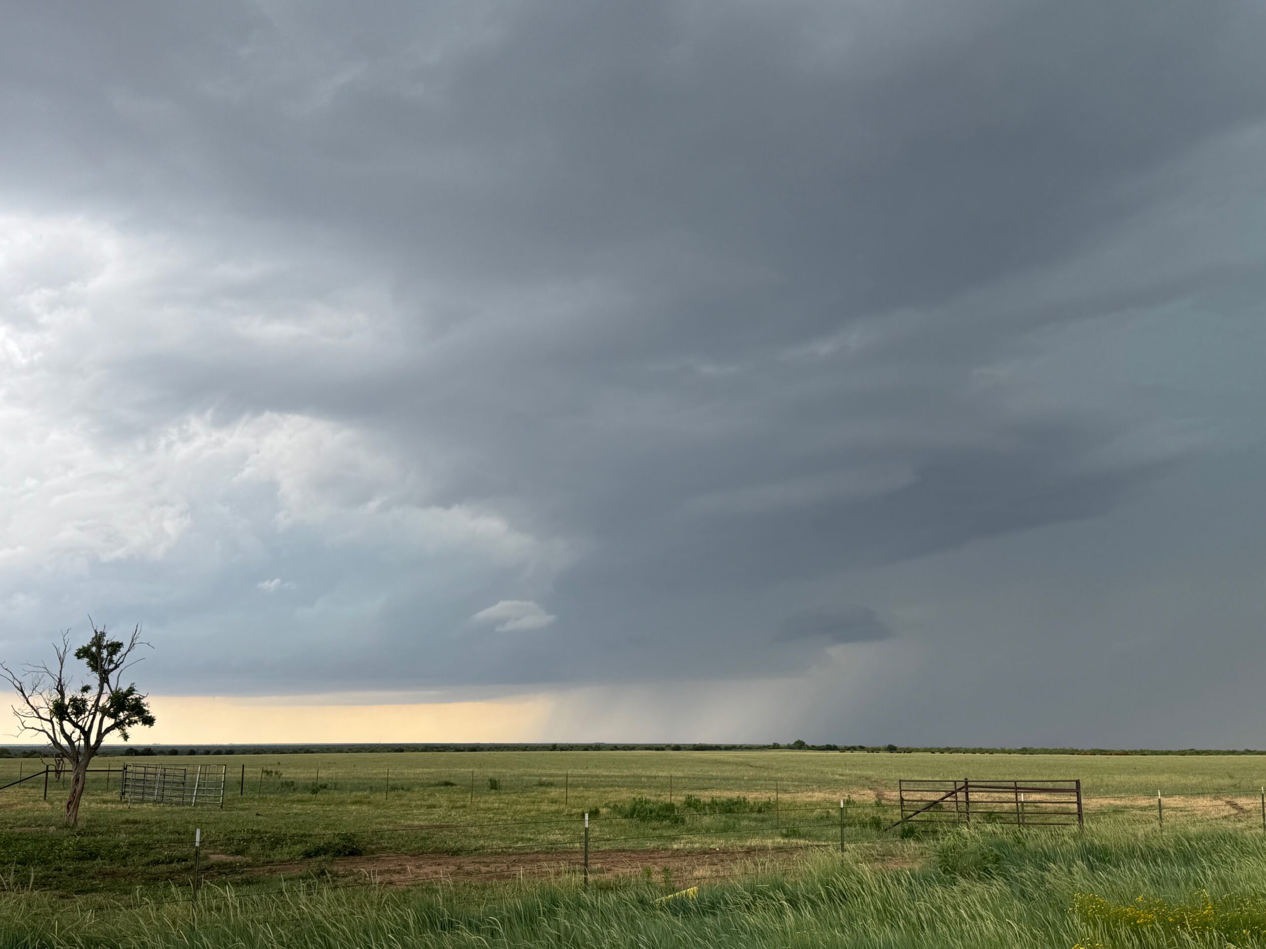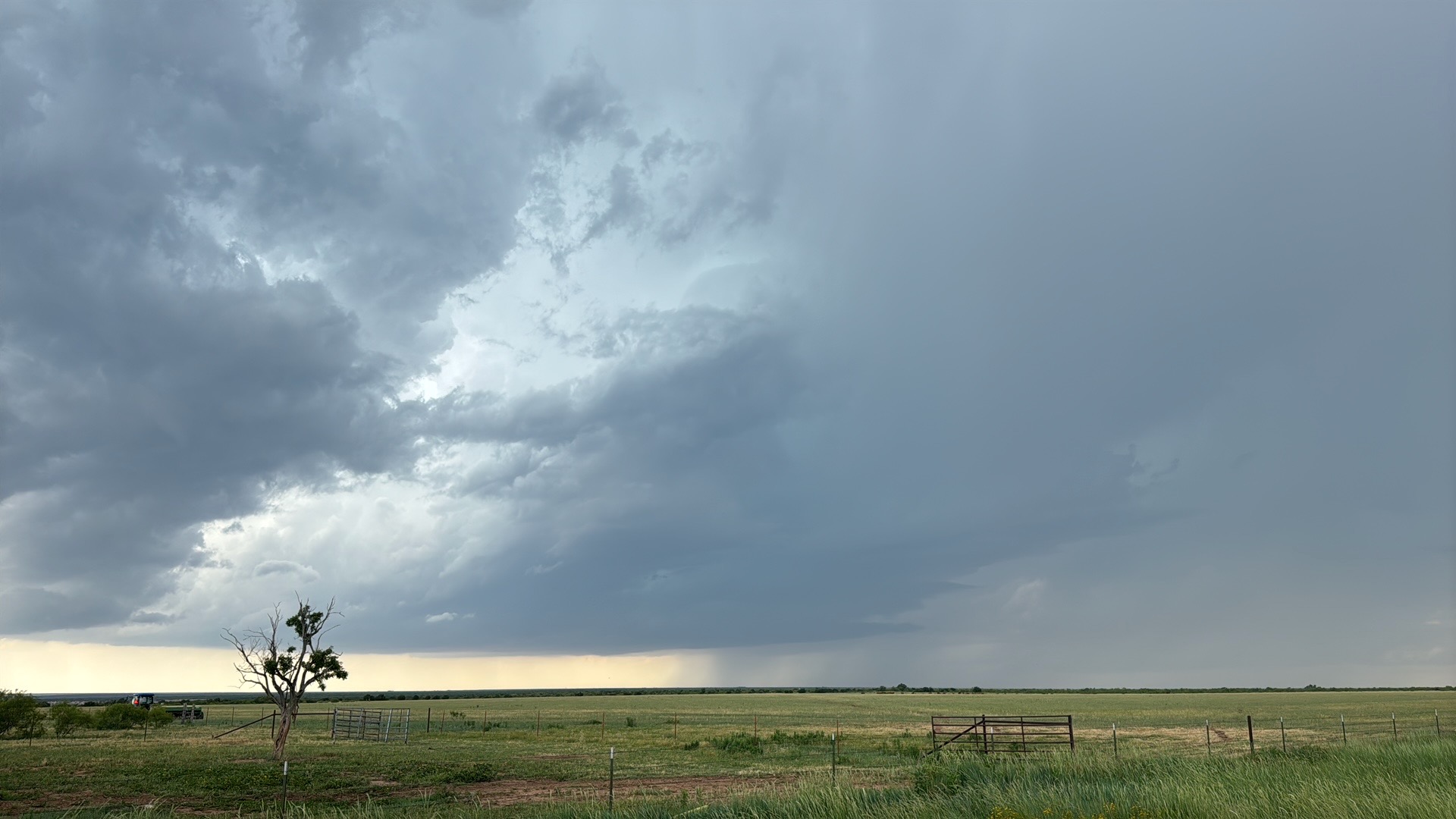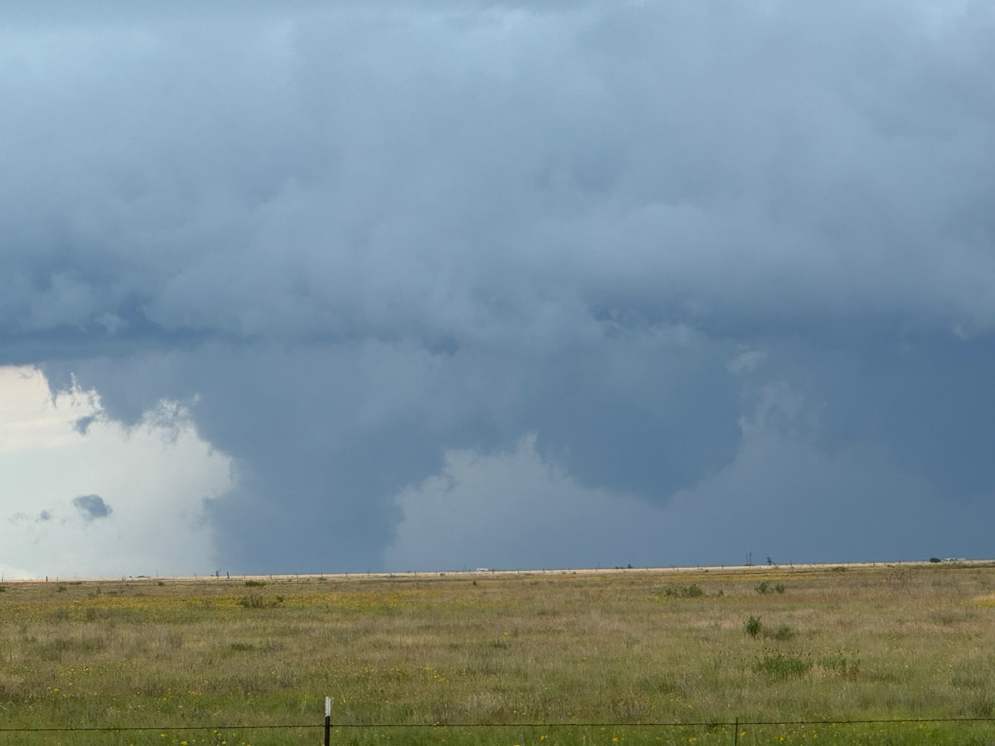 Our supercell was looking rather HP and messy as we tried to get back into position near Turkey. There was a blocky and very low wall cloud which looked like it might have a tornado for a minute or two (first two pics below)…but I guess not. The radar depiction looked good, and there was a tornado warning with the storm, but if there was a tornado then it was not significant (or it was totally rain-wrapped). I think the storm was undercut, which greatly minimized tornado potential.