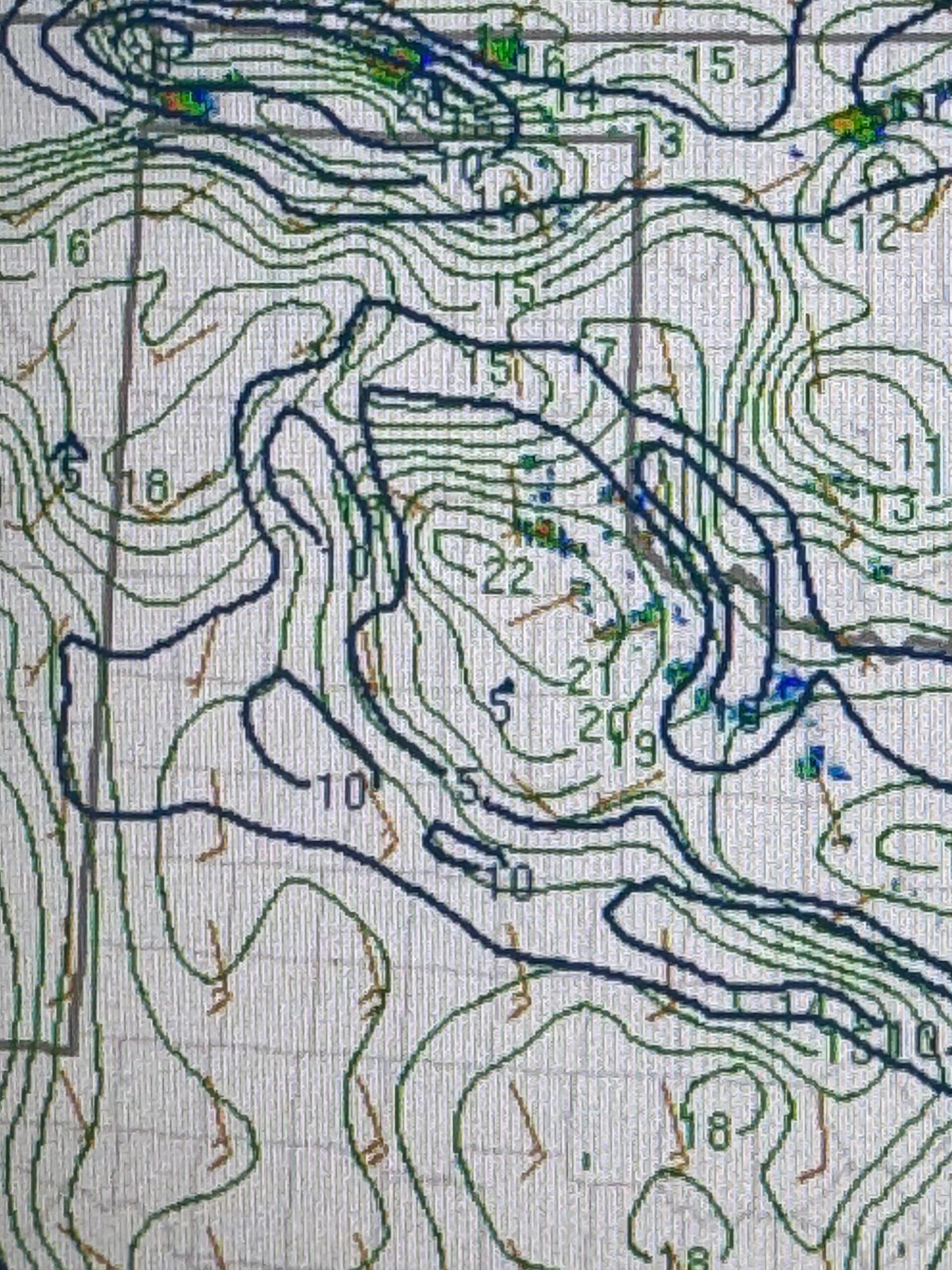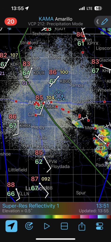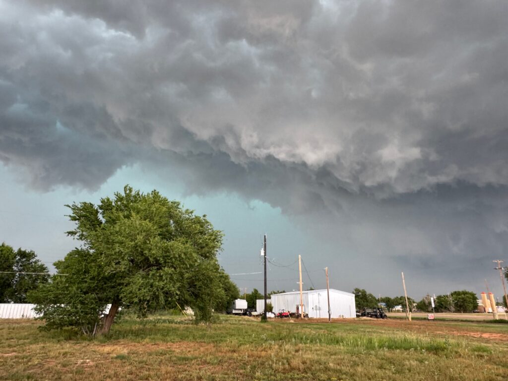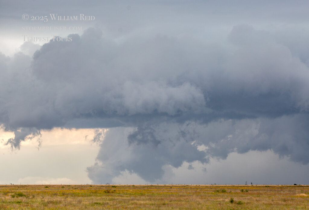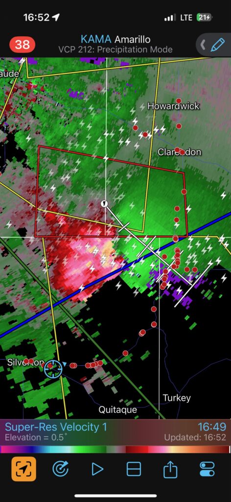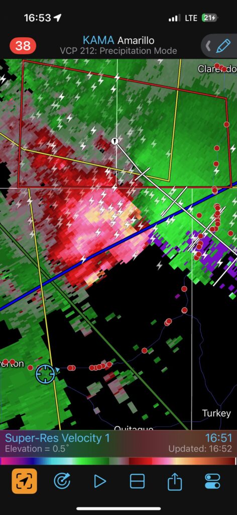 Our supercell was looking rather HP and messy as we tried to get back into position near Turkey. There was a blocky and very low wall cloud which looked like it might have a tornado for a minute or two (first two pics below)…but I guess not. The radar depiction looked good, and there was a tornado warning with the storm, but if there was a tornado then it was not significant (or it was totally rain-wrapped). I think the storm was undercut, which greatly minimized tornado potential.