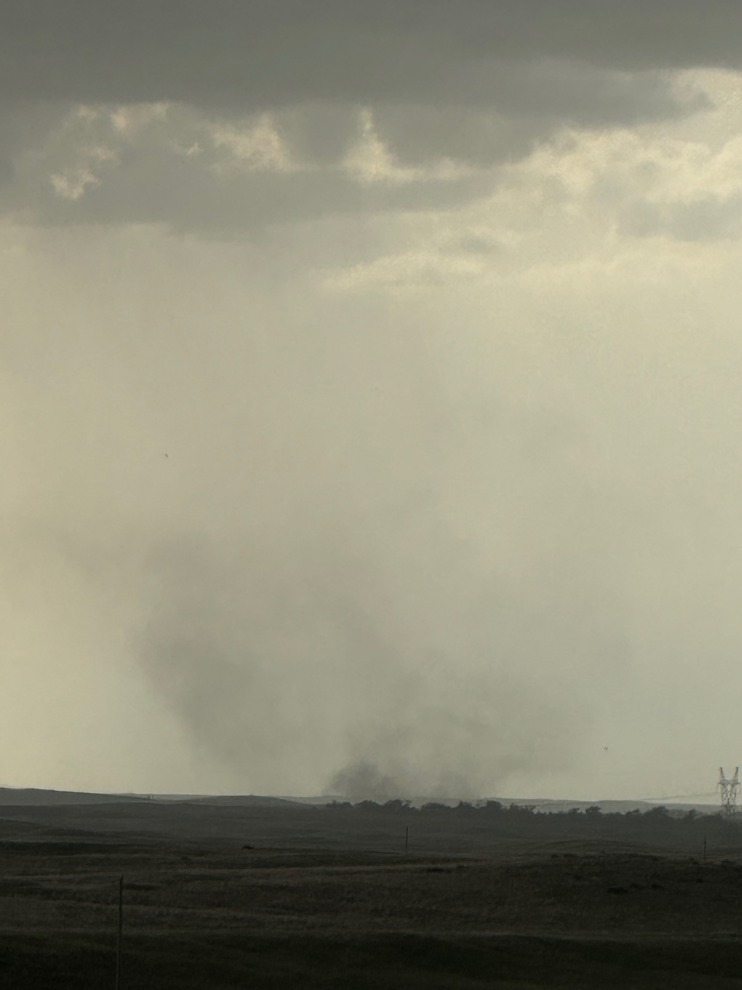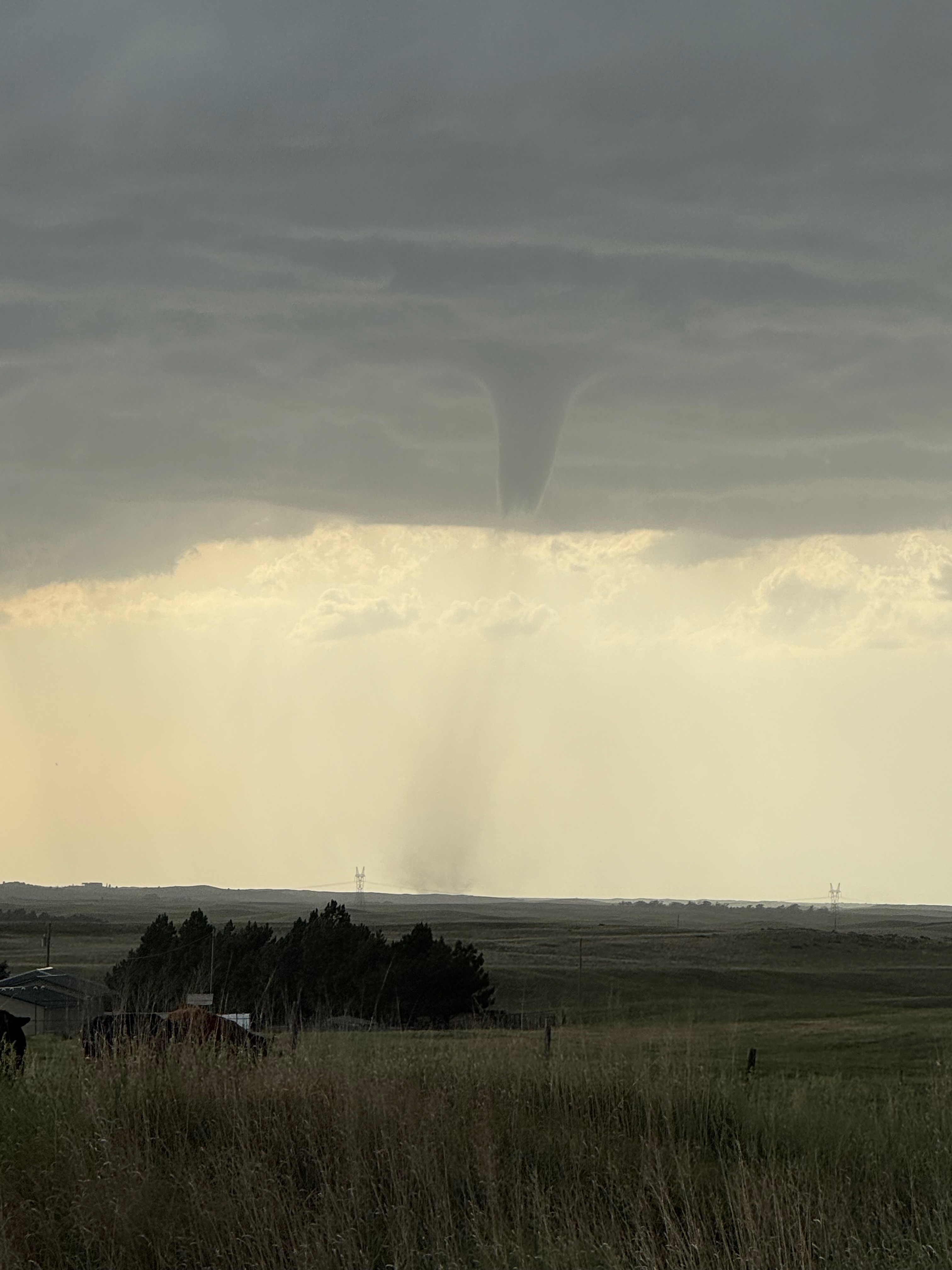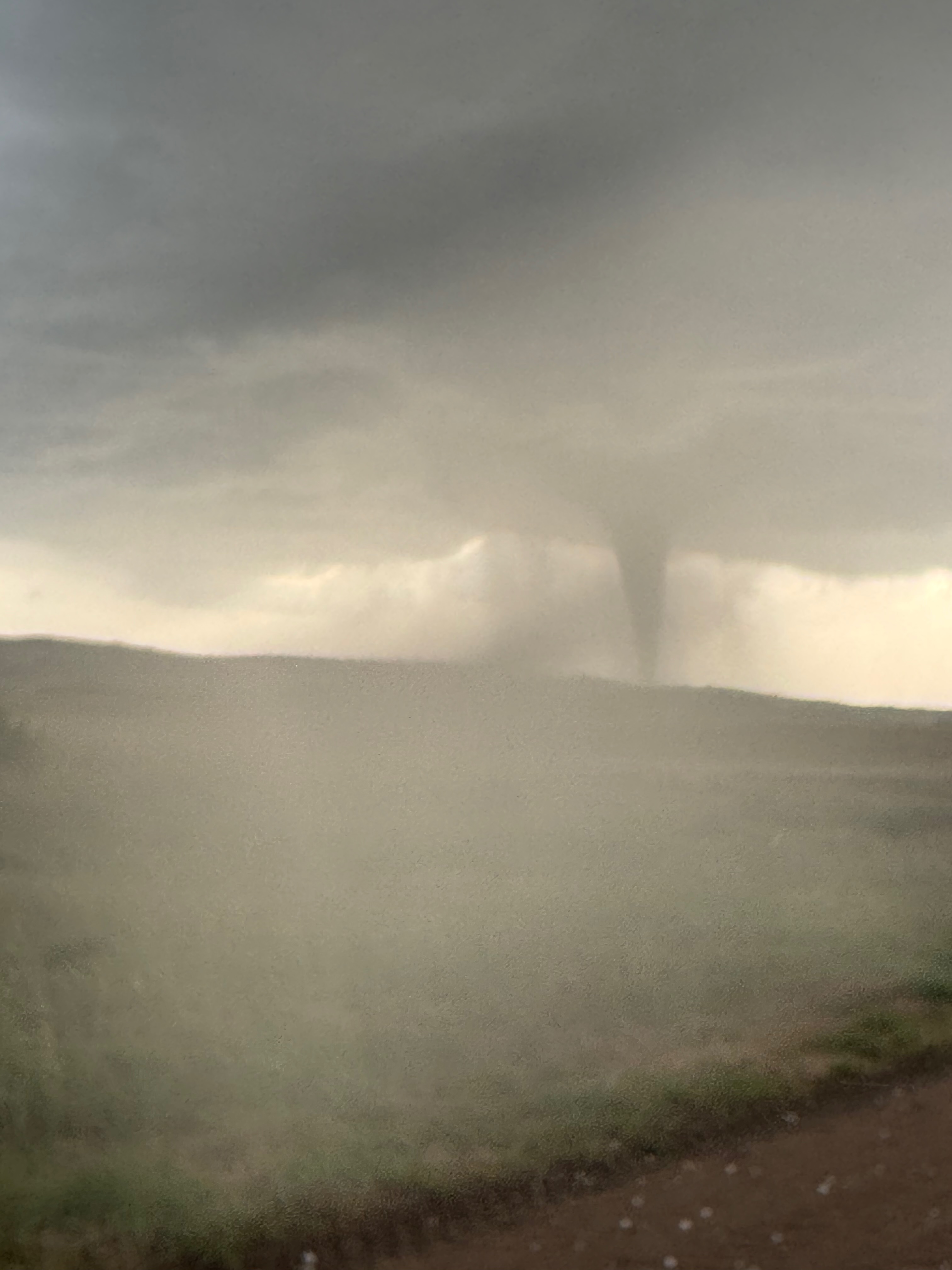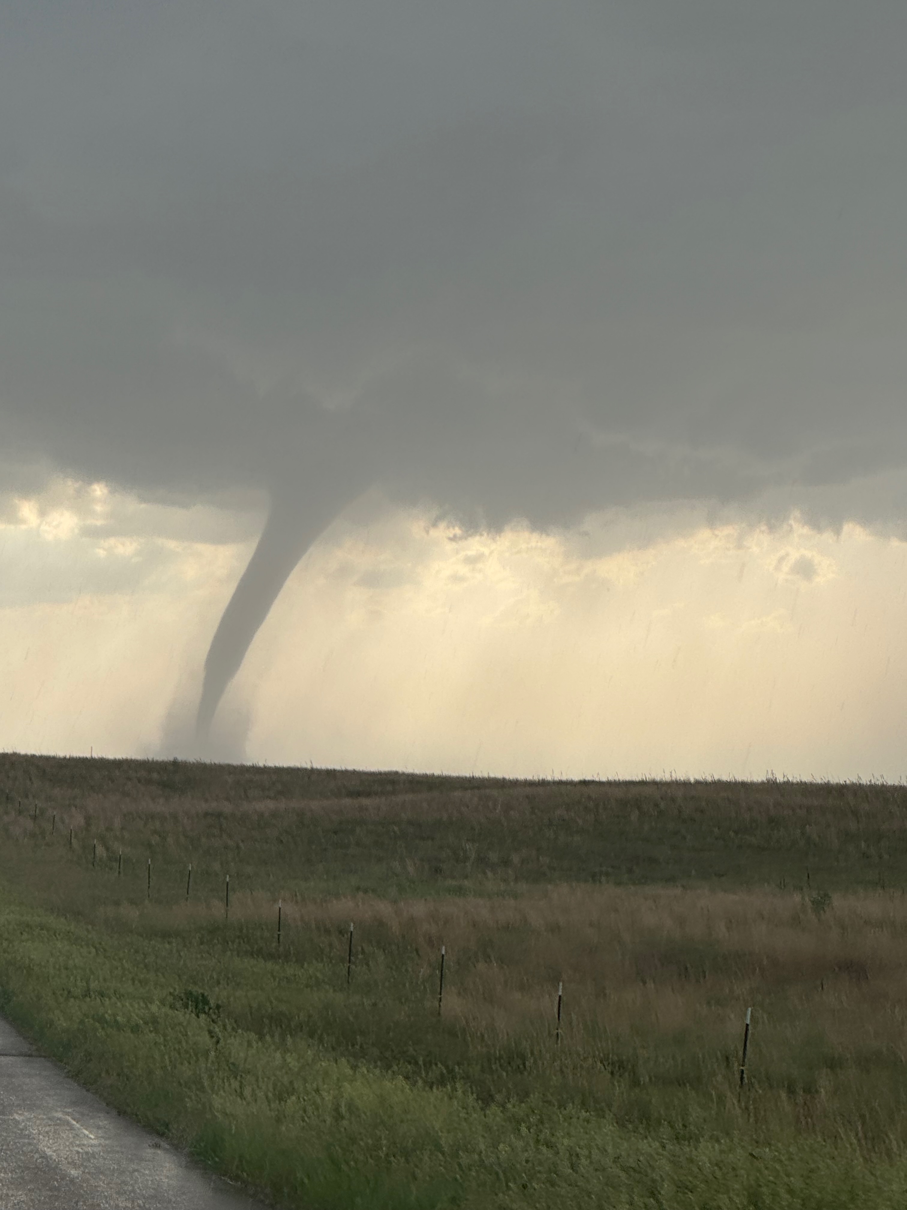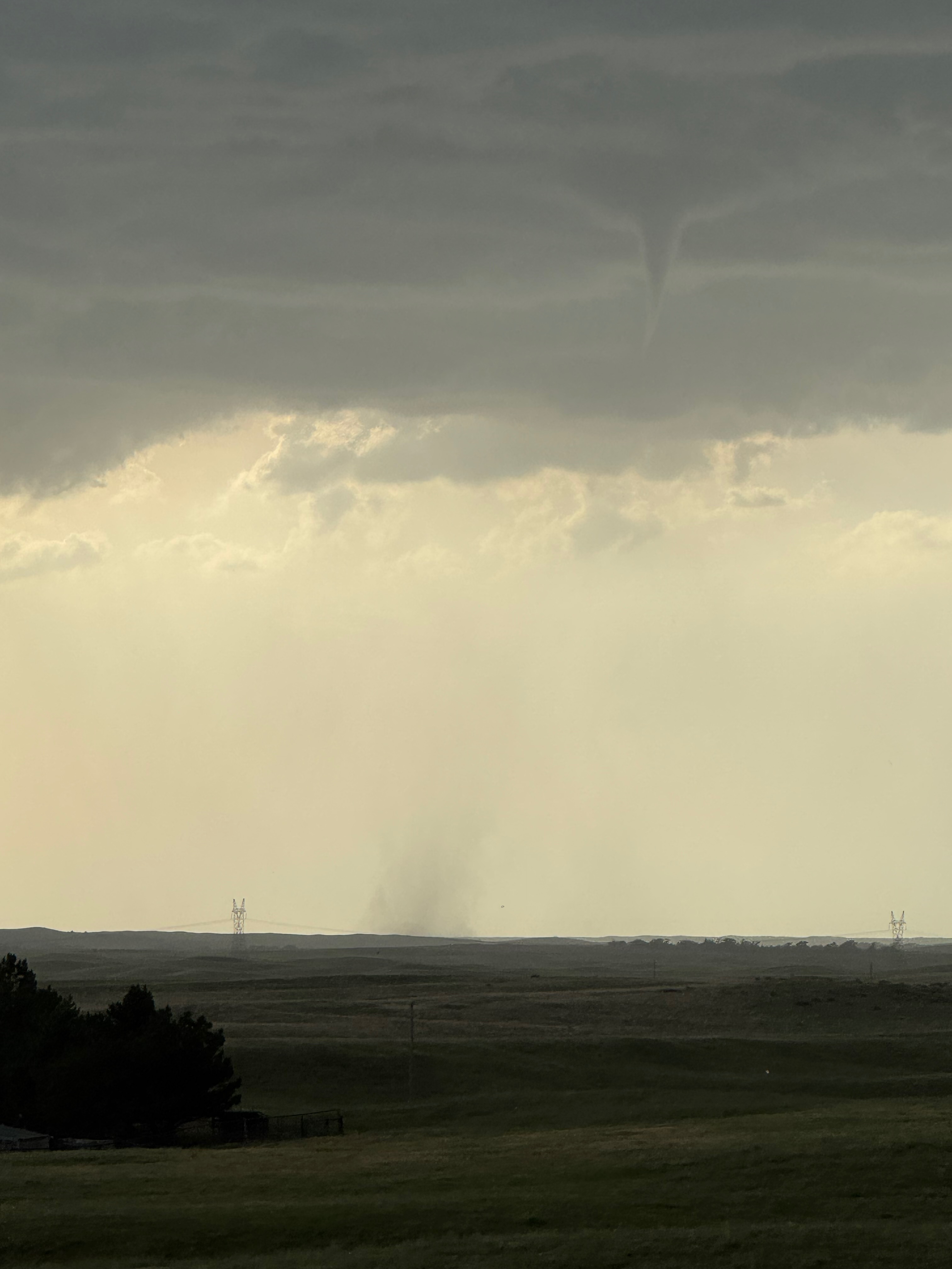 The final 17 images of the 30 above show “phase 2” of the tornado. When the initial “landspout” tornado dissipated, there was a lull of a minute or two with no tornado present from our vantage point (around 7:15 p.m. CDT). However, chasers close to the action along 23 reported a continuous circulation on the ground. A “second” tornado commenced quickly. It was very pretty and slender for quite a while. We were far enough away to have a really good view of the storm structure and the tornado, so I was shooting zoom and wide images on the iPhone. The contrast was very good with the sun behind the storm.