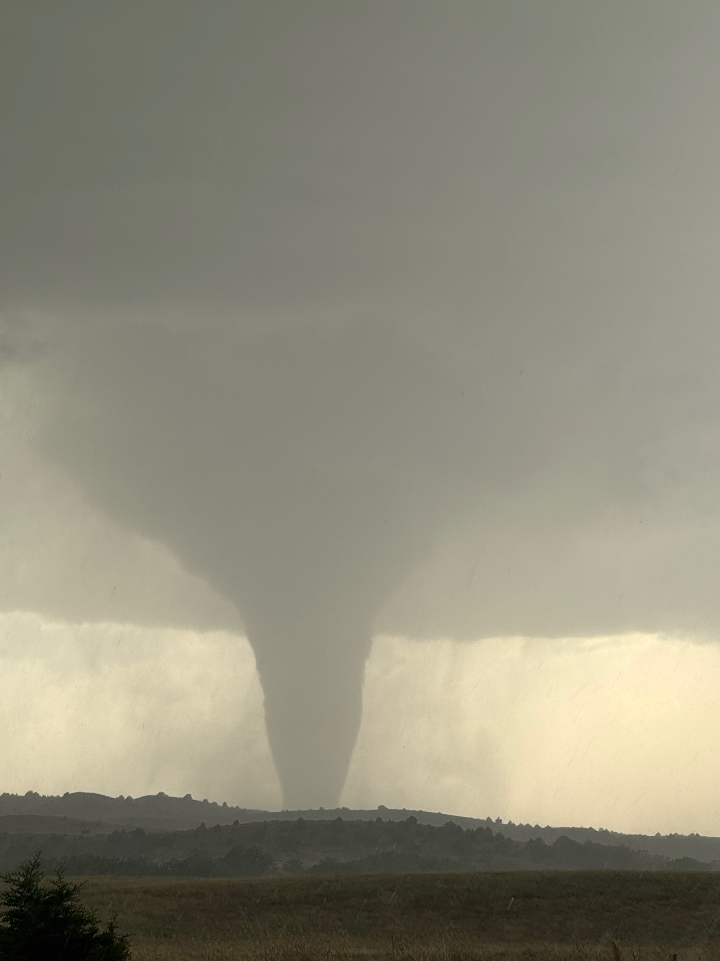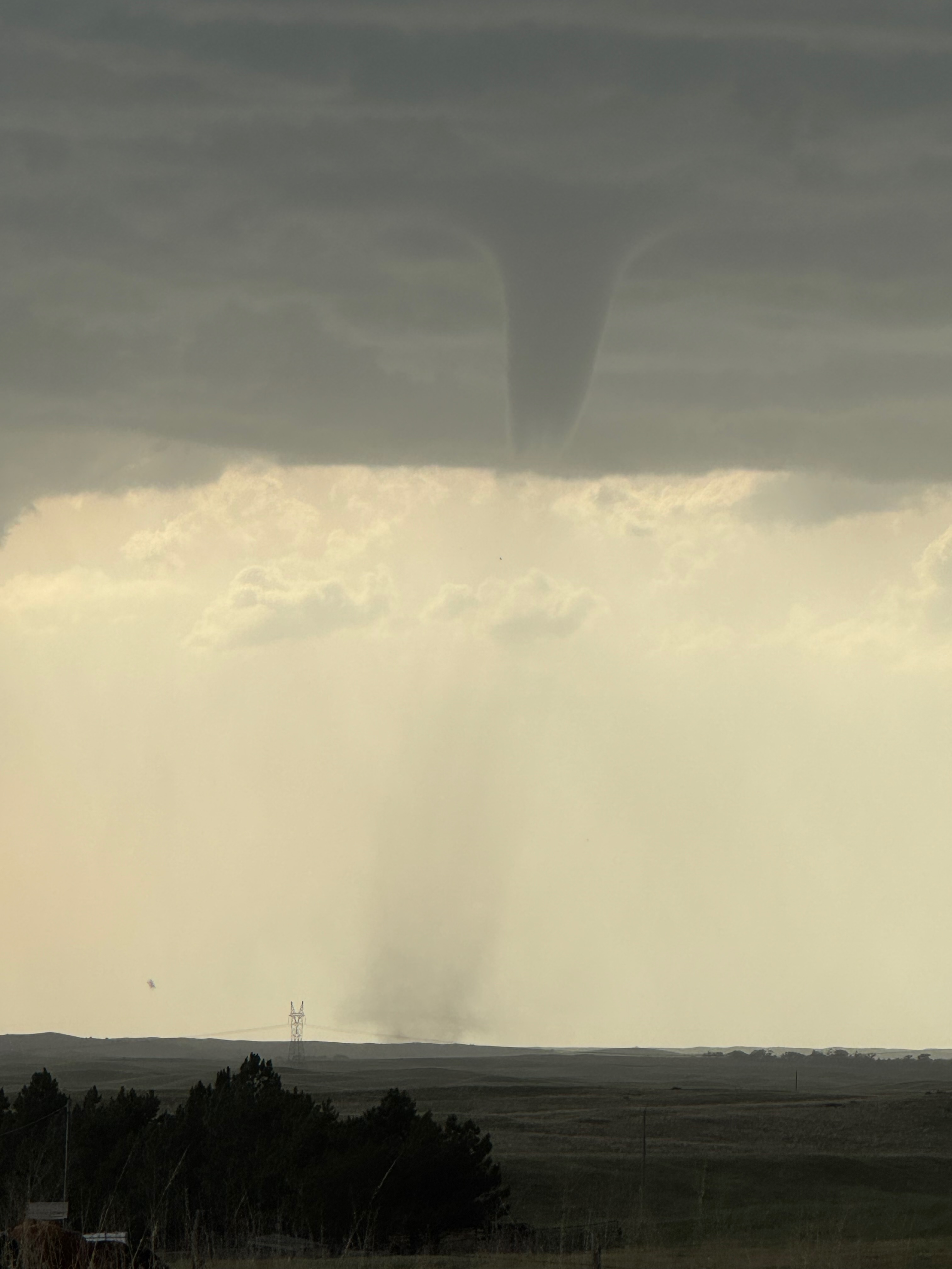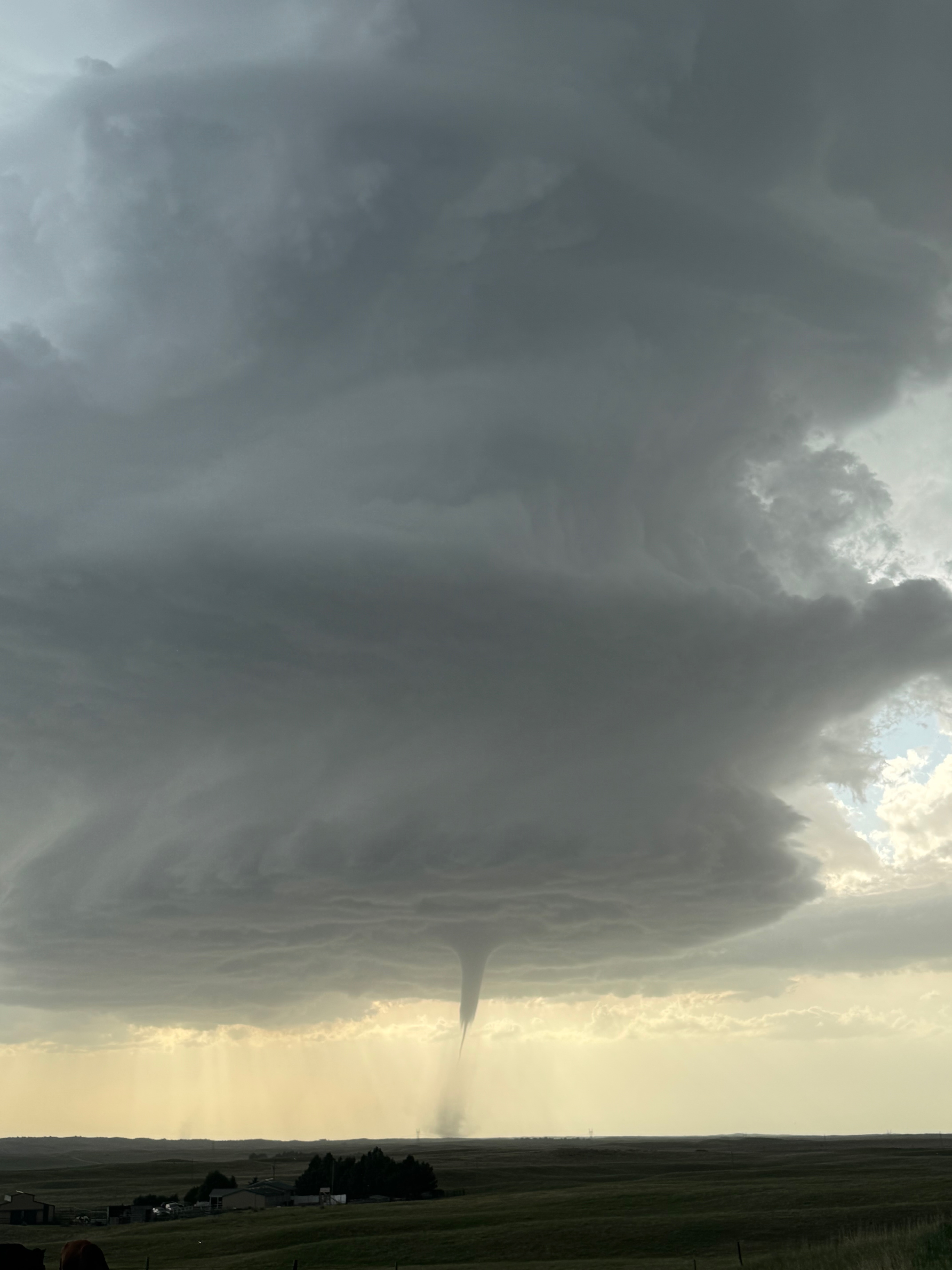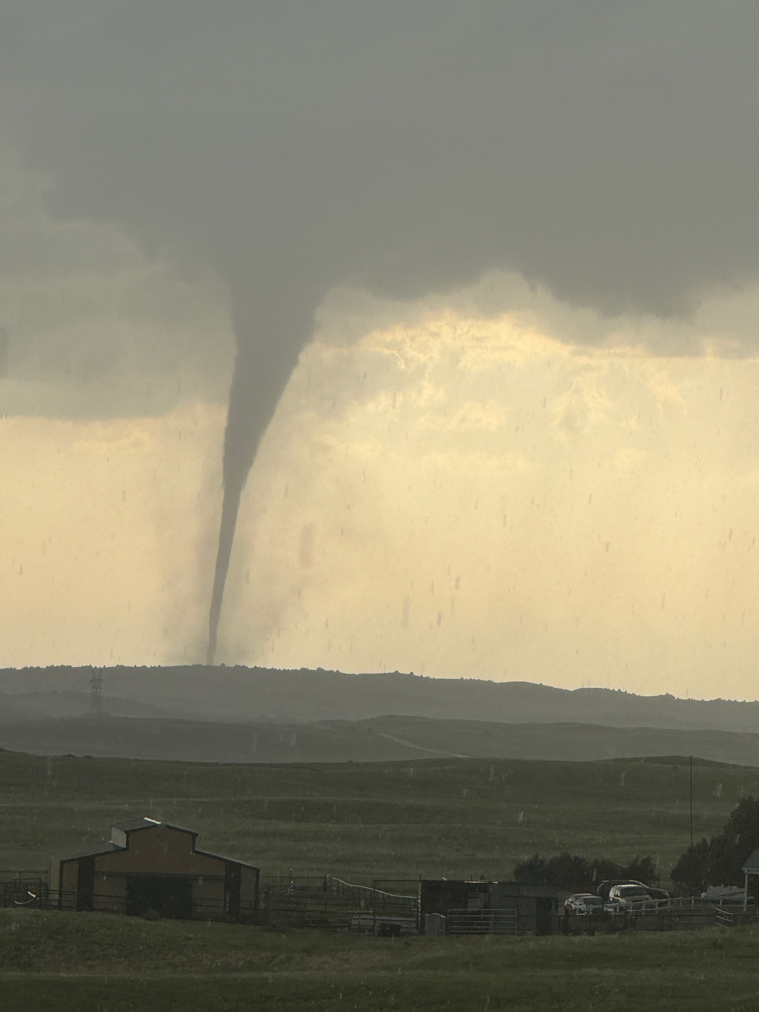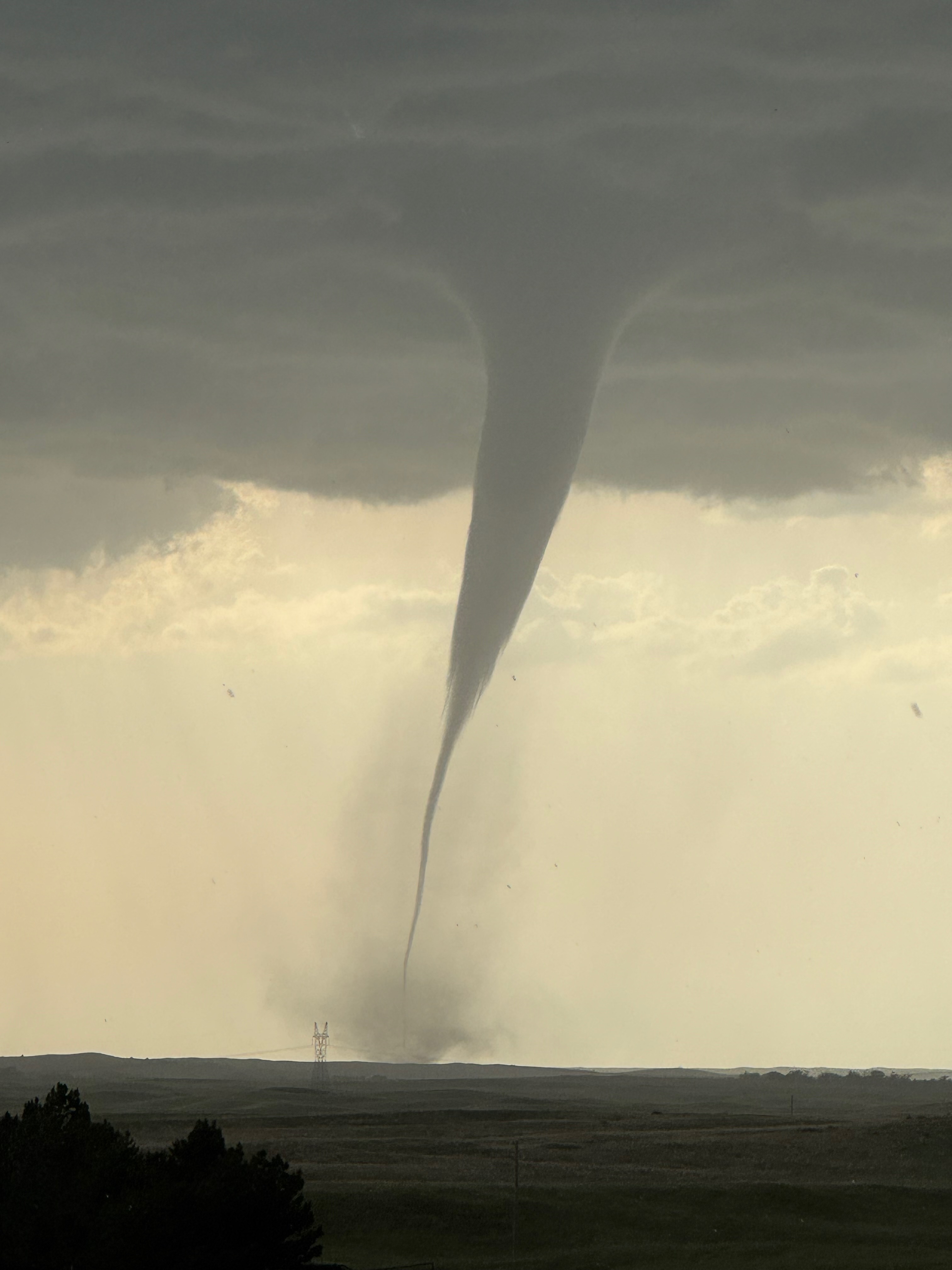The final 17 images of the 30 above show “phase 2” of the tornado. When the initial “landspout” tornado dissipated, there was a lull of a minute or two with no tornado present from our vantage point (around 7:15 p.m. CDT). However, chasers close to the action along 23 reported a continuous circulation on the ground. A “second” tornado commenced quickly. It was very pretty and slender for quite a while. We were far enough away to have a really good view of the storm structure and the tornado, so I was shooting zoom and wide images on the iPhone. The contrast was very good with the sun behind the storm.