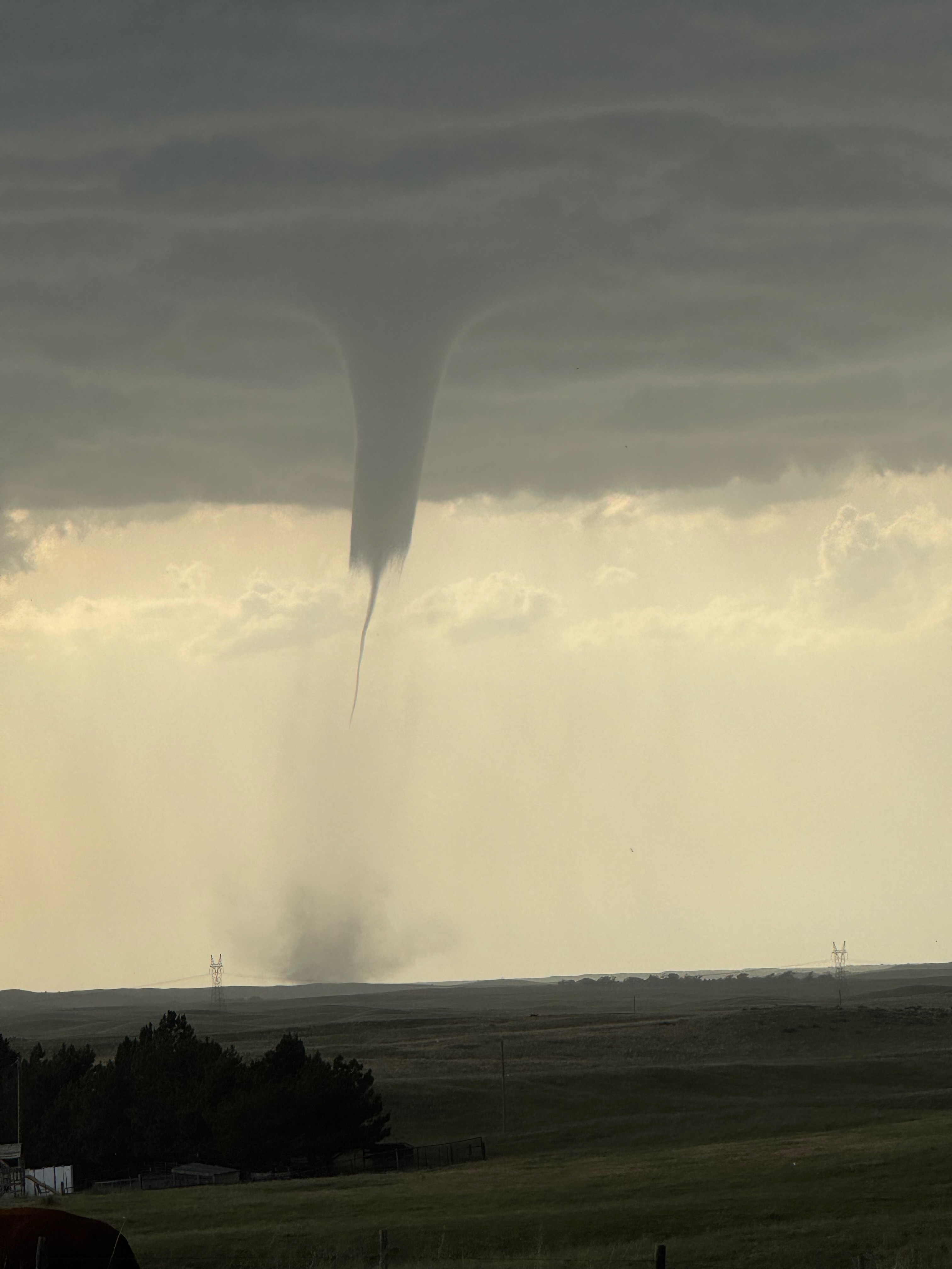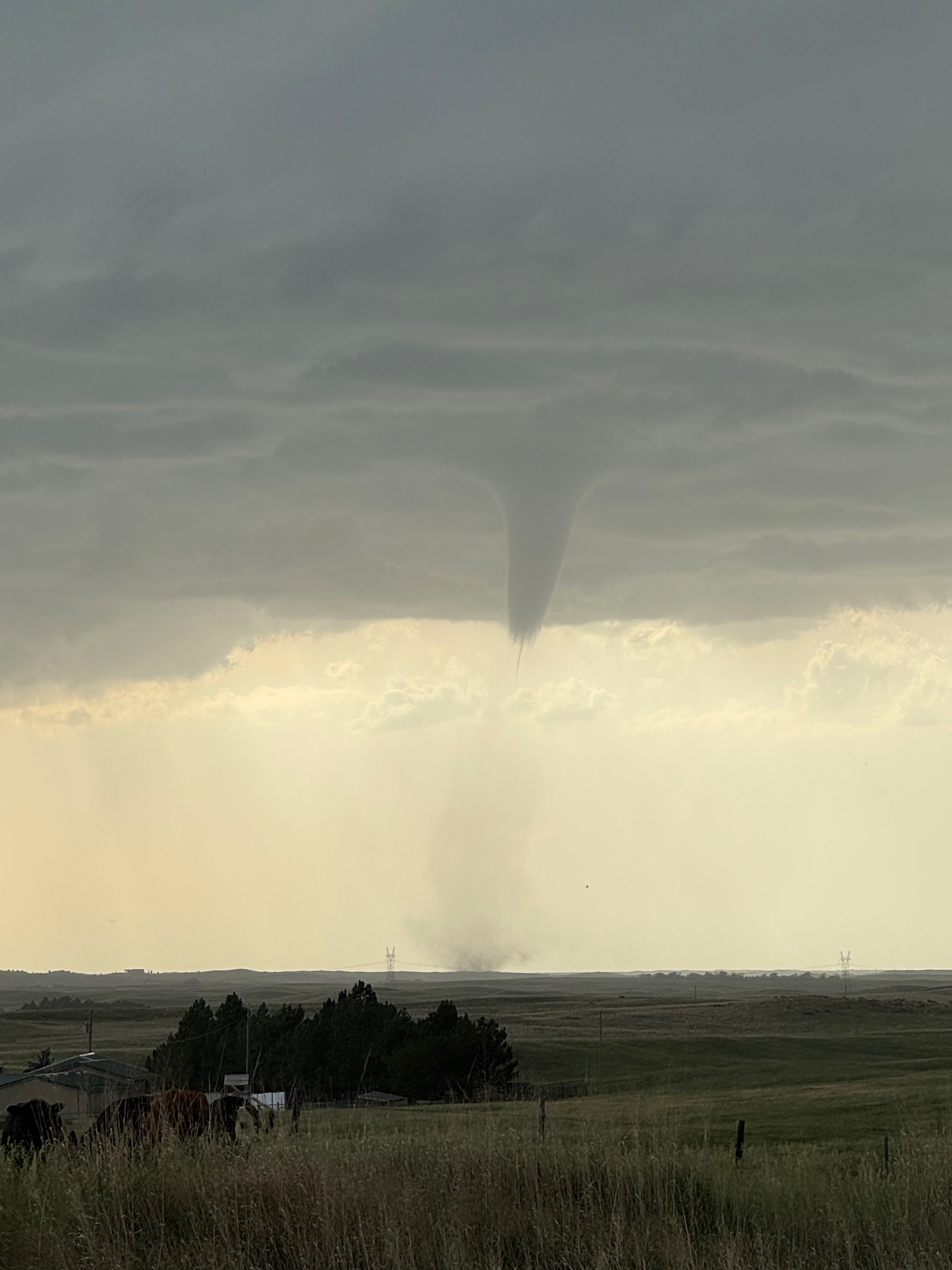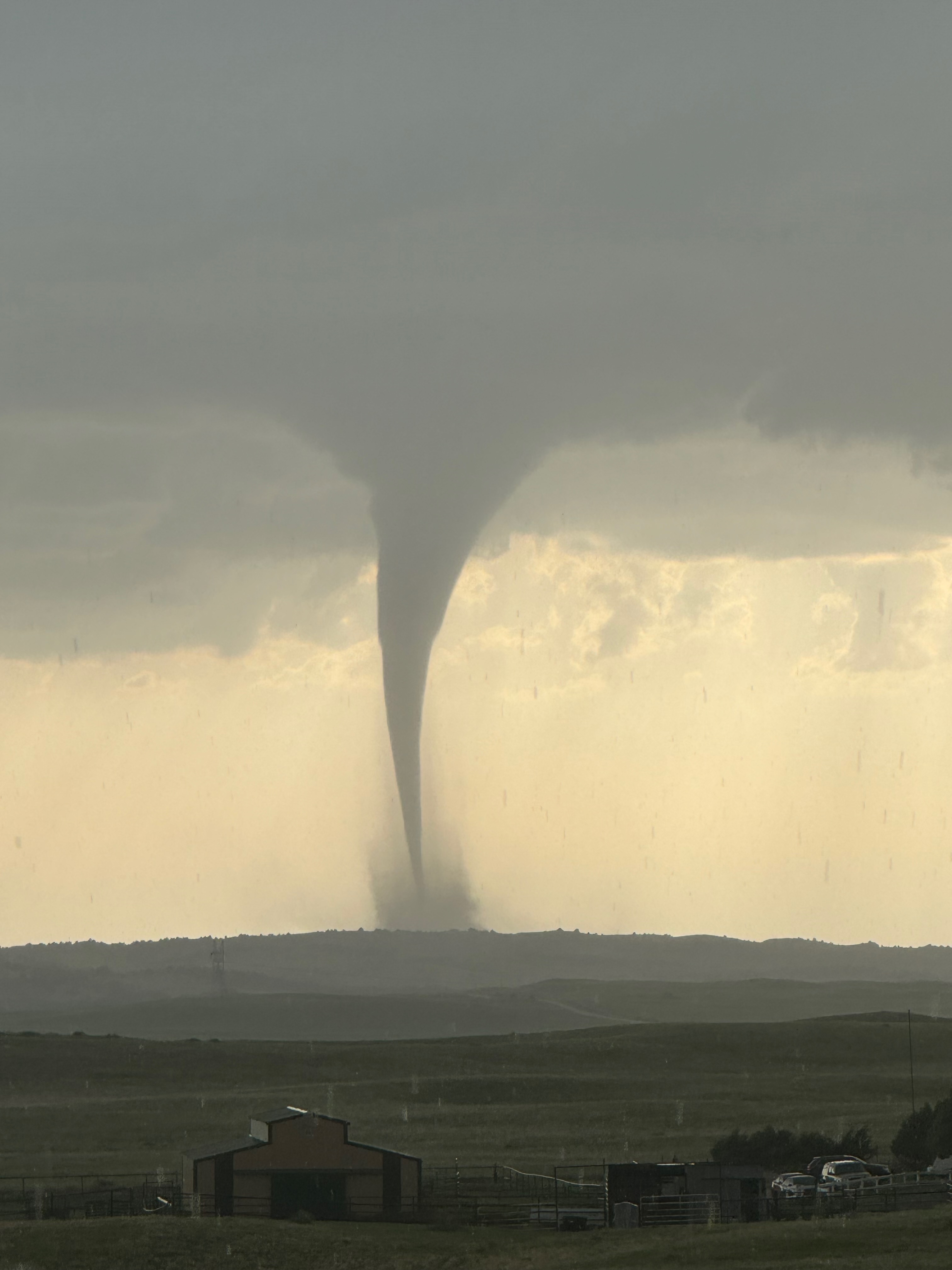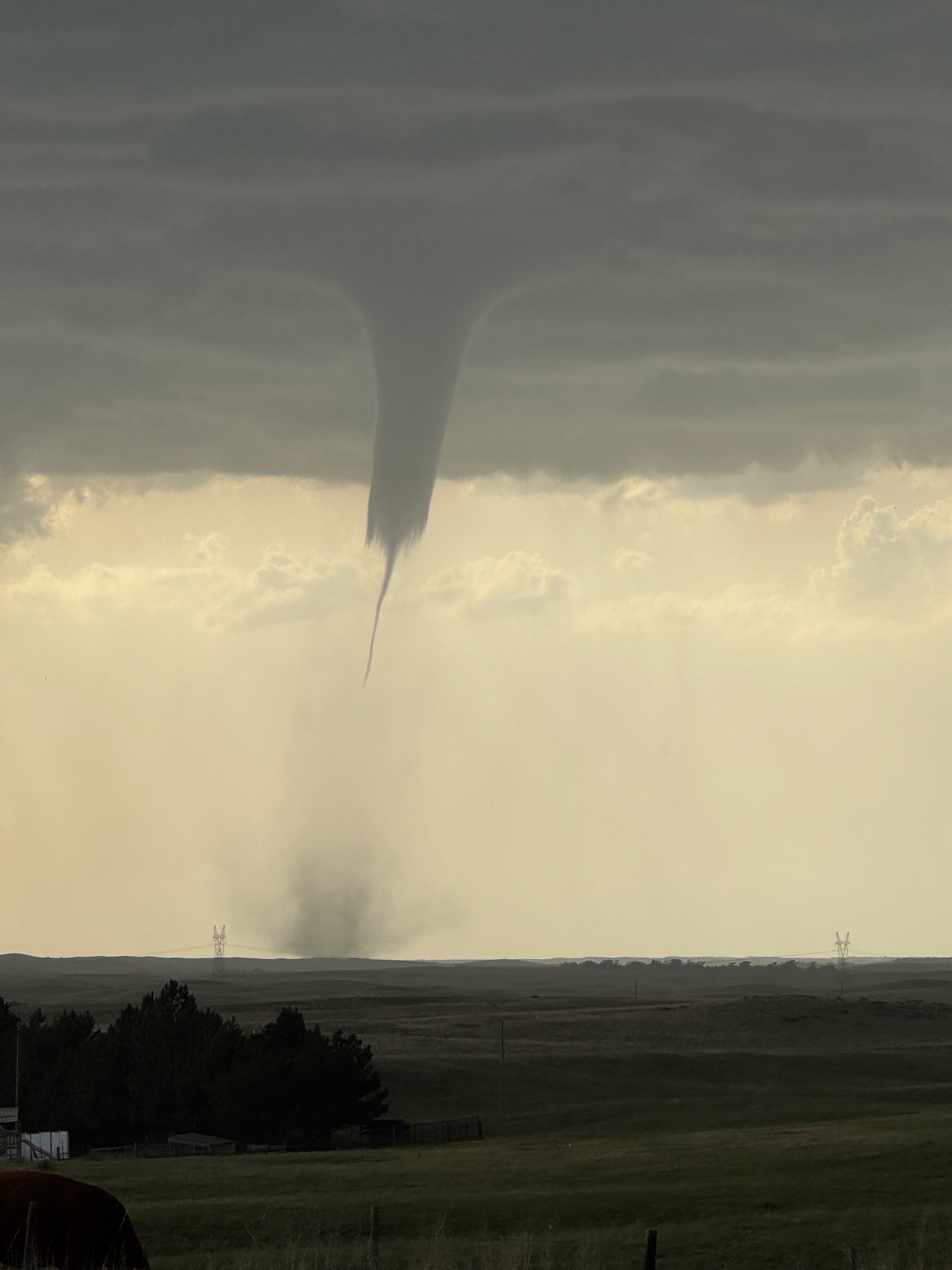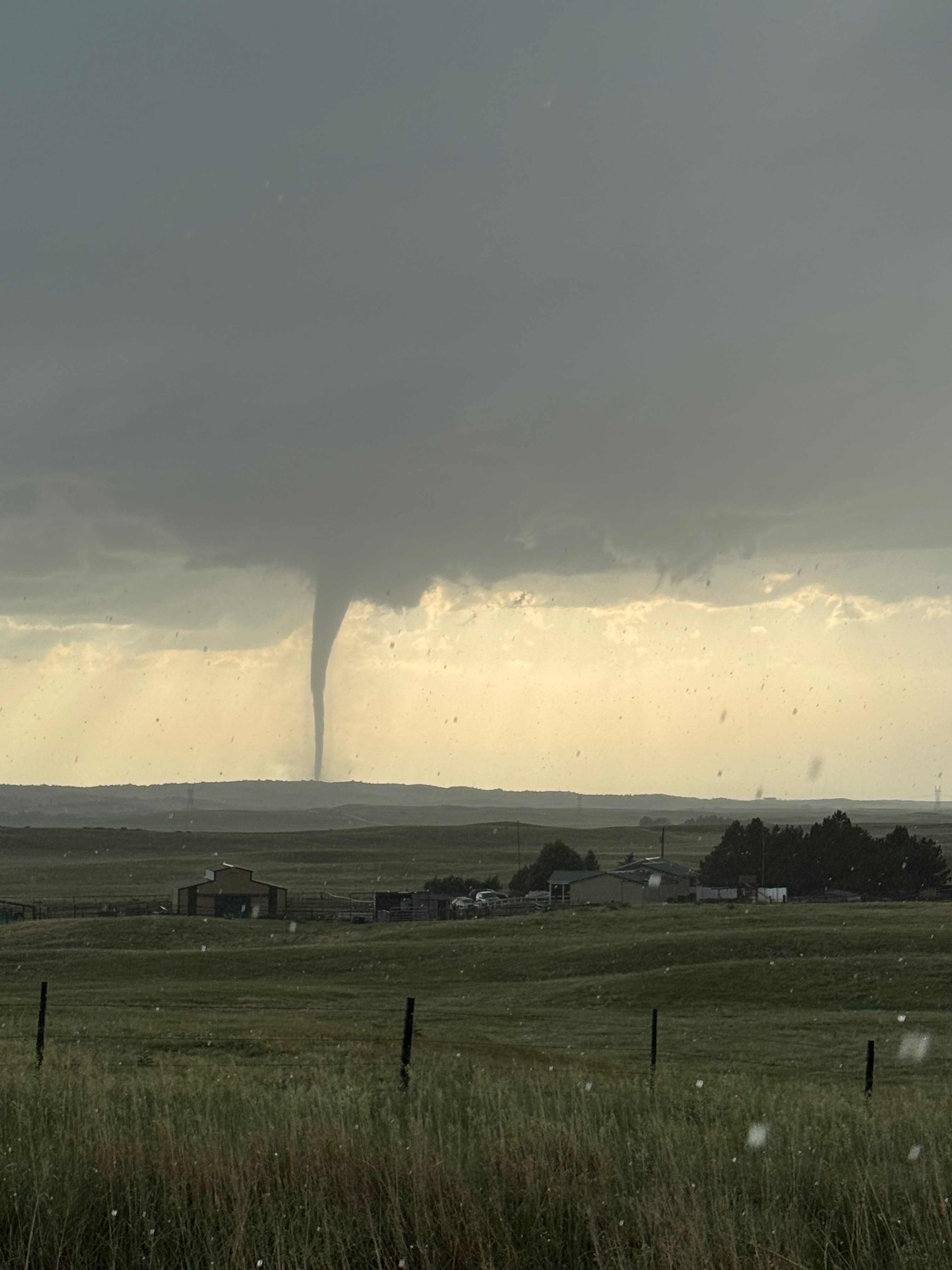 The final 17 images of the 30 above show “phase 2” of the tornado. When the initial “landspout” tornado dissipated, there was a lull of a minute or two with no tornado present from our vantage point (around 7:15 p.m. CDT). However, chasers close to the action along 23 reported a continuous circulation on the ground. A “second” tornado commenced quickly. It was very pretty and slender for quite a while. We were far enough away to have a really good view of the storm structure and the tornado, so I was shooting zoom and wide images on the iPhone. The contrast was very good with the sun behind the storm.