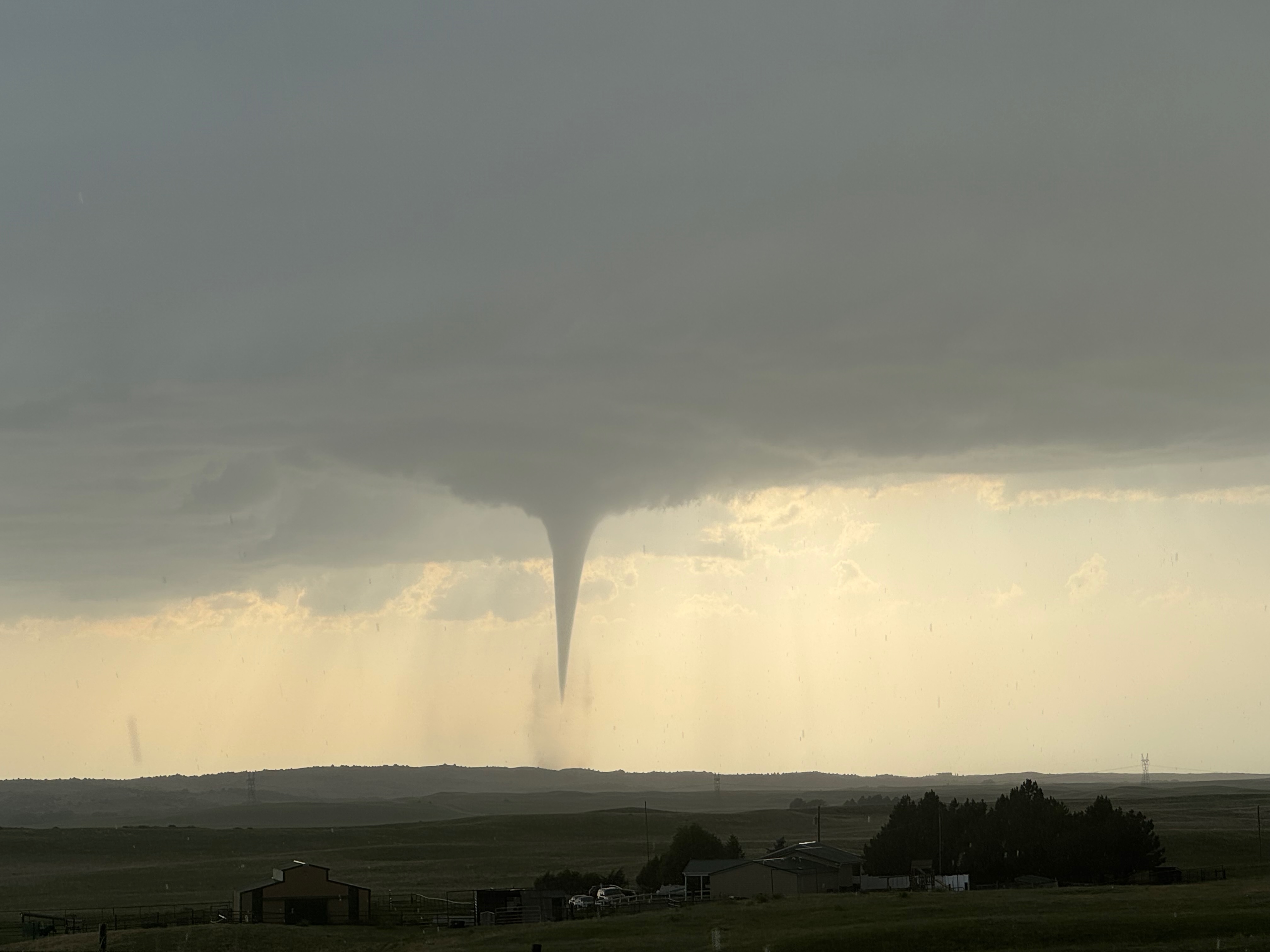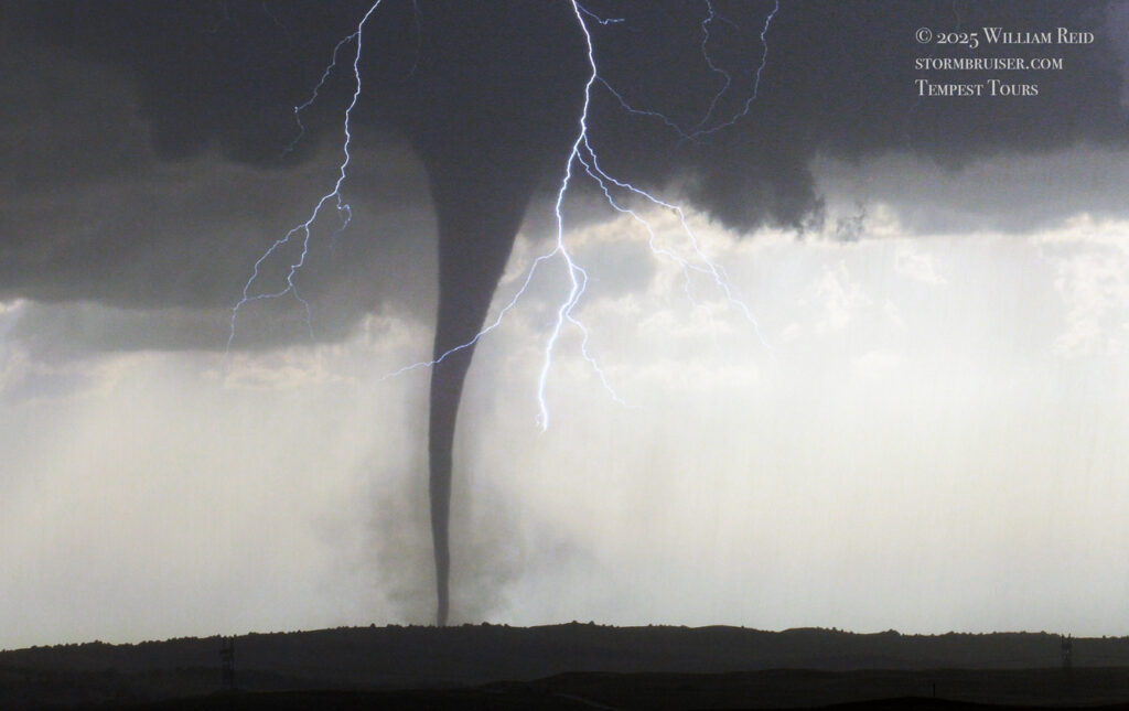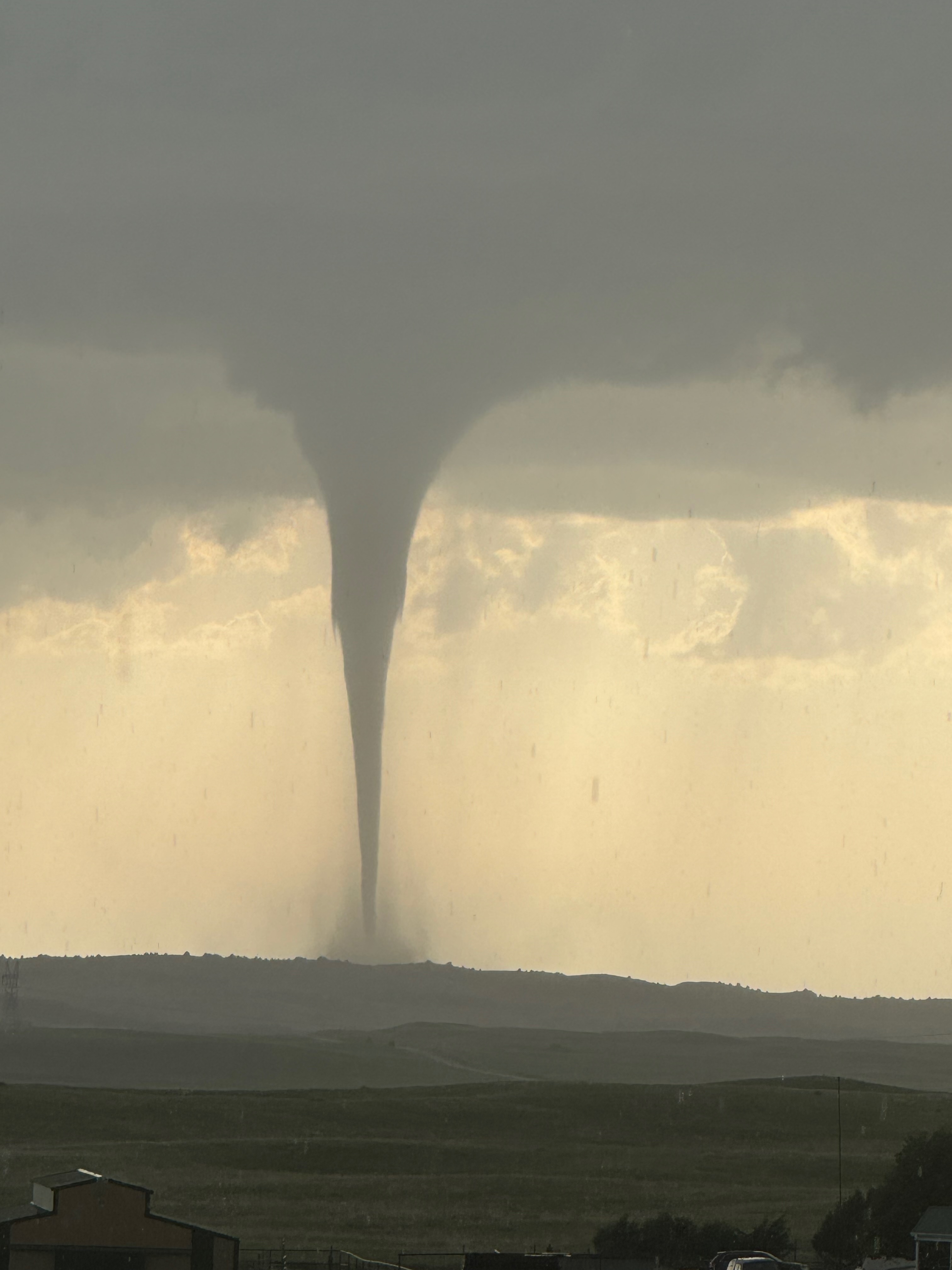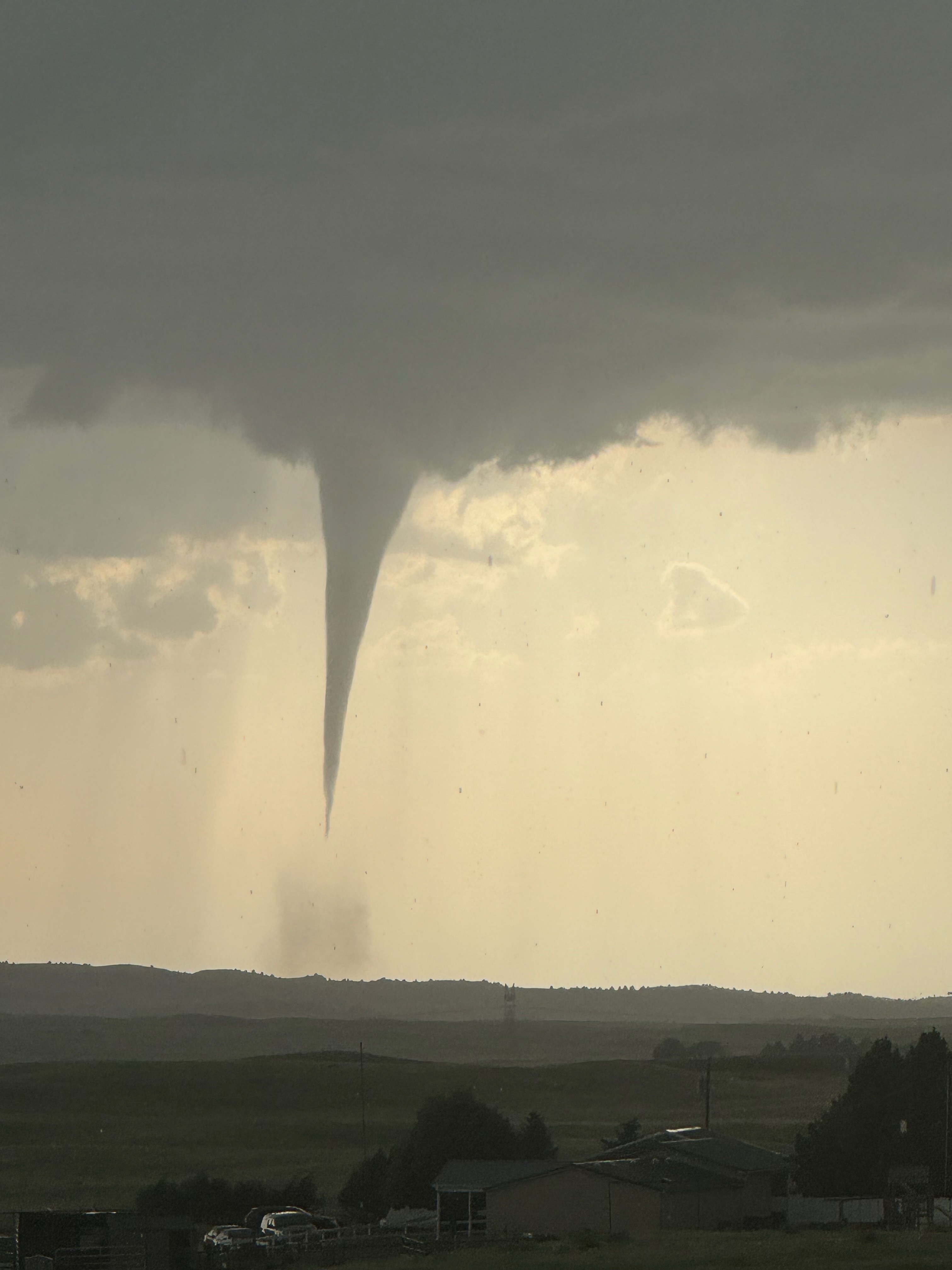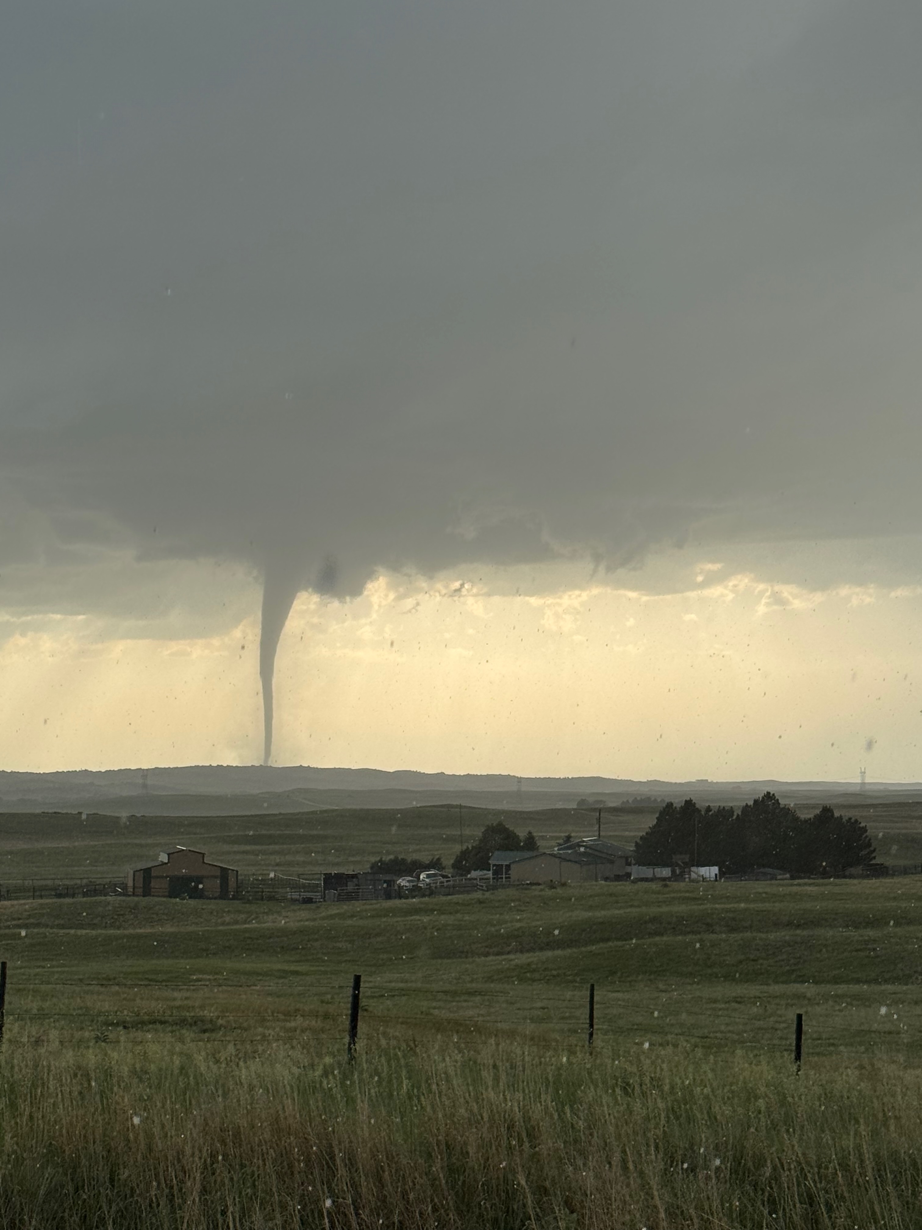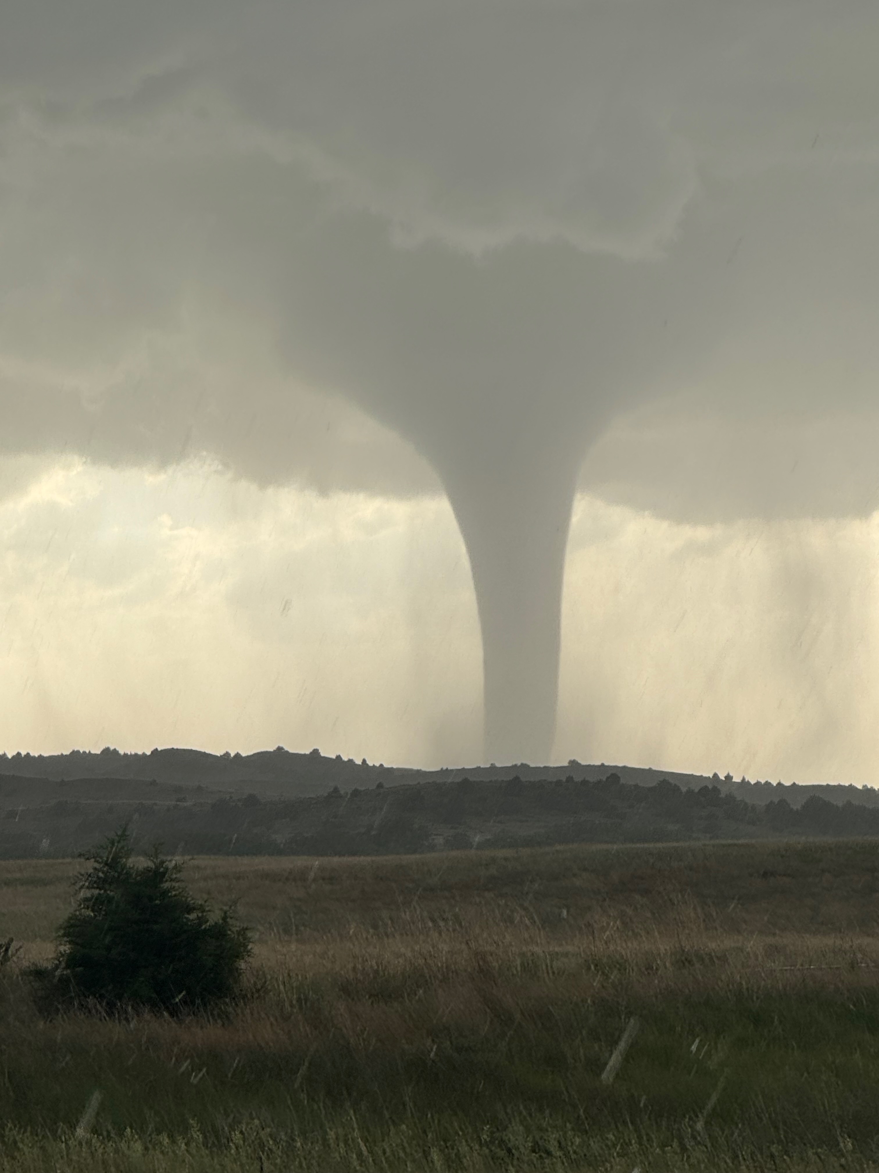 The final 17 images of the 30 above show “phase 2” of the tornado. When the initial “landspout” tornado dissipated, there was a lull of a minute or two with no tornado present from our vantage point (around 7:15 p.m. CDT). However, chasers close to the action along 23 reported a continuous circulation on the ground. A “second” tornado commenced quickly. It was very pretty and slender for quite a while. We were far enough away to have a really good view of the storm structure and the tornado, so I was shooting zoom and wide images on the iPhone. The contrast was very good with the sun behind the storm.