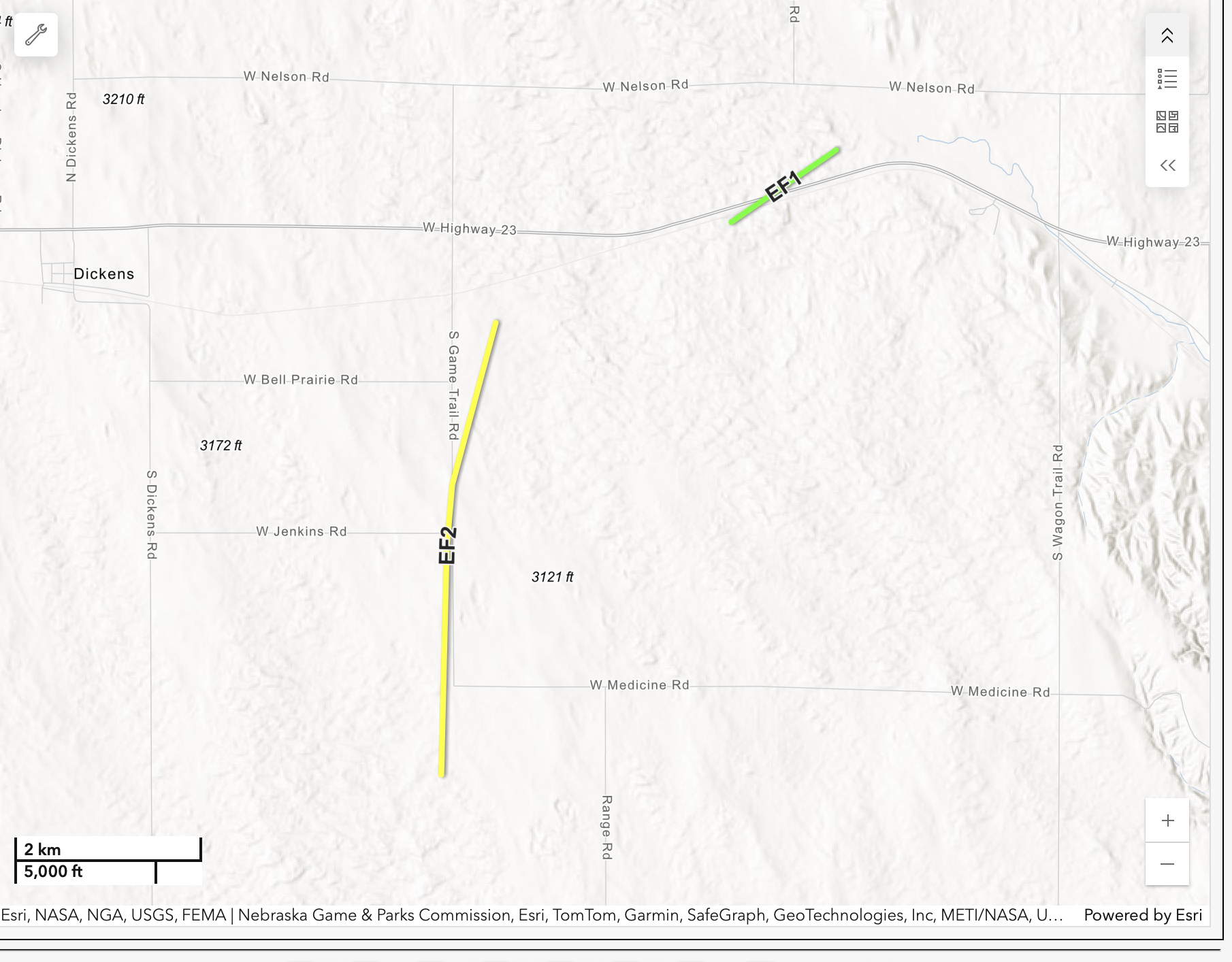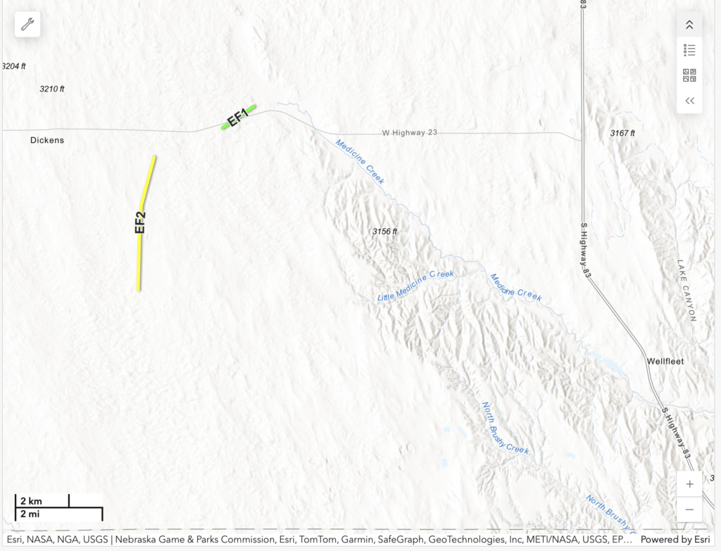 The map above, courtesy of NWS North Platte, shows the tracks of the two tornados in southwestern Lincoln County. The first tornado, the landspout, was rated EF1. The second one didn’t hit much and was rated EF2. A wider view (below) shows Wellfleet with respect to the tornadoes. Our primary viewing location was just SSE of where Highway 83 turns due north, NNW of Wellfleet.