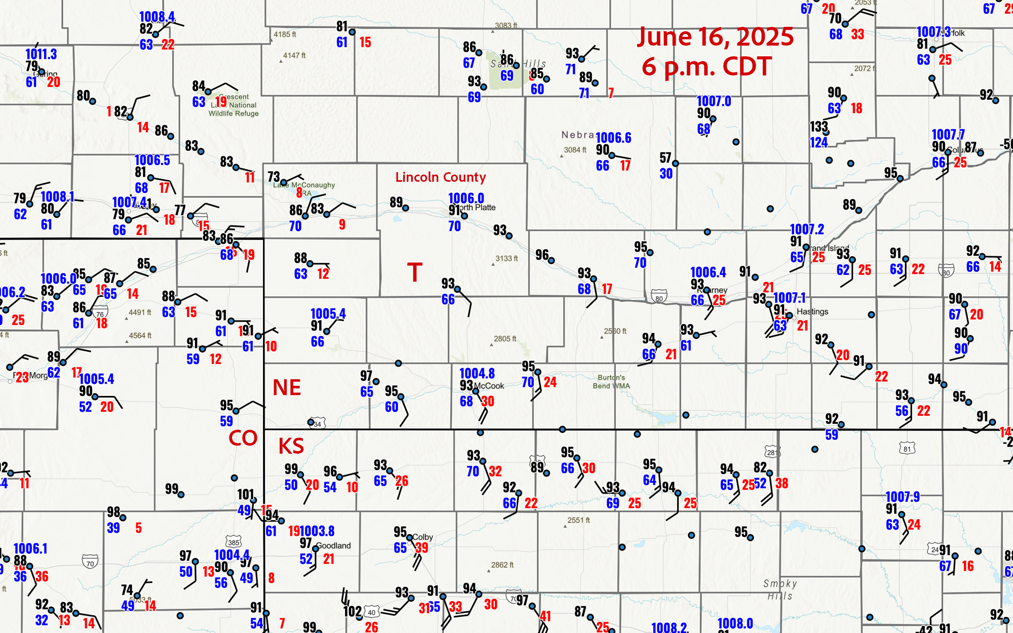 The surface observation plot above is for 6 p.m. CDT, just prior to the development of the storm near Wellfleet in southwestern Lincoln County (where the “T” is). The wind at North Platte has just switched to NW. It was calm the hour prior at North Platte, and was north at 10 knots at 7 p.m. The healthy and moist southeasterlies at McCook and Oberlin indicate the really good feed of high-octane air available to the Wellfleet storm. The supercell developed in an area of rather weak low pressure coincident with weak-to-moderate surface moisture convergence. Some weak convection was bubbling in extreme northwestern Kansas a little prior to 6 p.m. CDT and I was tempted to edge that way. That was in the hot air (99F at Saint Francis) and would have been very high-based, and would have had to move a county or two east or northeast to tap the really good low-level moisture.