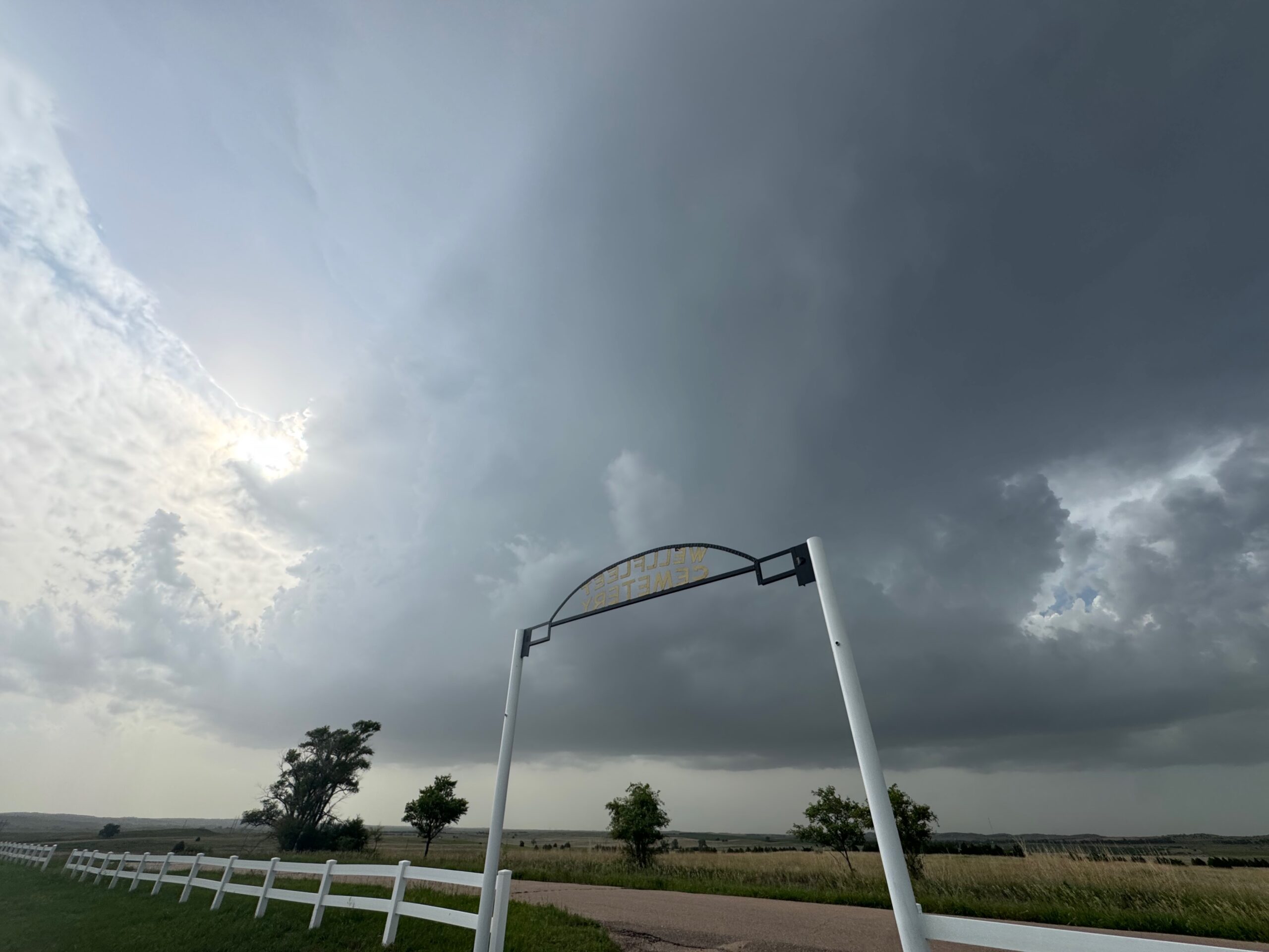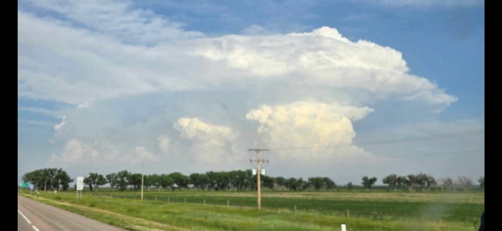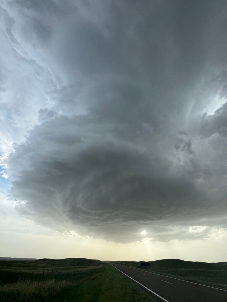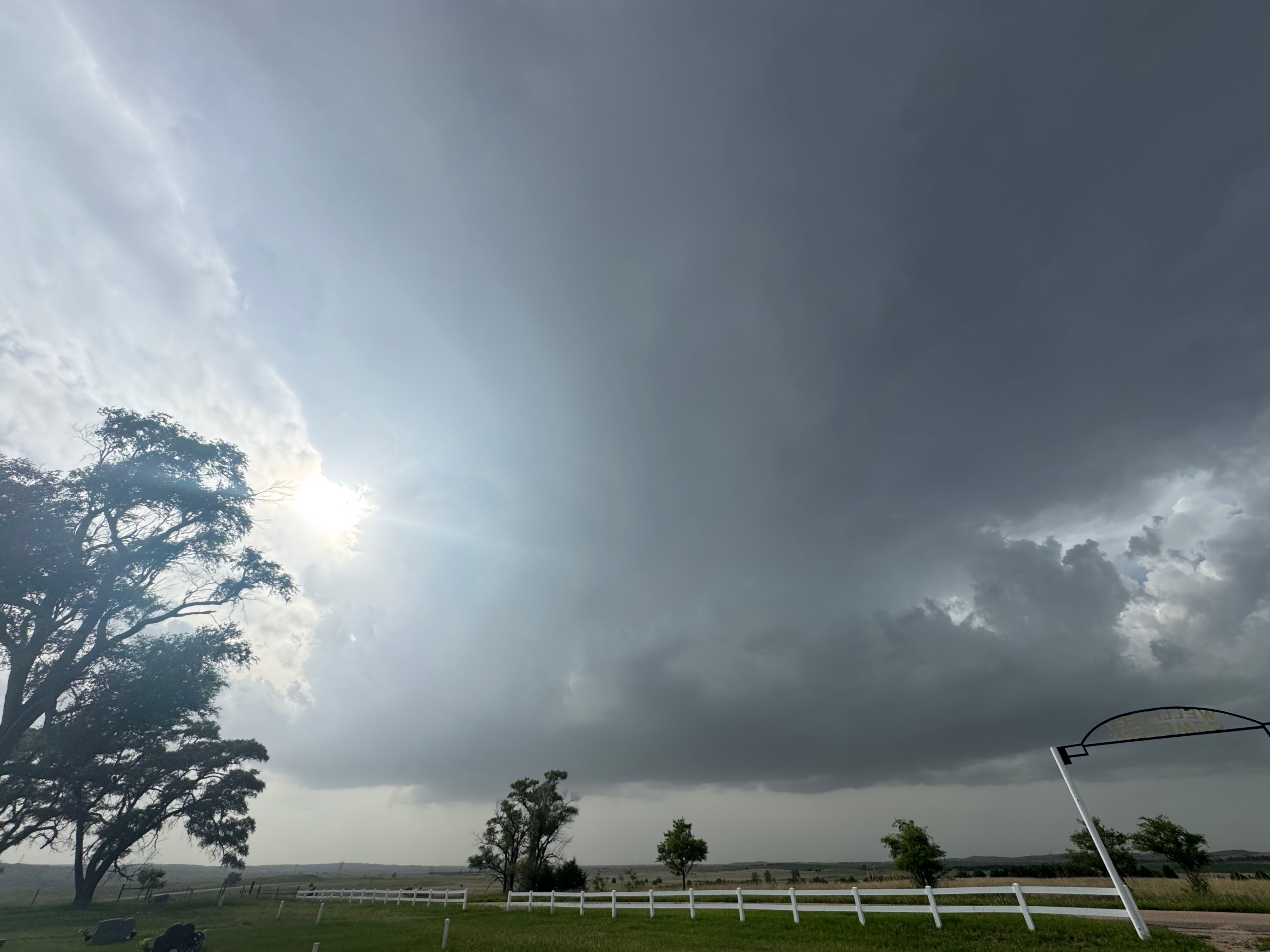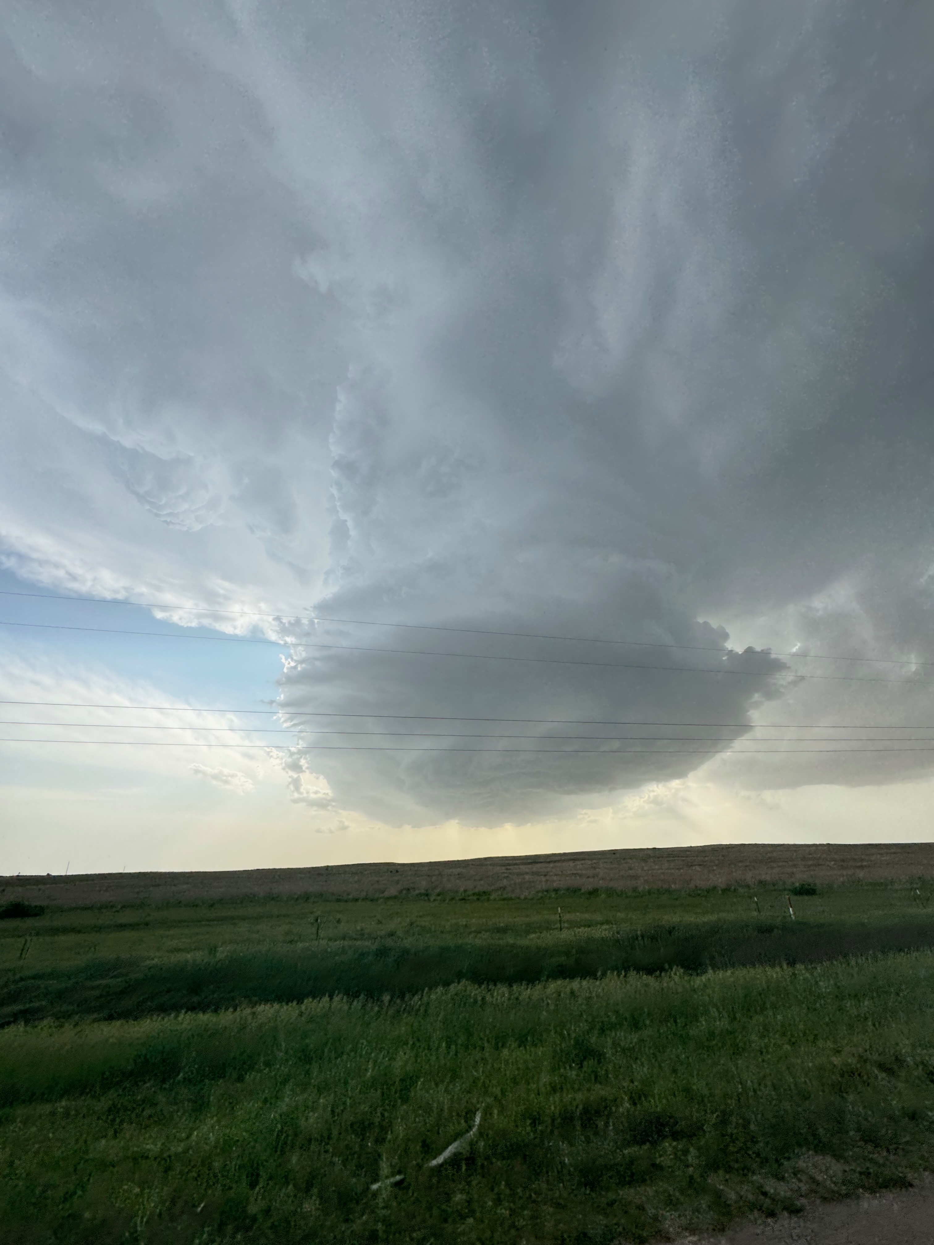 Around the time that we were approaching the storm base on Highway 23, Chris Gullikson shared his view of the storm with me, see image below. This was a very healthy storm! Chris and crew were still a good 30 miles or so distant, along I-80 and west of Sutherland. They would soon dive south from Sutherland to Wallace, and turn east on 23 towards Dickens and come up to the west/back side of the storm in time.