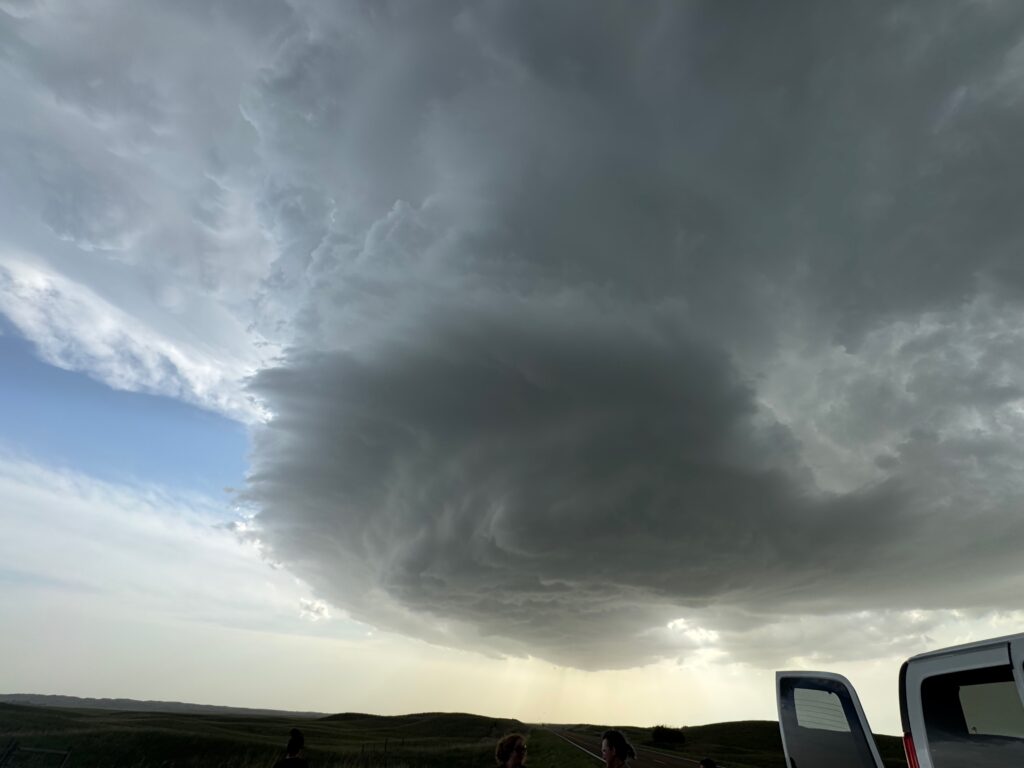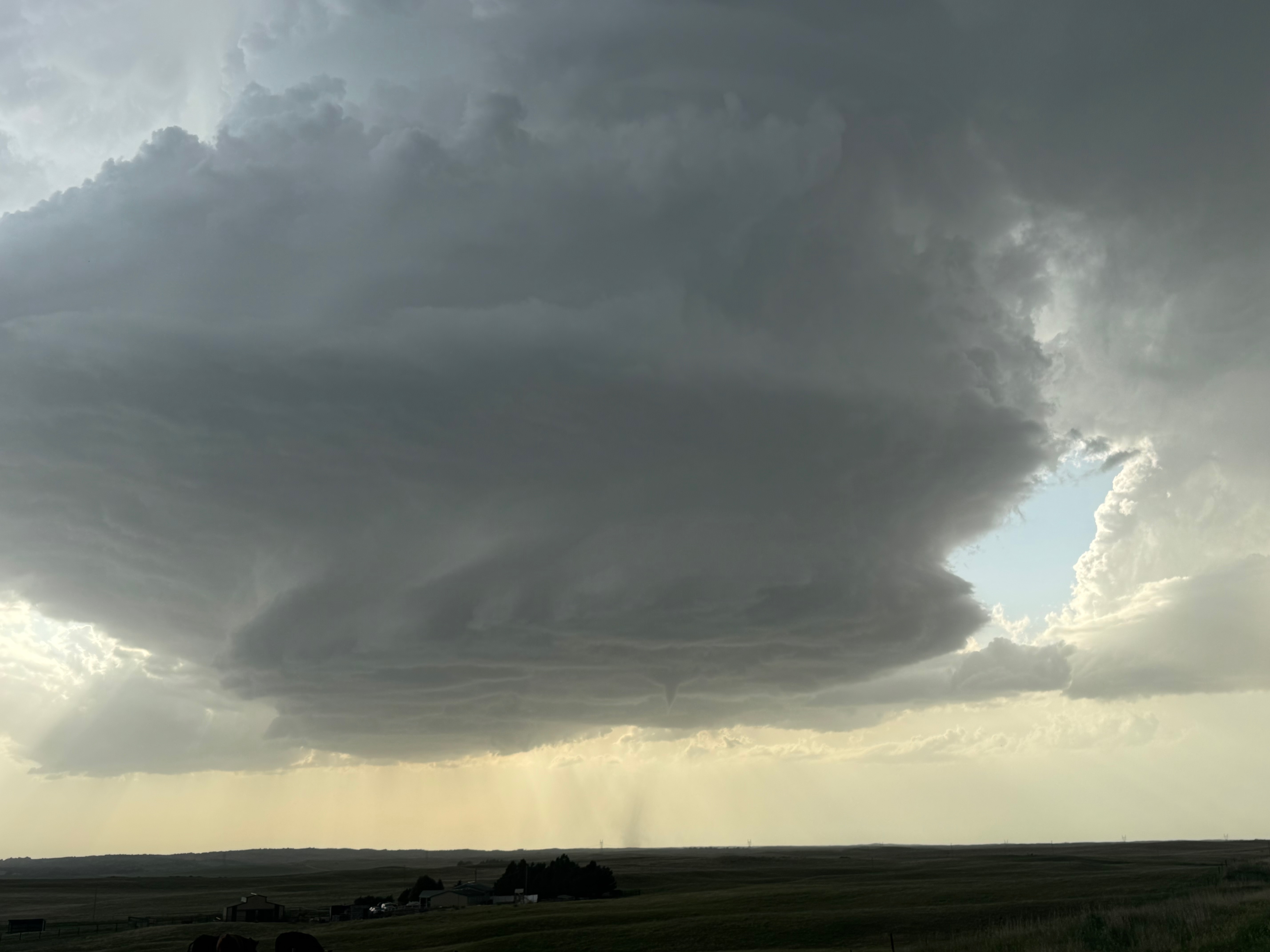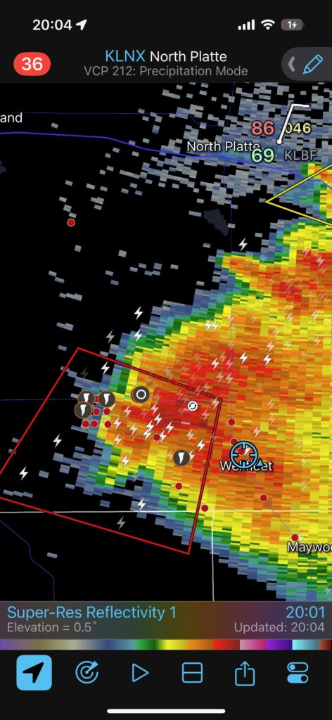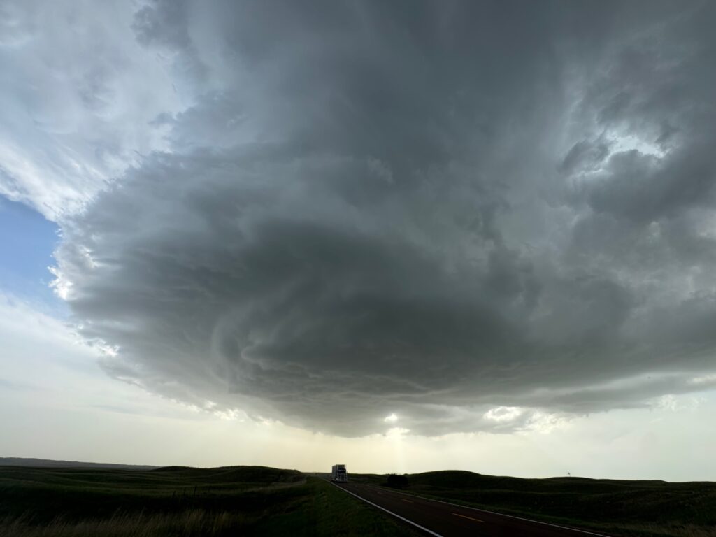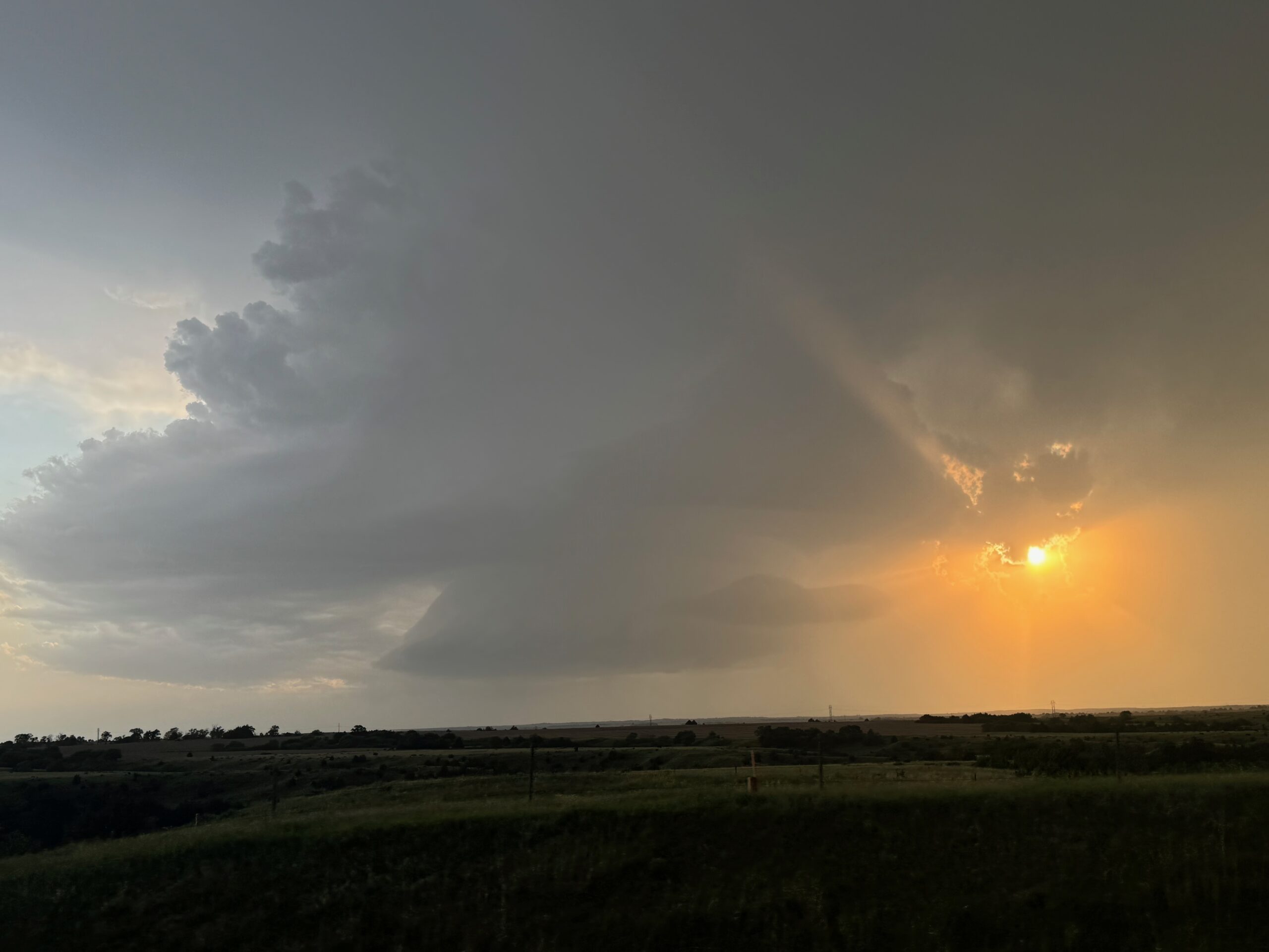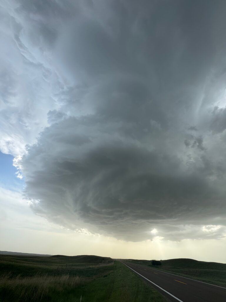 Around the time that we were approaching the storm base on Highway 23, Chris Gullikson shared his view of the storm with me, see image below. This was a very healthy storm! Chris and crew were still a good 30 miles or so distant, along I-80 and west of Sutherland. They would soon dive south from Sutherland to Wallace, and turn east on 23 towards Dickens and come up to the west/back side of the storm in time.