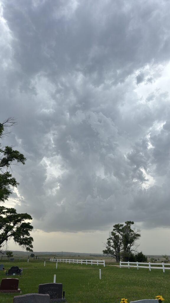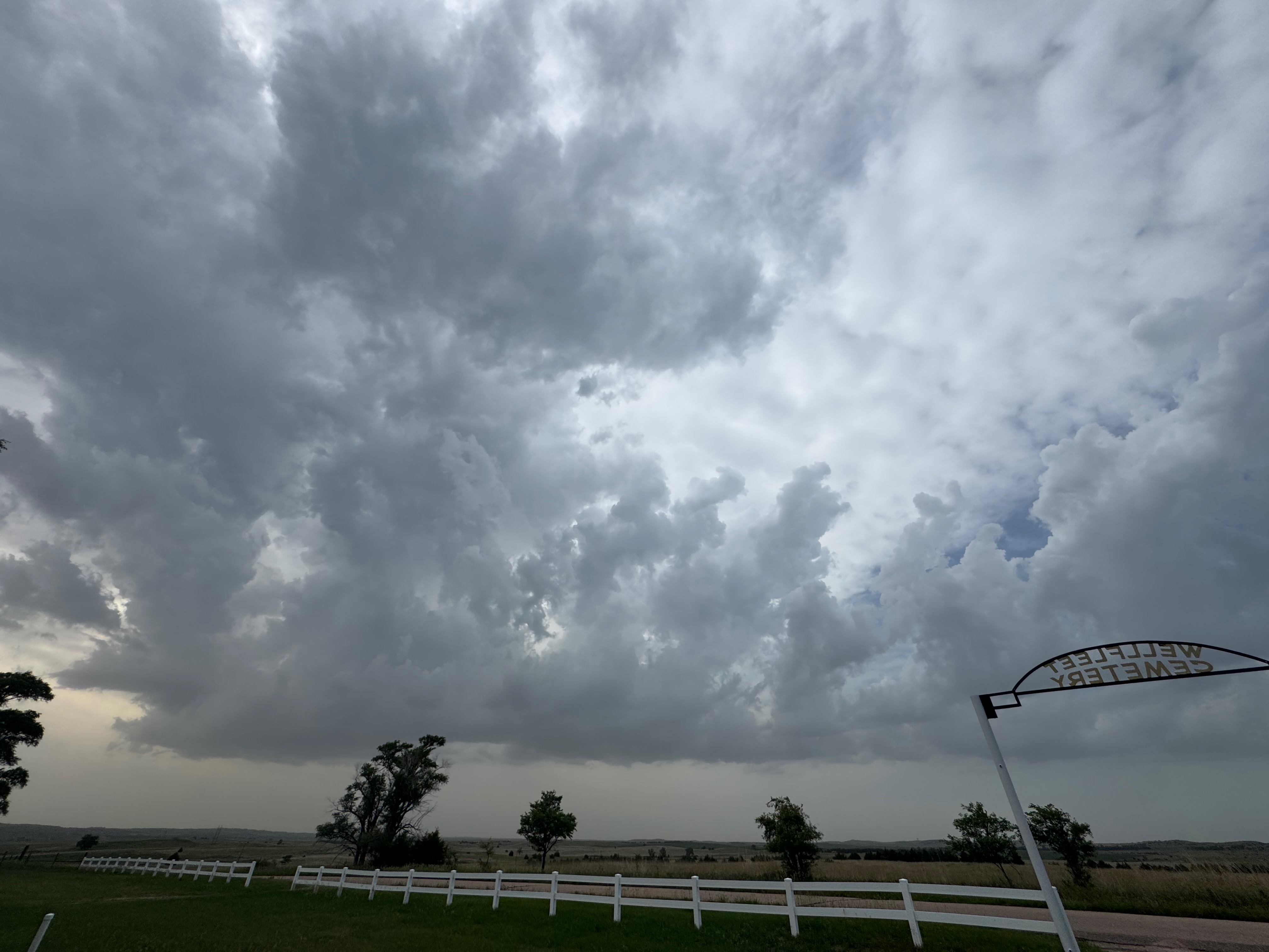 I was drawn further southward from North Platte in part because some convection was starting down towards extreme southwestern Nebraska and northwest Kansas, near Benkelman. That area was kind of a back-up plan. But the conditions required for a high-end supercell and a tornado were much, much better here in southern Lincoln County. The sky was murky and we could not see any distant towers. I stopped at the Wellfleet cemetery, some 25 miles south of North Platte. There was some mid-level cloudiness taking shape a little to the south, and this was moving northward. The group and I spent perhaps 30-40 minutes hanging out at the cemetery, and we watched a patch of mid-level altocumulus castellanus (accas) clouds become quite perky just to our southwest and west (see 3rd and 4th images below). I was not sure at all what might eventuate from this activity. But, some of the cloud towers were getting to be quite impressive. As these towers continued to move to the north, the cloud base on the most impressive tower lowered significantly. We had a storm! (See the last several photos below.)