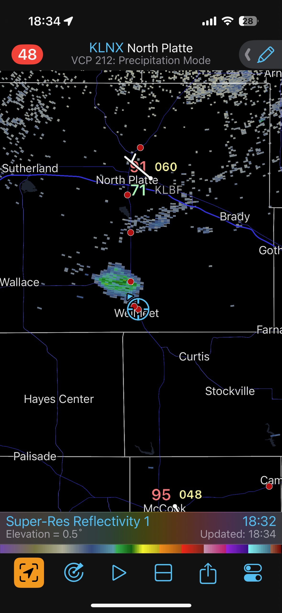 The final few storm photos above show a nice, flat, and relatively low base to our northwest. These shots were taken from the Wellfleet cemetery. The radar screenshot shows our location at this time, 6:34 p.m. CDT, and the first returns of light precipitation associated with the storm nearby. The new storm cell was moving to the north (seemingly), so we followed it up to Highway 23, just 5 miles away.