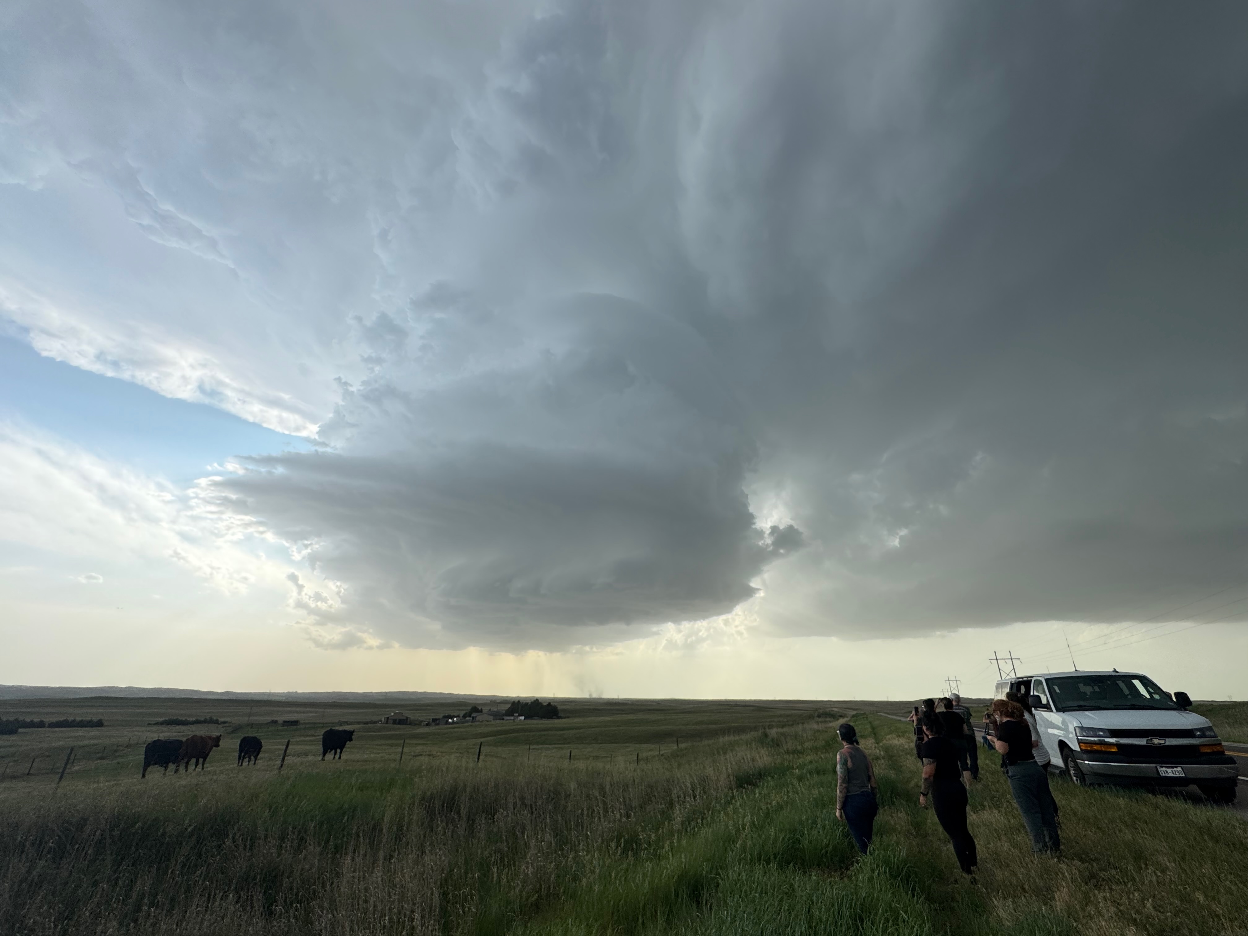 Our group awoke in Valentine, and it was clear that we had to scoot southward towards Thedford and North Platte to be near a subtle boundary that was slowly sagging southward through the Sandhills during the afternoon. SPC’s outlines generally favored areas along and a little north of I-80 in central Nebraska, showing just a 2 percent tornado risk but a 30 percent hatched hail risk in the southern portions of the Sandhills to I-80. Weather maps showed really high instability numbers in the North Platte area by late afternoon, as warm and moist southeasterly winds streamed in. Shear was more-than-adequate for a supercell should a storm form. This was one of those all-or-nothing chase days, where a bust was quite possible, but a very impressive storm might eventuate if the cap could be broken. All it would take was enough daytime heating and low-level convergence on the subtle boundary, where moist air was piling up.