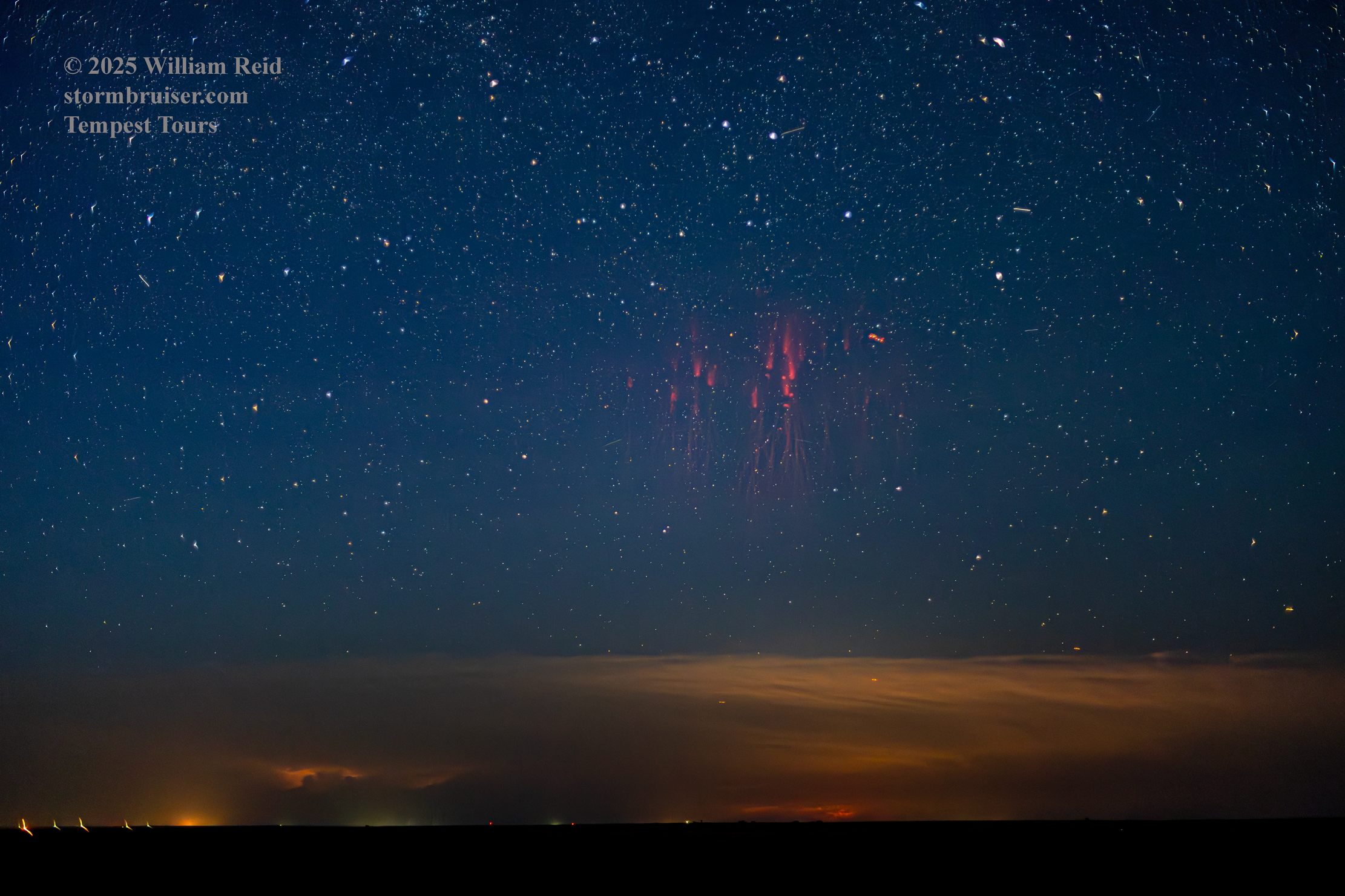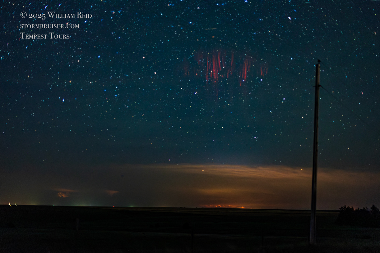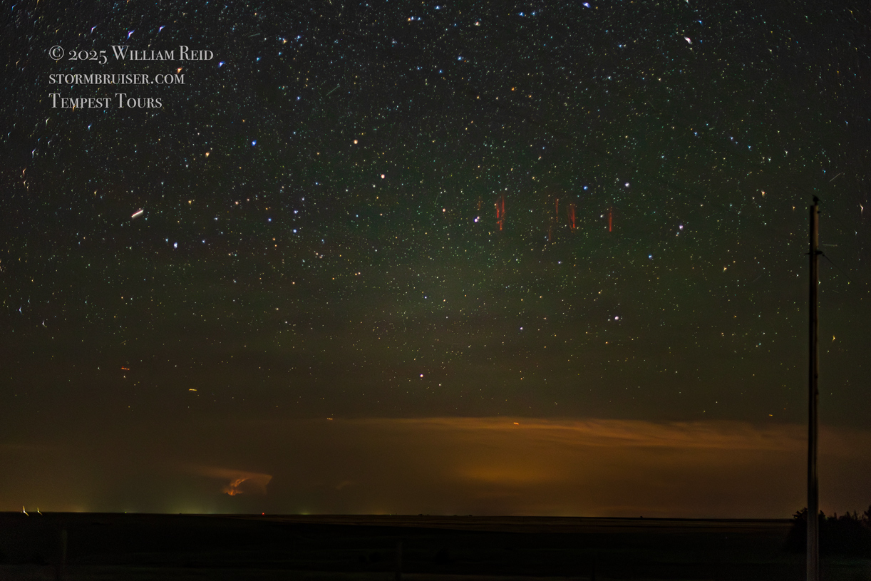 The chase on the 19th in western Kansas was rather low-end, with a couple of marginally severe and high-based storms to watch near Oakley and Oberlin. They fizzled towards sunset. We wound up east of Oberlin, with a view of a storm well to the northeast, near Burwell, Nebraska. It was about 140 miles distant. The thought occurred to me that it might be worthwhile to try to photograph sprites above the storm once it got dark, around 10:30 p.m. I did a quick search online as to how to do this. It was best if the storm was about 100 to 200 miles away, so that was good. There were no intervening clouds, there was little or no light pollution about 7 miles north of Oberlin, and there was no moonlight. The dew point was near 60F, so there was a slight haze. It was advised to use a fast lens of about 35mm focal length. I used my 50mm f1.4 lens. It was advised to shoot wide open, around 3200 ISO, at 3-4 seconds. I followed this advice!