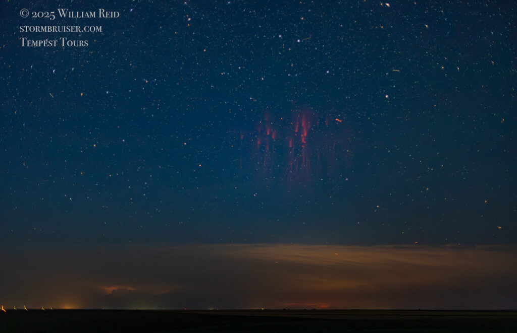 It finally got totally dark around 10:40 p.m., and the lightning in the distant storm was very frequent. Its cloud tops were near 60,000 feet above the ground. I kept shooting stills, and eventually one of the flashes in the cloud looked like a really fast and bright positive bolt. I checked the display on the camera, and there it was! I got another sprite maybe 20 minutes later. We quit after shooting for a little over an hour and after about 500 images were taken on my Canon R6.