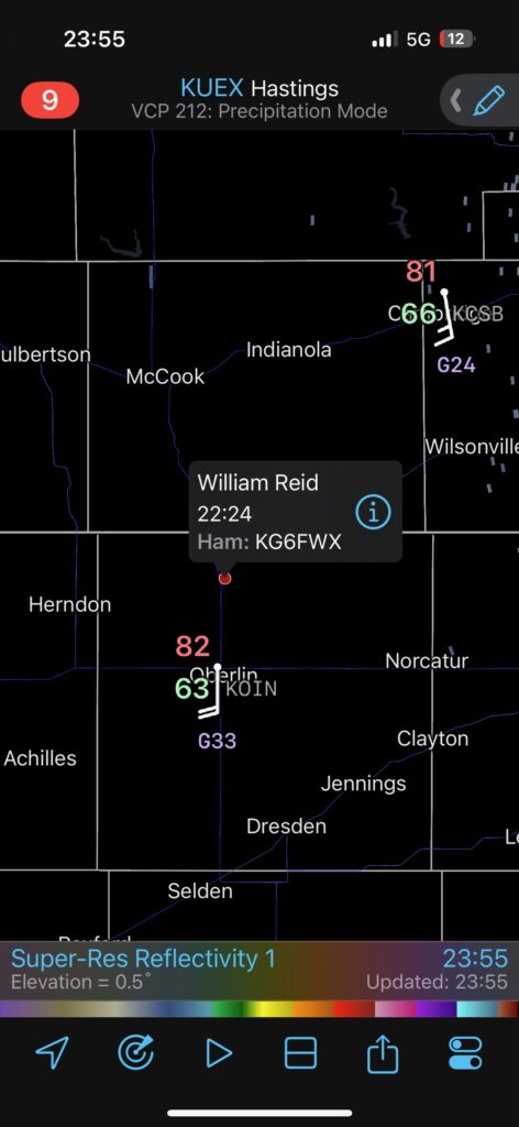 Pics 1, 2, 4 and 5 below are the sunset pics of the cell near Norcatur, KS, on the 19th. Pic 3 looks like a zoom of the very distant central Nebraska supercell, from U.S. 36 near Norcatur. And the radar screenshot shows our position for the sprite photography, north of Oberlin.