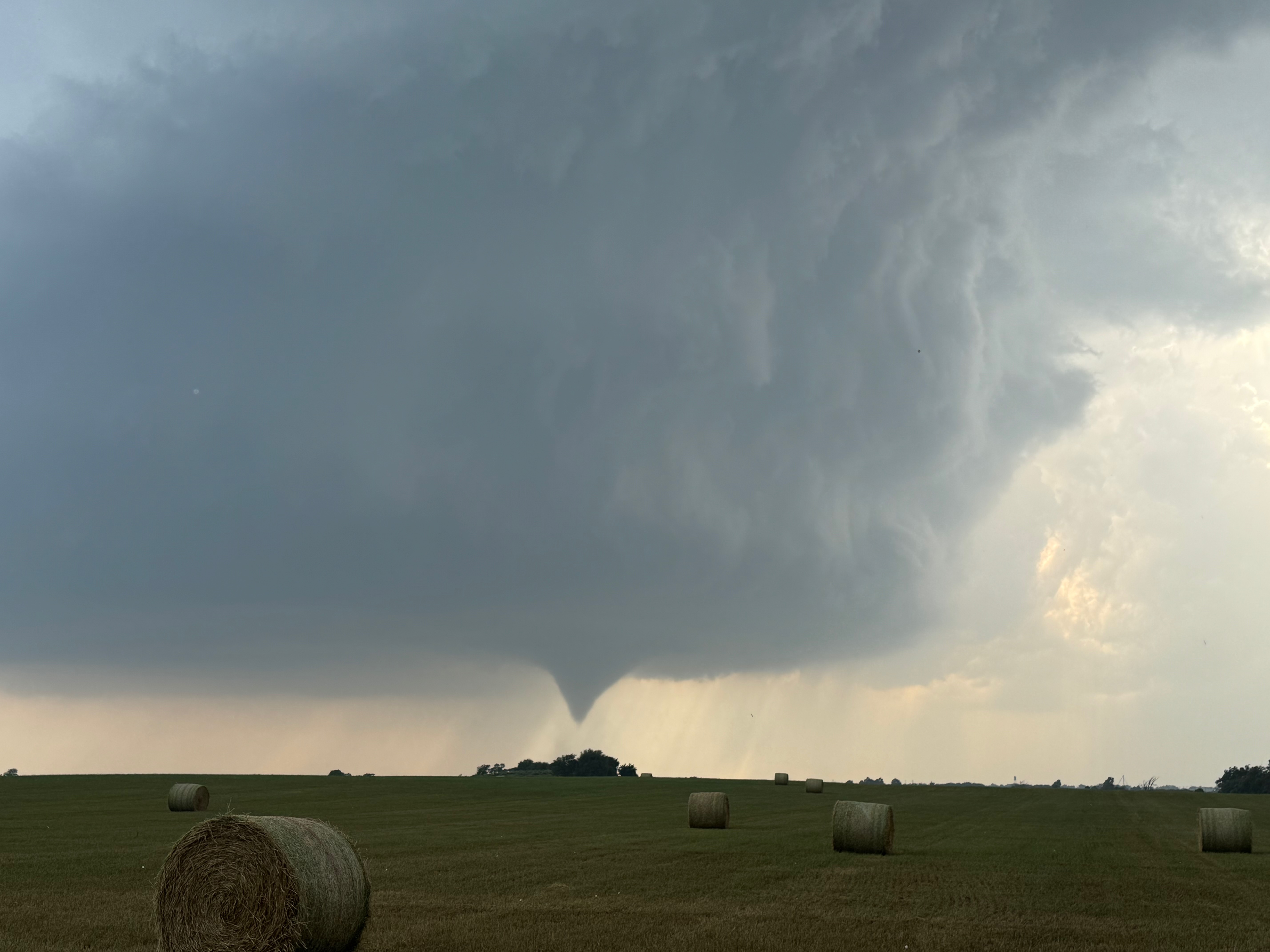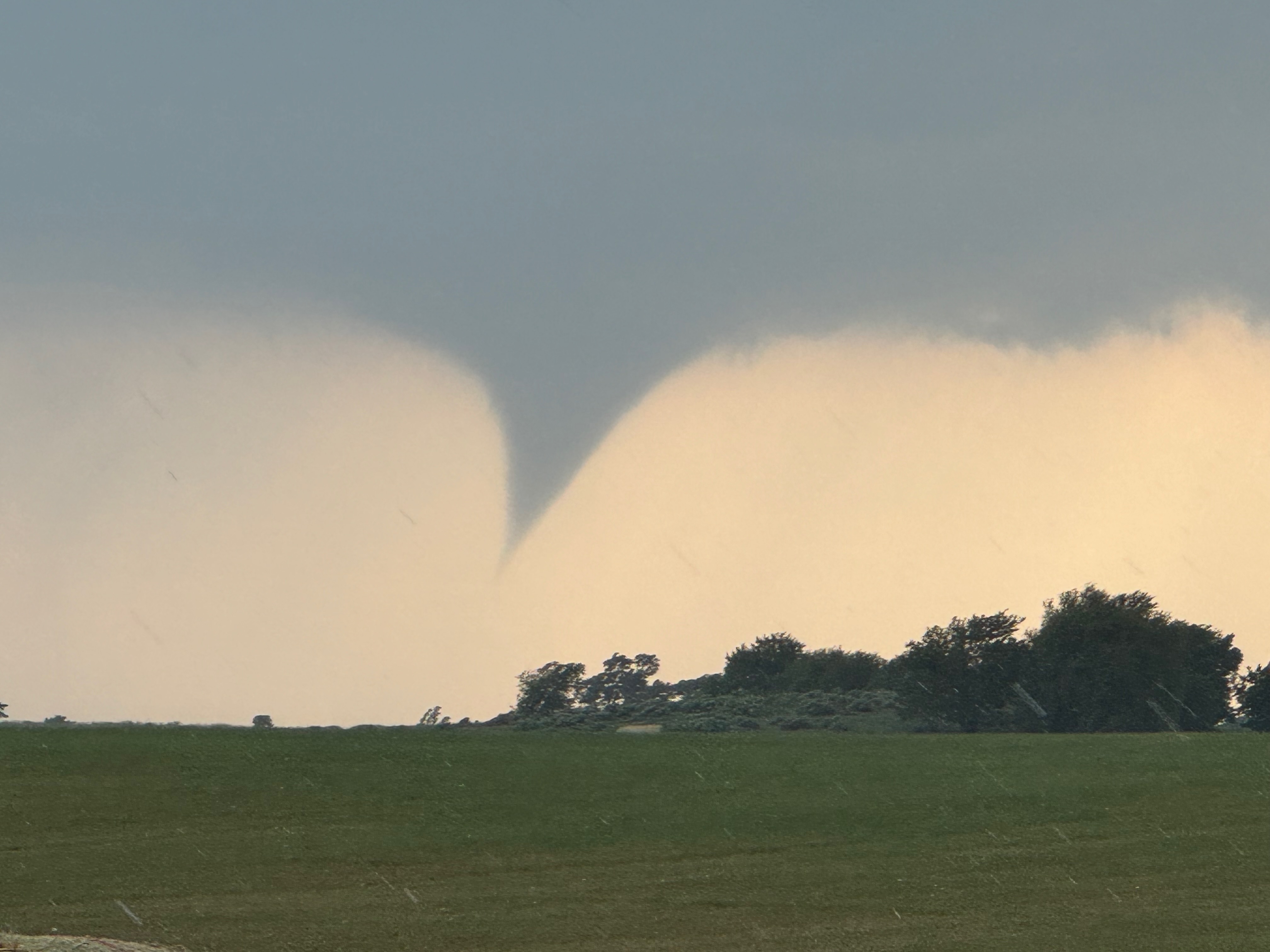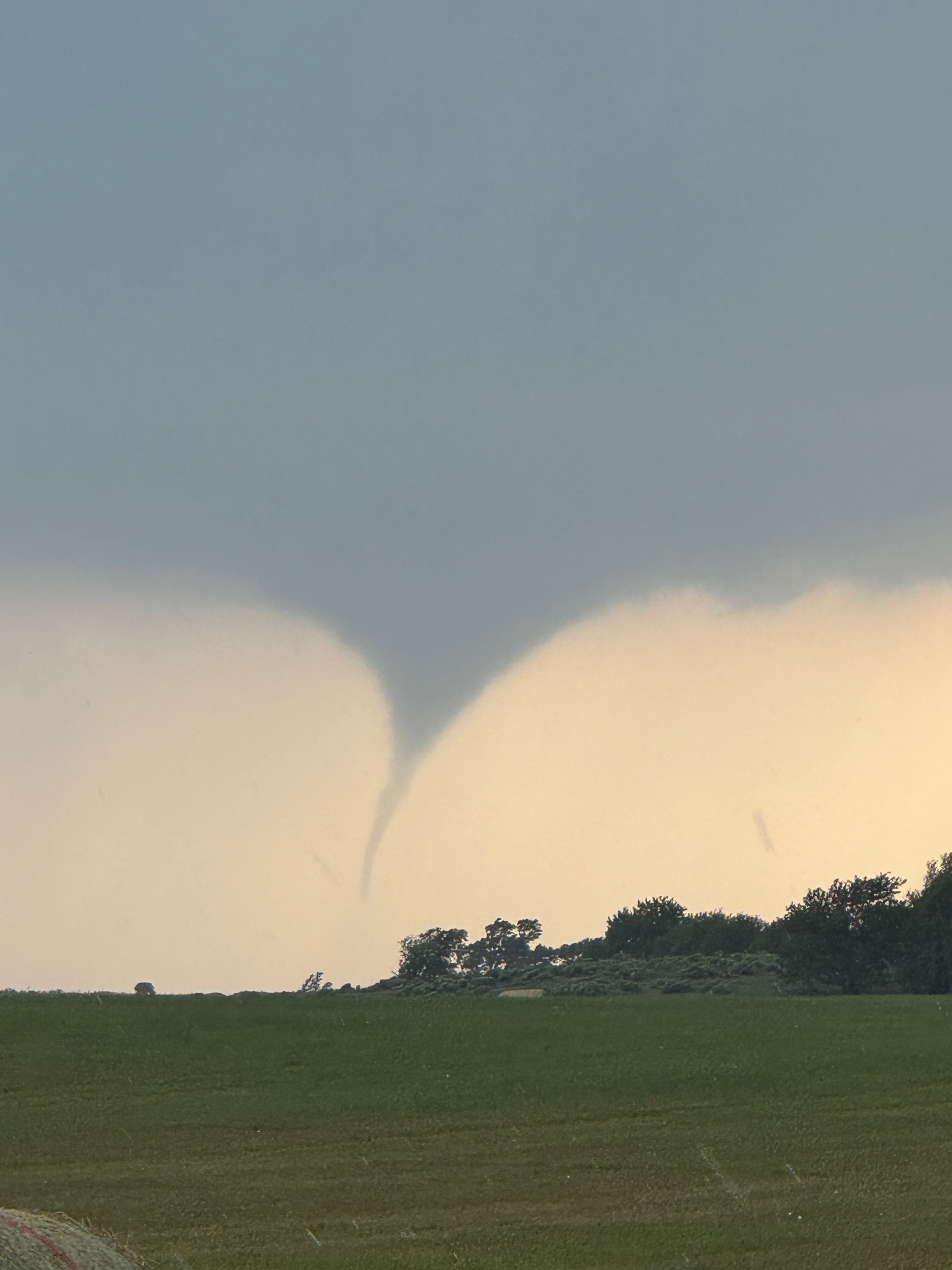 It was close to 5:30 p.m. CDT now (see radar grab above), and once again a slender tornado developed. This one persisted for several minutes at least, and the storm edged nearer. See pics below.