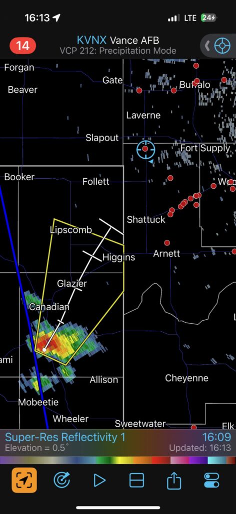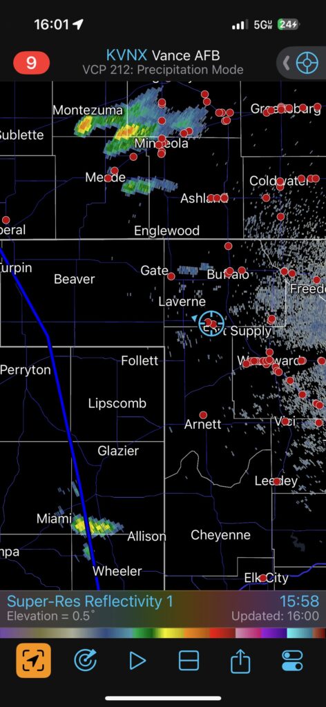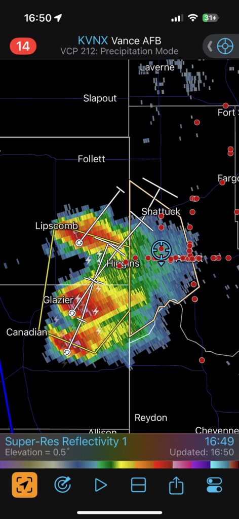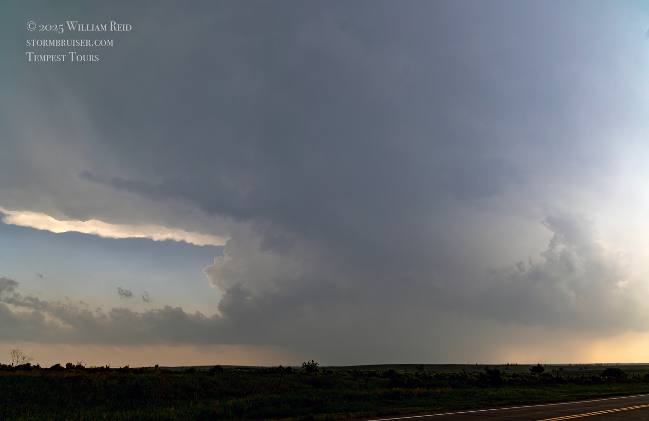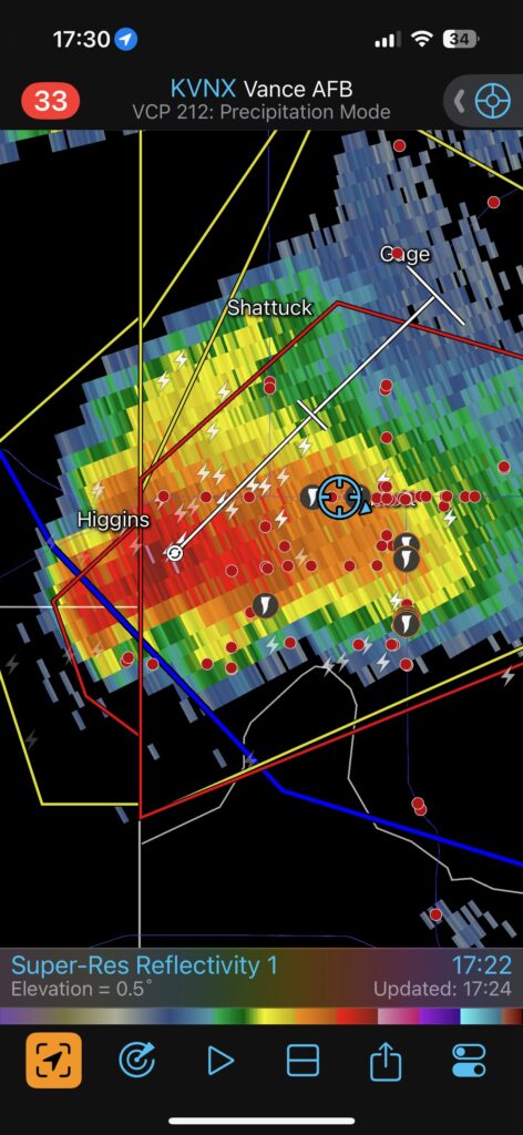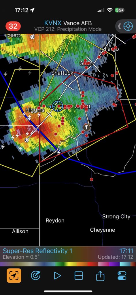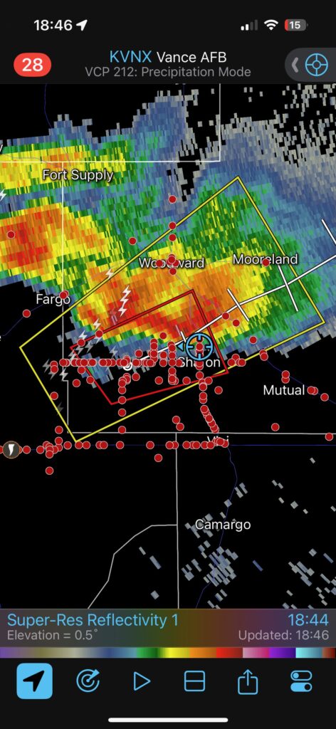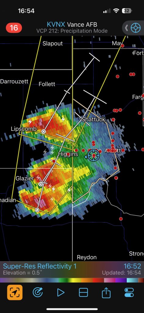 Yet again, our location was getting an annoying amount of rain and hail. This wasn’t exactly a surprise, since we were right underneath the storm’s anvil and in the path of the updraft base. The hail started to get uncomfortably large, around nickel-to-quarter size, so we shifted eastward once again. This time we went through Arnett and stopped maybe a mile or two east of town. I think we were a mile east of where 283 heads south again. The storm was moving more to the ENE versus the NE now, and the action area was still several miles south of U.S. 60., to our WSW.