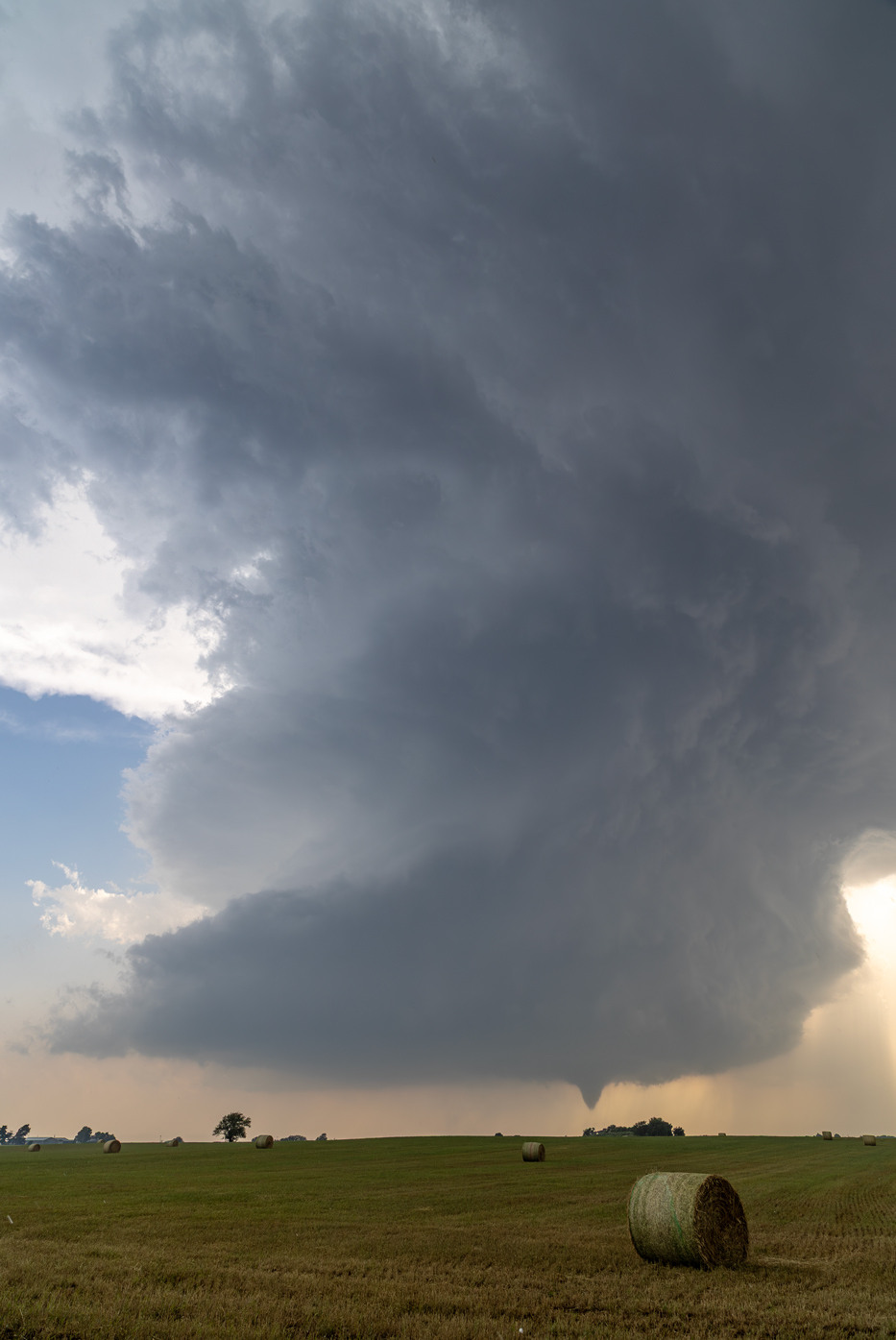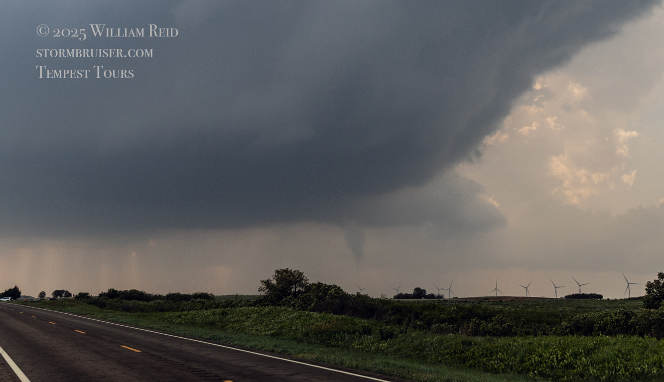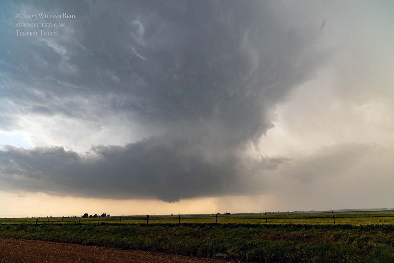 The first few photos show the updraft base without a tornado to our SW or WSW, around ten miles distant. A solid and persistent funnel cloud forms eventually, and a tornado is likely in progress as it moves behind a clump of trees. The wide-angle shots provide a great look at the sculpted and dramatic storm updraft.