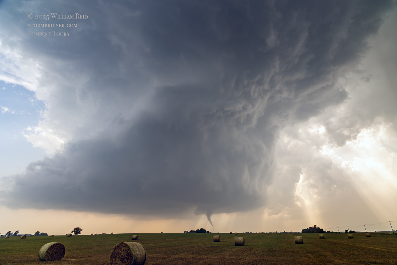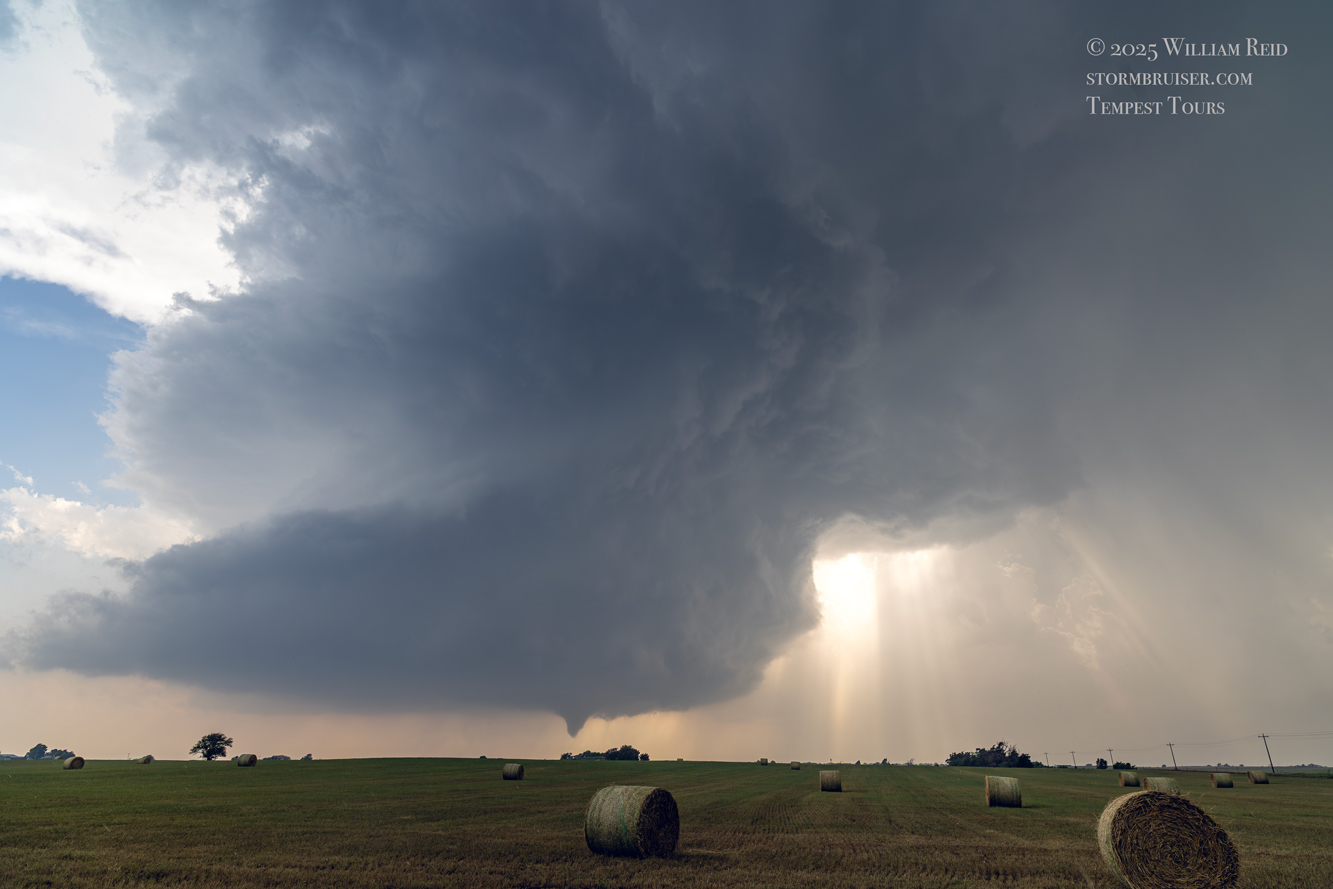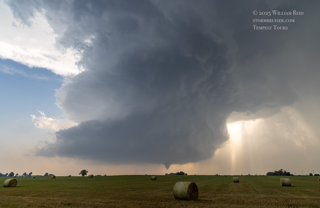 The first few photos show the updraft base without a tornado to our SW or WSW, around ten miles distant. A solid and persistent funnel cloud forms eventually, and a tornado is likely in progress as it moves behind a clump of trees. The wide-angle shots provide a great look at the sculpted and dramatic storm updraft.