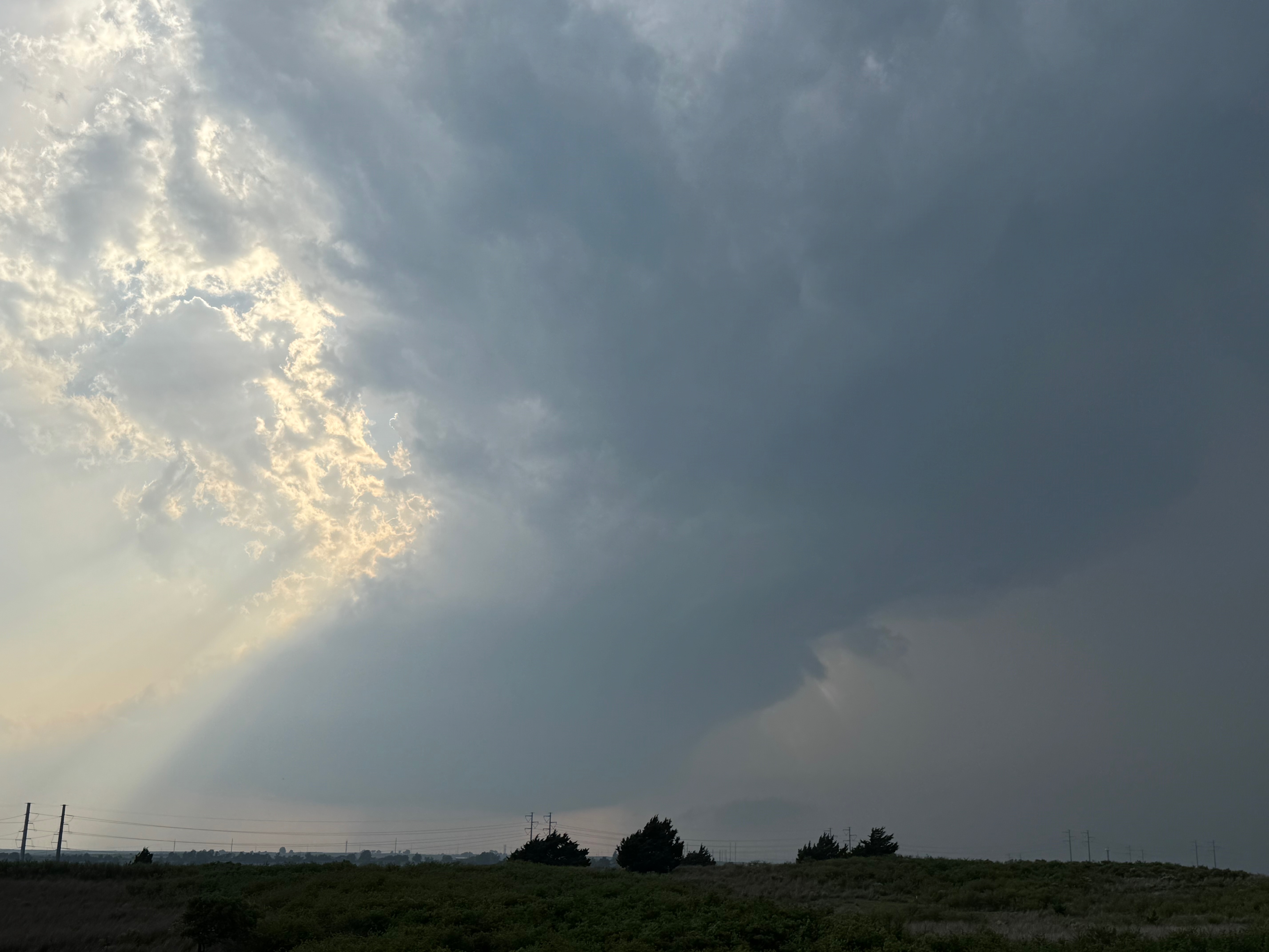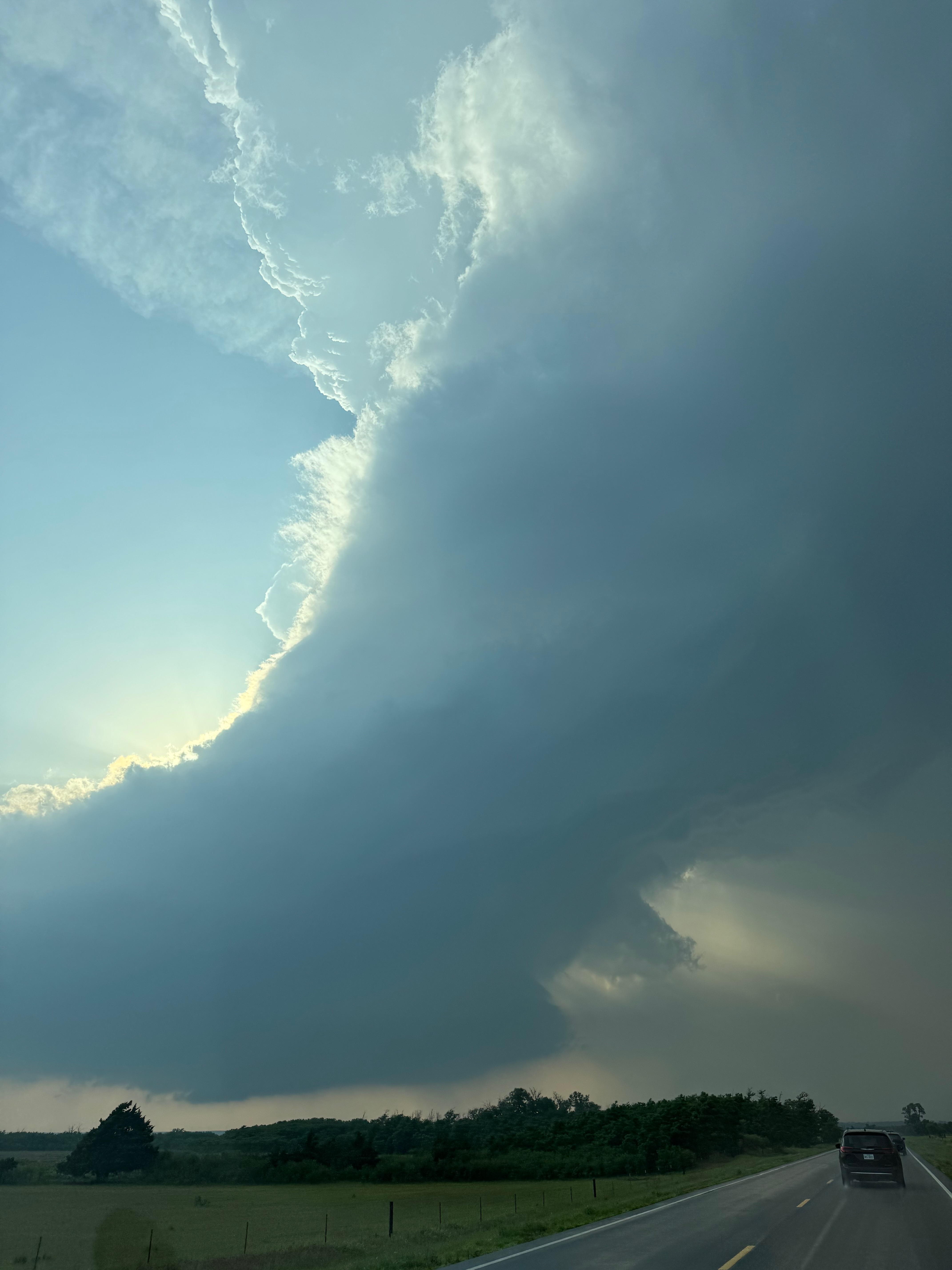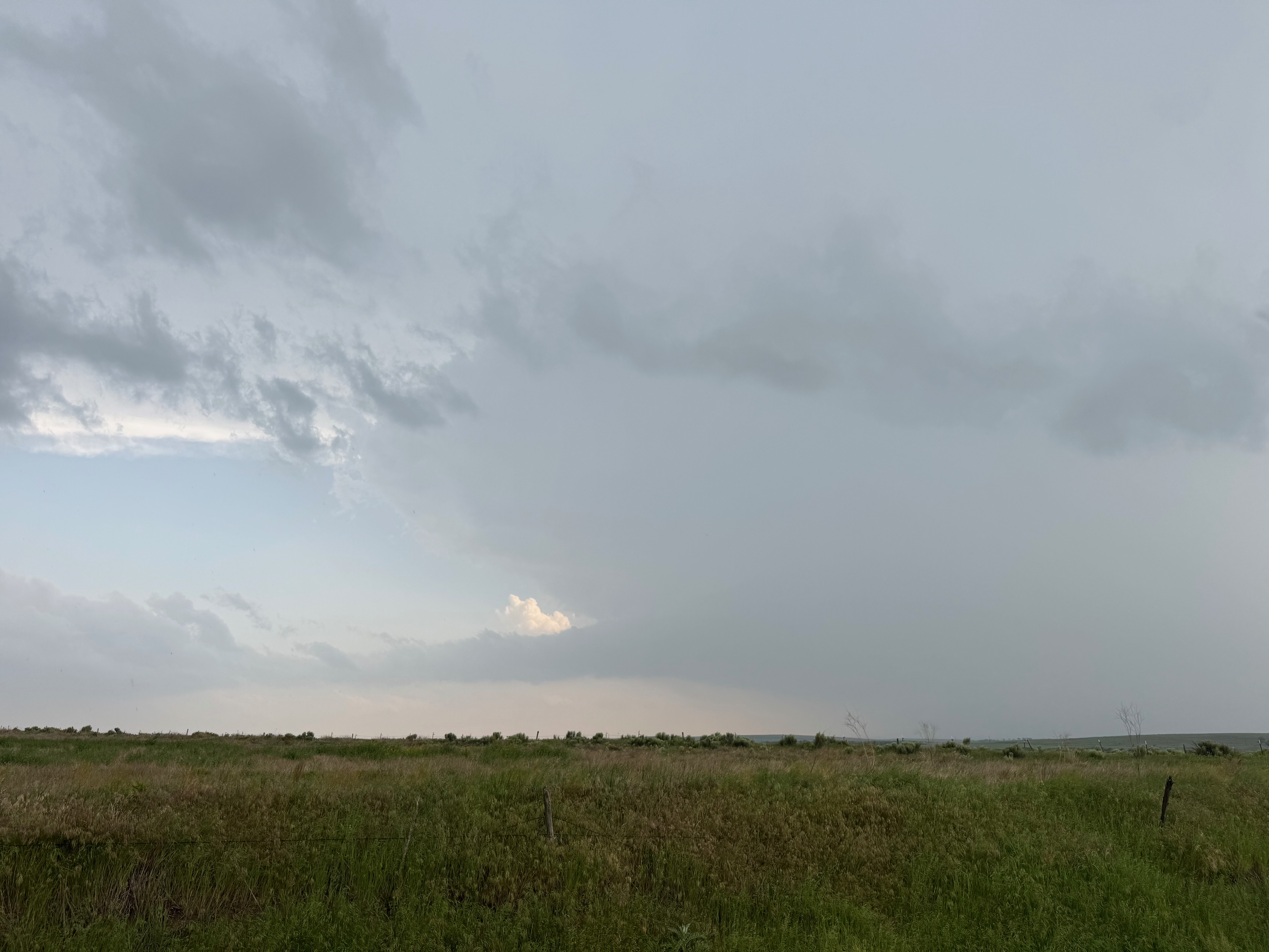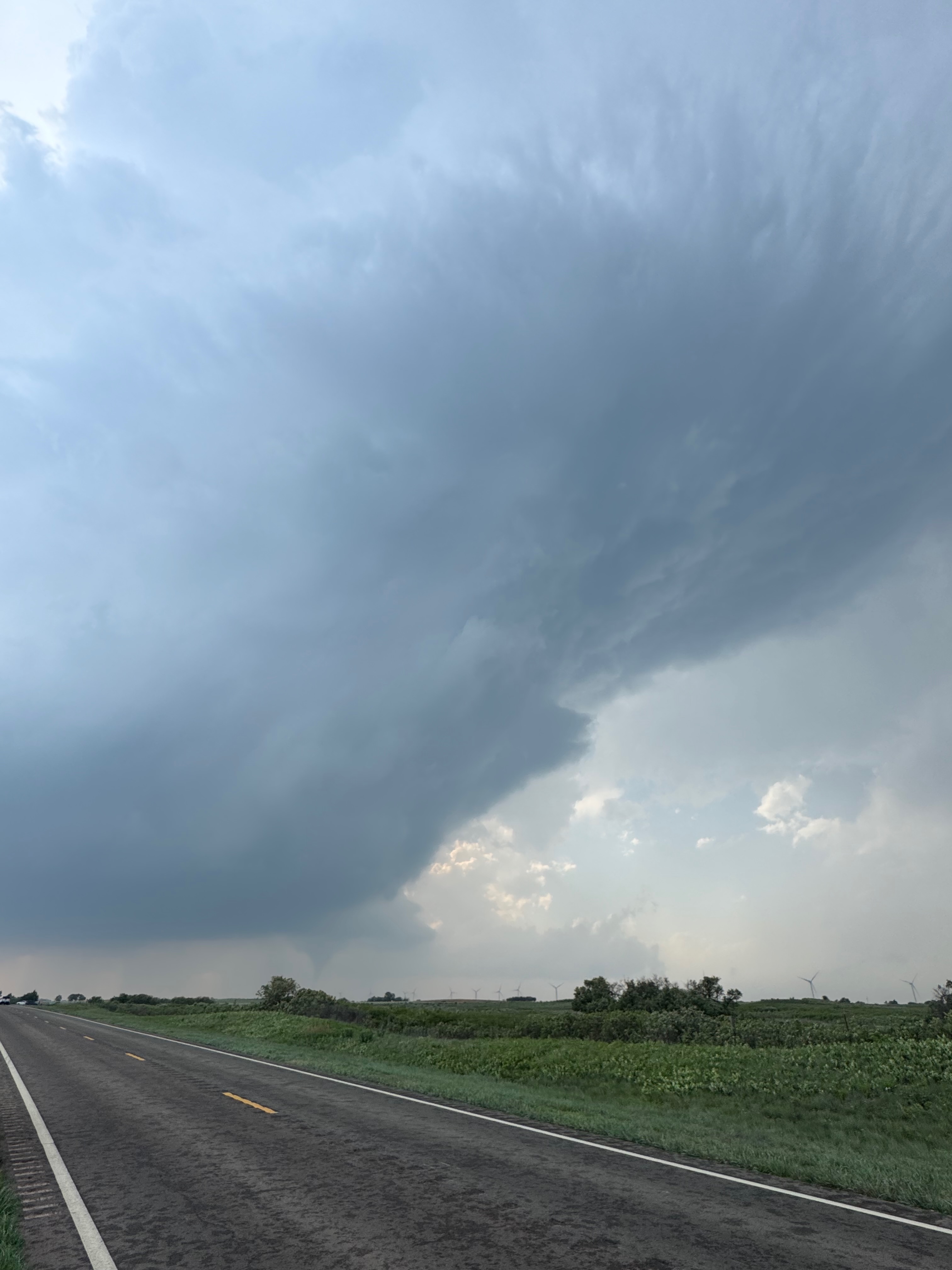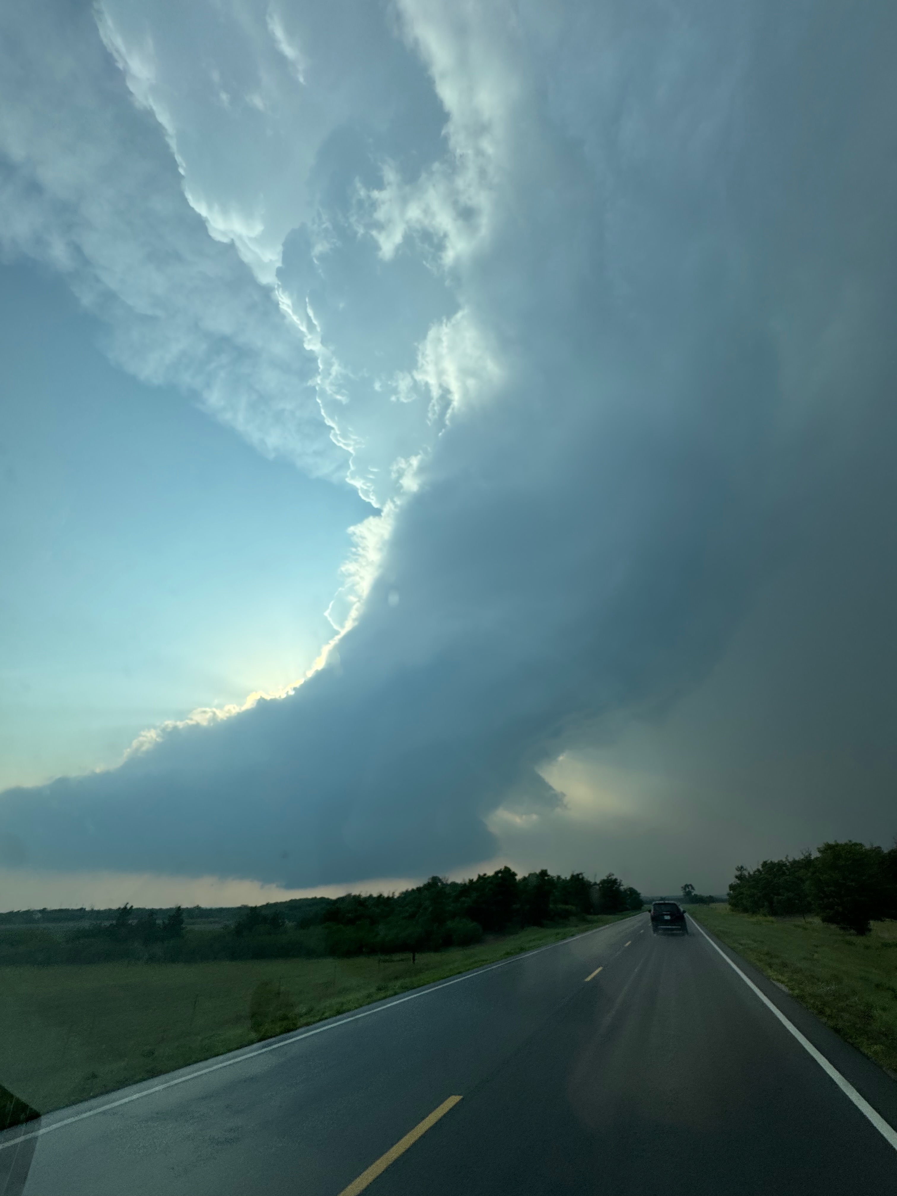 We were moving quickly east again once this most-recent tornado was done, and about a half hour later we were north of Vici on 34, east of the supercell, and looking for a decent high point in these hills to watch its approach. As far as I know, the storm did not produce another tornado during this repositioning. The iPhone images below show the storm when west of Sharon and later near Mooreland.