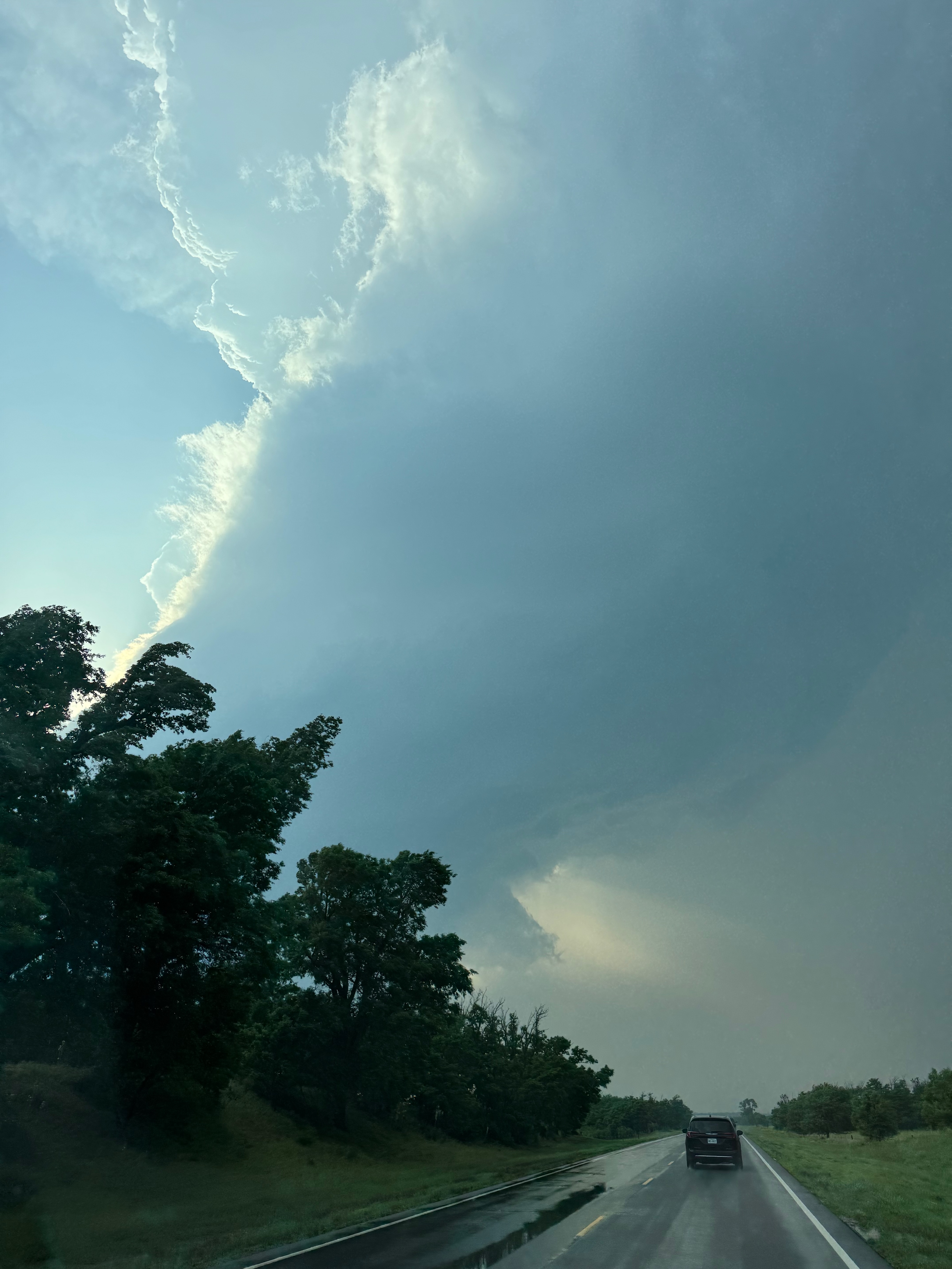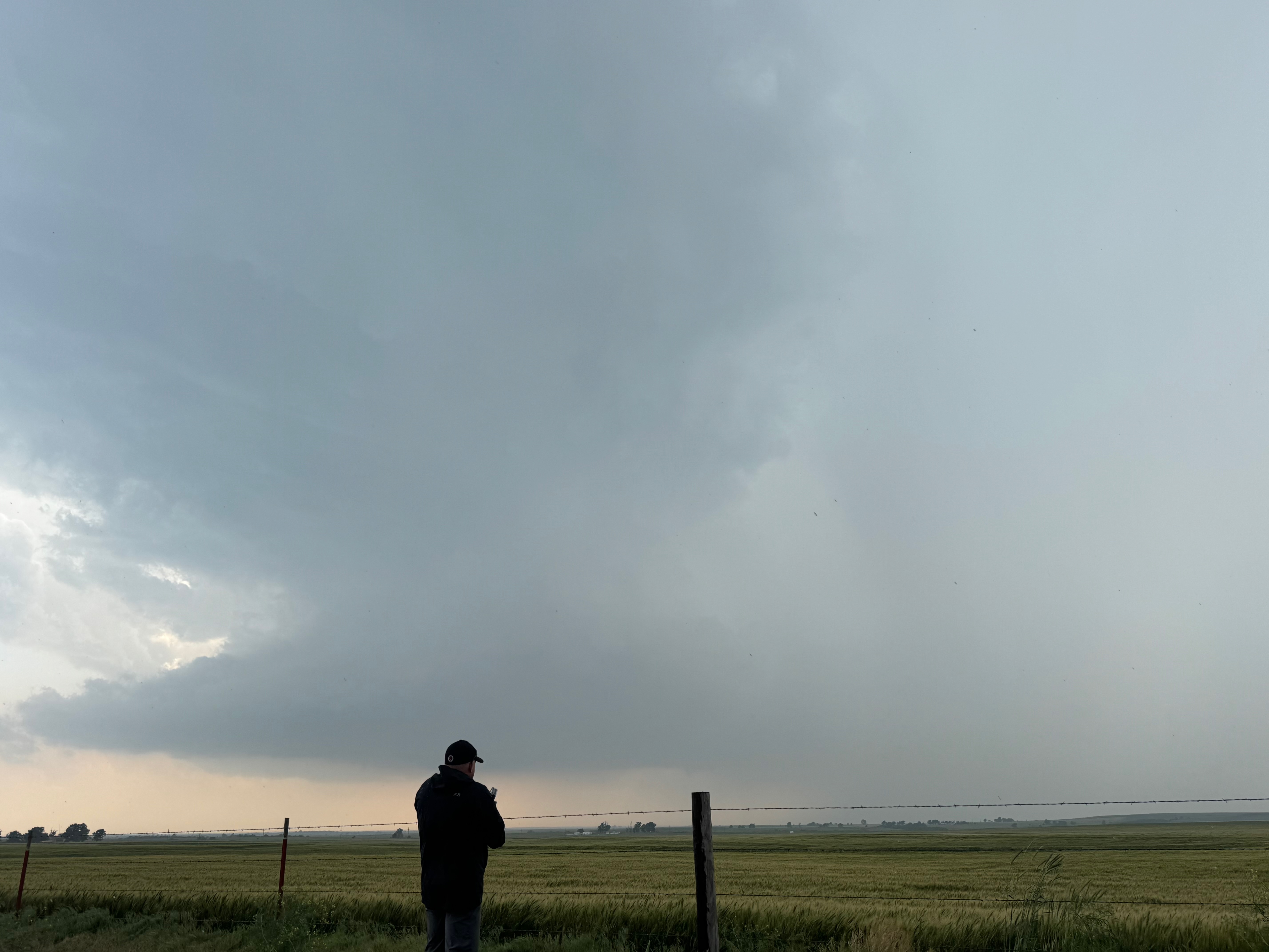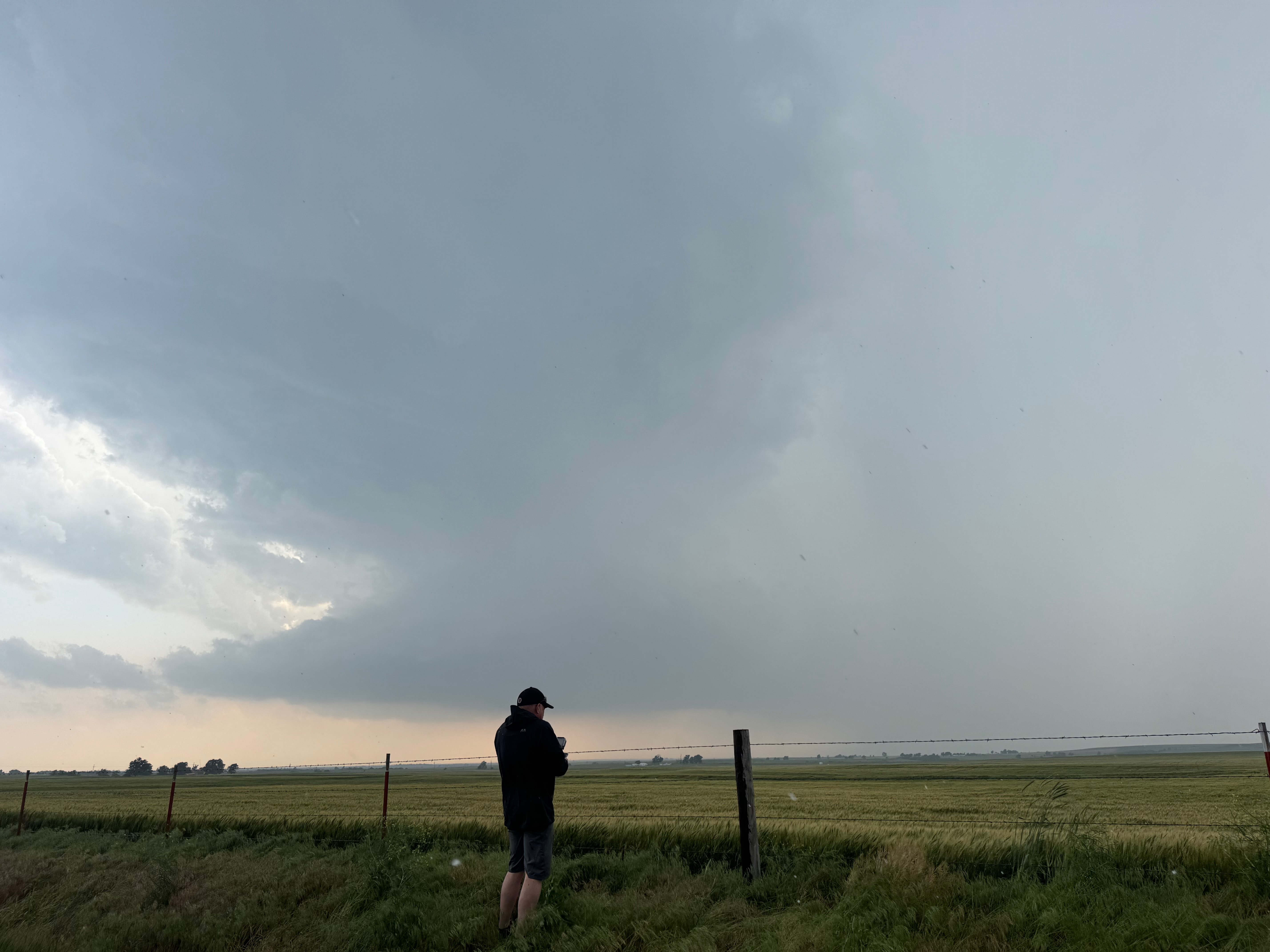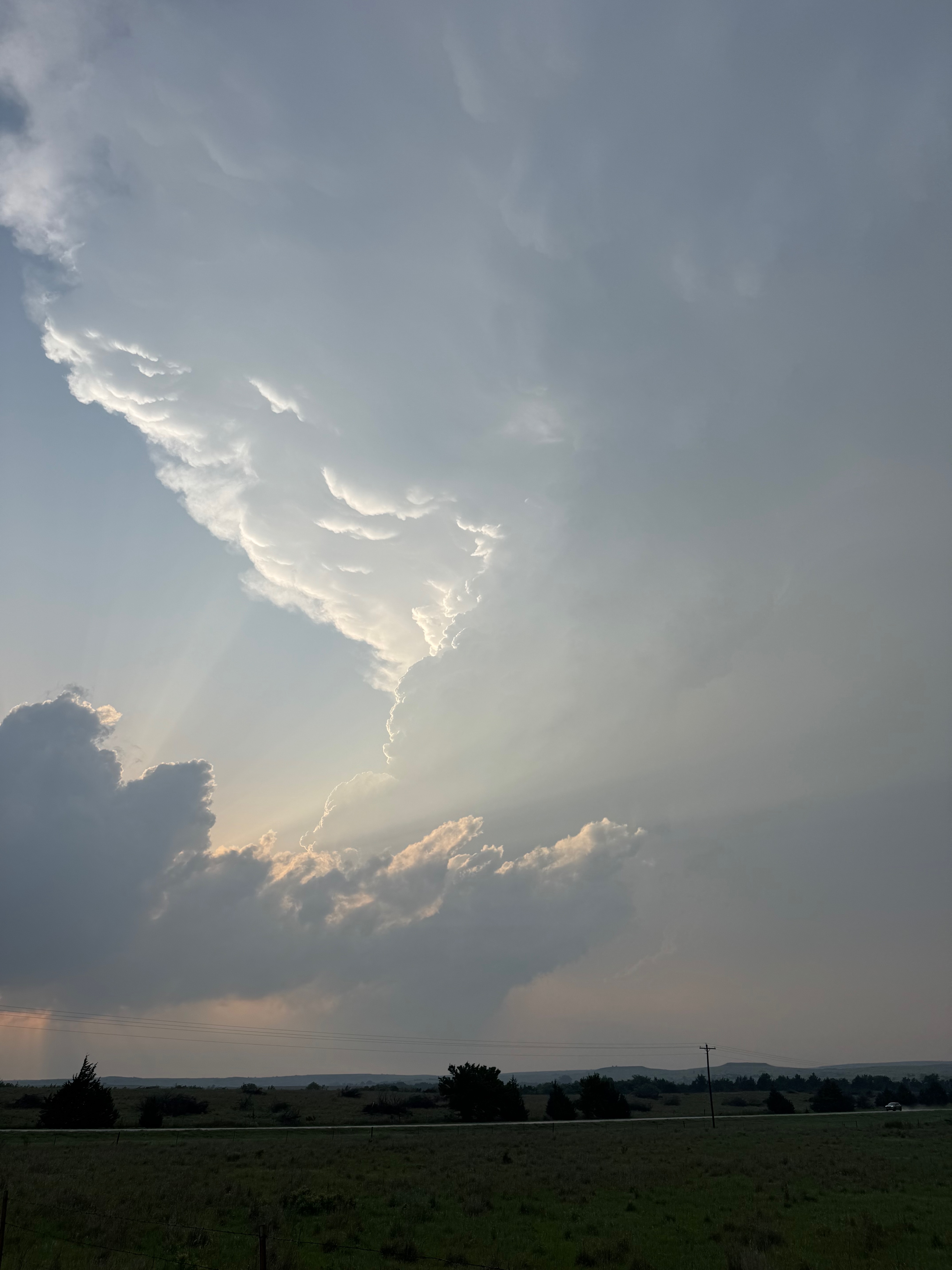 We were moving quickly east again once this most-recent tornado was done, and about a half hour later we were north of Vici on 34, east of the supercell, and looking for a decent high point in these hills to watch its approach. As far as I know, the storm did not produce another tornado during this repositioning. The iPhone images below show the storm when west of Sharon and later near Mooreland.