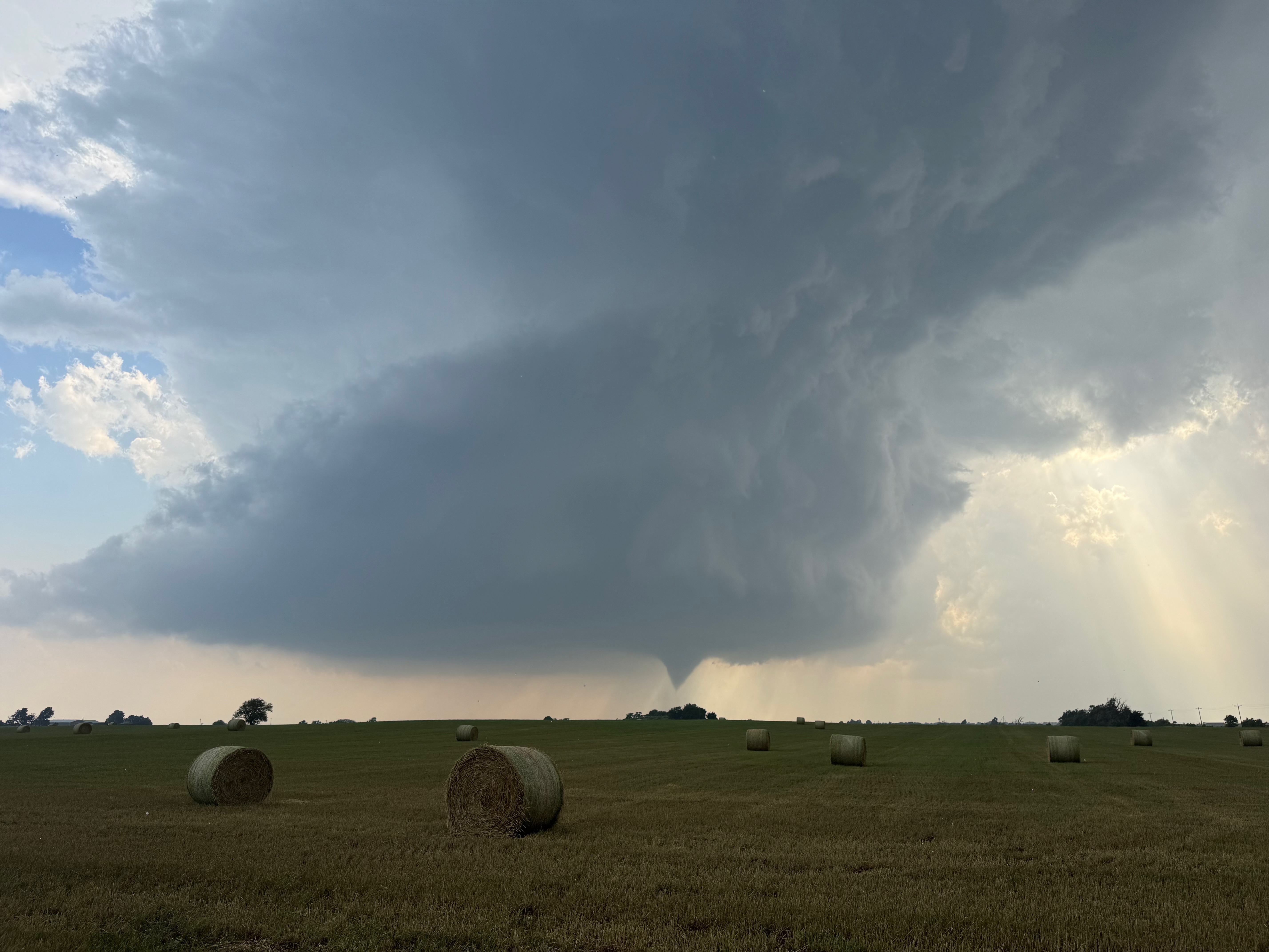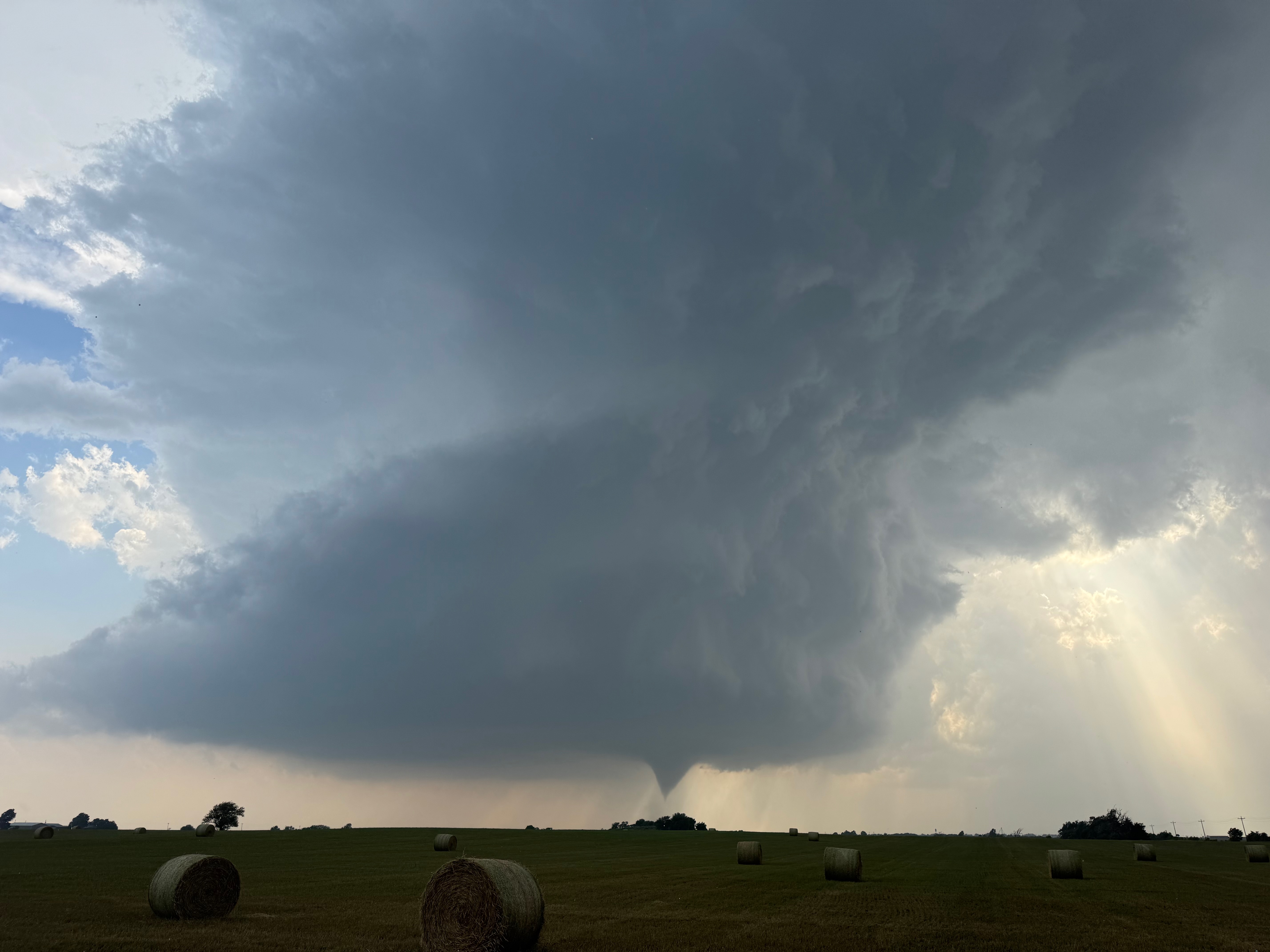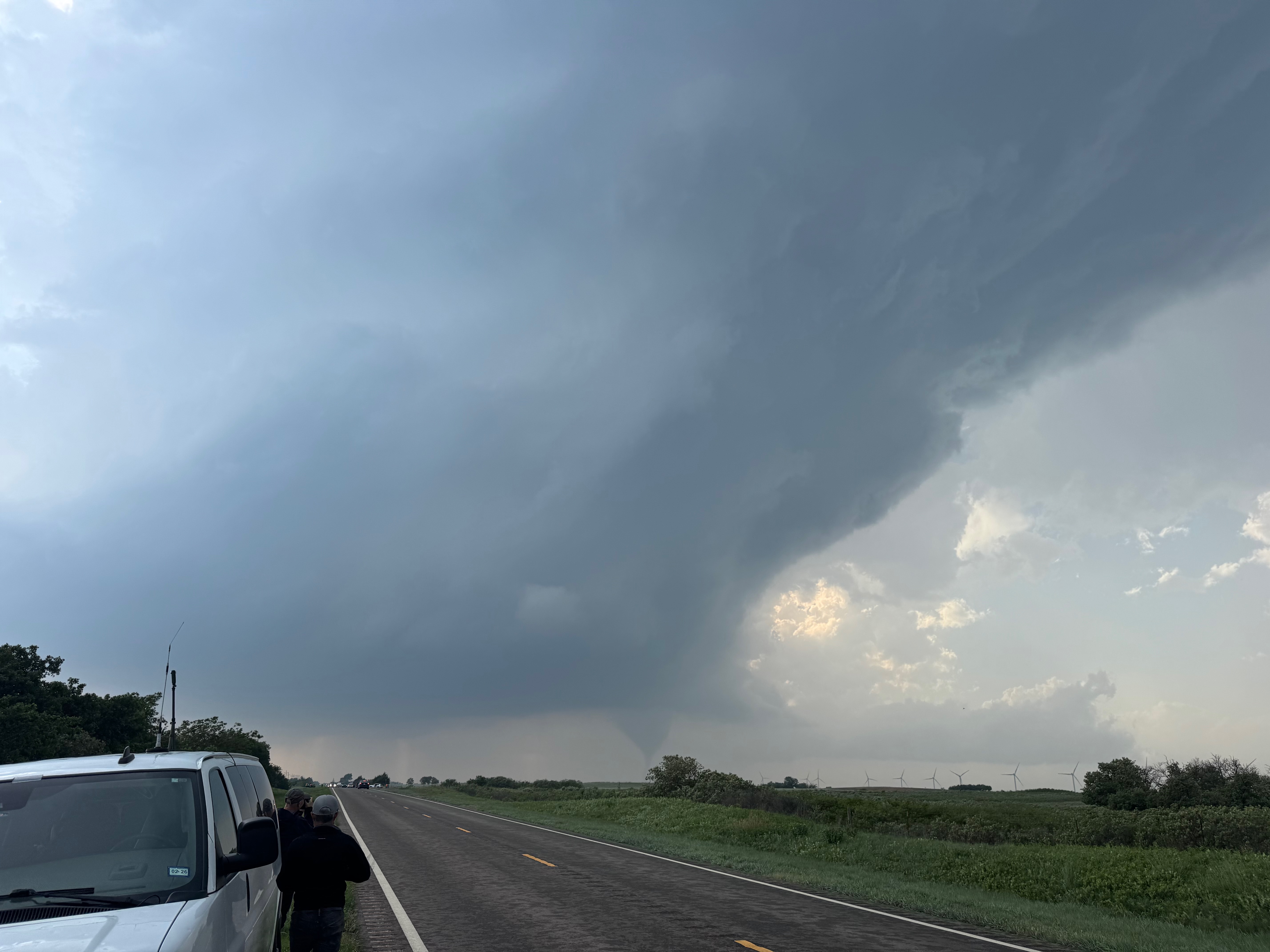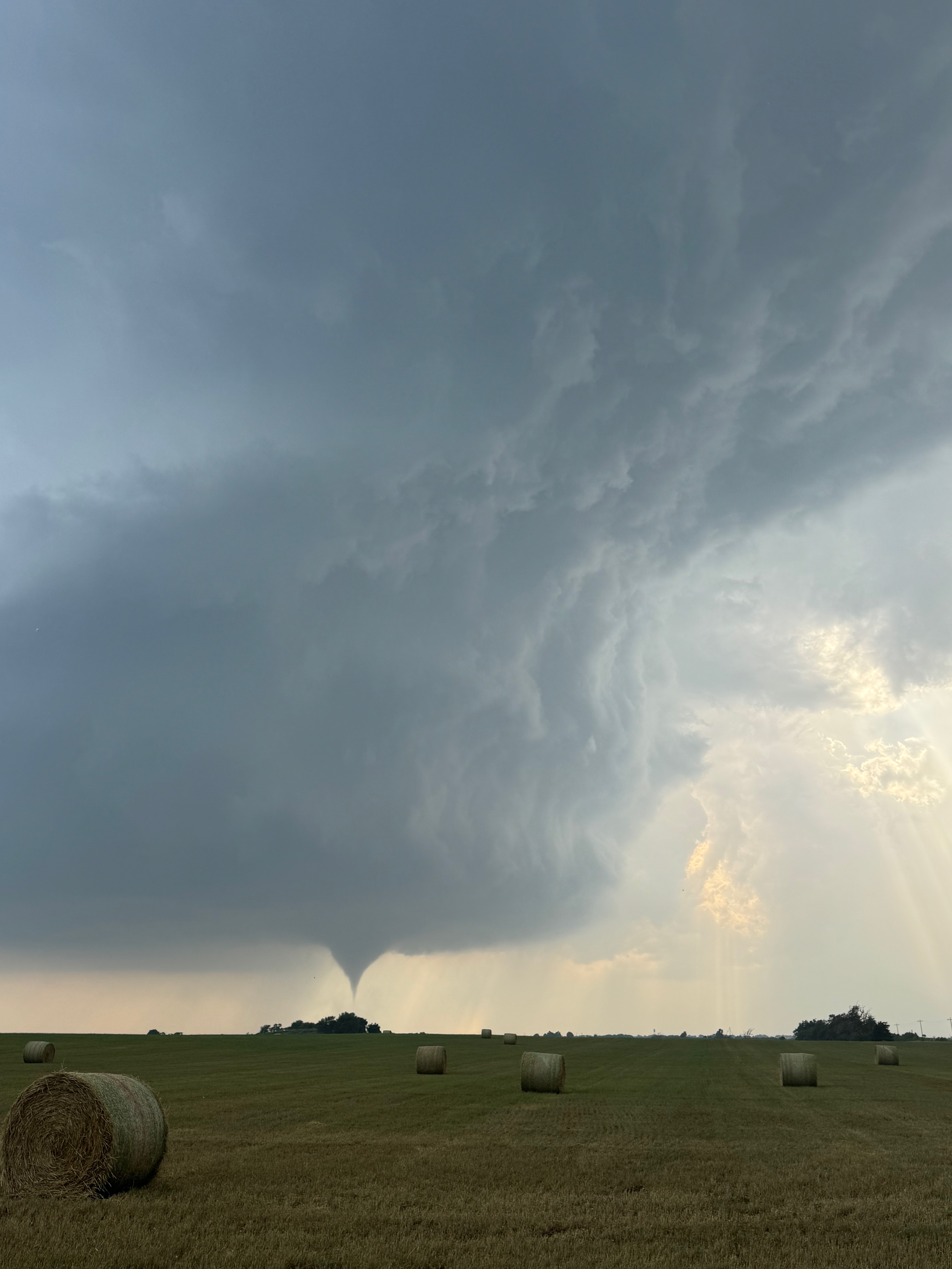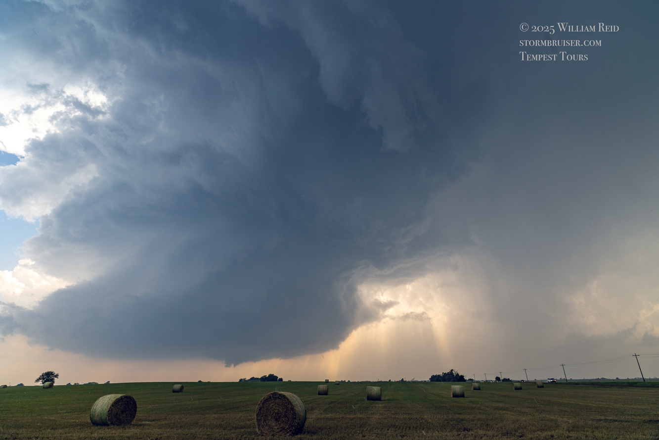 We were moving quickly east again once this most-recent tornado was done, and about a half hour later we were north of Vici on 34, east of the supercell, and looking for a decent high point in these hills to watch its approach. As far as I know, the storm did not produce another tornado during this repositioning. The iPhone images below show the storm when west of Sharon and later near Mooreland.