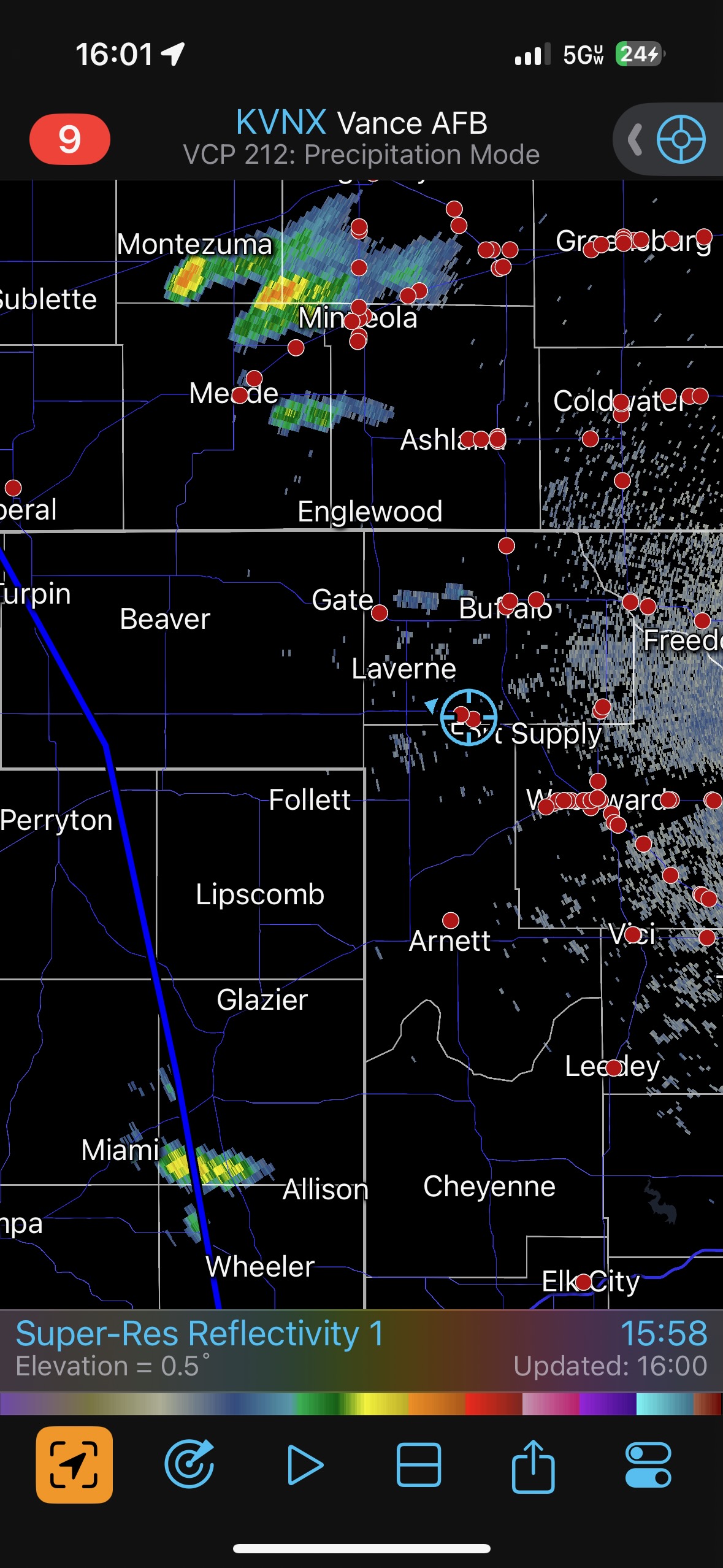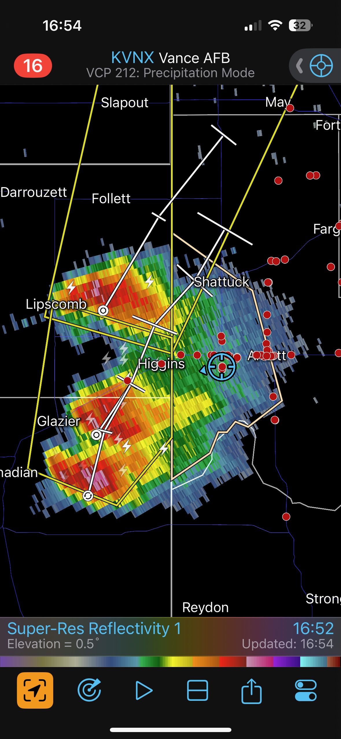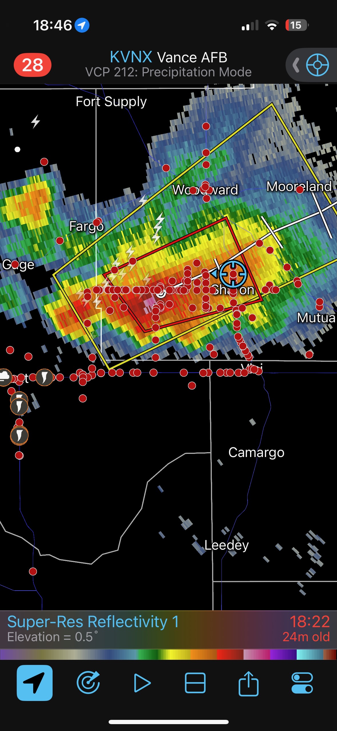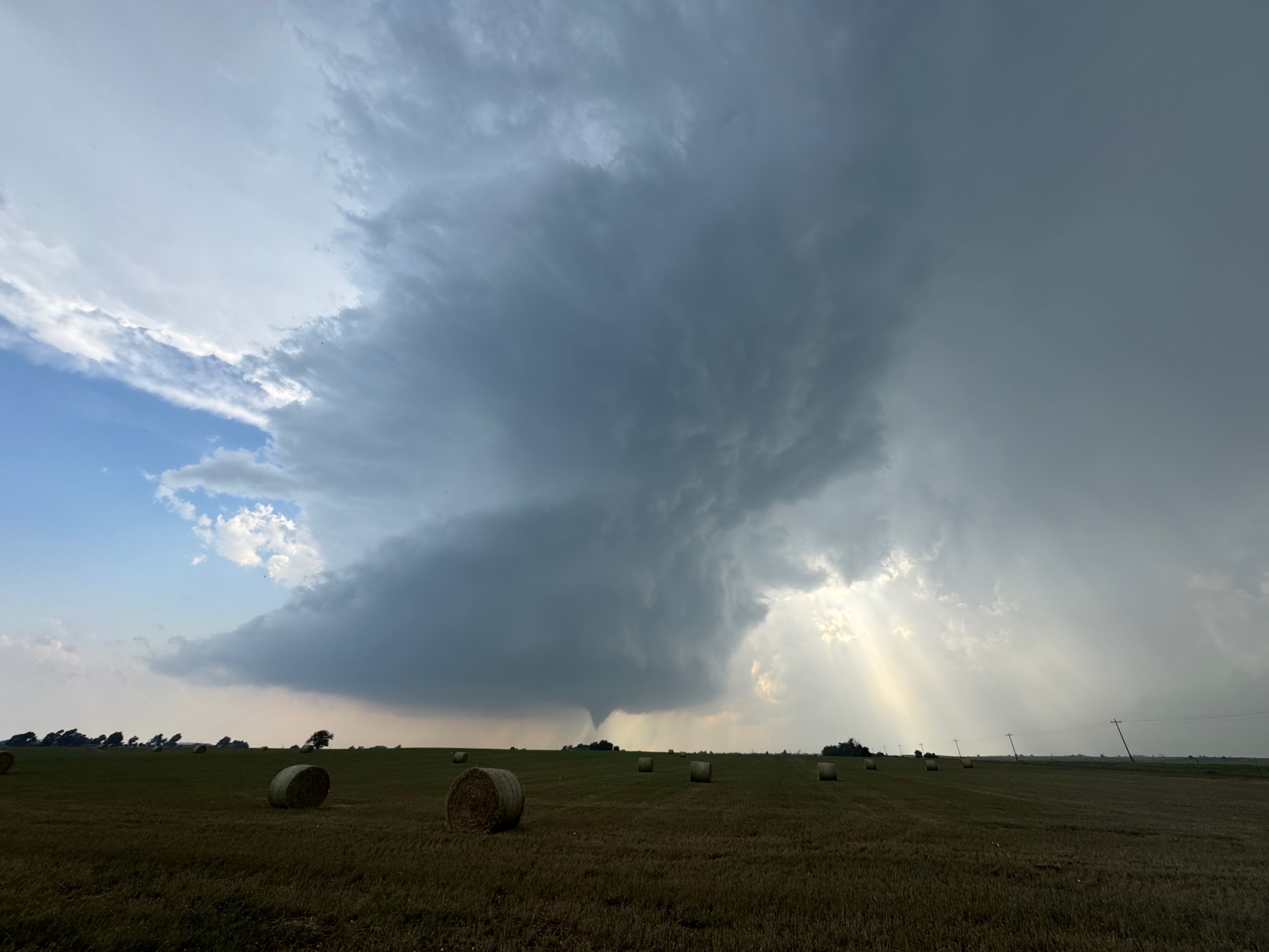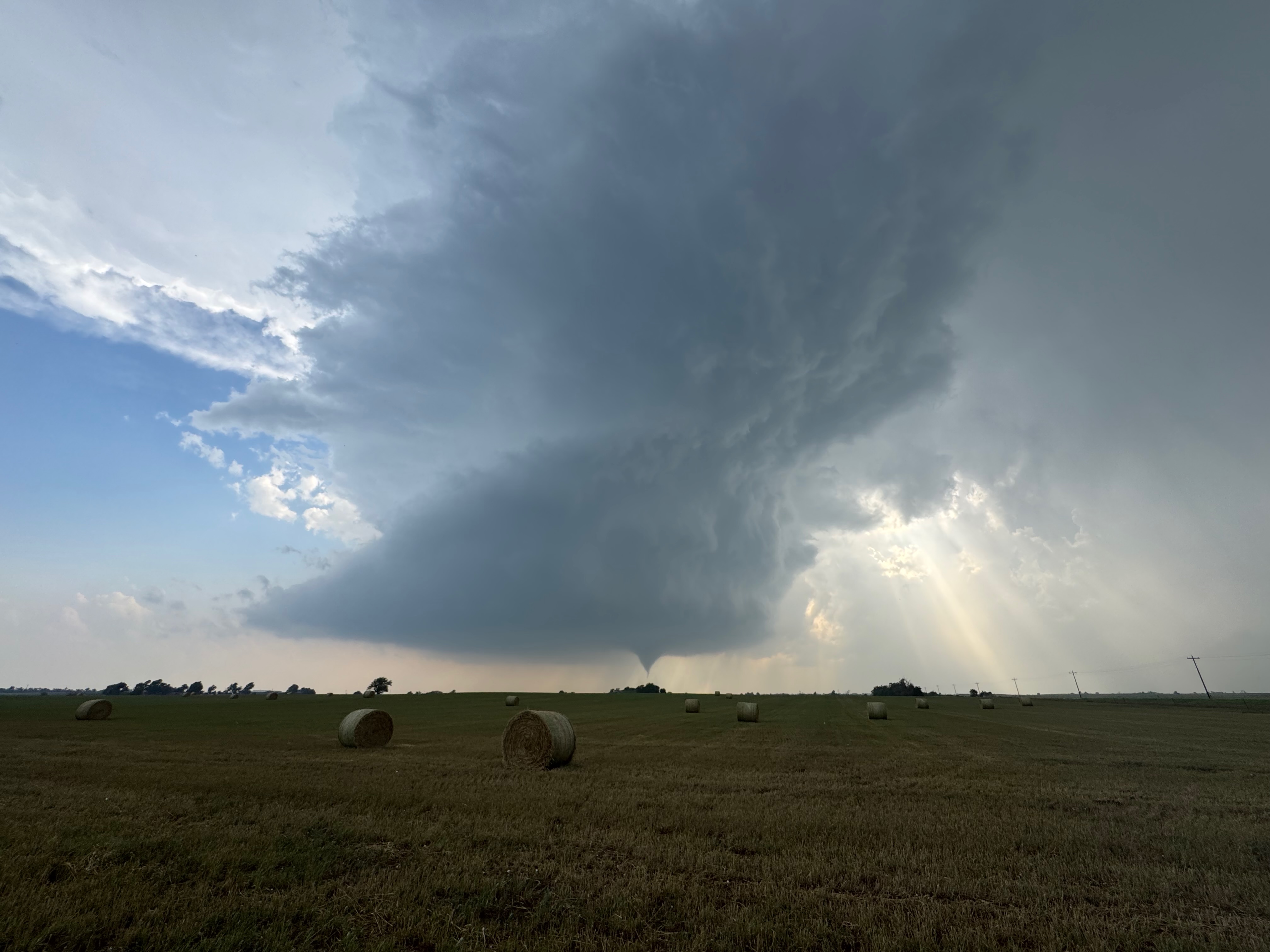 We were moving quickly east again once this most-recent tornado was done, and about a half hour later we were north of Vici on 34, east of the supercell, and looking for a decent high point in these hills to watch its approach. As far as I know, the storm did not produce another tornado during this repositioning. The iPhone images below show the storm when west of Sharon and later near Mooreland.