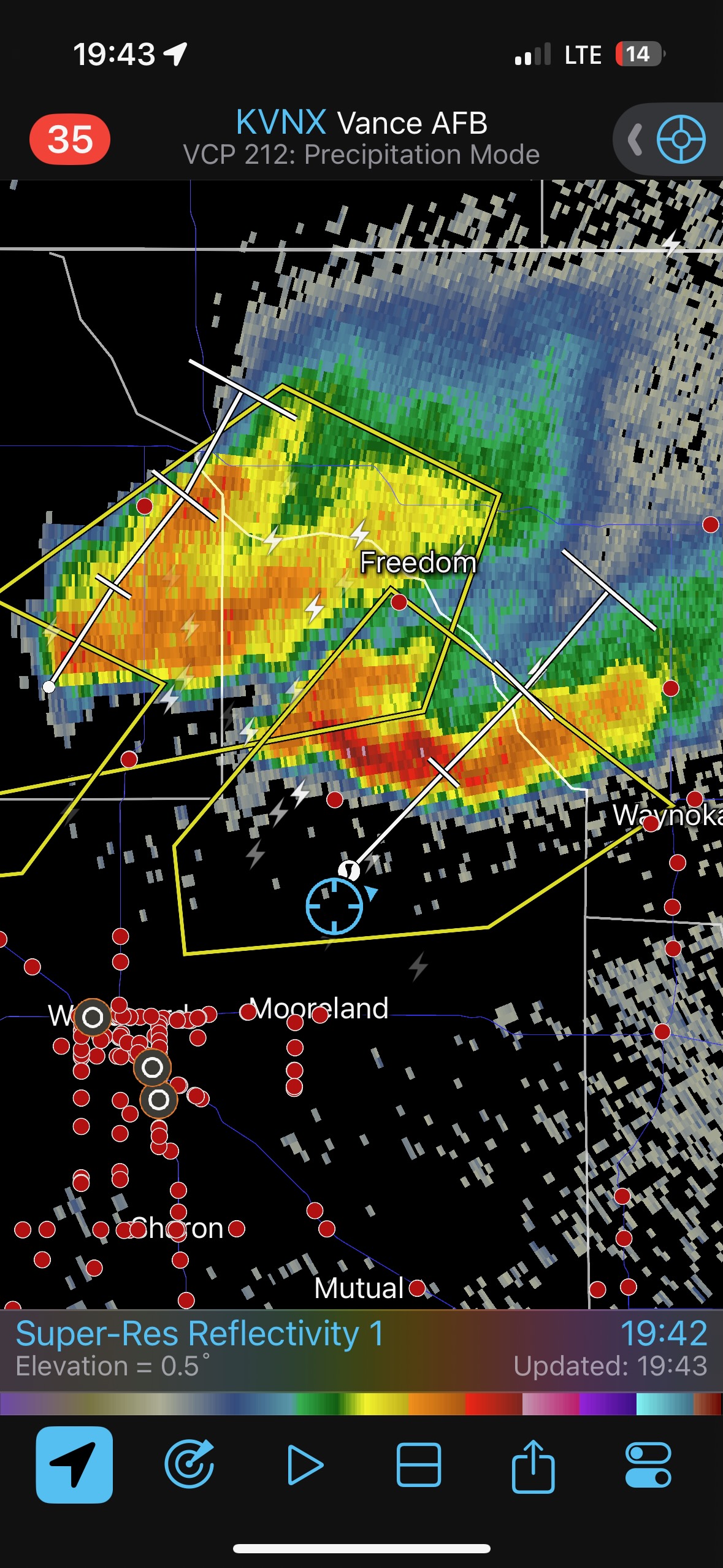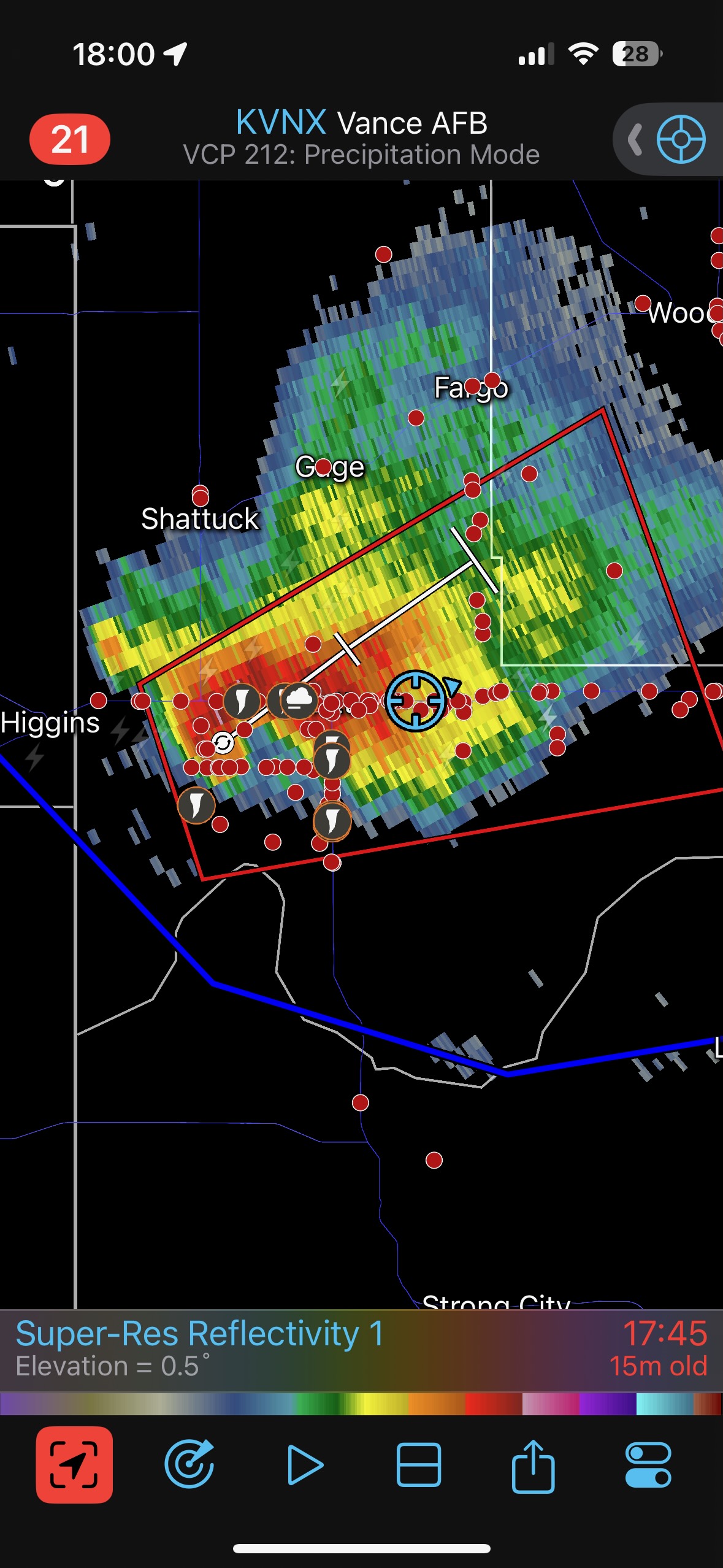 This stop wound up being the most fruitful and satisfying for the chase day. The next set of images below are from the iPhone, from about the time we stopped just east of Arnett to several minutes into the next tornado’s lifespan. The radar screen grab at 6 p.m. CDT was taken a little bit after the Arnett tornado, I think, when we were already heading east again.