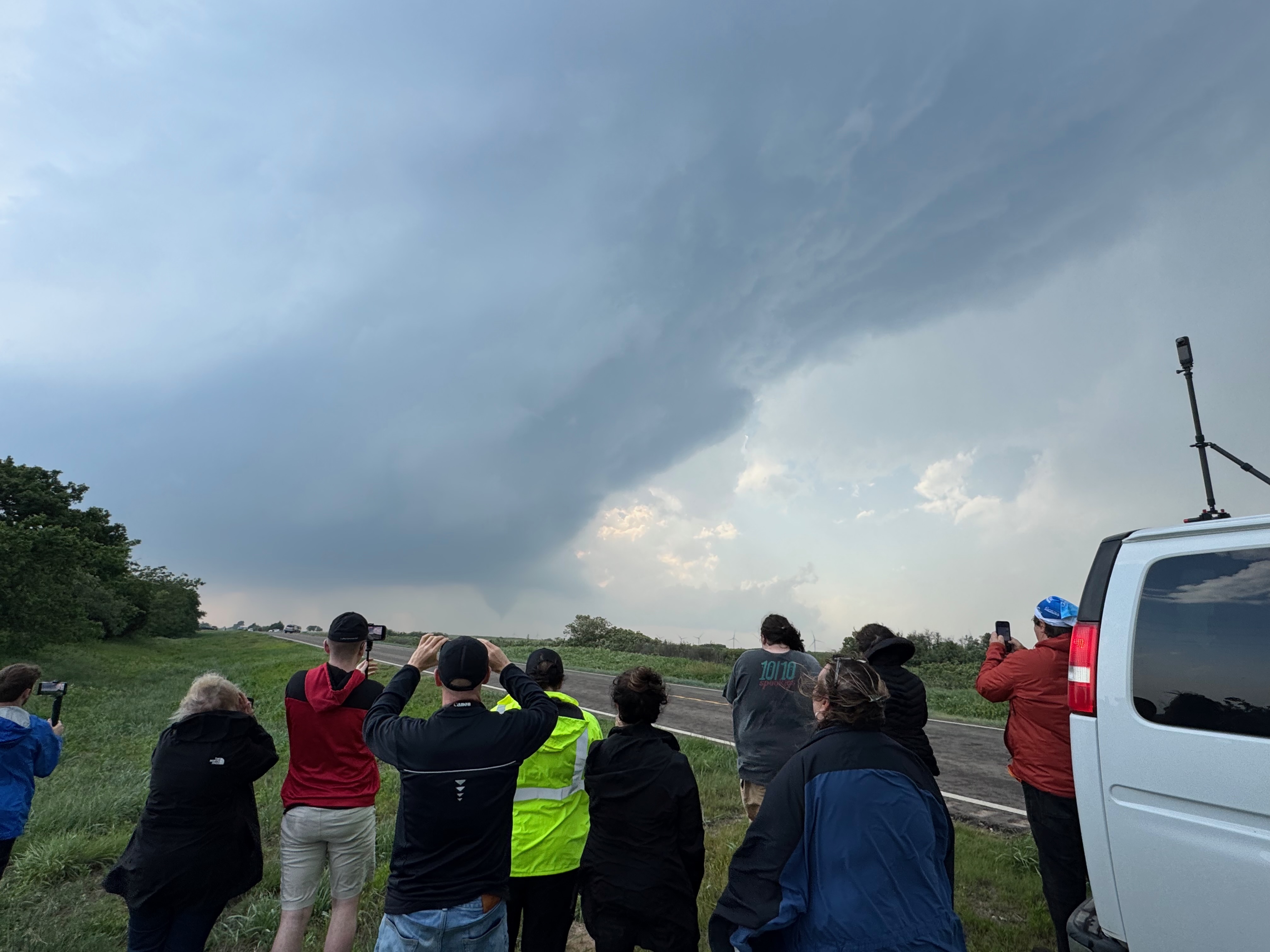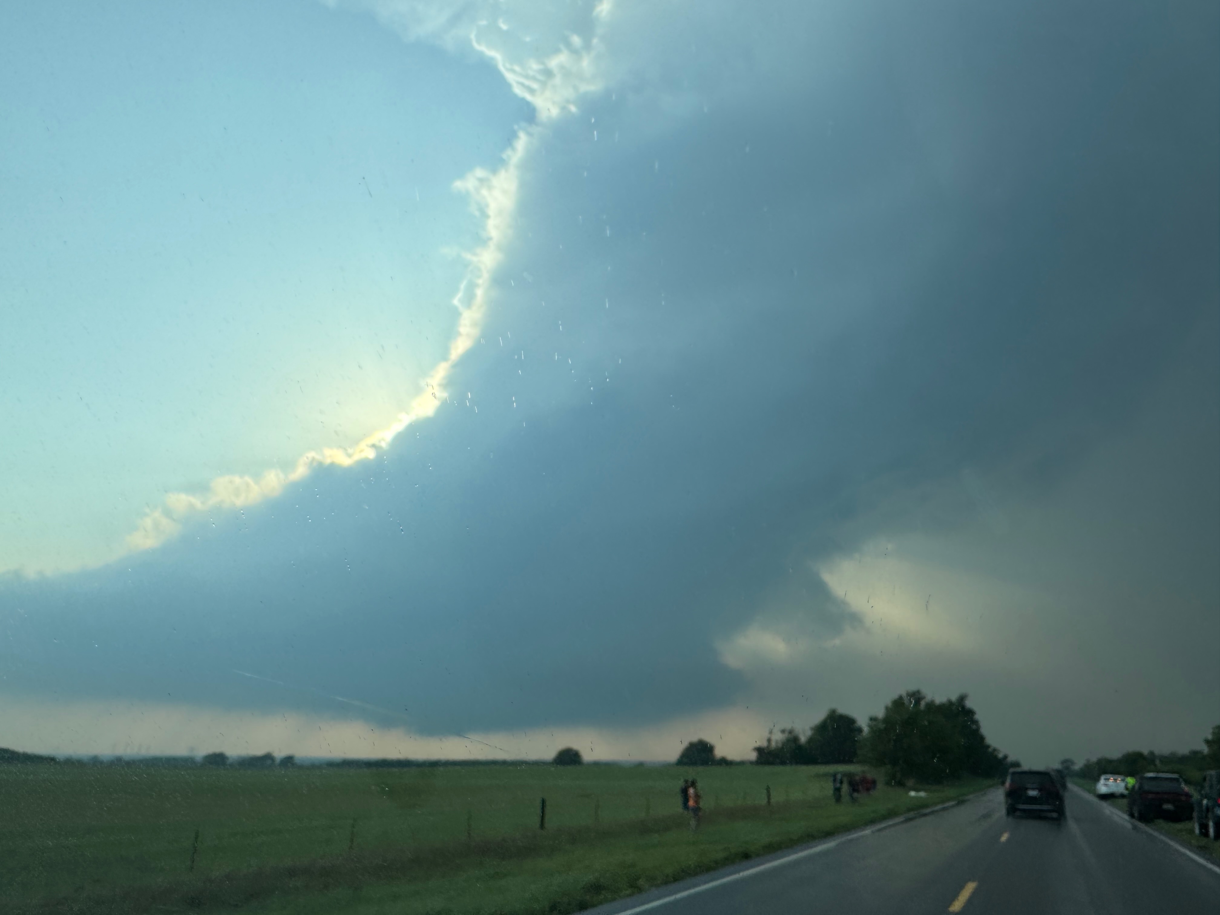 The storm was still looking great. It was still moving to the ENE at a moderate pace, maybe 25-30 mph, and its base was coming at us. The base was tornado-free, and it seemed VERY likely that another tornado would develop. This next tornado could be quite a bit larger and much more significant, based on SPC discussions. I wanted to get a bit in front of the storm again, which would afford another brilliant look at the storm structure, with or without a tornado. The problem, though, was that the next quality road to the north was the one through Vici, Highway 34. That was 25 miles east of here. I started eastward, but soon the guests were seeing another tornado with the storm! We quickly stopped and observed a tornado that was north of U.S. 60, just a little north of due west. This one looked somewhat beefy for a minute or so, but then either dissipated or got rain-wrapped. Look how sheared-over the updraft was above it in the iPhone shots below.