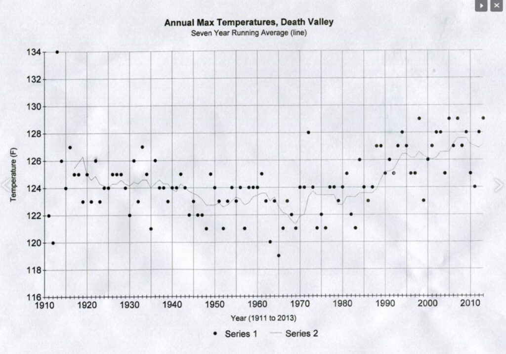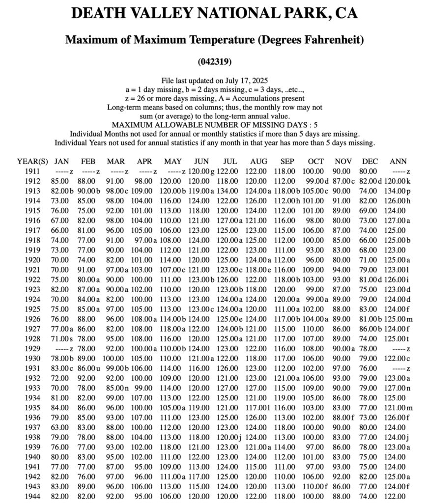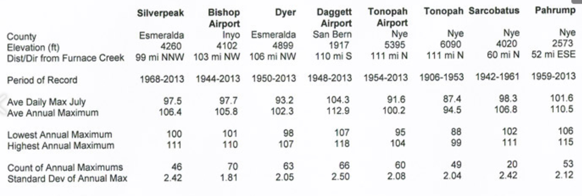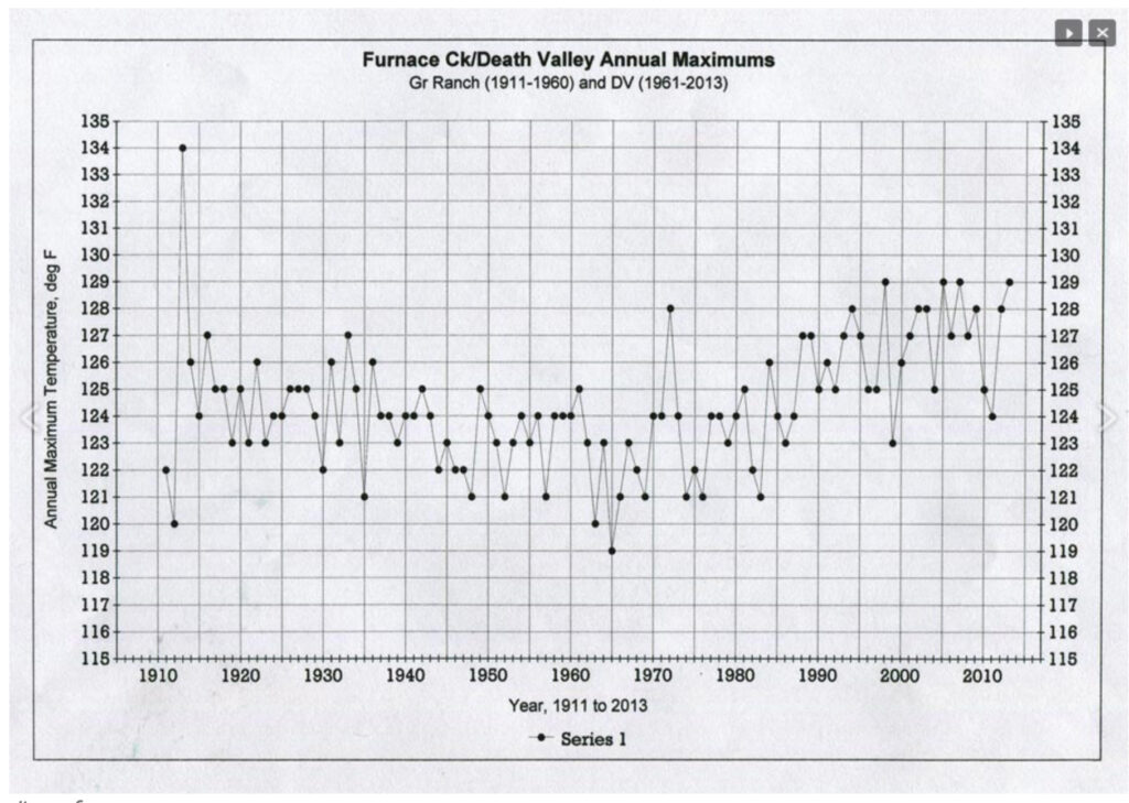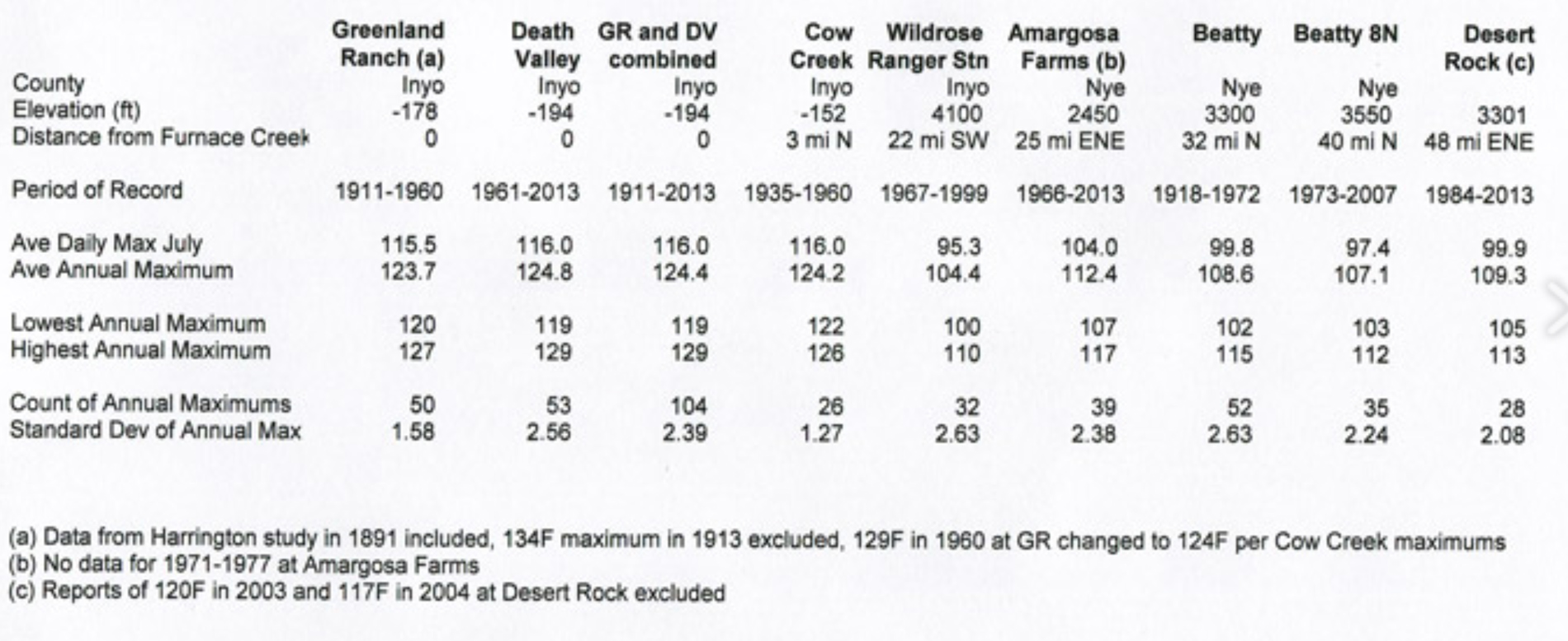 Official, standardized, long-term temperature measurements in Death Valley began at Greenland Ranch in June, 1911. One hundred and fifteen years of record are in the books. The Death Valley page on the Western Region Climate Center web site provides the monthly and annual maximums at Greenland Ranch (1911-1961) and Death Valley (1961-present). Below are screenshots of these data.