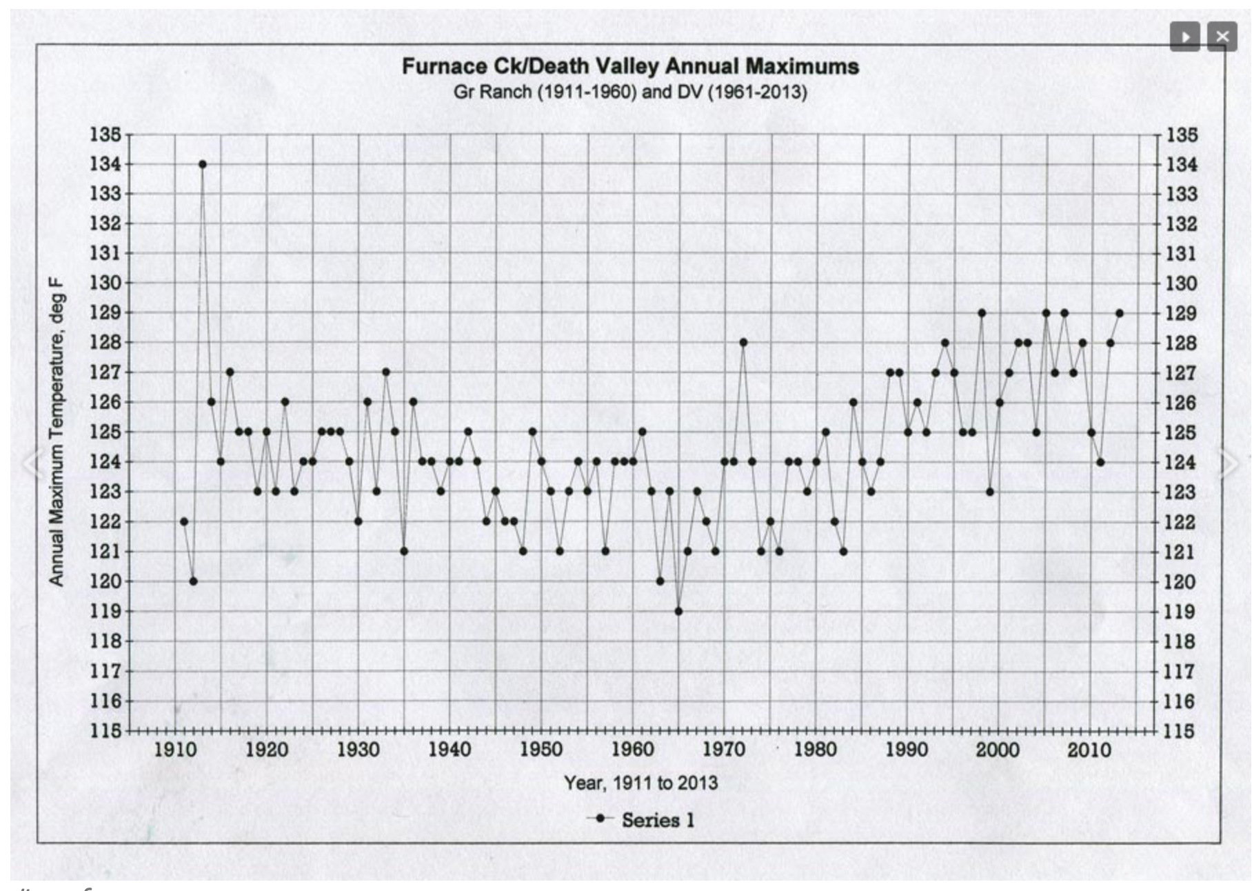 For the fifty years of record at Greenland Ranch, I maintain that the highest reliable temperatures are the 127F maximums made in 1916 and 1933. Since the climate record from 1913 to 1920 as provided by Denton is problematic, since there was an undocumented and presumably unapproved shelter move by Denton sometime during this period, and because Denton (allegedly and inappropriately) boosted maximum temperatures in 1913, one might want to stick an asterisk next to the 127F report in 1916. Such an asterisk stands for “caution!”